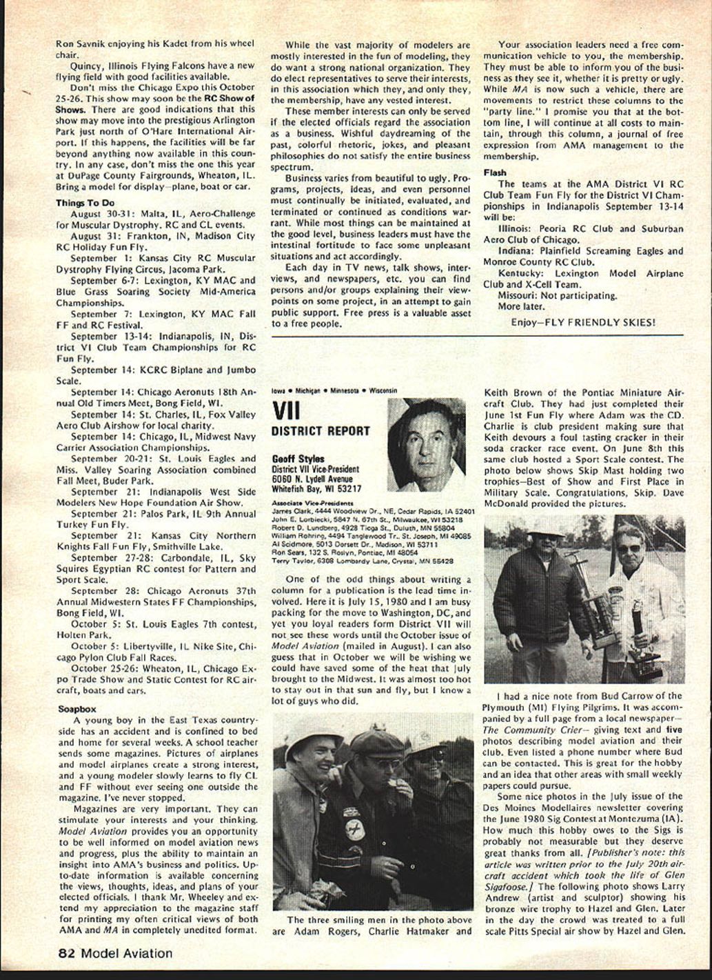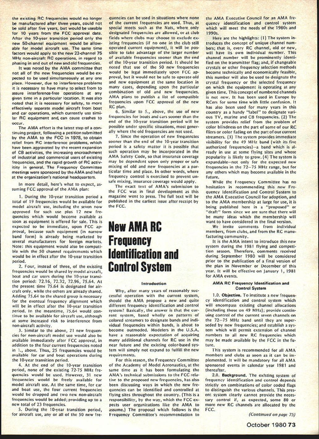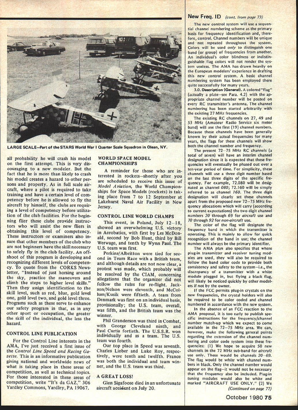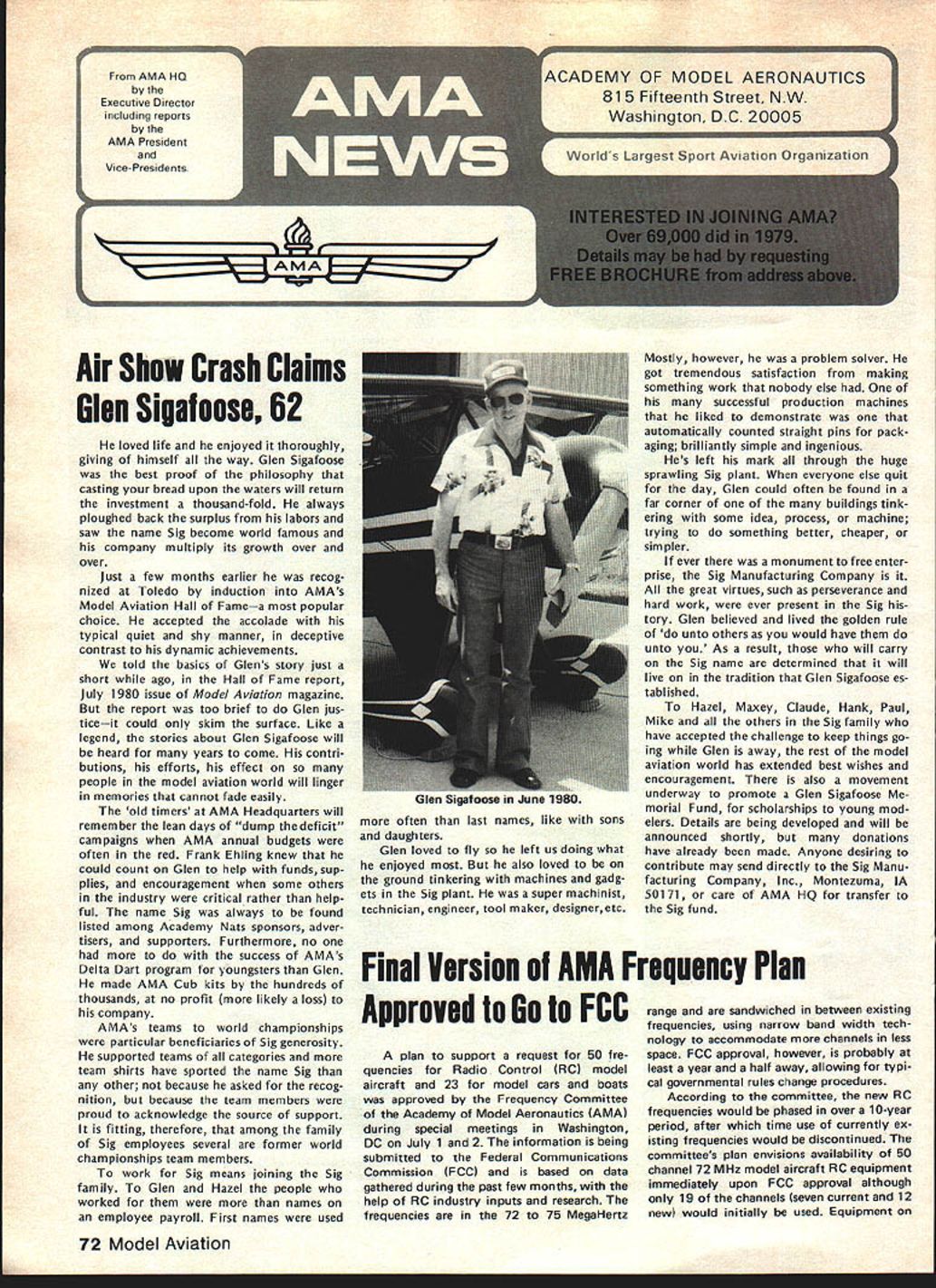 From AMA HO Executive Director including reports AMA President Vice- Presidents Air Show Crash Claims Glen Sigatoose 62 loved life enjoyed thoroughly giving himself way Glen Sigafoose best proof philosophy casting bread upon waters will return investment thousand-fold always ploughed back surplus labors saw name Sig become world famous company multiply its growth over over just few months earlier recog nized Toledo induction AMAs Model Aviation Hall Famea popular choice accepted accolade typical quiet shy manner deceptive contrast dynamic achievements told basics Glens story just short ago Hall Fame report July 1980 issue Model Aviation magazine report too brief Glen jus ticeit could skim surface Like legend stories about Glen Sigafoose will heard years come contri butions efforts effect people model aviation world will linger memories cannot fade easily old timers AMA Headquarters will remember lean days dump deficit campaigns AMA annual budgets often red Frank Ehling knew could count Glen help funds sup plies encouragement some others industry critical rather help ful name Sig always found listed among Academy Nats sponsors adver tisers supporters Furthermore no success AMAs Delta Dart program youngsters Glen made AMA Cub kits hundreds thousands no profit likely loss company AMAs teams world championships particular beneficiaries Sig generosity supported teams categories team shirts have sported name Sig other because asked recog nition because team members proud acknowledge source support fitting therefore among family Sig employees several former world championships team members work Sig means joining Sig family Glen Hazel people worked names employee payroll First names used Mostly however problem solver got tremendous satisfaction making something work nobody else successful production machines liked demonstrate automatically counted straight pins pack aging brilliantly simple ingenious Hes left mark through huge sprawling Sig plant everyone else quit day Glen could often found far corner buildings tink ering some idea process machine trying something better cheaper simpler ever monument free enter prise Sig Manufacturing Company great virtues such perseverance hard work ever present Sig tory Glen believed lived golden rule unto others would have unto As result will carry Sig name determined will live tradition Glen Sigafoose es tablished Hazel Maxey Claude Hank Paul Mike others Sig family have accepted challenge keep things go ing Glen away rest model aviation world has extended best wishes encouragement also movement underway promote Glen Sigafoose morial Fund scholarships young mod elers Details being developed will announced shortly donations have already made Anyone desiring contribute may send directly Sig Manu facturing Company Inc Montezuma IA 50171 care AMA HQ transfer Sig fund Final Version AMA Frequency Plan Approved Go FCC plan support request 50 fre quencies Radio Control IRO model aircraft 23 model cars boats approved Frequency Committee Academy Model Aeronautics AMA during special meetings Washington DC July 1 2 information being submitted Federal Communications Commission FCC based data gathered during past few months help RC industry inputs research frequencies 72 75 MegaHertz range sandwiched between existing frequencies using narrow band width tech nology accommodate channels less space FCC approval however probably least year half away allowing typi cal governmental rules change procedures According committee new RC frequencies would phased over 10-year period after time use currently ex isting frequencies would discontinued committees plan envisions availability 50 channel 72 MHz model aircraft RC equipment immediately upon FCC approval although 19 channels seven current 12 new would initially used Equipment 72 Model Aviation 5dIUUU III IUIIU often last names like sons daughters Glen loved fly left us doing what enjoyed also loved ground tinkering machines gadg ets Sig plant super machinist technician engineer tool maker designer etc existing RC frequencies would no longer manufactured after three years could sold after five years would useable 10 years FCC approval date After 10-year transition period Only new 50-channel equipment would allow able model aircraft use same time factors would apply new 23-channel 75 MHz non-aircraft RC operations regard phasing Out ofnewandoldfrequencies noted AMA committee new frequencies would ex pected used simultaneously place However due interference problems necessary have select assure interference-free operations given time particular location also noted necessary safety effectively separate model aircraft boat car operations currently use simi lar RC equipment can cause crashes occur AMA effort latest step con tinuing project following petition submitted AMA FCC 1978 obtain relief RC interference problems have aggravated recent expansion CB activities increasing encroachment industrial commercial users existing frequencies rapid growth RC activ itity general Frequency Committee meetings sponsored AMA held organizations national headquarters detail heres what expect suming FCC approval AMA plan 1 During 10-year transition period total 19 frequencies would available model aircraft use including seven now approved such use plus 12 new fre quencies would become available soon equipment offered sale expected immediate upon FCC ap proval because such equipment narrow band form already being marketed several manufacturers foreign markets Note equipment would also compati ble 50 channel requirements would effect after 10-year transition period 2 Four instead three existing frequencies would shared model aircraft boat car users during 10-year transi tion period 7216 7232 7296 7564 present time 7564 designated air craft others already shared Adding 7564 shared group necessary eventual frequency alignment will effect after 10-year transition period meantime 7564 would con tinue available aircraft use although some increased risk in