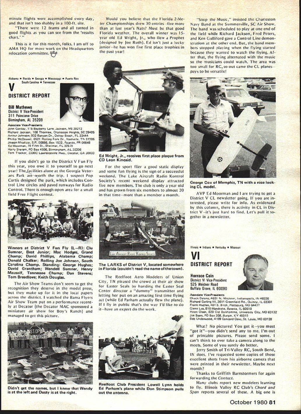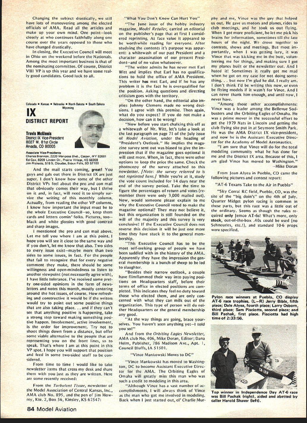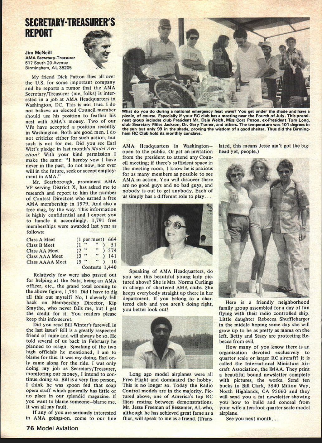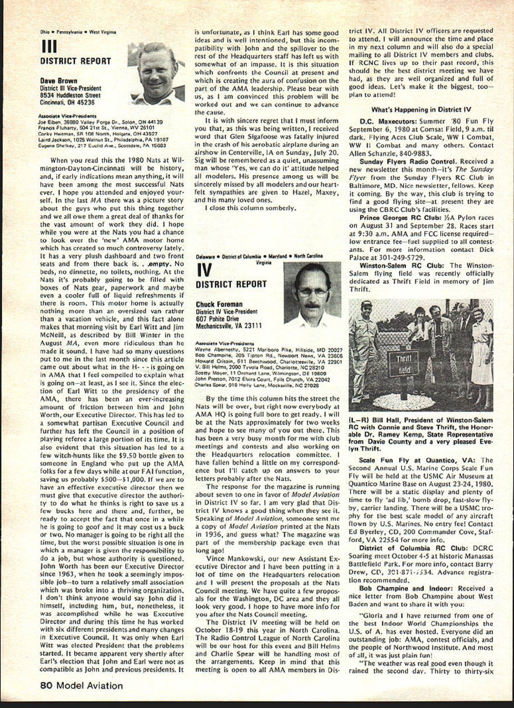 From AMA HO Executive Director including reports AMA President Vice- Presidents Air Show Crash Claims Glen Sigatoose 62 loved life enjoyed thoroughly giving himself way Glen Sigafoose best proof philosophy casting bread upon waters will return investment thousand-fold always ploughed back surplus labors saw name Sig become world famous company multiply its growth over over just few months earlier recog nized Toledo induction AMAs Model Aviation Hall Famea popular choice accepted accolade typical quiet shy manner deceptive contrast dynamic achievements told basics Glens story just short ago Hall Fame report July 1980 issue Model Aviation magazine report too brief Glen jus ticeit could skim surface Like legend stories about Glen Sigafoose will heard years come contri butions efforts effect people model aviation world will linger memories cannot fade easily old timers AMA Headquarters will remember lean days dump deficit campaigns AMA annual budgets often red Frank Ehling knew could count Glen help funds sup plies encouragement some others industry critical rather help ful name Sig always found listed among Academy Nats sponsors adver tisers supporters Furthermore no success AMAs Delta Dart program youngsters Glen made AMA Cub kits hundreds thousands no profit likely loss company AMAs teams world championships particular beneficiaries Sig generosity supported teams categories team shirts have sported name Sig other because asked recog nition because team members proud acknowledge source support fitting therefore among family Sig employees several former world championships team members work Sig means joining Sig family Glen Hazel people worked names employee payroll First names used Mostly however problem solver got tremendous satisfaction making something work nobody else successful production machines liked demonstrate automatically counted straight pins pack aging brilliantly simple ingenious Hes left mark through huge sprawling Sig plant everyone else quit day Glen could often found far corner buildings tink ering some idea process machine trying something better cheaper simpler ever monument free enter prise Sig Manufacturing Company great virtues such perseverance hard work ever present Sig tory Glen believed lived golden rule unto others would have unto As result will carry Sig name determined will live tradition Glen Sigafoose es tablished Hazel Maxey Claude Hank Paul Mike others Sig family have accepted challenge keep things go ing Glen away rest model aviation world has extended best wishes encouragement also movement underway promote Glen Sigafoose morial Fund scholarships young mod elers Details being developed will announced shortly donations have already made Anyone desiring contribute may send directly Sig Manu facturing Company Inc Montezuma IA 50171 care AMA HQ transfer Sig fund Final Version AMA Frequency Plan Approved Go FCC plan support request 50 fre quencies Radio Control IRO model aircraft 23 model cars boats approved Frequency Committee Academy Model Aeronautics AMA during special meetings Washington DC July 1 2 information being submitted Federal Communications Commission FCC based data gathered during past few months help RC industry inputs research frequencies 72 75 MegaHertz range sandwiched between existing frequencies using narrow band width tech nology accommodate channels less space FCC approval however probably least year half away allowing typi cal governmental rules change procedures According committee new RC frequencies would phased over 10-year period after time use currently ex isting frequencies would discontinued committees plan envisions availability 50 channel 72 MHz model aircraft RC equipment immediately upon FCC approval although 19 channels seven current 12 new would initially used Equipment 72 Model Aviation 5dIUUU III IUIIU often last names like sons daughters Glen loved fly left us doing what enjoyed also loved ground tinkering machines gadg ets Sig plant super machinist technician engineer tool maker designer etc existing RC frequencies would no longer manufactured after three years could sold after five years would useable 10 years FCC approval date After 10-year transition period Only new 50-channel equipment would allow able model aircraft use same time factors would apply new 23-channel 75 MHz non-aircraft RC operations regard phasing Out ofnewandoldfrequencies noted AMA committee new frequencies would ex pected used simultaneously place However due interference problems necessary have select assure interference-free operations given time particular location also noted necessary safety effectively separate model aircraft boat car operations currently use simi lar RC equipment can cause crashes occur AMA effort latest step con tinuing project following petition submitted AMA FCC 1978 obtain relief RC interference problems have aggravated recent expansion CB activities increasing encroachment industrial commercial users existing frequencies rapid growth RC activ itity general Frequency Committee meetings sponsored AMA held organizations national headquarters detail heres what expect suming FCC approval AMA plan 1 During 10-year transition period total 19 frequencies would available model aircraft use including seven now approved such use plus 12 new fre quencies would become available soon equipment offered sale expected immediate upon FCC ap proval because such equipment narrow band form already being marketed several manufacturers foreign markets Note equipment would also compati ble 50 channel requirements would effect after 10-year transition period 2 Four instead three existing frequencies would shared model aircraft boat car users during 10-year transi tion period 7216 7232 7296 7564 present time 7564 designated air craft others already shared Adding 7564 shared group necessary eventual frequency alignment will effect after 10-year transition period meantime 7564 would con tinue available aircraft use although some increased risk in
