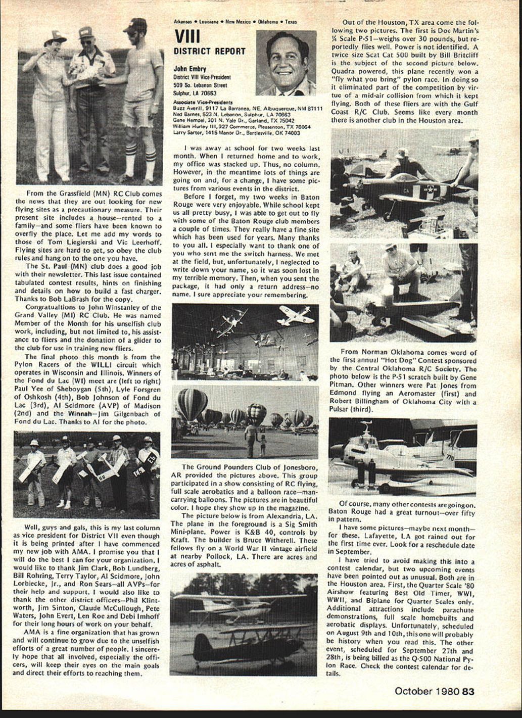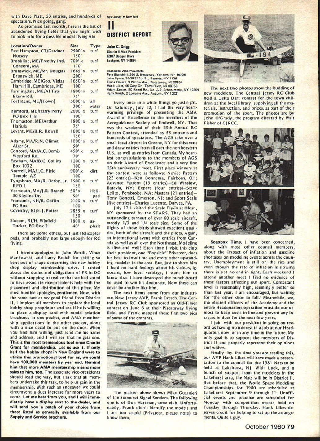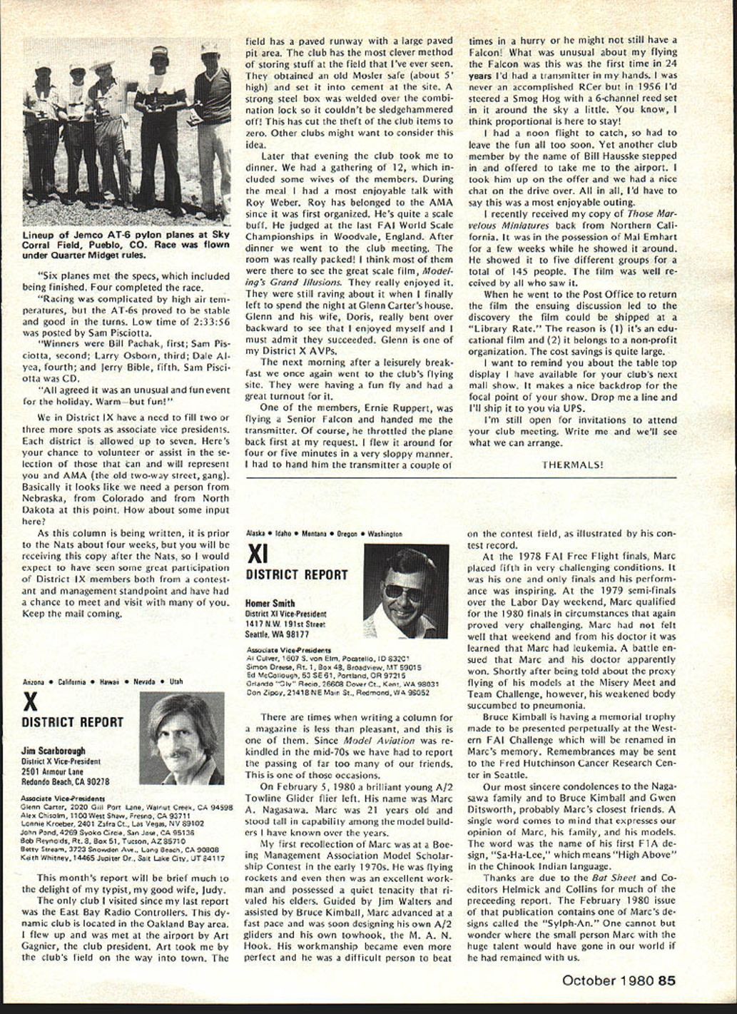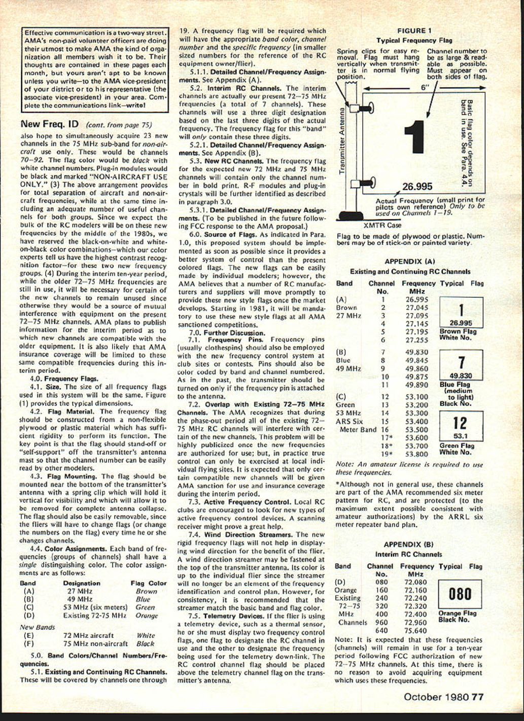 From AMA HO Executive Director including reports AMA President Vice- Presidents Air Show Crash Claims Glen Sigatoose 62 loved life enjoyed thoroughly giving himself way Glen Sigafoose best proof philosophy casting bread upon waters will return investment thousand-fold always ploughed back surplus labors saw name Sig become world famous company multiply its growth over over just few months earlier recog nized Toledo induction AMAs Model Aviation Hall Famea popular choice accepted accolade typical quiet shy manner deceptive contrast dynamic achievements told basics Glens story just short ago Hall Fame report July 1980 issue Model Aviation magazine report too brief Glen jus ticeit could skim surface Like legend stories about Glen Sigafoose will heard years come contri butions efforts effect people model aviation world will linger memories cannot fade easily old timers AMA Headquarters will remember lean days dump deficit campaigns AMA annual budgets often red Frank Ehling knew could count Glen help funds sup plies encouragement some others industry critical rather help ful name Sig always found listed among Academy Nats sponsors adver tisers supporters Furthermore no success AMAs Delta Dart program youngsters Glen made AMA Cub kits hundreds thousands no profit likely loss company AMAs teams world championships particular beneficiaries Sig generosity supported teams categories team shirts have sported name Sig other because asked recog nition because team members proud acknowledge source support fitting therefore among family Sig employees several former world championships team members work Sig means joining Sig family Glen Hazel people worked names employee payroll First names used Mostly however problem solver got tremendous satisfaction making something work nobody else successful production machines liked demonstrate automatically counted straight pins pack aging brilliantly simple ingenious Hes left mark through huge sprawling Sig plant everyone else quit day Glen could often found far corner buildings tink ering some idea process machine trying something better cheaper simpler ever monument free enter prise Sig Manufacturing Company great virtues such perseverance hard work ever present Sig tory Glen believed lived golden rule unto others would have unto As result will carry Sig name determined will live tradition Glen Sigafoose es tablished Hazel Maxey Claude Hank Paul Mike others Sig family have accepted challenge keep things go ing Glen away rest model aviation world has extended best wishes encouragement also movement underway promote Glen Sigafoose morial Fund scholarships young mod elers Details being developed will announced shortly donations have already made Anyone desiring contribute may send directly Sig Manu facturing Company Inc Montezuma IA 50171 care AMA HQ transfer Sig fund Final Version AMA Frequency Plan Approved Go FCC plan support request 50 fre quencies Radio Control IRO model aircraft 23 model cars boats approved Frequency Committee Academy Model Aeronautics AMA during special meetings Washington DC July 1 2 information being submitted Federal Communications Commission FCC based data gathered during past few months help RC industry inputs research frequencies 72 75 MegaHertz range sandwiched between existing frequencies using narrow band width tech nology accommodate channels less space FCC approval however probably least year half away allowing typi cal governmental rules change procedures According committee new RC frequencies would phased over 10-year period after time use currently ex isting frequencies would discontinued committees plan envisions availability 50 channel 72 MHz model aircraft RC equipment immediately upon FCC approval although 19 channels seven current 12 new would initially used Equipment 72 Model Aviation 5dIUUU III IUIIU often last names like sons daughters Glen loved fly left us doing what enjoyed also loved ground tinkering machines gadg ets Sig plant super machinist technician engineer tool maker designer etc existing RC frequencies would no longer manufactured after three years could sold after five years would useable 10 years FCC approval date After 10-year transition period Only new 50-channel equipment would allow able model aircraft use same time factors would apply new 23-channel 75 MHz non-aircraft RC operations regard phasing Out ofnewandoldfrequencies noted AMA committee new frequencies would ex pected used simultaneously place However due interference problems necessary have select assure interference-free operations given time particular location also noted necessary safety effectively separate model aircraft boat car operations currently use simi lar RC equipment can cause crashes occur AMA effort latest step con tinuing project following petition submitted AMA FCC 1978 obtain relief RC interference problems have aggravated recent expansion CB activities increasing encroachment industrial commercial users existing frequencies rapid growth RC activ itity general Frequency Committee meetings sponsored AMA held organizations national headquarters detail heres what expect suming FCC approval AMA plan 1 During 10-year transition period total 19 frequencies would available model aircraft use including seven now approved such use plus 12 new fre quencies would become available soon equipment offered sale expected immediate upon FCC ap proval because such equipment narrow band form already being marketed several manufacturers foreign markets Note equipment would also compati ble 50 channel requirements would effect after 10-year transition period 2 Four instead three existing frequencies would shared model aircraft boat car users during 10-year transi tion period 7216 7232 7296 7564 present time 7564 designated air craft others already shared Adding 7564 shared group necessary eventual frequency alignment will effect after 10-year transition period meantime 7564 would con tinue available aircraft use although some increased risk in