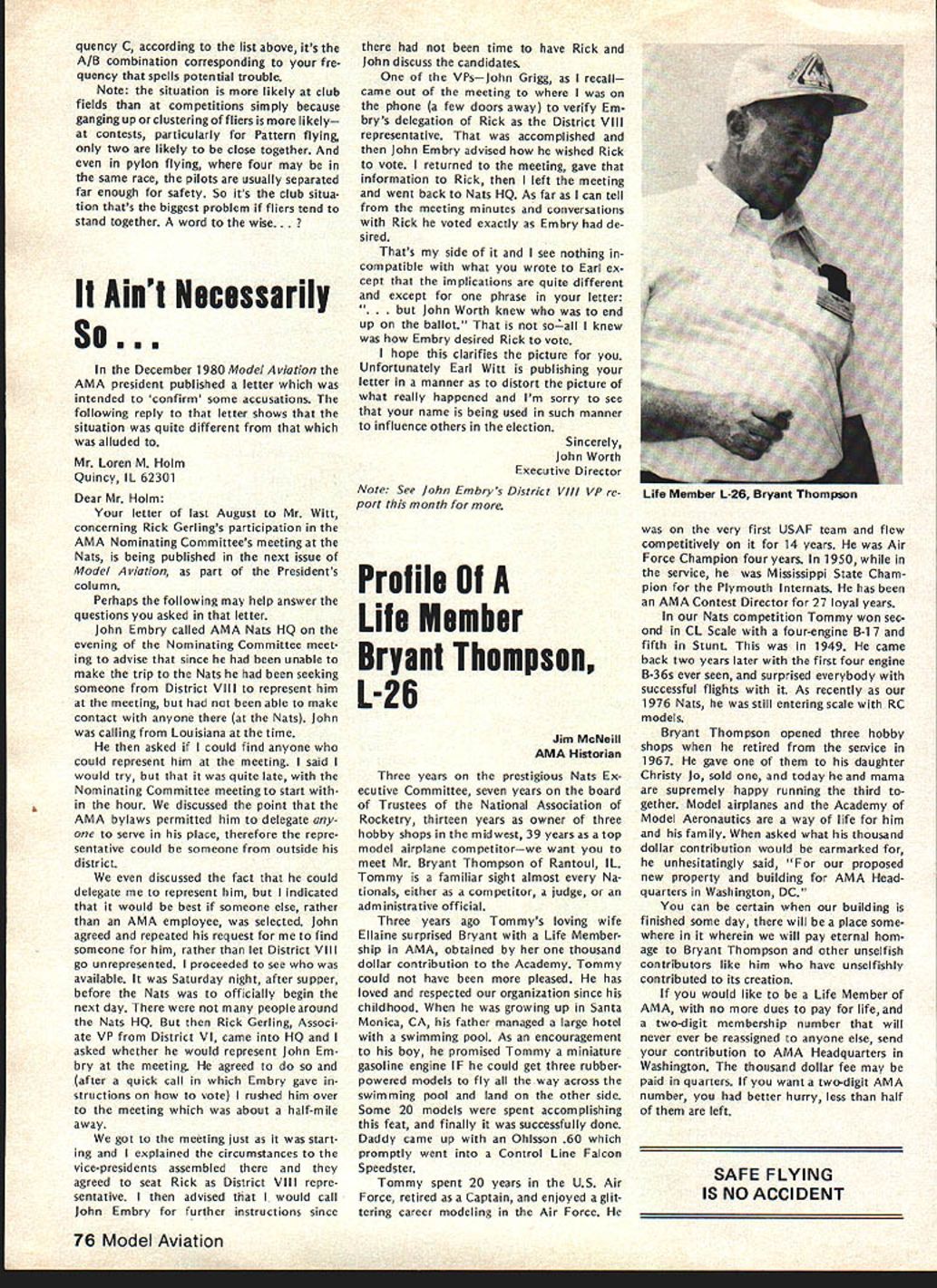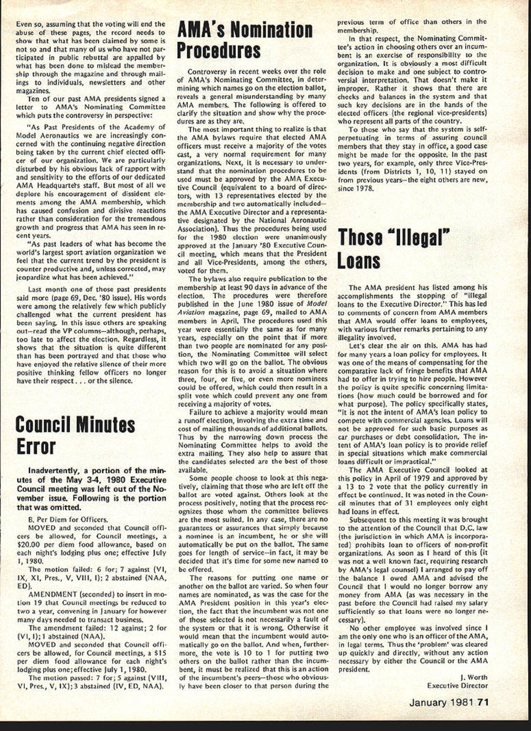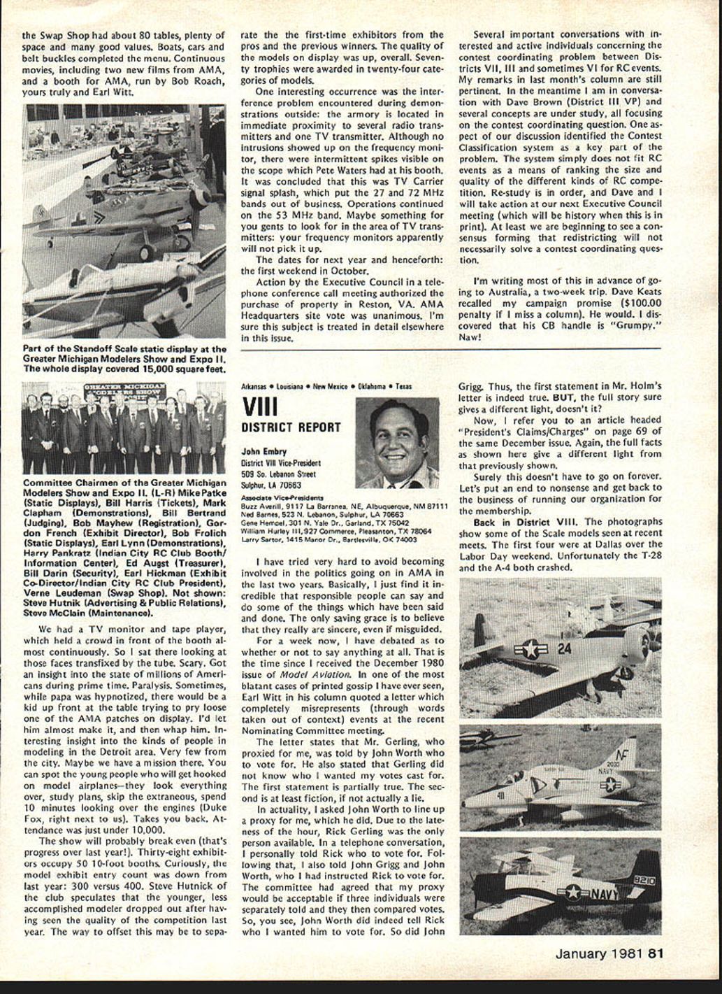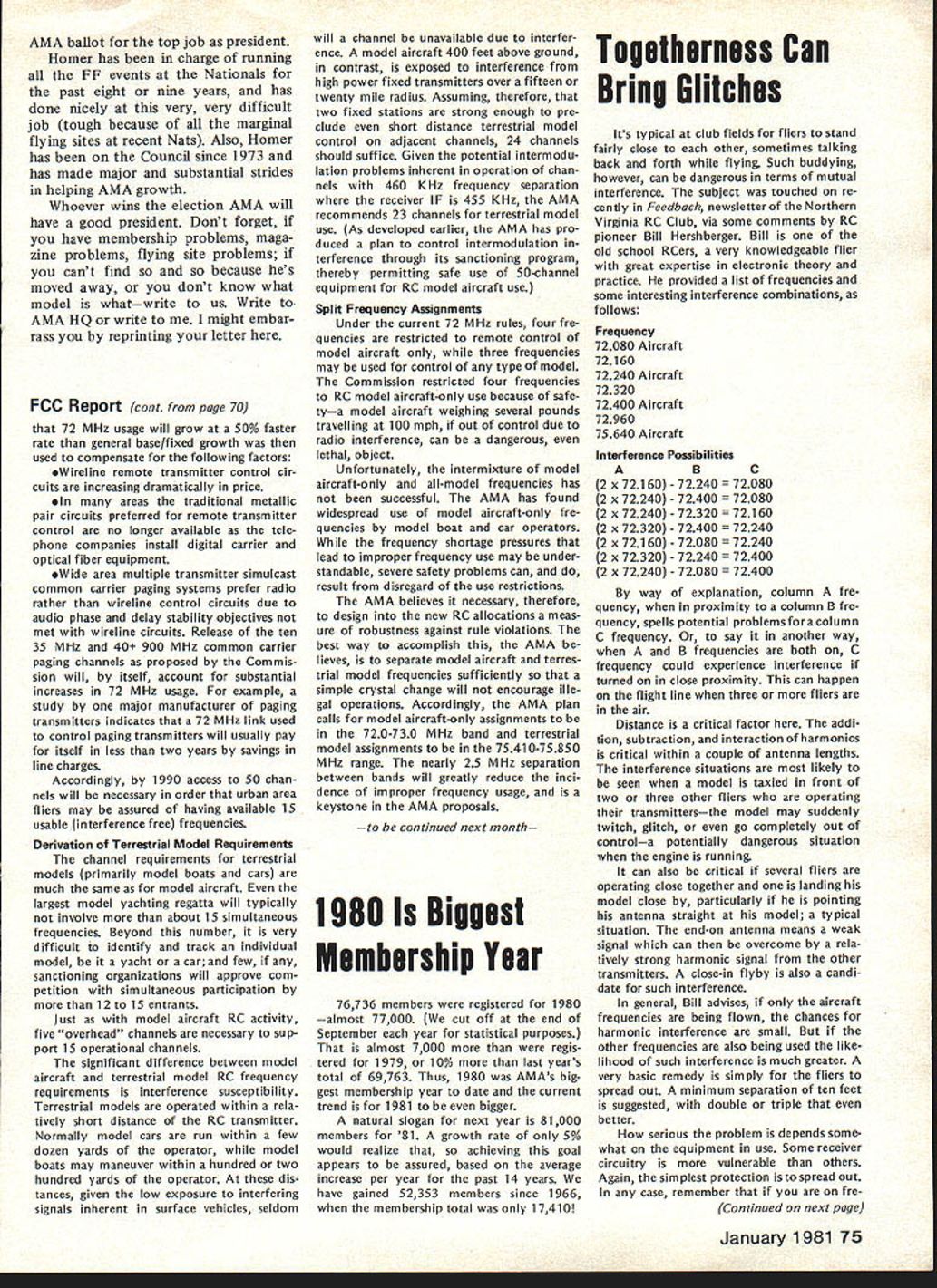 P AMA HQ Executive Director including reports AMA President Vice- Presidents L L AMA Special Report FCC Continued last month Number Channels Required AMA has identified RC channel re quirements follows Number Channels YearUsable ChannelsTotal Channels Aircraft 1980 1985 1990 20 20 20 1980 1985 1990 20 20 20 Terrestrial Models Derivation Aircraft Requirements AMA has identified requirement 20 channels model aircraft RC operations Simultaneous operation 15 aircraft demonstrated AMA contest 1 974when through use 2754 72 MHz equipment 17 RC channels available 15 aircraft actually flown Experience has shown however 15 aircraft air same time pilot confusion comes major problem contests fore multiple flight lines used spaced far enough apart contestants need keep track few planes flight lines gen erally however too close permit frequency reuse Given 15 channels desired number simultaneous use additional overhead allowance ground testing delays between flights necessary re turning frequency availability flags model field control must also accommo dated Because momentary interference can disastrous RC flier very tight controls imposed frequency usage contests non-contest flying also Before transmitter may activated operator must secure frequency flag channel board flag per channel kept flag missing frequency use may used other flier Based upon experience competition five additional channels required purposes making total 20 available interference-free freq uencies necessary order 15 channels may simultaneously used Since proposed channels inter ference-free effects 10 KHz adjacent channel sharing must considered As devel oped channel spacing discussion later report interstitial RC channels may still rendered unusable due fixed operations adjacent channel Although offset interstitial operation dramatically improves resistance RC operations fixed inter ference single fixed station strong enough cause problems will block both adjacent RC channels thereby undercutting some 30the advantage otherwise provided through 40interleaving fixed RC assignments 50 d upon FCCs frequency assign ment records 72-73 MHz AMA has 23prepared frequency availability list 23top 25 urban areas Taking average case 23 areas 72 MHz usage pre cluded three five 72 MHz fixed assignments currently exist Since assignment blocks two interstitial RC channels 30 channels needed assure 20 usable frequencies necessary project growth 72 MHz fixed systems over next 10 years determine AMAs present 10year growth channel requirements FCCs Annual Reports show following growth pattern number land mobile trans mitters licensed 0 C C C U 5 m C z 2 500000 2000 oeo 1500000I 000000sea eoo I 195019S019701980 Year Assuming 72 MHz use grows fast general increase base fixed station use highly conservative assumption given forces driving 72 MHz usage dis cussed below area ten RC channels unavailable 1980 will have 20 channels blocked 1990 An empirical assumption Continued page 75 Truth Takes Beating December issue AMA president printed AMA HQ has no censoring au thority over Council member columns list achievements indicated accomplished during term office Although indication supposedly meant president wasnt necessarily taking credit accomplishments implica tion obviously vein Lending weight interpretation similar cam paign statement distributed behalf president headline leaves no doubt intention says What Earl Witt Has Already Accomplished AMA Pres ident includes elaborate list achievements published Model viation other hand items necessarily achievement thats another story problem goes far beyond stretching truthit beats bloody pulp proof what claimed AMA members would have read carefully previously published minutes Council meetings during past two years particular president voted matters would like people give him credit Such study will show president abstained votes some cases actually voted against some items listed accomplishments Any real achievements involved therefore hardly individualthey largely result Executive Council board direc tors decisions note however merely con cerned accuracy what has said president election cam paign rather say because picture has lopsided distorted AMA mem bership has benefit fair impartial treatment has due mainly iggo fact AMAs employees have publish what has provided no authority correct prevent publica tion has especially frustrating un fair employees themselves have accused improper actions Some accusations slanderous could subject writer being sued Yet have pursued legal recourses because cost time ultimate dam age Academy also because faith justice will prevail via election process 70 Model Aviation ACADEMY OF MODEL AERONAUTICS 81 5 Fifteenth Street NW Washington DC 20005 assuming voting will end abuse pages record needs show what has claimed some us have par ticipated public rebuttal appalled what has done mislead member ship through magazine through mail ings individuals newsletters other magazines Ten past AMA presidents signed letter AMAs Nominating Committee puts controversy perspective As Past Presidents Academy Model Aeronautics increasingly con cerned continuing negative direction being taken current chief elected offi cer organization particularly disturbed obvious lack rapport sensitivity efforts dedicated AMA Headquartels staff deplore encouragement dissident ele ments among AMA membership has caused confusion divisive reactions rather consideration tremendous growth progress AMA has seen re cent years As past leaders what has become worlds largest sport aviation organization feel current trend president counter productive unless corrected may jeopardize what has achieved Last month past presidents said page 69 Dec 80 issue words among relatively few publicly challenged what current president has saying issue others speaking outread VP columnsalthough perhaps too late affect election Regardless shows situation quite different has portrayed have enjoyed relative silence positive thinking fellow 