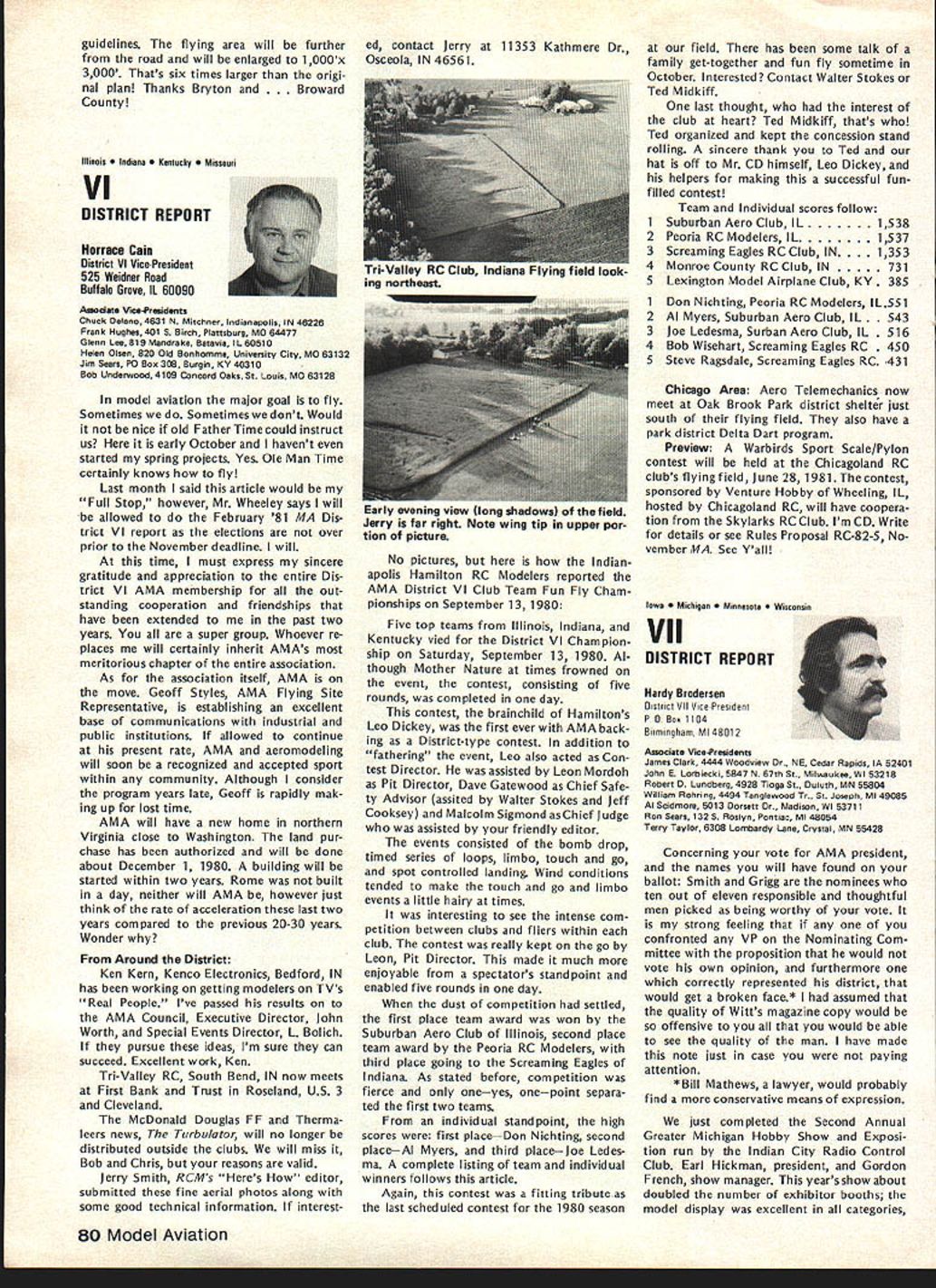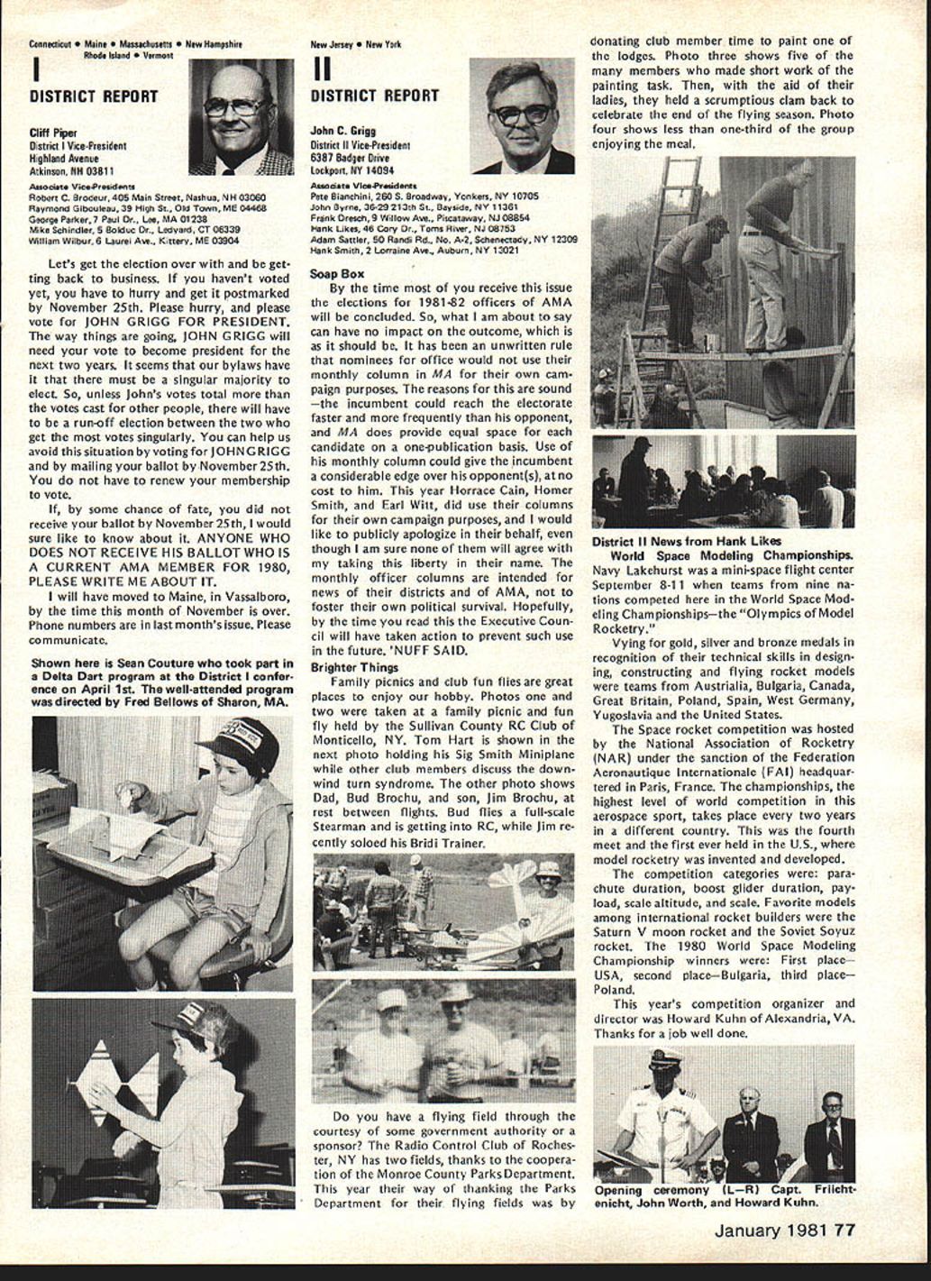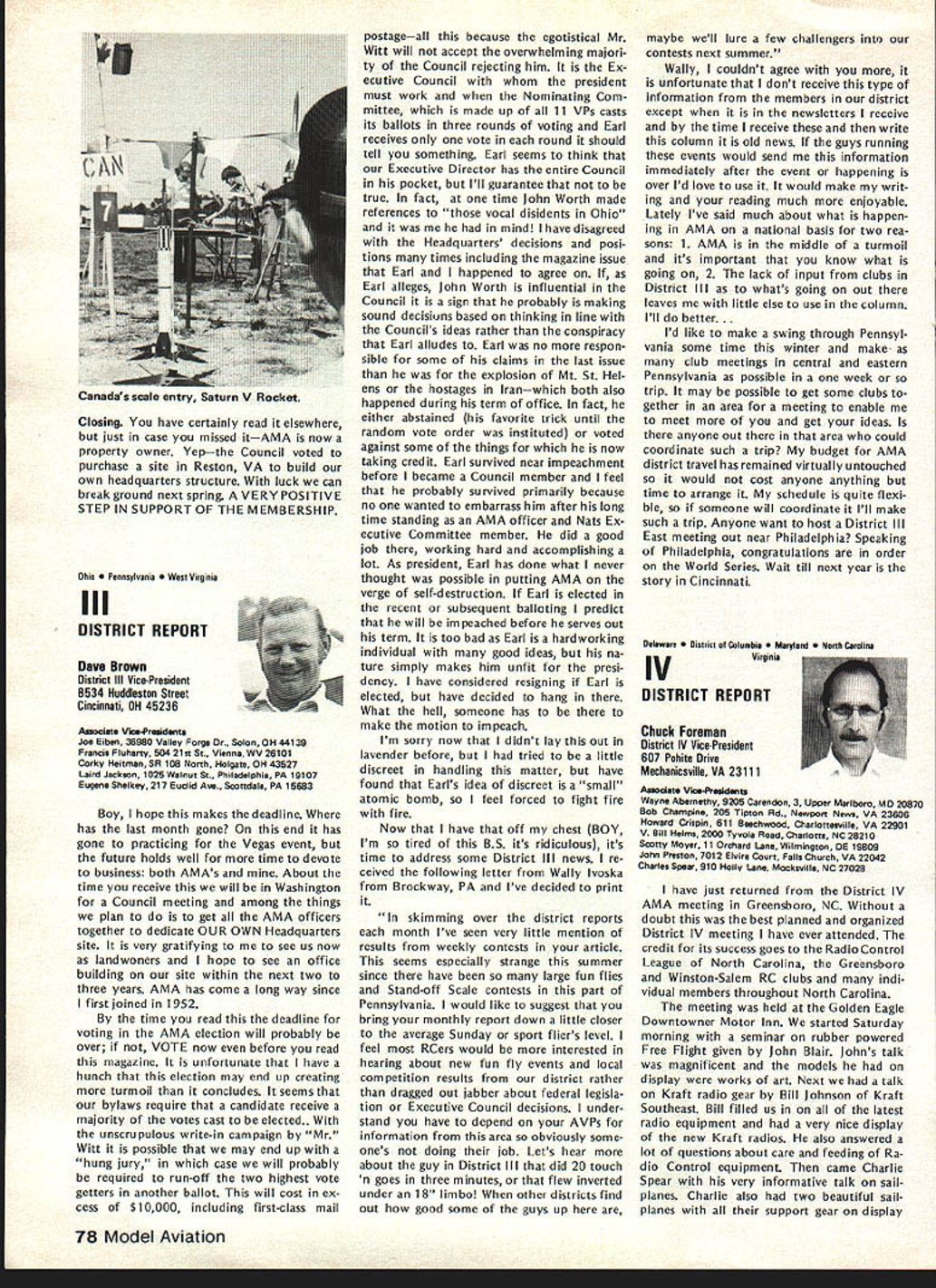 P AMA HQ Executive Director including reports AMA President Vice- Presidents L L AMA Special Report FCC Continued last month Number Channels Required AMA has identified RC channel re quirements follows Number Channels YearUsable ChannelsTotal Channels Aircraft 1980 1985 1990 20 20 20 1980 1985 1990 20 20 20 Terrestrial Models Derivation Aircraft Requirements AMA has identified requirement 20 channels model aircraft RC operations Simultaneous operation 15 aircraft demonstrated AMA contest 1 974when through use 2754 72 MHz equipment 17 RC channels available 15 aircraft actually flown Experience has shown however 15 aircraft air same time pilot confusion comes major problem contests fore multiple flight lines used spaced far enough apart contestants need keep track few planes flight lines gen erally however too close permit frequency reuse Given 15 channels desired number simultaneous use additional overhead allowance ground testing delays between flights necessary re turning frequency availability flags model field control must also accommo dated Because momentary interference can disastrous RC flier very tight controls imposed frequency usage contests non-contest flying also Before transmitter may activated operator must secure frequency flag channel board flag per channel kept flag missing frequency use may used other flier Based upon experience competition five additional channels required purposes making total 20 available interference-free freq uencies necessary order 15 channels may simultaneously used Since proposed channels inter ference-free effects 10 KHz adjacent channel sharing must considered As devel oped channel spacing discussion later report interstitial RC channels may still rendered unusable due fixed operations adjacent channel Although offset interstitial operation dramatically improves resistance RC operations fixed inter ference single fixed station strong enough cause problems will block both adjacent RC channels thereby undercutting some 30the advantage otherwise provided through 40interleaving fixed RC assignments 50 d upon FCCs frequency assign ment records 72-73 MHz AMA has 23prepared frequency availability list 23top 25 urban areas Taking average case 23 areas 72 MHz usage pre cluded three five 72 MHz fixed assignments currently exist Since assignment blocks two interstitial RC channels 30 channels needed assure 20 usable frequencies necessary project growth 72 MHz fixed systems over next 10 years determine AMAs present 10year growth channel requirements FCCs Annual Reports show following growth pattern number land mobile trans mitters licensed 0 C C C U 5 m C z 2 500000 2000 oeo 1500000I 000000sea eoo I 195019S019701980 Year Assuming 72 MHz use grows fast general increase base fixed station use highly conservative assumption given forces driving 72 MHz usage dis cussed below area ten RC channels unavailable 1980 will have 20 channels blocked 1990 An empirical assumption Continued page 75 Truth Takes Beating December issue AMA president printed AMA HQ has no censoring au thority over Council member columns list achievements indicated accomplished during term office Although indication supposedly meant president wasnt necessarily taking credit accomplishments implica tion obviously vein Lending weight interpretation similar cam paign statement distributed behalf president headline leaves no doubt intention says What Earl Witt Has Already Accomplished AMA Pres ident includes elaborate list achievements published Model viation other hand items necessarily achievement thats another story problem goes far beyond stretching truthit beats bloody pulp proof what claimed AMA members would have read carefully previously published minutes Council meetings during past two years particular president voted matters would like people give him credit Such study will show president abstained votes some cases actually voted against some items listed accomplishments Any real achievements involved therefore hardly individualthey largely result Executive Council board direc tors decisions note however merely con cerned accuracy what has said president election cam paign rather say because picture has lopsided distorted AMA mem bership has benefit fair impartial treatment has due mainly iggo fact AMAs employees have publish what has provided no authority correct prevent publica tion has especially frustrating un fair employees themselves have accused improper actions Some accusations slanderous could subject writer being sued Yet have pursued legal recourses because cost time ultimate dam age Academy also because faith justice will prevail via election process 70 Model Aviation ACADEMY OF MODEL AERONAUTICS 81 5 Fifteenth Street NW Washington DC 20005 assuming voting will end abuse pages record needs show what has claimed some us have par ticipated public rebuttal appalled what has done mislead member ship through magazine through mail ings individuals newsletters other magazines Ten past AMA presidents signed letter AMAs Nominating Committee puts controversy perspective As Past Presidents Academy Model Aeronautics increasingly con cerned continuing negative direction being taken current chief elected offi cer organization particularly disturbed obvious lack rapport sensitivity efforts dedicated AMA Headquartels staff deplore encouragement dissident ele ments among AMA membership has caused confusion divisive reactions rather consideration tremendous growth progress AMA has seen re cent years As past leaders what has become worlds largest sport aviation organization feel current trend president counter productive unless corrected may jeopardize what has achieved Last month past presidents said page 69 Dec 80 issue words among relatively few publicly challenged what current president has saying issue others speaking outread VP columnsalthough perhaps too late affect election Regardless shows situation quite different has portrayed have enjoyed relative silence positive thinking fellow 