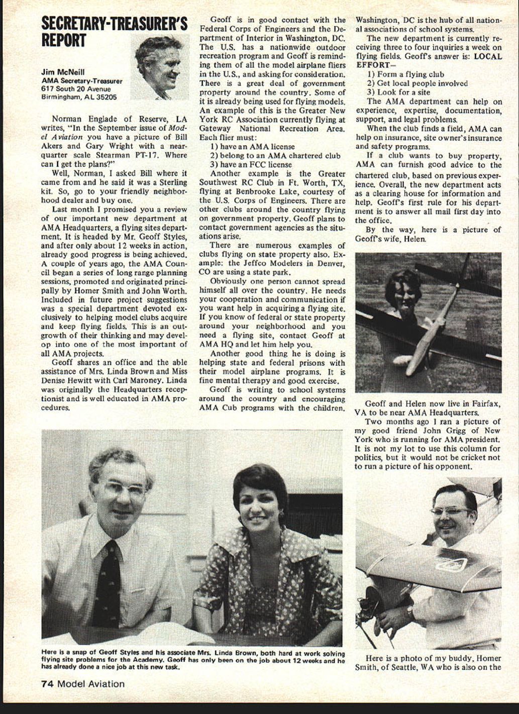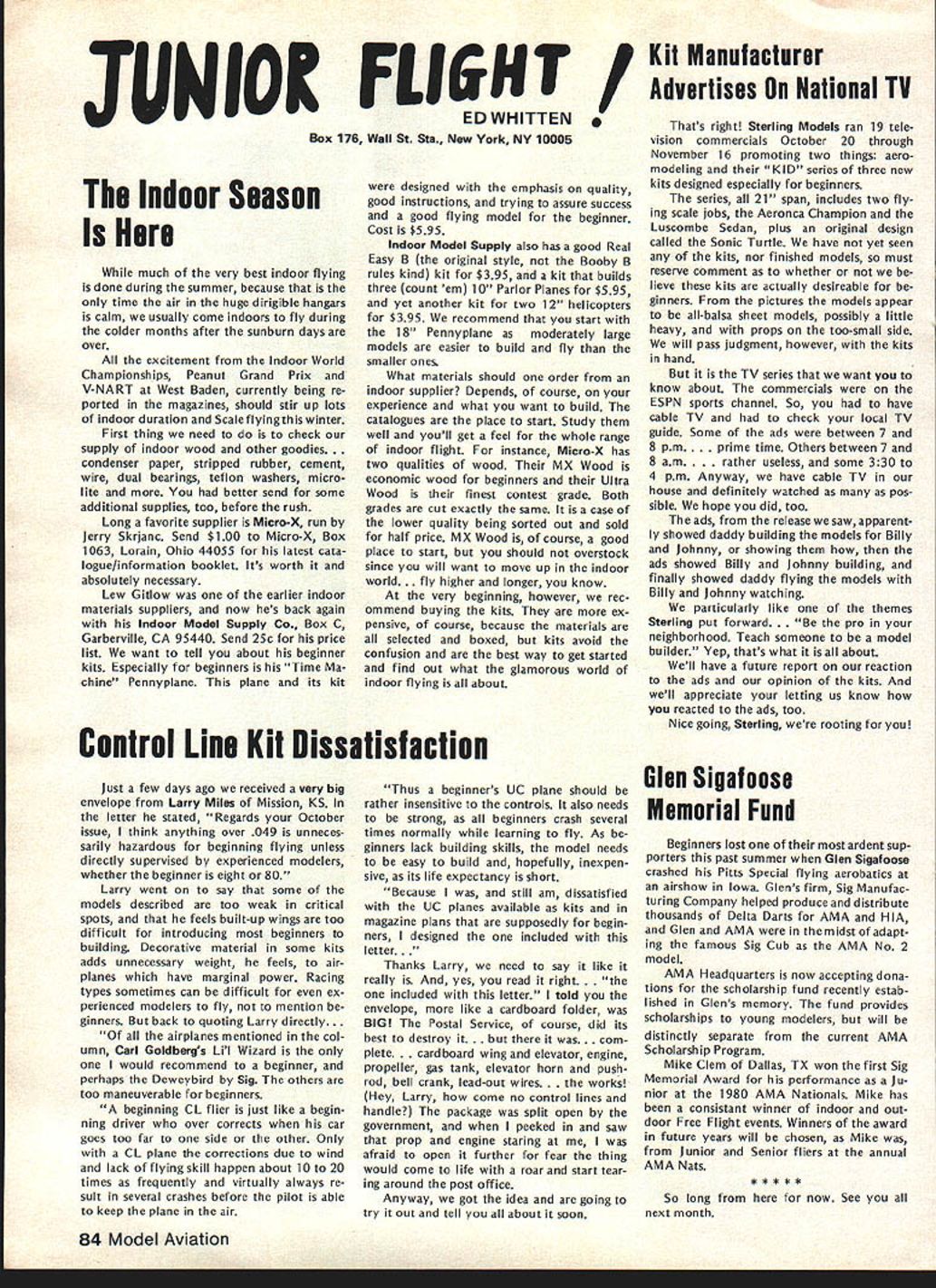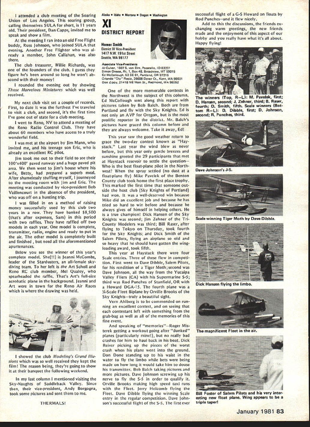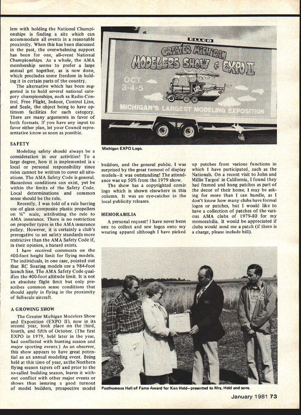 P AMA HQ Executive Director including reports AMA President Vice- Presidents L L AMA Special Report FCC Continued last month Number Channels Required AMA has identified RC channel re quirements follows Number Channels YearUsable ChannelsTotal Channels Aircraft 1980 1985 1990 20 20 20 1980 1985 1990 20 20 20 Terrestrial Models Derivation Aircraft Requirements AMA has identified requirement 20 channels model aircraft RC operations Simultaneous operation 15 aircraft demonstrated AMA contest 1 974when through use 2754 72 MHz equipment 17 RC channels available 15 aircraft actually flown Experience has shown however 15 aircraft air same time pilot confusion comes major problem contests fore multiple flight lines used spaced far enough apart contestants need keep track few planes flight lines gen erally however too close permit frequency reuse Given 15 channels desired number simultaneous use additional overhead allowance ground testing delays between flights necessary re turning frequency availability flags model field control must also accommo dated Because momentary interference can disastrous RC flier very tight controls imposed frequency usage contests non-contest flying also Before transmitter may activated operator must secure frequency flag channel board flag per channel kept flag missing frequency use may used other flier Based upon experience competition five additional channels required purposes making total 20 available interference-free freq uencies necessary order 15 channels may simultaneously used Since proposed channels inter ference-free effects 10 KHz adjacent channel sharing must considered As devel oped channel spacing discussion later report interstitial RC channels may still rendered unusable due fixed operations adjacent channel Although offset interstitial operation dramatically improves resistance RC operations fixed inter ference single fixed station strong enough cause problems will block both adjacent RC channels thereby undercutting some 30the advantage otherwise provided through 40interleaving fixed RC assignments 50 d upon FCCs frequency assign ment records 72-73 MHz AMA has 23prepared frequency availability list 23top 25 urban areas Taking average case 23 areas 72 MHz usage pre cluded three five 72 MHz fixed assignments currently exist Since assignment blocks two interstitial RC channels 30 channels needed assure 20 usable frequencies necessary project growth 72 MHz fixed systems over next 10 years determine AMAs present 10year growth channel requirements FCCs Annual Reports show following growth pattern number land mobile trans mitters licensed 0 C C C U 5 m C z 2 500000 2000 oeo 1500000I 000000sea eoo I 195019S019701980 Year Assuming 72 MHz use grows fast general increase base fixed station use highly conservative assumption given forces driving 72 MHz usage dis cussed below area ten RC channels unavailable 1980 will have 20 channels blocked 1990 An empirical assumption Continued page 75 Truth Takes Beating December issue AMA president printed AMA HQ has no censoring au thority over Council member columns list achievements indicated accomplished during term office Although indication supposedly meant president wasnt necessarily taking credit accomplishments implica tion obviously vein Lending weight interpretation similar cam paign statement distributed behalf president headline leaves no doubt intention says What Earl Witt Has Already Accomplished AMA Pres ident includes elaborate list achievements published Model viation other hand items necessarily achievement thats another story problem goes far beyond stretching truthit beats bloody pulp proof what claimed AMA members would have read carefully previously published minutes Council meetings during past two years particular president voted matters would like people give him credit Such study will show president abstained votes some cases actually voted against some items listed accomplishments Any real achievements involved therefore hardly individualthey largely result Executive Council board direc tors decisions note however merely con cerned accuracy what has said president election cam paign rather say because picture has lopsided distorted AMA mem bership has benefit fair impartial treatment has due mainly iggo fact AMAs employees have publish what has provided no authority correct prevent publica tion has especially frustrating un fair employees themselves have accused improper actions Some accusations slanderous could subject writer being sued Yet have pursued legal recourses because cost time ultimate dam age Academy also because faith justice will prevail via election process 70 Model Aviation ACADEMY OF MODEL AERONAUTICS 81 5 Fifteenth Street NW Washington DC 20005 assuming voting will end abuse pages record needs show what has claimed some us have par ticipated public rebuttal appalled what has done mislead member ship through magazine through mail ings individuals newsletters other magazines Ten past AMA presidents signed letter AMAs Nominating Committee puts controversy perspective As Past Presidents Academy Model Aeronautics increasingly con cerned continuing negative direction being taken current chief elected offi cer organization particularly disturbed obvious lack rapport sensitivity efforts dedicated AMA Headquartels staff deplore encouragement dissident ele ments among AMA membership has caused confusion divisive reactions rather consideration tremendous growth progress AMA has seen re cent years As past leaders what has become worlds largest sport aviation organization feel current trend president counter productive unless corrected may jeopardize what has achieved Last month past presidents said page 69 Dec 80 issue words among relatively few publicly challenged what current president has saying issue others speaking outread VP columnsalthough perhaps too late affect election Regardless shows situation quite different has portrayed have enjoyed relative silence positive thinking fellow 