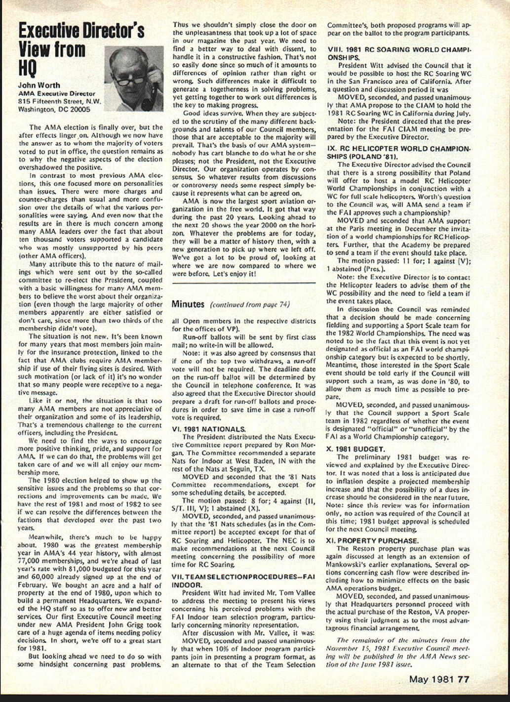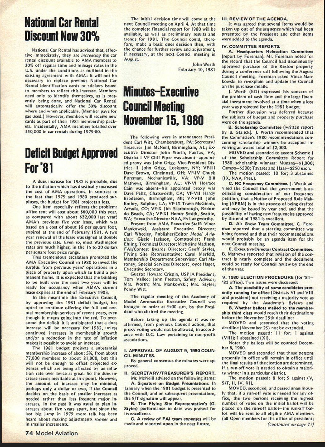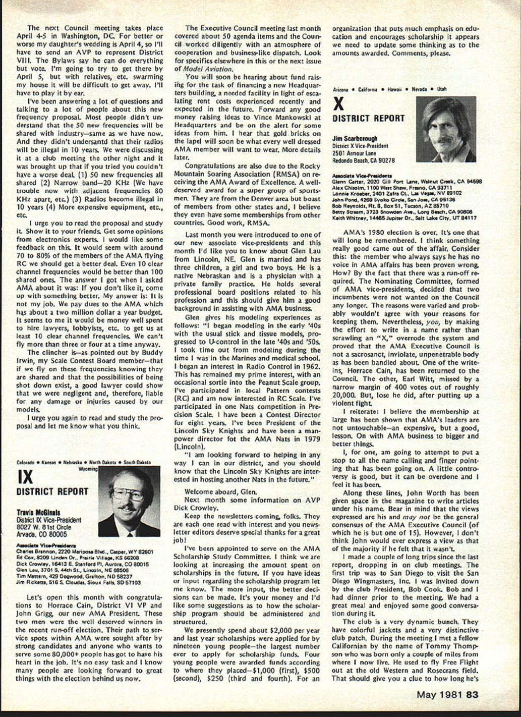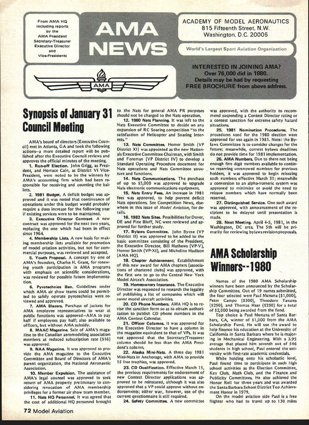 r Synopsis ot January 31 Council Meeting AMAs board ofdirectors Executive Coun cii met Atlanta GA took following actionsa detailed report will pub lished after Executive Council reviews approves official minutes meeting 1 Run-off Election John Grigg Presi dent Horrace Cain District VI VicePresident noted winners AMAs accounting firm re sponsible receiving counting bal lots 2 1981 Budget deficit budget ap proved noted continuance operations under budget would probably require dues increase following year existing services maintained 3 Executive Director Contract new contract approved next two years replacing effect since 1964 4 Membership Lists new basis mak ing membership lists available promotion model aviation activities com mercial purposes reviewed accepted 5 Youth Proposal concept AMAs founders Charles H Grant renew ing youth participation AMA programs emphasis scientific considerations reviewed possible future implementa tion 6 Pyrotechnics Ban Guidelines under AMA air show teams could permit ted safely operate pyrotechnics re viewed approved 7 AMA Blazers Purchase jackets AMA employee representatives wear public functions approvedAMA pay half employees pay half also available officers AMA subsidy 8 MAAC Magazine Sale AMAs maga zine Canadian aeromodeling association members reduced subscription rate $16 approved 9 NAA Magazine approved pro vide AMA magazine Executive Committee Board Directors AMAs parent organization National Aeronautic Association 10 Member Expulsion assistance AMAs legal counsel approved seek return AMA property preliminary con sidering revocation AMA membership privileges former air show team member 11 Nats 1-10 Personnel agreed cost additional HQ personnel brought Nats general AMA PR purposes should charged Nats operation 12 1980 Nats Planning left Nats Executive Committee decide expansion RC Soaring competition satisfaction Helicopter Soaring Inter ests 13 Nats Committee Homer Smith VP District Xl appointed new Nation als Executive Committee Chairman Smith Foreman VP District IV develop Standard Operating Procedure document Nats operations Nats Committee struc ture functions 14 Nats Communications purchase up $5000 approved upgrade Nats electronic communications equipment 15 Nats Entry lees An increase 1981 fees approved help prevent deficit Nats operations See Competition News else issue Model Aviation de tails 161982 Nats Sites Possibilitiesfor Dover DE Pine Bluff NC reviewed ap proved further study 17 Bylaws Committee John Byrne VP District II approved added basic committee consisting President Executive Director Bill Mathews VP-V Homer Smith VP-XI Micheline Madison AMA HQ 18 Chapter Achievement Establishment new award AMA chapters associa tions chartered clubs approved first go Central New York Model Aircraft Association 19 Homeowners Insurance Executive Director requested research legality publishing list companies will cover model aircraft activities 20 CD Phone Numbers AMA HQ re vise sanction form obt&m authori zation publish CD phone numbers AMA Contest Calendar 21 Officer Columns approved Executive Director have column magazine equivalent VPs approved Secretary/Treasurer column should less AMA Presi dents column 22 Alaska Mini-Nats three day 1981 Mini-Nats Anchorage AMA provide 15 free trophies approved 23 CD Qualification Effective March 15 previous requirements endorsement new Contest Director applications ap proved reinstated although also approved VP could approve en dorsements either way however use current questionnaire still required 24 Safety Committee new committee approved authority recom mend suspending Contest Director rating contest sanction extreme safety hazard situations 25 1981 Nomination Procedures procedures used 1980 election approved use again 1981 Note laws Committee consider changes future meanwhile current bylaws deadlines provide time 1981 implementation 26 AMA Numbers Due being enough five digit numbers available contin ue reserving unrenewed numbers previous holders approved begin reissuing such numbers effective March 31 meanwhile conversion alpha-numeric system approved minimize avoid need reissue numbers have normally reserved 27 Distinguished Service such award approved announcement re cipient delayed until presentation made 28 Next Meeting April 4-5 1981 Washington DC area 5th will pri m arily reviewing bylaws revision proposals AMA Scholarship Winners- -1980 Names 1980 AMA Scholarship winners have announced Scholar ship Committee Out 19 names submitted four selected Paul Munana $1000 Peter Campo $500 Theodore Tavares $250 Thomas Haar $250 total $2000 being awarded fund Top choice Paul Munana Santa Bar bara CA winner $1000 AMA Scholarship Fund will use award help finance education University California Santa Barbara major ing Mechanical Engineering 395 average placed him seventh out 546 students high school Paul entered uni versity first-rate academic credentials holding onto scholastic level Paul found time participate such high school activities Election Committee Key Club Math Club Finance Publicity Committees also achieved Honor Roll three years awarded Santa Barbara School District Top Achieve ment Honor 1979 model aviation side Paul free flighter travel up 130 miles 72 Model Aviation AMA HQ including reports AMA President Secretary-Treasurer Executive Director Vice-Presidents ACADEMY OF MODEL AERONAUTICS 815 Fifteenth Street NW Washington DC 20005 home Taft could fly top modeling prize came May 1980 Taft won Ode Randall Memorial Trophy placing first Senior new AMA record time 51 minutes 29 seconds Previous Paul won tro phies 1979 Nats held Riverside CA four seven events entered past three years Paul has entered contests wide variety classes always keen competitor times going home trophies Paul stated application involvement model aviation has enthusiastically supported parents has resulted much happiness satis faction family Paul founding member Santa Barbara Indoor Aeromodelers Club served executive member Presen