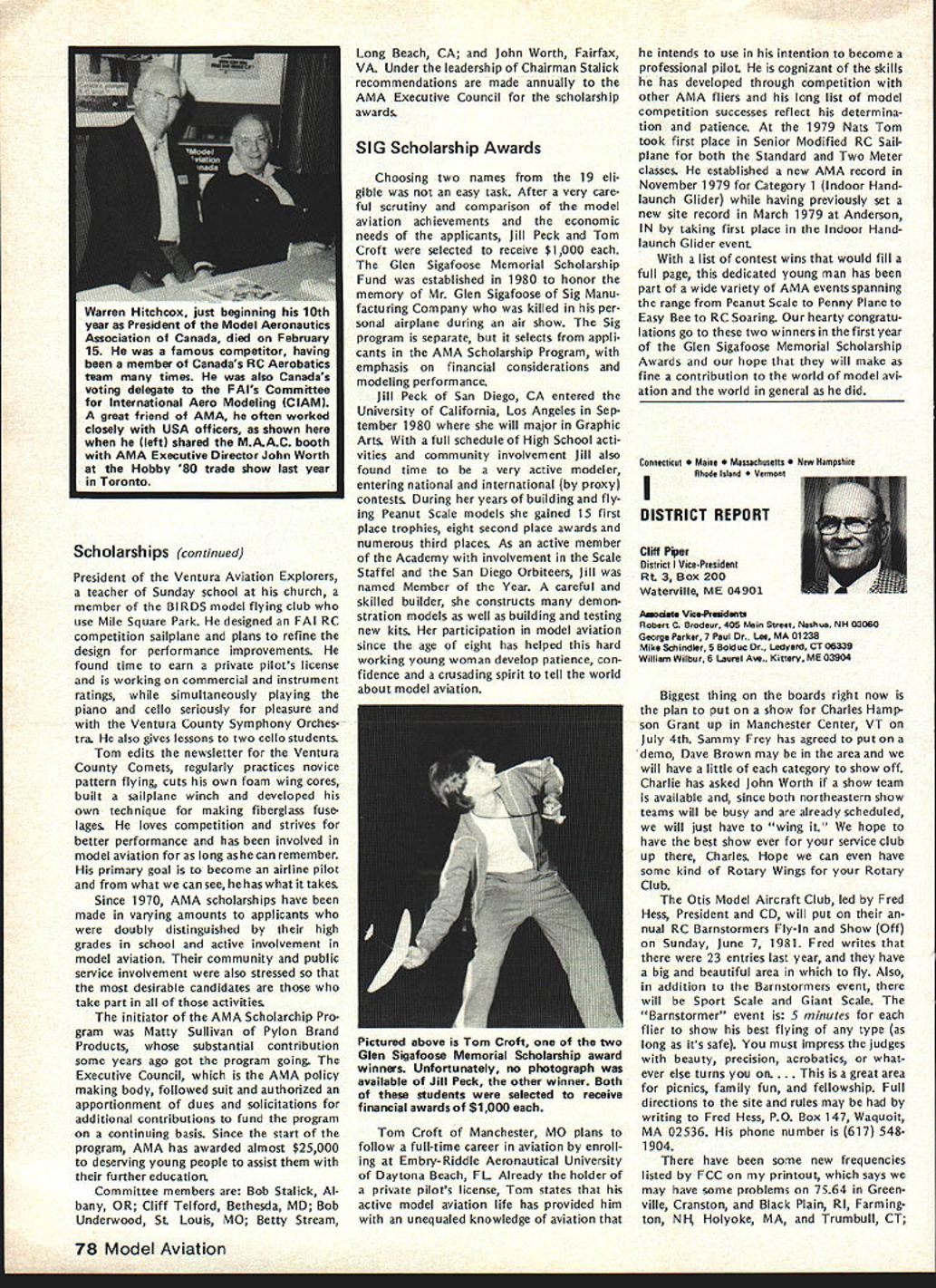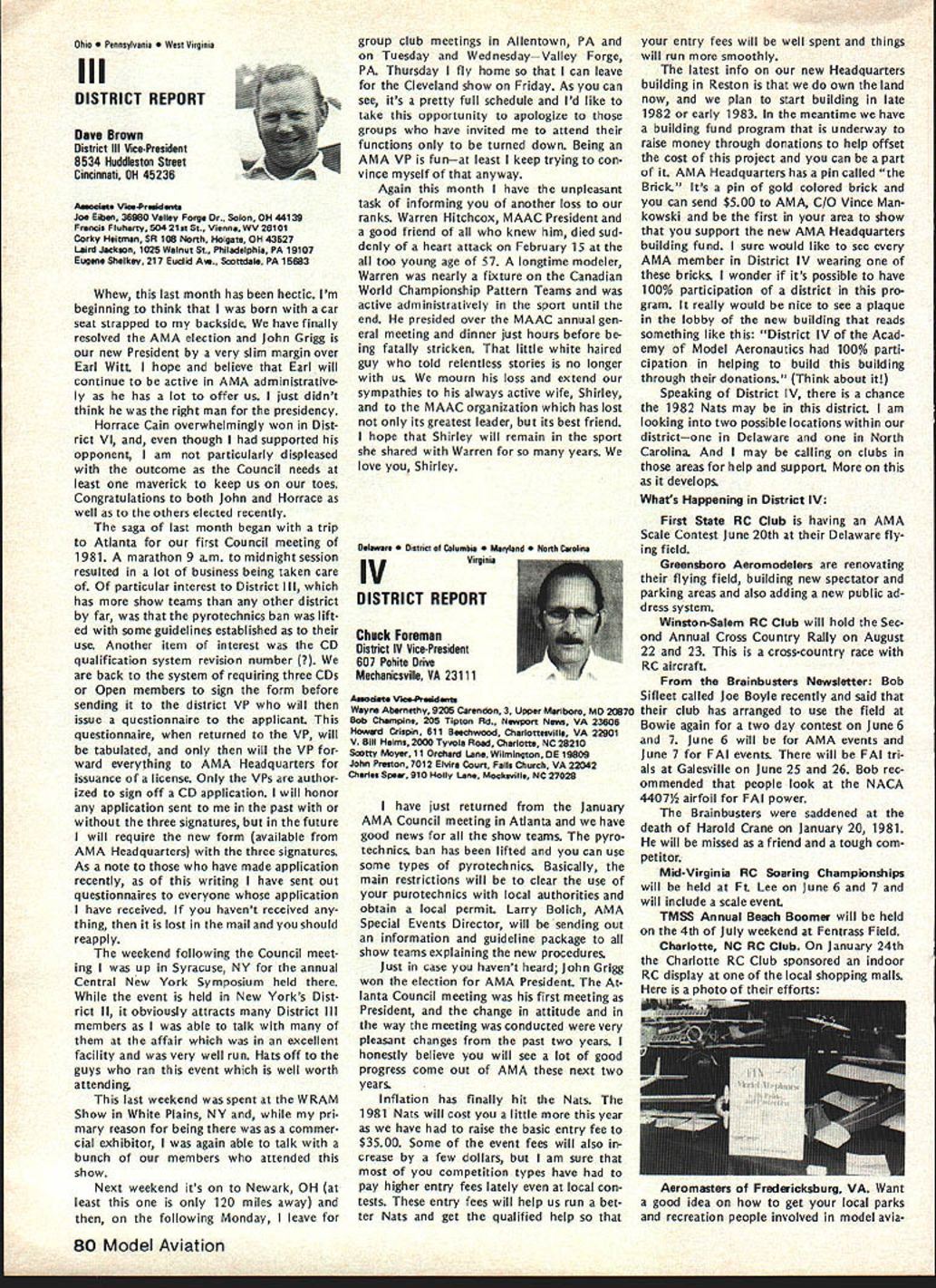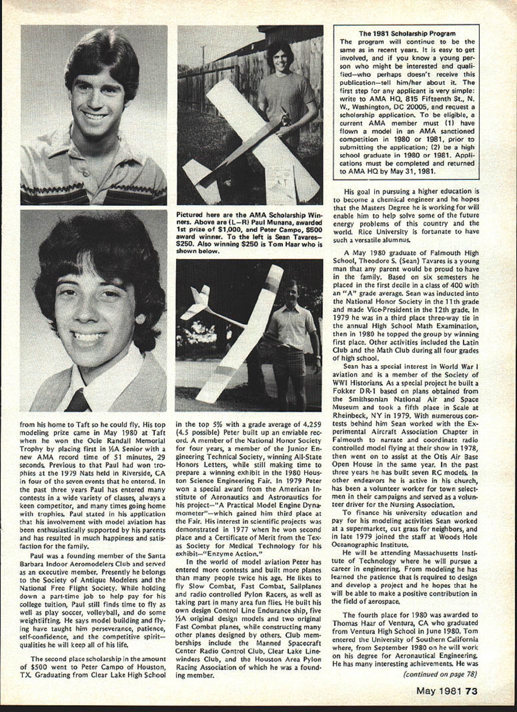 r Synopsis ot January 31 Council Meeting AMAs board ofdirectors Executive Coun cii met Atlanta GA took following actionsa detailed report will pub lished after Executive Council reviews approves official minutes meeting 1 Run-off Election John Grigg Presi dent Horrace Cain District VI VicePresident noted winners AMAs accounting firm re sponsible receiving counting bal lots 2 1981 Budget deficit budget ap proved noted continuance operations under budget would probably require dues increase following year existing services maintained 3 Executive Director Contract new contract approved next two years replacing effect since 1964 4 Membership Lists new basis mak ing membership lists available promotion model aviation activities com mercial purposes reviewed accepted 5 Youth Proposal concept AMAs founders Charles H Grant renew ing youth participation AMA programs emphasis scientific considerations reviewed possible future implementa tion 6 Pyrotechnics Ban Guidelines under AMA air show teams could permit ted safely operate pyrotechnics re viewed approved 7 AMA Blazers Purchase jackets AMA employee representatives wear public functions approvedAMA pay half employees pay half also available officers AMA subsidy 8 MAAC Magazine Sale AMAs maga zine Canadian aeromodeling association members reduced subscription rate $16 approved 9 NAA Magazine approved pro vide AMA magazine Executive Committee Board Directors AMAs parent organization National Aeronautic Association 10 Member Expulsion assistance AMAs legal counsel approved seek return AMA property preliminary con sidering revocation AMA membership privileges former air show team member 11 Nats 1-10 Personnel agreed cost additional HQ personnel brought Nats general AMA PR purposes should charged Nats operation 12 1980 Nats Planning left Nats Executive Committee decide expansion RC Soaring competition satisfaction Helicopter Soaring Inter ests 13 Nats Committee Homer Smith VP District Xl appointed new Nation als Executive Committee Chairman Smith Foreman VP District IV develop Standard Operating Procedure document Nats operations Nats Committee struc ture functions 14 Nats Communications purchase up $5000 approved upgrade Nats electronic communications equipment 15 Nats Entry lees An increase 1981 fees approved help prevent deficit Nats operations See Competition News else issue Model Aviation de tails 161982 Nats Sites Possibilitiesfor Dover DE Pine Bluff NC reviewed ap proved further study 17 Bylaws Committee John Byrne VP District II approved added basic committee consisting President Executive Director Bill Mathews VP-V Homer Smith VP-XI Micheline Madison AMA HQ 18 Chapter Achievement Establishment new award AMA chapters associa tions chartered clubs approved first go Central New York Model Aircraft Association 19 Homeowners Insurance Executive Director requested research legality publishing list companies will cover model aircraft activities 20 CD Phone Numbers AMA HQ re vise sanction form obt&m authori zation publish CD phone numbers AMA Contest Calendar 21 Officer Columns approved Executive Director have column magazine equivalent VPs approved Secretary/Treasurer column should less AMA Presi dents column 22 Alaska Mini-Nats three day 1981 Mini-Nats Anchorage AMA provide 15 free trophies approved 23 CD Qualification Effective March 15 previous requirements endorsement new Contest Director applications ap proved reinstated although also approved VP could approve en dorsements either way however use current questionnaire still required 24 Safety Committee new committee approved authority recom mend suspending Contest Director rating contest sanction extreme safety hazard situations 25 1981 Nomination Procedures procedures used 1980 election approved use again 1981 Note laws Committee consider changes future meanwhile current bylaws deadlines provide time 1981 implementation 26 AMA Numbers Due being enough five digit numbers available contin ue reserving unrenewed numbers previous holders approved begin reissuing such numbers effective March 31 meanwhile conversion alpha-numeric system approved minimize avoid need reissue numbers have normally reserved 27 Distinguished Service such award approved announcement re cipient delayed until presentation made 28 Next Meeting April 4-5 1981 Washington DC area 5th will pri m arily reviewing bylaws revision proposals AMA Scholarship Winners- -1980 Names 1980 AMA Scholarship winners have announced Scholar ship Committee Out 19 names submitted four selected Paul Munana $1000 Peter Campo $500 Theodore Tavares $250 Thomas Haar $250 total $2000 being awarded fund Top choice Paul Munana Santa Bar bara CA winner $1000 AMA Scholarship Fund will use award help finance education University California Santa Barbara major ing Mechanical Engineering 395 average placed him seventh out 546 students high school Paul entered uni versity first-rate academic credentials holding onto scholastic level Paul found time participate such high school activities Election Committee Key Club Math Club Finance Publicity Committees also achieved Honor Roll three years awarded Santa Barbara School District Top Achieve ment Honor 1979 model aviation side Paul free flighter travel up 130 miles 72 Model Aviation AMA HQ including reports AMA President Secretary-Treasurer Executive Director Vice-Presidents ACADEMY OF MODEL AERONAUTICS 815 Fifteenth Street NW Washington DC 20005 home Taft could fly top modeling prize came May 1980 Taft won Ode Randall Memorial Trophy placing first Senior new AMA record time 51 minutes 29 seconds Previous Paul won tro phies 1979 Nats held Riverside CA four seven events entered past three years Paul has entered contests wide variety classes always keen competitor times going home trophies Paul stated application involvement model aviation has enthusiastically supported parents has resulted much happiness satis faction family Paul founding member Santa Barbara Indoor Aeromodelers Club served executive member Presen