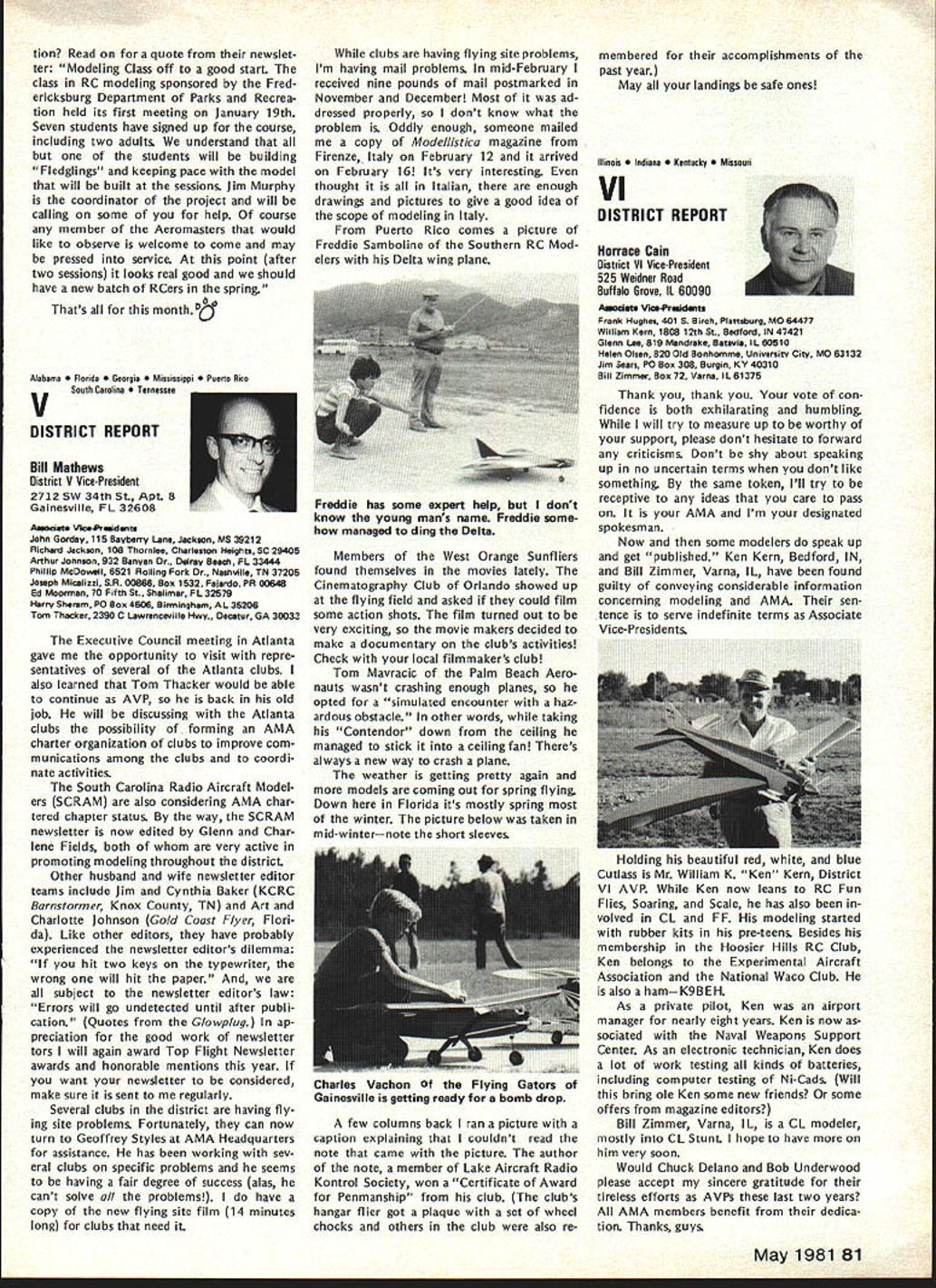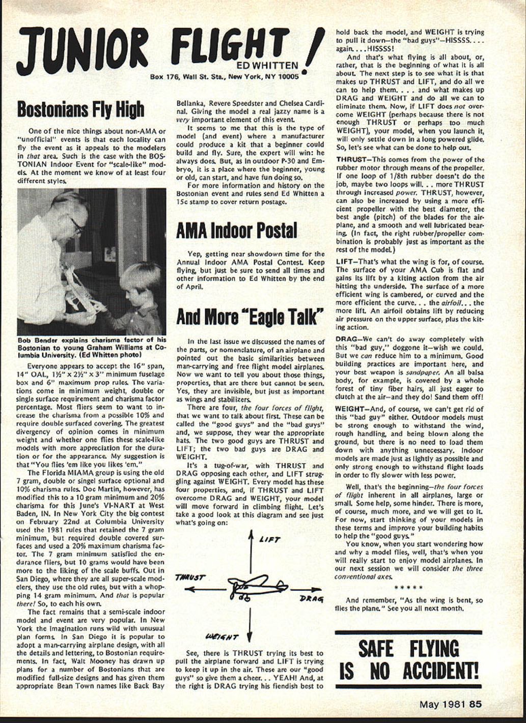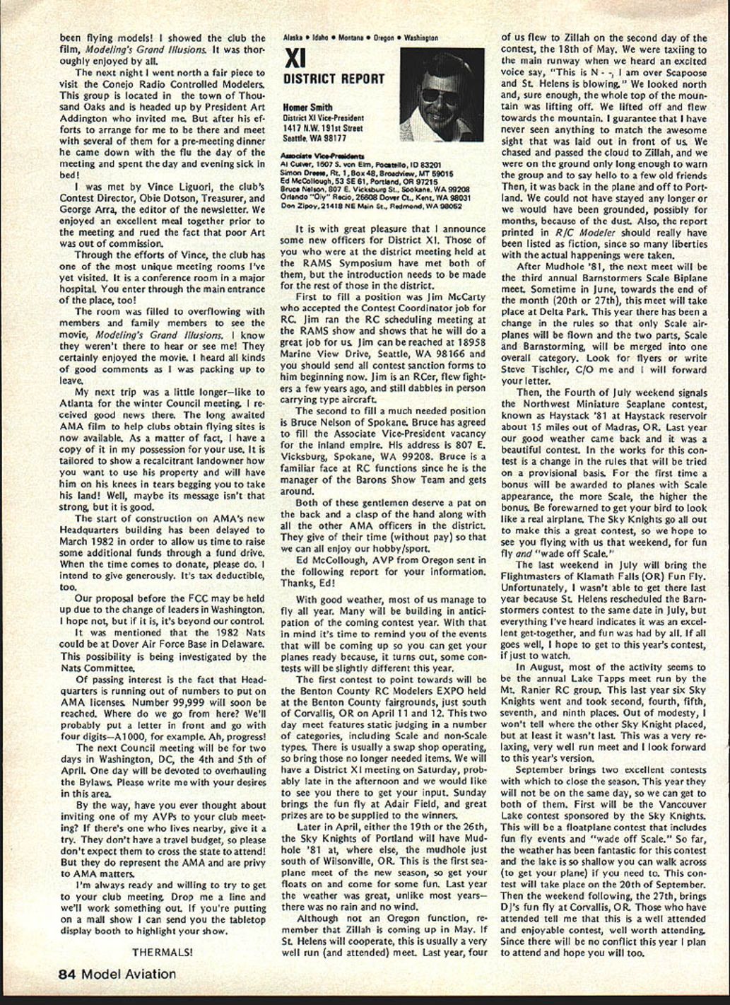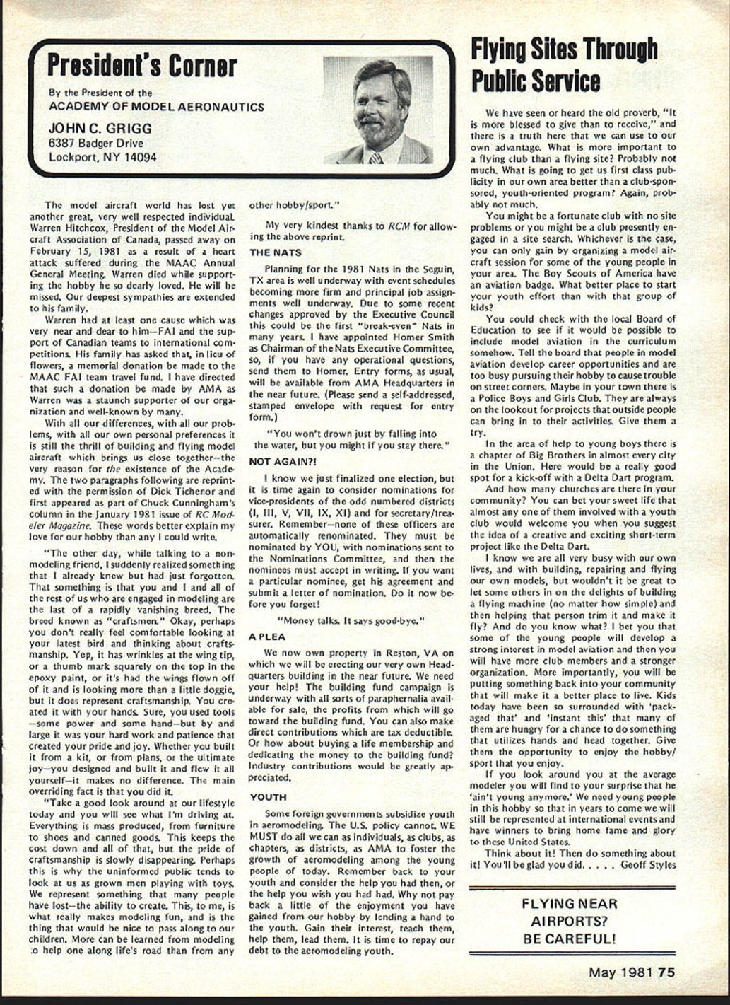 r Synopsis ot January 31 Council Meeting AMAs board ofdirectors Executive Coun cii met Atlanta GA took following actionsa detailed report will pub lished after Executive Council reviews approves official minutes meeting 1 Run-off Election John Grigg Presi dent Horrace Cain District VI VicePresident noted winners AMAs accounting firm re sponsible receiving counting bal lots 2 1981 Budget deficit budget ap proved noted continuance operations under budget would probably require dues increase following year existing services maintained 3 Executive Director Contract new contract approved next two years replacing effect since 1964 4 Membership Lists new basis mak ing membership lists available promotion model aviation activities com mercial purposes reviewed accepted 5 Youth Proposal concept AMAs founders Charles H Grant renew ing youth participation AMA programs emphasis scientific considerations reviewed possible future implementa tion 6 Pyrotechnics Ban Guidelines under AMA air show teams could permit ted safely operate pyrotechnics re viewed approved 7 AMA Blazers Purchase jackets AMA employee representatives wear public functions approvedAMA pay half employees pay half also available officers AMA subsidy 8 MAAC Magazine Sale AMAs maga zine Canadian aeromodeling association members reduced subscription rate $16 approved 9 NAA Magazine approved pro vide AMA magazine Executive Committee Board Directors AMAs parent organization National Aeronautic Association 10 Member Expulsion assistance AMAs legal counsel approved seek return AMA property preliminary con sidering revocation AMA membership privileges former air show team member 11 Nats 1-10 Personnel agreed cost additional HQ personnel brought Nats general AMA PR purposes should charged Nats operation 12 1980 Nats Planning left Nats Executive Committee decide expansion RC Soaring competition satisfaction Helicopter Soaring Inter ests 13 Nats Committee Homer Smith VP District Xl appointed new Nation als Executive Committee Chairman Smith Foreman VP District IV develop Standard Operating Procedure document Nats operations Nats Committee struc ture functions 14 Nats Communications purchase up $5000 approved upgrade Nats electronic communications equipment 15 Nats Entry lees An increase 1981 fees approved help prevent deficit Nats operations See Competition News else issue Model Aviation de tails 161982 Nats Sites Possibilitiesfor Dover DE Pine Bluff NC reviewed ap proved further study 17 Bylaws Committee John Byrne VP District II approved added basic committee consisting President Executive Director Bill Mathews VP-V Homer Smith VP-XI Micheline Madison AMA HQ 18 Chapter Achievement Establishment new award AMA chapters associa tions chartered clubs approved first go Central New York Model Aircraft Association 19 Homeowners Insurance Executive Director requested research legality publishing list companies will cover model aircraft activities 20 CD Phone Numbers AMA HQ re vise sanction form obt&m authori zation publish CD phone numbers AMA Contest Calendar 21 Officer Columns approved Executive Director have column magazine equivalent VPs approved Secretary/Treasurer column should less AMA Presi dents column 22 Alaska Mini-Nats three day 1981 Mini-Nats Anchorage AMA provide 15 free trophies approved 23 CD Qualification Effective March 15 previous requirements endorsement new Contest Director applications ap proved reinstated although also approved VP could approve en dorsements either way however use current questionnaire still required 24 Safety Committee new committee approved authority recom mend suspending Contest Director rating contest sanction extreme safety hazard situations 25 1981 Nomination Procedures procedures used 1980 election approved use again 1981 Note laws Committee consider changes future meanwhile current bylaws deadlines provide time 1981 implementation 26 AMA Numbers Due being enough five digit numbers available contin ue reserving unrenewed numbers previous holders approved begin reissuing such numbers effective March 31 meanwhile conversion alpha-numeric system approved minimize avoid need reissue numbers have normally reserved 27 Distinguished Service such award approved announcement re cipient delayed until presentation made 28 Next Meeting April 4-5 1981 Washington DC area 5th will pri m arily reviewing bylaws revision proposals AMA Scholarship Winners- -1980 Names 1980 AMA Scholarship winners have announced Scholar ship Committee Out 19 names submitted four selected Paul Munana $1000 Peter Campo $500 Theodore Tavares $250 Thomas Haar $250 total $2000 being awarded fund Top choice Paul Munana Santa Bar bara CA winner $1000 AMA Scholarship Fund will use award help finance education University California Santa Barbara major ing Mechanical Engineering 395 average placed him seventh out 546 students high school Paul entered uni versity first-rate academic credentials holding onto scholastic level Paul found time participate such high school activities Election Committee Key Club Math Club Finance Publicity Committees also achieved Honor Roll three years awarded Santa Barbara School District Top Achieve ment Honor 1979 model aviation side Paul free flighter travel up 130 miles 72 Model Aviation AMA HQ including reports AMA President Secretary-Treasurer Executive Director Vice-Presidents ACADEMY OF MODEL AERONAUTICS 815 Fifteenth Street NW Washington DC 20005 home Taft could fly top modeling prize came May 1980 Taft won Ode Randall Memorial Trophy placing first Senior new AMA record time 51 minutes 29 seconds Previous Paul won tro phies 1979 Nats held Riverside CA four seven events entered past three years Paul has entered contests wide variety classes always keen competitor times going home trophies Paul stated application involvement model aviation has enthusiastically supported parents has resulted much happiness satis faction family Paul founding member Santa Barbara Indoor Aeromodelers Club served executive member Presen