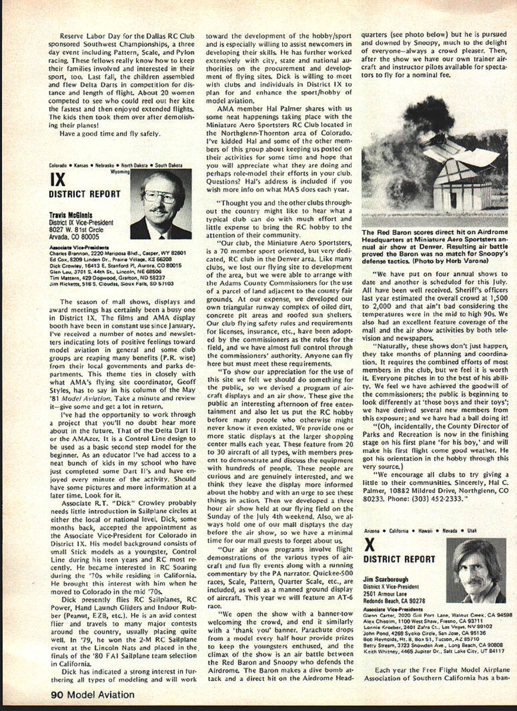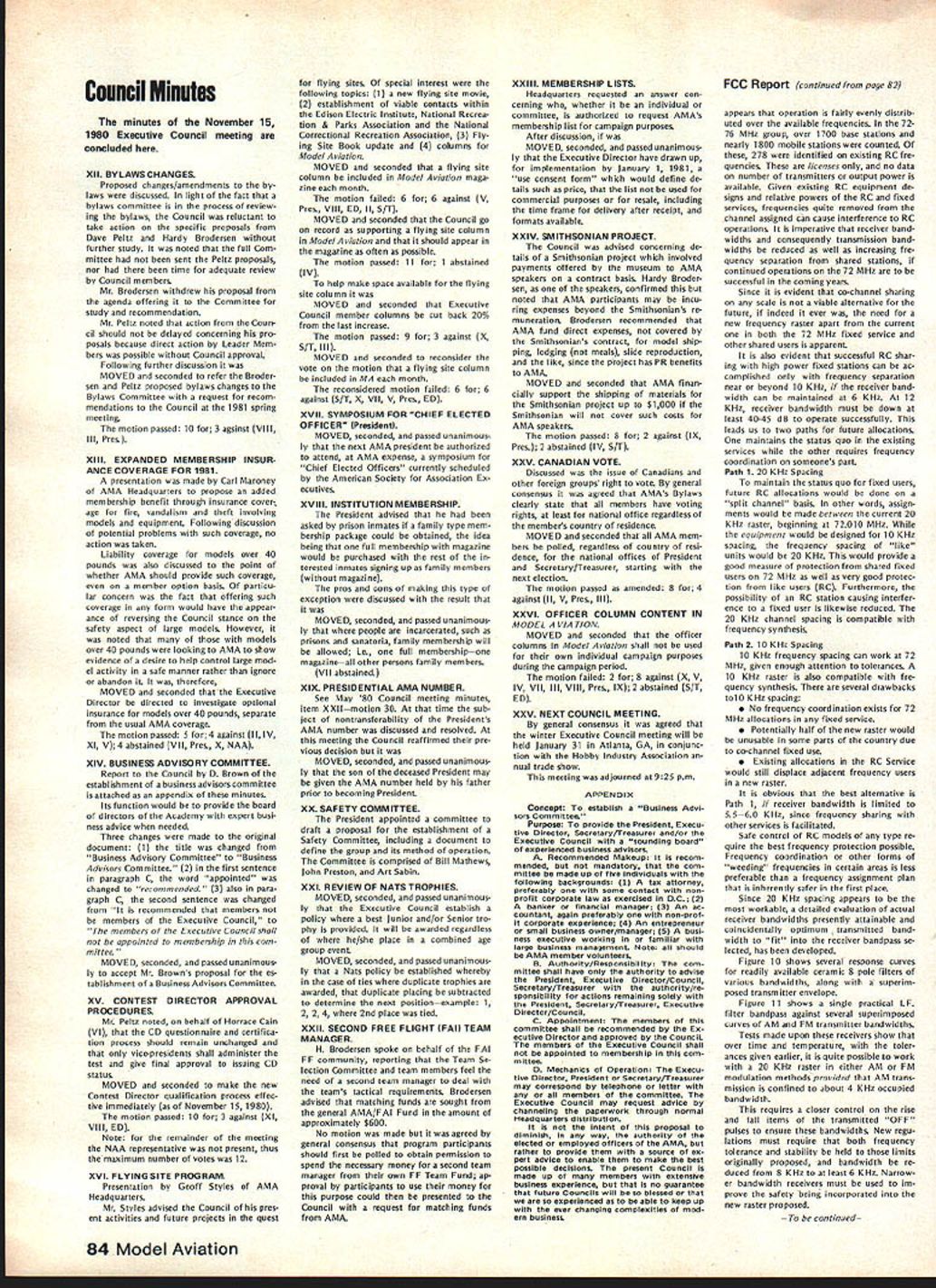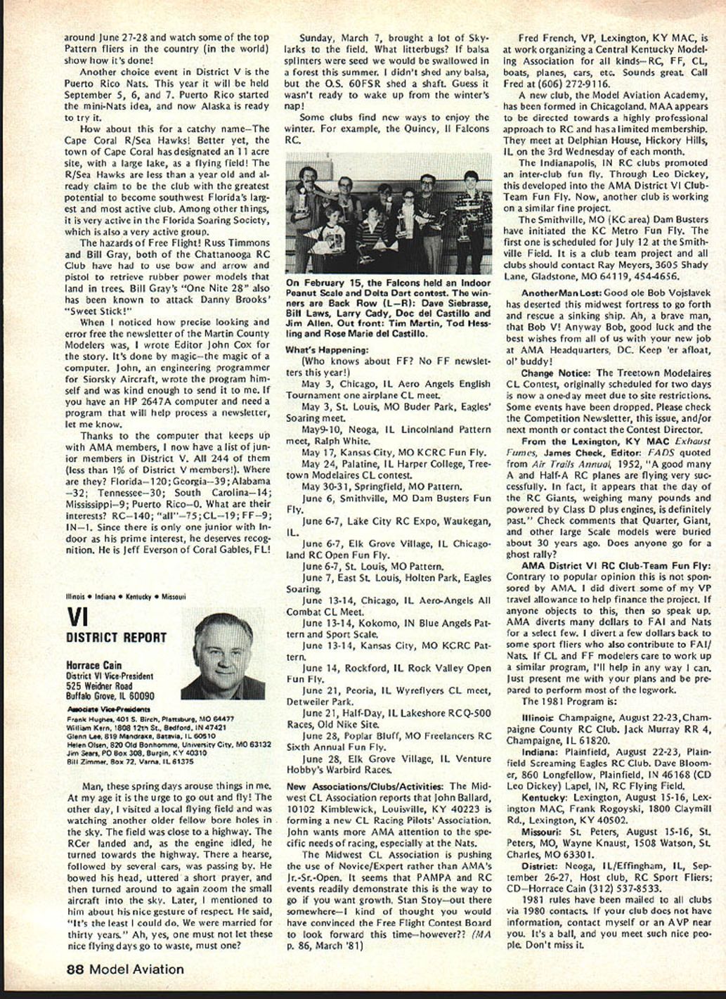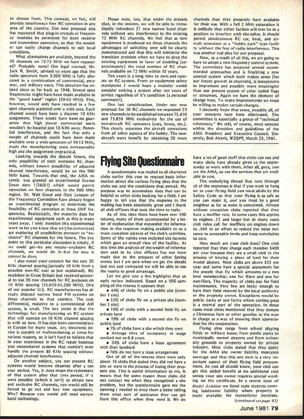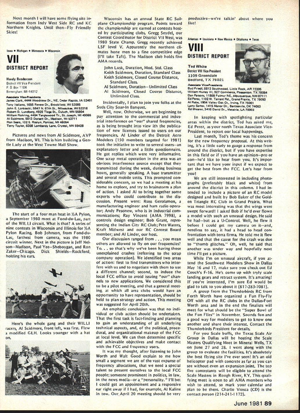 From AMA HQ including reports AMA President Secretary-Treasurer Executive Director Vice-Presidents L AMA Officer Election- 1981 Nomination Procedures Document odd-numbered years elec tion national office AMA SecretaryTreasurer regional Vice-Presidents odd numbered AMA districts III V VII IX XI even-numbered years election national office AMA Preisdent regional Vice-Presidents even-numbered AMA districts II IV VI VIII X Officers elected serve two years following year election took place CANDIDATE MINIMUM STANDARDS NATIONAL OFFICERS President Sec retary-Treasurer nominee must AMA Leader Member note Contest Di rectors also Leader Members must also have served least year prior beginning term office either elec ted officer AMA such Vice-Presi dent officer directly appointed President Vice-Presidents such Contest Board member Contest Coordinator Committee Chairman Note Committee members merely approved President Vice-President considered officers DISTRICT OFFICERS Vice-Presidents nominee must Leader Member AMA District Vice-President candidates shall nominated exclusively Leader Open members time such nomina tion bona fide legal residents same district nominee also bona fide legal resident nominee however can nominated vice-presidency district bona fide legal resident District Vice-Presidents shall elected exclusively majority Leader Open members voting time such election bona fide le gal residents same district candidates such office also bona fide legal residents other elective officers shall nominated Leader Open members regard residential considerations Note purposes interpretation intended residency member accordance current address file AMA Headquarters WHO MAY SUBMIT NOMINATION Any AMA member consent person nominated should obtained prior submission names nominated candidacy must submitted writing should accompanied statement least 100 words concerning nominees qualifications nominees themselves also urged submit before meeting Nominating Committee statements documents evidence appropriate sup porting nominations nominated must submit letter acceptance Nominating Committee prior start meeting WHEN TO SUBMIT NOMINATIONS Nominations must submitted prior start Nominating Committee meet ing Normally Commitee meets mid summer during National Model Airplane Championships WHERE TO SUBMIT NOMINATIONS Ordinarily District Vice-Presidents al serve Nominating Committee Nom inations should submitted Vice-Pres ident AMA members district names addresses headings VP columns same time copy nomination should sent AMA HQ required preferred ARE ALL NOMINATIONS ACCEPTED necessarily nominations submit ted accordance guidelines will con rinued page 85 Opui Lefts Tul White As AMA RC Frequency Committee Chair man 1981 am concerned about District VIII VP column appeared May issue Model Air/at/on first re action position proposed new RC frequencies considerable disap pointment second thought now feel problem may misunderstanding misunderstanding quite possibly caused committee went about explaining original proposal AMA membership appears may have too deep proverbial forest really didnt see trees Let give entire subject try can convince person back ground experience RC real ly doing right thing perhaps rest membership can similarly convinced First want address problem 50 new frequenciesby statementall shared incorrect As know a/i present radio/communication users 7273 MHz band have assigned channel frequencies 20 KHz spacing frequency assignments start 72000 72020 72040 etc present RC frequencies channel assignments shared has proven problem certain areas country Im sure have already heard specific instances terference existing RC channels com mercial users own state Texas final proposal FCC submit ted September 1980 specifically request ed new RC channels assigned odd frequencies beginning 72010 72030 72050 etc word used intersti tial channels channels between existing commercial users 50 new frequencies therefore shared essentially exclusive wish could say ab solutely exclusive wouldnt quite correct fact matter will find situations commercial user could 10 KHz away RC channels emitting several hundred watts power opposed limit Despite new tight narrow band receivers possible adjacent channel interference will occur way address problem ask 50 channels can use location time though recognize five planes air time normal local flying field practical limit Thus local club avoid particularly troublesome com mercial station interstitial scheme gives large number alternte RC channels 78 Model Aviation ACADEMY OF MODEL AERONAUTICS 815 Fifteenth Street NW Washington DC 20005 Helping celebrate AMAs purchase land permanent home group visitors site late last year Shown ILR District IX VP Travis McGinnis wife Mr Mrs Geoff Styles hes former Dis trict VII VP now Flying Site Programs Director AMA HO Mr Mrs John Worth AMAs Executive Director John Embry former District VIII VP Sign says five acresAMA bought 16 property Reston VA about 17 miles northwest downtown Washington DC choose concept feel will provide interference free RC operation area country new proposal also has requested plug-in crystals frequen cy modules permitted both receiver transmitter operation model er can easily change channels suit local conditions What alternatives available beyond 50 channels 72-73 MHz have request ed Probably legal counsel Mr Jack R Smith advised us years ago radio spectrum 3-300 MHz fully allo cated combination commercial ama teur military users situation has ex isted since far back 1948 Several spot frequencies might have made available guard band region 30-42 MHz however would have resulted few spot channels scattered over wide area channel would have discrete 10 KHz assignment would have no guar antee high power commercial users wouldnt located just 10 KHz away Poten tial interference fact couple channels could have made available over wide spectrum 10-12 MHz made manufacturing costs unreasonably high assignment impractical Looking tow