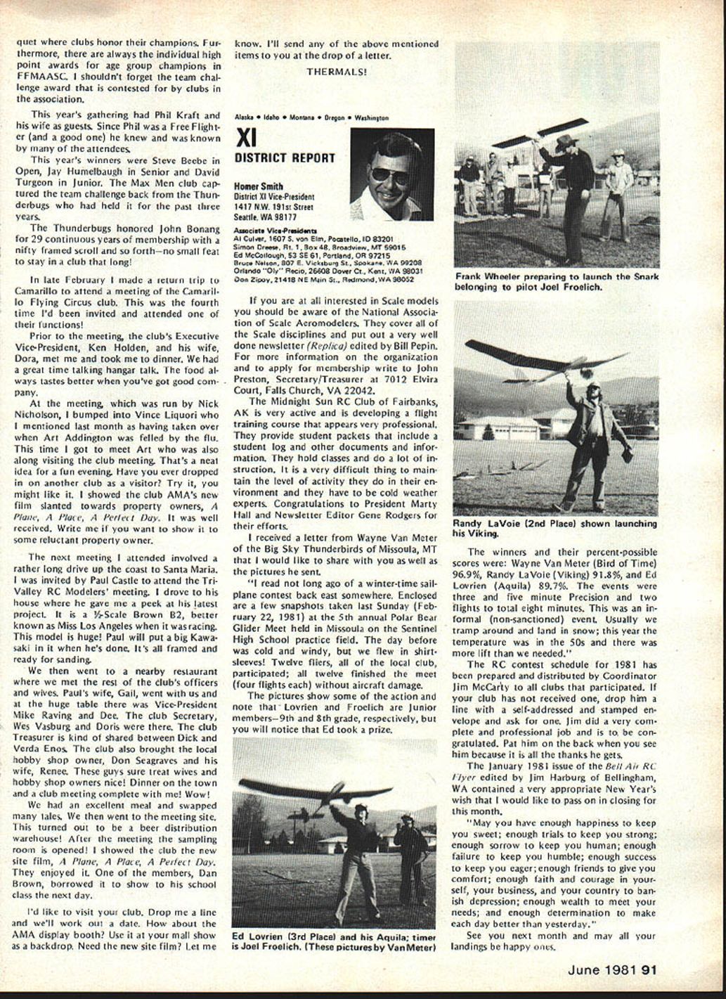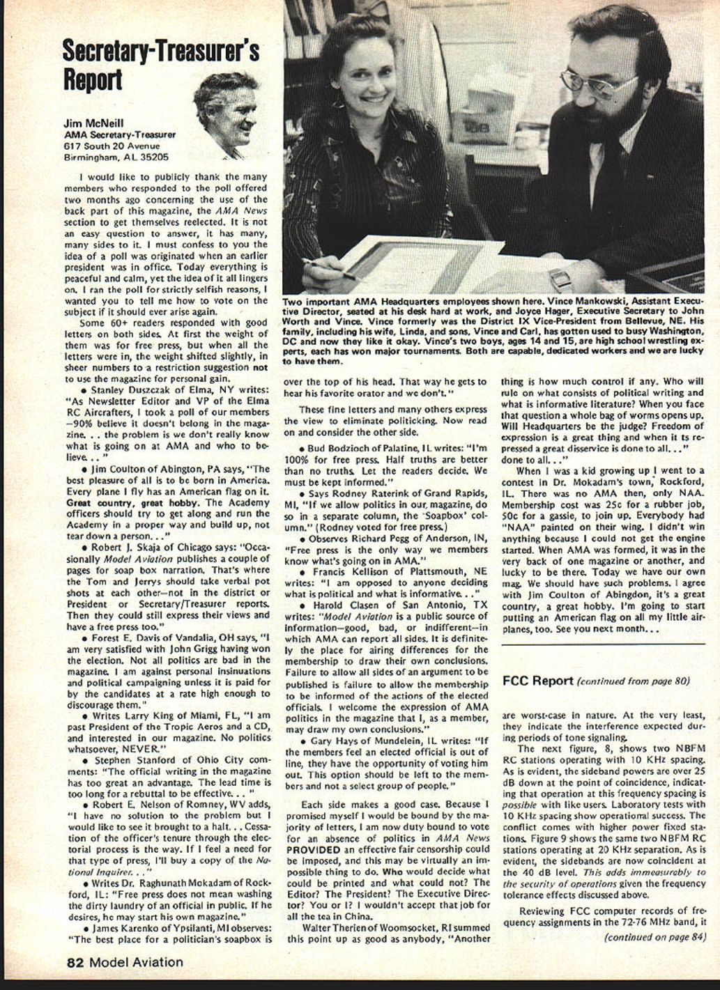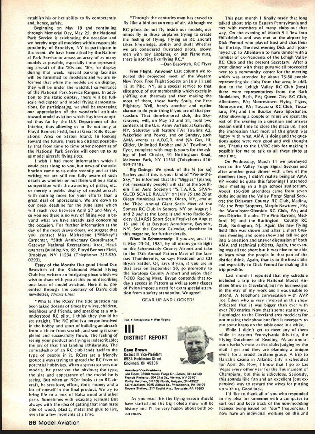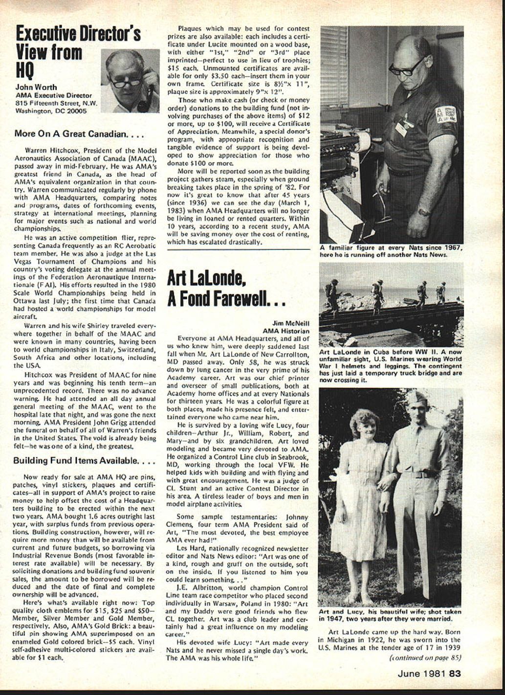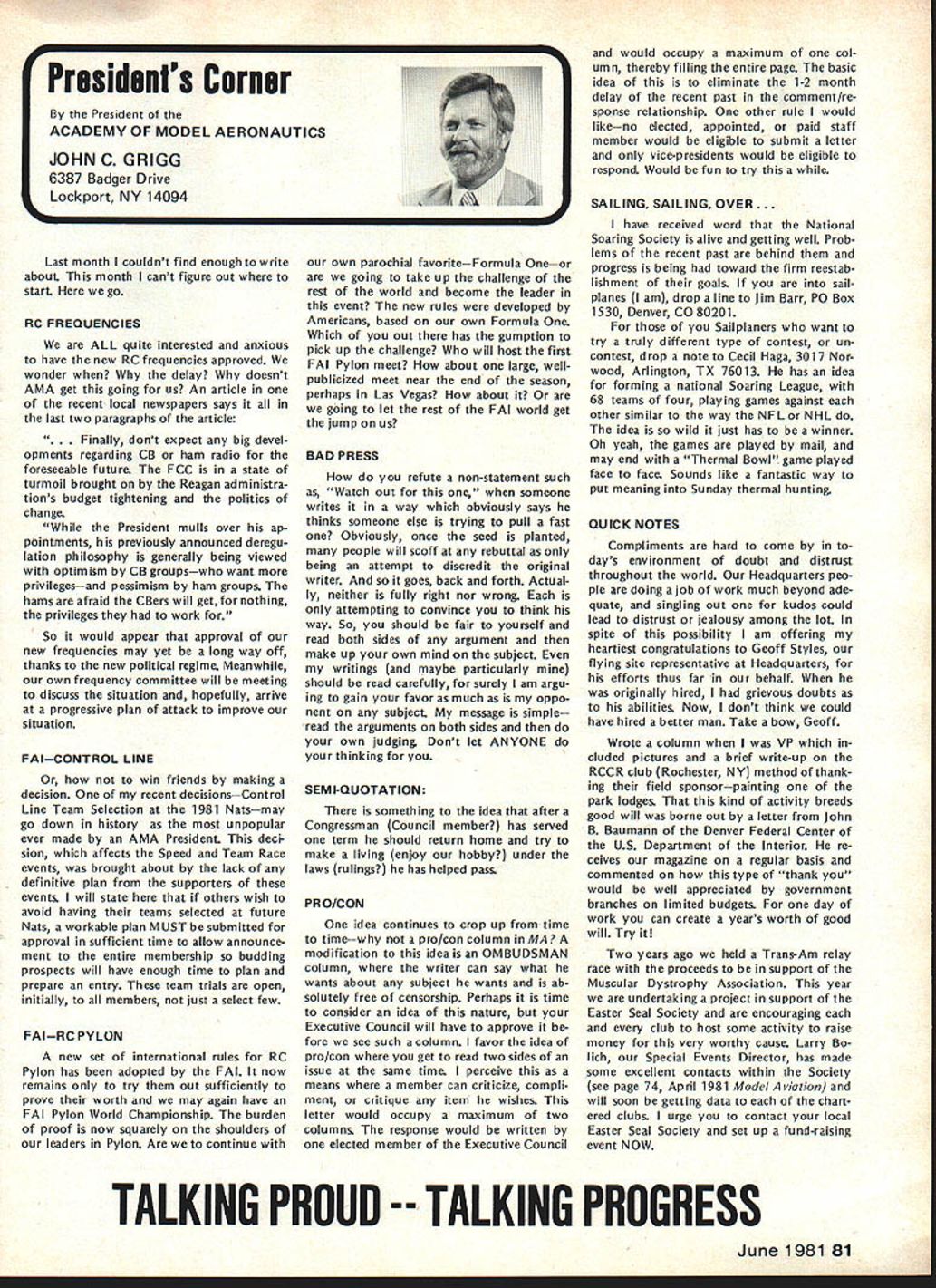 From AMA HQ including reports AMA President Secretary-Treasurer Executive Director Vice-Presidents L AMA Officer Election- 1981 Nomination Procedures Document odd-numbered years elec tion national office AMA SecretaryTreasurer regional Vice-Presidents odd numbered AMA districts III V VII IX XI even-numbered years election national office AMA Preisdent regional Vice-Presidents even-numbered AMA districts II IV VI VIII X Officers elected serve two years following year election took place CANDIDATE MINIMUM STANDARDS NATIONAL OFFICERS President Sec retary-Treasurer nominee must AMA Leader Member note Contest Di rectors also Leader Members must also have served least year prior beginning term office either elec ted officer AMA such Vice-Presi dent officer directly appointed President Vice-Presidents such Contest Board member Contest Coordinator Committee Chairman Note Committee members merely approved President Vice-President considered officers DISTRICT OFFICERS Vice-Presidents nominee must Leader Member AMA District Vice-President candidates shall nominated exclusively Leader Open members time such nomina tion bona fide legal residents same district nominee also bona fide legal resident nominee however can nominated vice-presidency district bona fide legal resident District Vice-Presidents shall elected exclusively majority Leader Open members voting time such election bona fide le gal residents same district candidates such office also bona fide legal residents other elective officers shall nominated Leader Open members regard residential considerations Note purposes interpretation intended residency member accordance current address file AMA Headquarters WHO MAY SUBMIT NOMINATION Any AMA member consent person nominated should obtained prior submission names nominated candidacy must submitted writing should accompanied statement least 100 words concerning nominees qualifications nominees themselves also urged submit before meeting Nominating Committee statements documents evidence appropriate sup porting nominations nominated must submit letter acceptance Nominating Committee prior start meeting WHEN TO SUBMIT NOMINATIONS Nominations must submitted prior start Nominating Committee meet ing Normally Commitee meets mid summer during National Model Airplane Championships WHERE TO SUBMIT NOMINATIONS Ordinarily District Vice-Presidents al serve Nominating Committee Nom inations should submitted Vice-Pres ident AMA members district names addresses headings VP columns same time copy nomination should sent AMA HQ required preferred ARE ALL NOMINATIONS ACCEPTED necessarily nominations submit ted accordance guidelines will con rinued page 85 Opui Lefts Tul White As AMA RC Frequency Committee Chair man 1981 am concerned about District VIII VP column appeared May issue Model Air/at/on first re action position proposed new RC frequencies considerable disap pointment second thought now feel problem may misunderstanding misunderstanding quite possibly caused committee went about explaining original proposal AMA membership appears may have too deep proverbial forest really didnt see trees Let give entire subject try can convince person back ground experience RC real ly doing right thing perhaps rest membership can similarly convinced First want address problem 50 new frequenciesby statementall shared incorrect As know a/i present radio/communication users 7273 MHz band have assigned channel frequencies 20 KHz spacing frequency assignments start 72000 72020 72040 etc present RC frequencies channel assignments shared has proven problem certain areas country Im sure have already heard specific instances terference existing RC channels com mercial users own state Texas final proposal FCC submit ted September 1980 specifically request ed new RC channels assigned odd frequencies beginning 72010 72030 72050 etc word used intersti tial channels channels between existing commercial users 50 new frequencies therefore shared essentially exclusive wish could say ab solutely exclusive wouldnt quite correct fact matter will find situations commercial user could 10 KHz away RC channels emitting several hundred watts power opposed limit Despite new tight narrow band receivers possible adjacent channel interference will occur way address problem ask 50 channels can use location time though recognize five planes air time normal local flying field practical limit Thus local club avoid particularly troublesome com mercial station interstitial scheme gives large number alternte RC channels 78 Model Aviation ACADEMY OF MODEL AERONAUTICS 815 Fifteenth Street NW Washington DC 20005 Helping celebrate AMAs purchase land permanent home group visitors site late last year Shown ILR District IX VP Travis McGinnis wife Mr Mrs Geoff Styles hes former Dis trict VII VP now Flying Site Programs Director AMA HO Mr Mrs John Worth AMAs Executive Director John Embry former District VIII VP Sign says five acresAMA bought 16 property Reston VA about 17 miles northwest downtown Washington DC choose concept feel will provide interference free RC operation area country new proposal also has requested plug-in crystals frequen cy modules permitted both receiver transmitter operation model er can easily change channels suit local conditions What alternatives available beyond 50 channels 72-73 MHz have request ed Probably legal counsel Mr Jack R Smith advised us years ago radio spectrum 3-300 MHz fully allo cated combination commercial ama teur military users situation has ex isted since far back 1948 Several spot frequencies might have made available guard band region 30-42 MHz however would have resulted few spot channels scattered over wide area channel would have discrete 10 KHz assignment would have no guar antee high power commercial users wouldnt located just 10 KHz away Poten tial interference fact couple channels could have made available over wide spectrum 10-12 MHz made manufacturing costs unreasonably high assignment impractical Looking tow