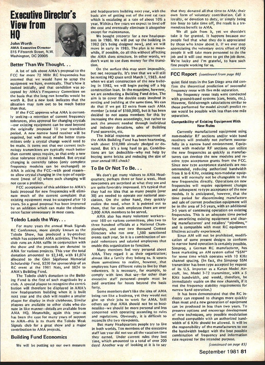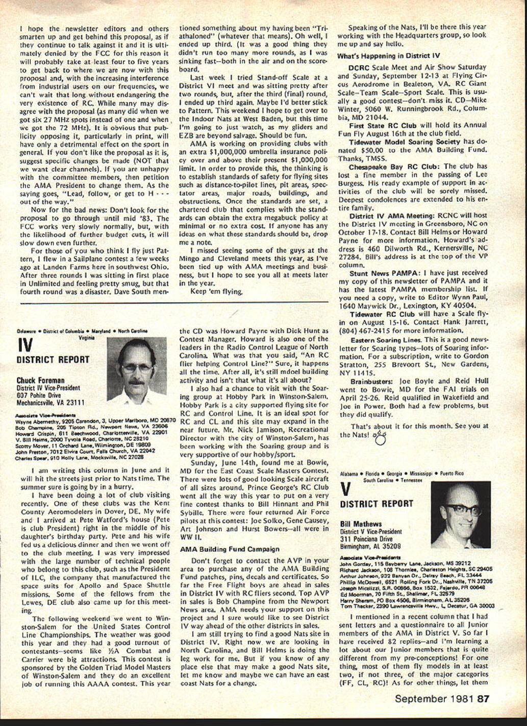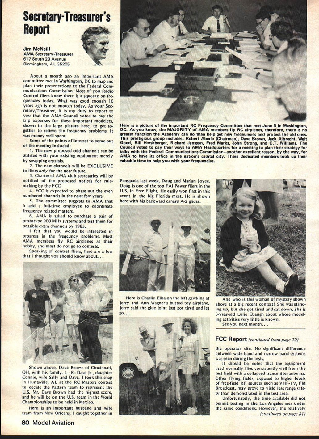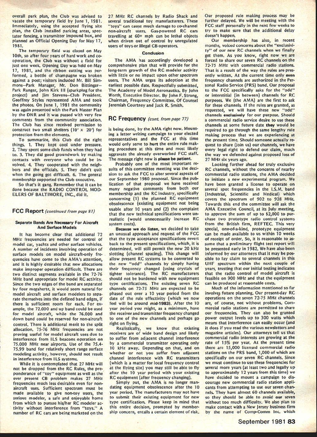NC Frequency Committee Report Bob Aberle Chairman AMA RC Frequency Committee meeting committee held Washington DC June 5 1981 first almost year attendance Commit tee members present Bob Aberle Chair man Jack Albrecht Dave Brown Walt Good Bill Hershberger Dick Jansson Fred Marks John Strong Torrey Williams AMA John Worth Executive Director Carl Maroney Executive Assistant Legal Counsel Jack R Smith Jeremiah Courtney law firm Key items can summarized follows 1 FCC Notice Proposed Rule Making NPRM expected released late fall 1981 2 New RC rules emcompassing some 73 additional channels will likely become effective around mid-1983 3 FCC will asked leave technical specifications except modulation limita tions equipment type certification currently 4 Existing RC equipment may able used indefinitely long frequency changed new odd channels within 10 years rule effectivity date 5 These new odd channels 50 air craft use 23 non-aircraft will time exclusive RC use 6 Pursuant exclusive RC channels future committee will seek approval AMA Executive Council purchase two experimental RC systems 900 MHz 7 For near term AMA will mount campaign discourage new com mercial radio station applicants using existing seven RC channels 8 A new computer program printout has proposed pinpoint power lo cation commercial radio stations operating present seven RC channels throughout country 9 The originally proposed frequency flag control system continues refined Details rather disheartening learn long effort obtain new RC frequencies will extended FCC reasons given delay lack FCC staff manpower large workload un fortunate fact RCers con sidered low priority frequency spectrum users Progress date plus remainder rule making process can best summarized following chart AMA Petition Rule Making RM-3525 submitted November 1978 FCC informed AMA available channels 72-76 MHz band October 1979 After analyzing available channels feasibility AMA released its proposal FCC September 1980 What still must happenl FCC releases Notice Proposed Rule Making NPRM best information now indicates release date December 1981 AMA/IndustrylGeneral Public responds will have 60 days release NPRM return written commentsFeb ruary 1982 FCC releases Report & Order can take 12 18 months under normal circum stancesestimate June 1983 Rule effectivity 30 days after release Report & Orderestimate July 1983 Although projected set milestone dates may annoy modelers im patient lack progress must stress normal period time typical FCC rule making process Whatever tactful lobbying can done continued page 83 Hall Fame Awards Model Aviation Hall Fame Awards means individuals have made outstanding contributions aeromod eling recognized AMA program administrated Council Past Presi dents serve Academys Hall Fame Awards Committee Nominations admissible anyone must submitted form available AMA Headquarters Awards Com mittee selects nominated candidates winners based upon past well pres ent contributions aspects aeromod eling No past president may vote himself group consider nominations other sources However mem bers committee could qualify re flects well esteem Council Past Presidents held note seven committee members have already honored current Council Past Presidents serve Awards Committee dates AMA Presidency Irwin G Ohlsson 194346 Frank B Bushey 1952 Keith H Storey 1953-56 Claude McCul lough 1957 Dr Walter Good 1958-60 continued page 84 September 1981 77 AMA HQ including reports AMA President Secretary-Treasurer Executive Director Vice-Presidents ACADEMY OF MODEL AERONAUTICS 815 Fifteenth Street NW Washington DC 20005 Uob Aberlecurrentuommntee presentea rormer LneIr man John Strong AMAs - ot Appreciation tor almost six years service 1975-1981 position Occasion committees June 5 meeting Washington Hi Johnson May 2 1981 lost Hi doing things loved soaring glider went down near Pearbiossom CA doc tor hiking vicinity confirmed Hi died instantly crash Hi unique among old timers industry explored facet design manufac turing excitement understanding secrets natural laws particularly related flight never wavered contributions modeling interest category through manufactured kits engines compo nents cases ahead time last enterprise RC gliders again attempting forge ahead understanding provide modeler unique better way build fly Hi fountain bursting energy en thusiasm humor always ready give hand interest soaring purest form flight begun early career teenager constructed real glider friends flew hill near Brigham City UT Hi little formal educa tion never completed high school yet mastered fields endeavor en tered model airplane business 1940s Burbank Manufacturing Company later moved Henry Engineering Company Vice-President worked co-de signer classic Brave Warrior Squaw Chief Control Line model kits also involved design CL hard ware such ballcranks control horns fuel tanks spinners wheels became standard model world Around 1952 became partner Kenhi Model Prod ucts designed new line kits cluded Bobcat Cougar same time developed new method die cutting balsa wood unparal led 1956 acquired tooling license Orwick engines changes improvements created what come Johnson Engine became best Rat Racing Combat engine 1960s During time created better glow plug new throttle controllable pitch propeller fuel tanks fuel filters line precision wood propellers various hard ware items advanced model aviation Also during tenure Dynamic Models created die cast aluminum chassis slot racing along imaginable ac cessory helped set new track records around country further advanced slot racing technology late 1960s Hi final ly started Hi Johnson Model Products first partnership later himself Slot car ac cessories gas powered RC cars developed After company moved Pacoima CA products dropped present line products created felt tht plastic foam best mediums creating hi-performance glider plastic fuselages foam wings vacuum formed canopies hardware developed research included new old quest mysteries lift dra