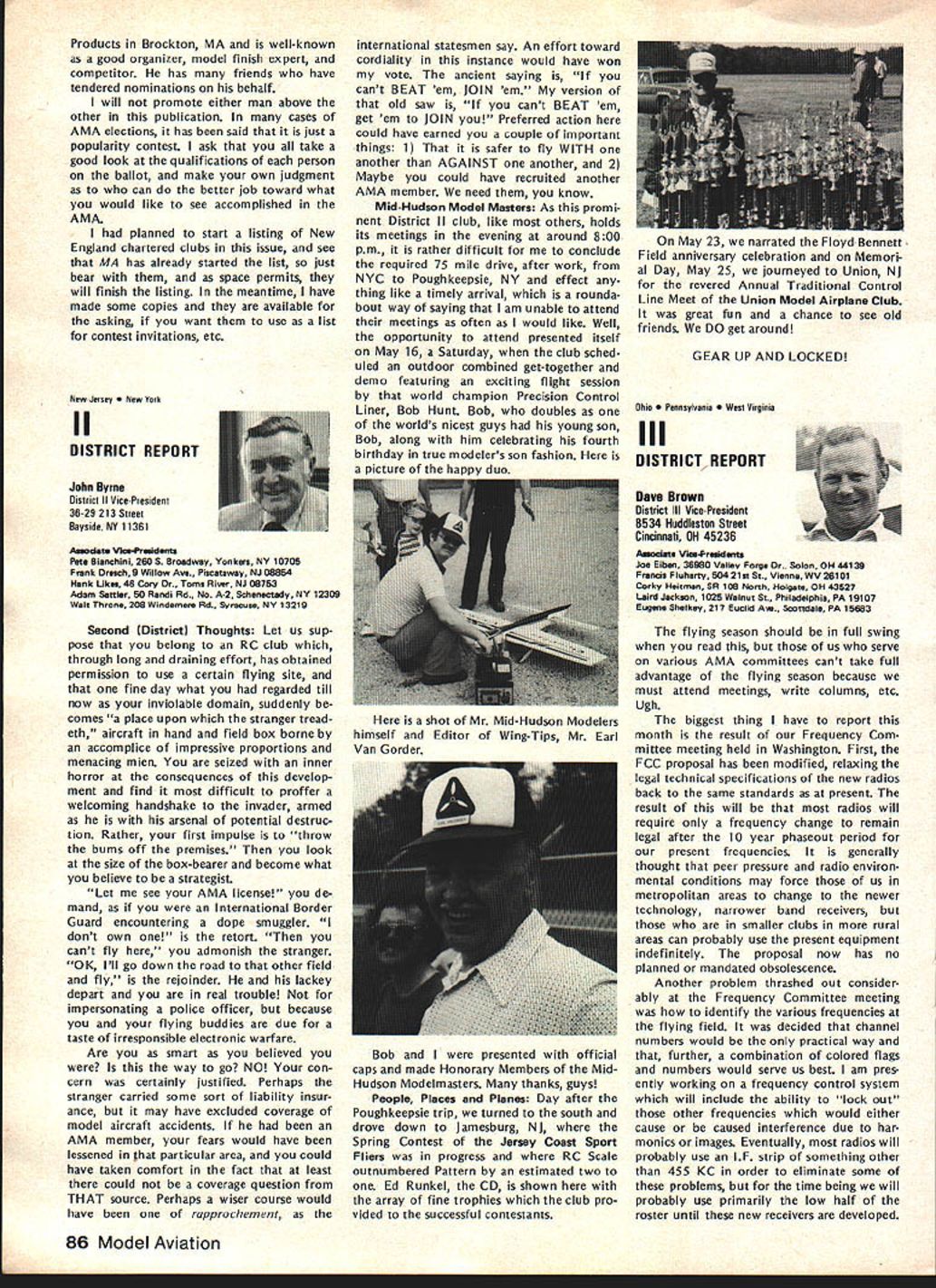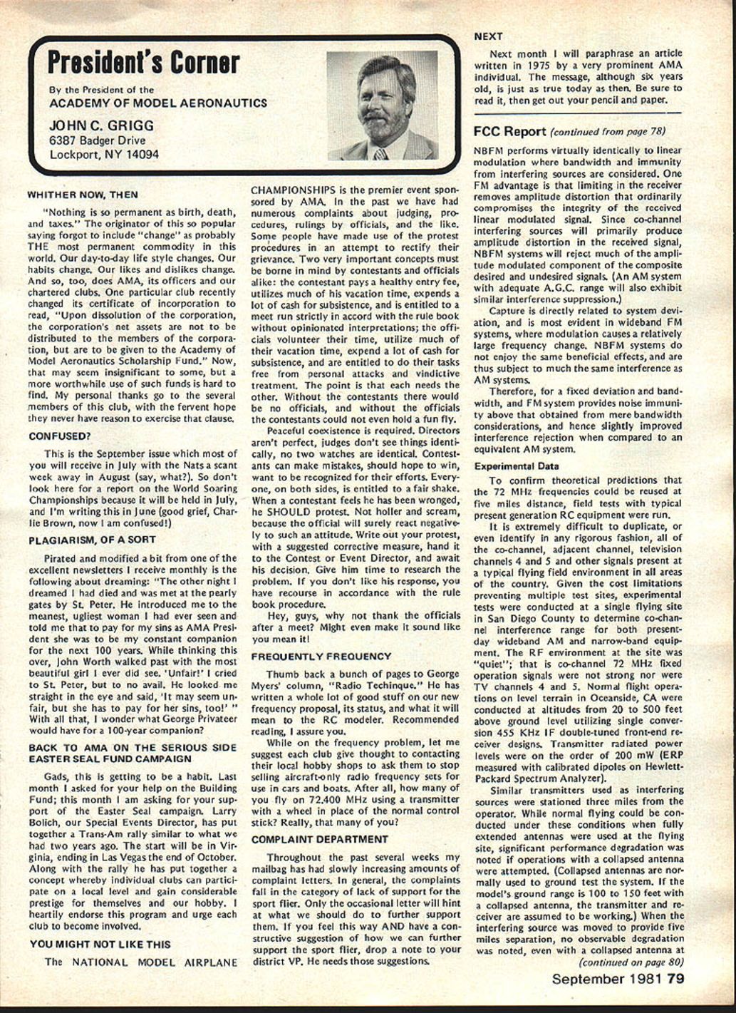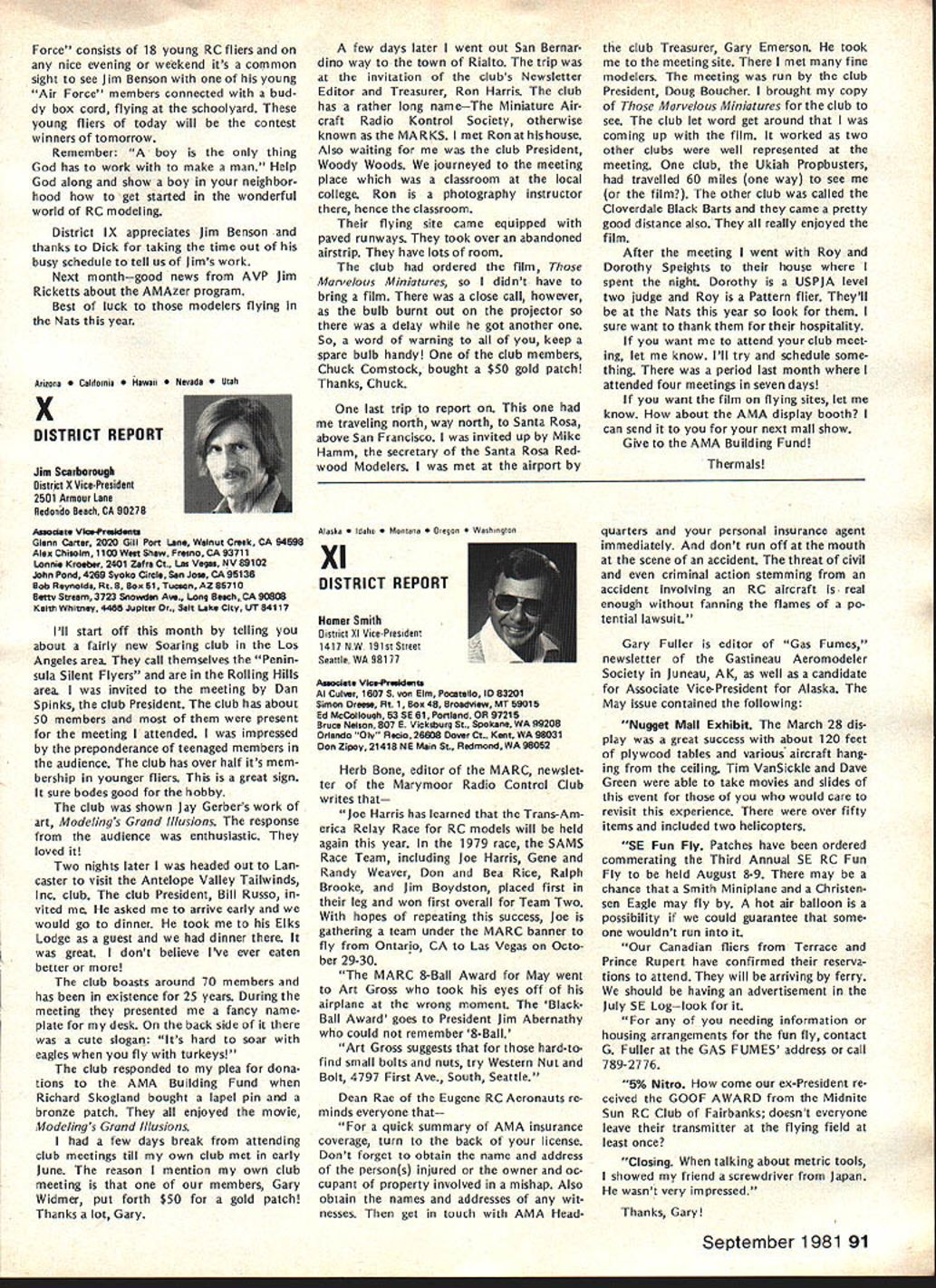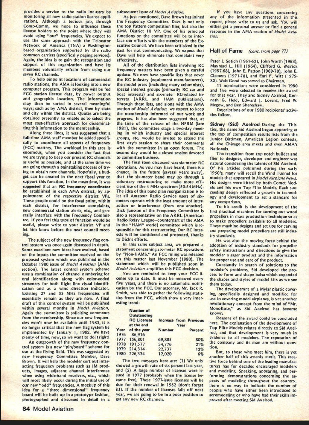 NC Frequency Committee Report Bob Aberle Chairman AMA RC Frequency Committee meeting committee held Washington DC June 5 1981 first almost year attendance Commit tee members present Bob Aberle Chair man Jack Albrecht Dave Brown Walt Good Bill Hershberger Dick Jansson Fred Marks John Strong Torrey Williams AMA John Worth Executive Director Carl Maroney Executive Assistant Legal Counsel Jack R Smith Jeremiah Courtney law firm Key items can summarized follows 1 FCC Notice Proposed Rule Making NPRM expected released late fall 1981 2 New RC rules emcompassing some 73 additional channels will likely become effective around mid-1983 3 FCC will asked leave technical specifications except modulation limita tions equipment type certification currently 4 Existing RC equipment may able used indefinitely long frequency changed new odd channels within 10 years rule effectivity date 5 These new odd channels 50 air craft use 23 non-aircraft will time exclusive RC use 6 Pursuant exclusive RC channels future committee will seek approval AMA Executive Council purchase two experimental RC systems 900 MHz 7 For near term AMA will mount campaign discourage new com mercial radio station applicants using existing seven RC channels 8 A new computer program printout has proposed pinpoint power lo cation commercial radio stations operating present seven RC channels throughout country 9 The originally proposed frequency flag control system continues refined Details rather disheartening learn long effort obtain new RC frequencies will extended FCC reasons given delay lack FCC staff manpower large workload un fortunate fact RCers con sidered low priority frequency spectrum users Progress date plus remainder rule making process can best summarized following chart AMA Petition Rule Making RM-3525 submitted November 1978 FCC informed AMA available channels 72-76 MHz band October 1979 After analyzing available channels feasibility AMA released its proposal FCC September 1980 What still must happenl FCC releases Notice Proposed Rule Making NPRM best information now indicates release date December 1981 AMA/IndustrylGeneral Public responds will have 60 days release NPRM return written commentsFeb ruary 1982 FCC releases Report & Order can take 12 18 months under normal circum stancesestimate June 1983 Rule effectivity 30 days after release Report & Orderestimate July 1983 Although projected set milestone dates may annoy modelers im patient lack progress must stress normal period time typical FCC rule making process Whatever tactful lobbying can done continued page 83 Hall Fame Awards Model Aviation Hall Fame Awards means individuals have made outstanding contributions aeromod eling recognized AMA program administrated Council Past Presi dents serve Academys Hall Fame Awards Committee Nominations admissible anyone must submitted form available AMA Headquarters Awards Com mittee selects nominated candidates winners based upon past well pres ent contributions aspects aeromod eling No past president may vote himself group consider nominations other sources However mem bers committee could qualify re flects well esteem Council Past Presidents held note seven committee members have already honored current Council Past Presidents serve Awards Committee dates AMA Presidency Irwin G Ohlsson 194346 Frank B Bushey 1952 Keith H Storey 1953-56 Claude McCul lough 1957 Dr Walter Good 1958-60 continued page 84 September 1981 77 AMA HQ including reports AMA President Secretary-Treasurer Executive Director Vice-Presidents ACADEMY OF MODEL AERONAUTICS 815 Fifteenth Street NW Washington DC 20005 Uob Aberlecurrentuommntee presentea rormer LneIr man John Strong AMAs - ot Appreciation tor almost six years service 1975-1981 position Occasion committees June 5 meeting Washington Hi Johnson May 2 1981 lost Hi doing things loved soaring glider went down near Pearbiossom CA doc tor hiking vicinity confirmed Hi died instantly crash Hi unique among old timers industry explored facet design manufac turing excitement understanding secrets natural laws particularly related flight never wavered contributions modeling interest category through manufactured kits engines compo nents cases ahead time last enterprise RC gliders again attempting forge ahead understanding provide modeler unique better way build fly Hi fountain bursting energy en thusiasm humor always ready give hand interest soaring purest form flight begun early career teenager constructed real glider friends flew hill near Brigham City UT Hi little formal educa tion never completed high school yet mastered fields endeavor en tered model airplane business 1940s Burbank Manufacturing Company later moved Henry Engineering Company Vice-President worked co-de signer classic Brave Warrior Squaw Chief Control Line model kits also involved design CL hard ware such ballcranks control horns fuel tanks spinners wheels became standard model world Around 1952 became partner Kenhi Model Prod ucts designed new line kits cluded Bobcat Cougar same time developed new method die cutting balsa wood unparal led 1956 acquired tooling license Orwick engines changes improvements created what come Johnson Engine became best Rat Racing Combat engine 1960s During time created better glow plug new throttle controllable pitch propeller fuel tanks fuel filters line precision wood propellers various hard ware items advanced model aviation Also during tenure Dynamic Models created die cast aluminum chassis slot racing along imaginable ac cessory helped set new track records around country further advanced slot racing technology late 1960s Hi final ly started Hi Johnson Model Products first partnership later himself Slot car ac cessories gas powered RC cars developed After company moved Pacoima CA products dropped present line products created felt tht plastic foam best mediums creating hi-performance glider plastic fuselages foam wings vacuum formed canopies hardware developed research included new old quest mysteries lift dra