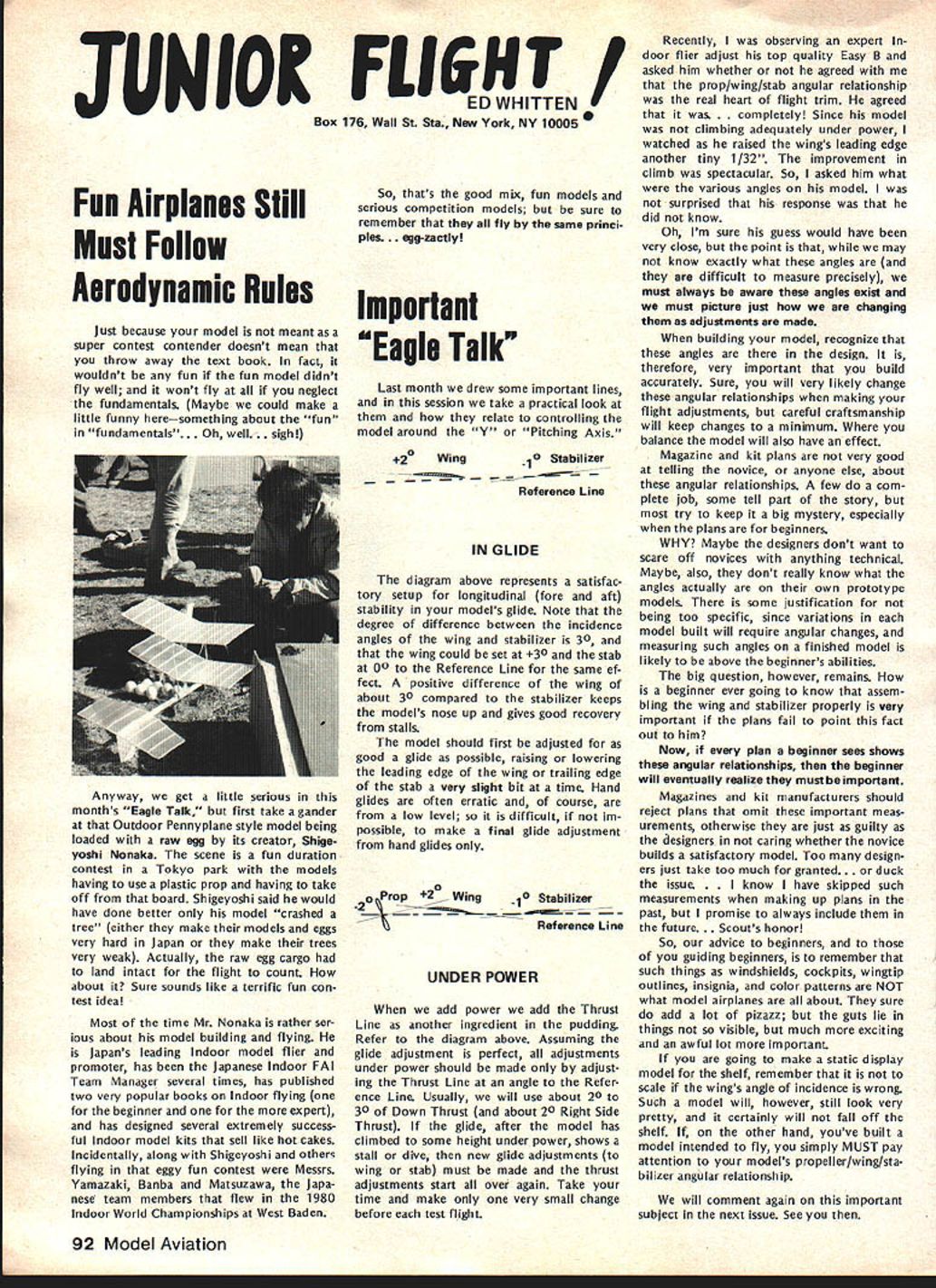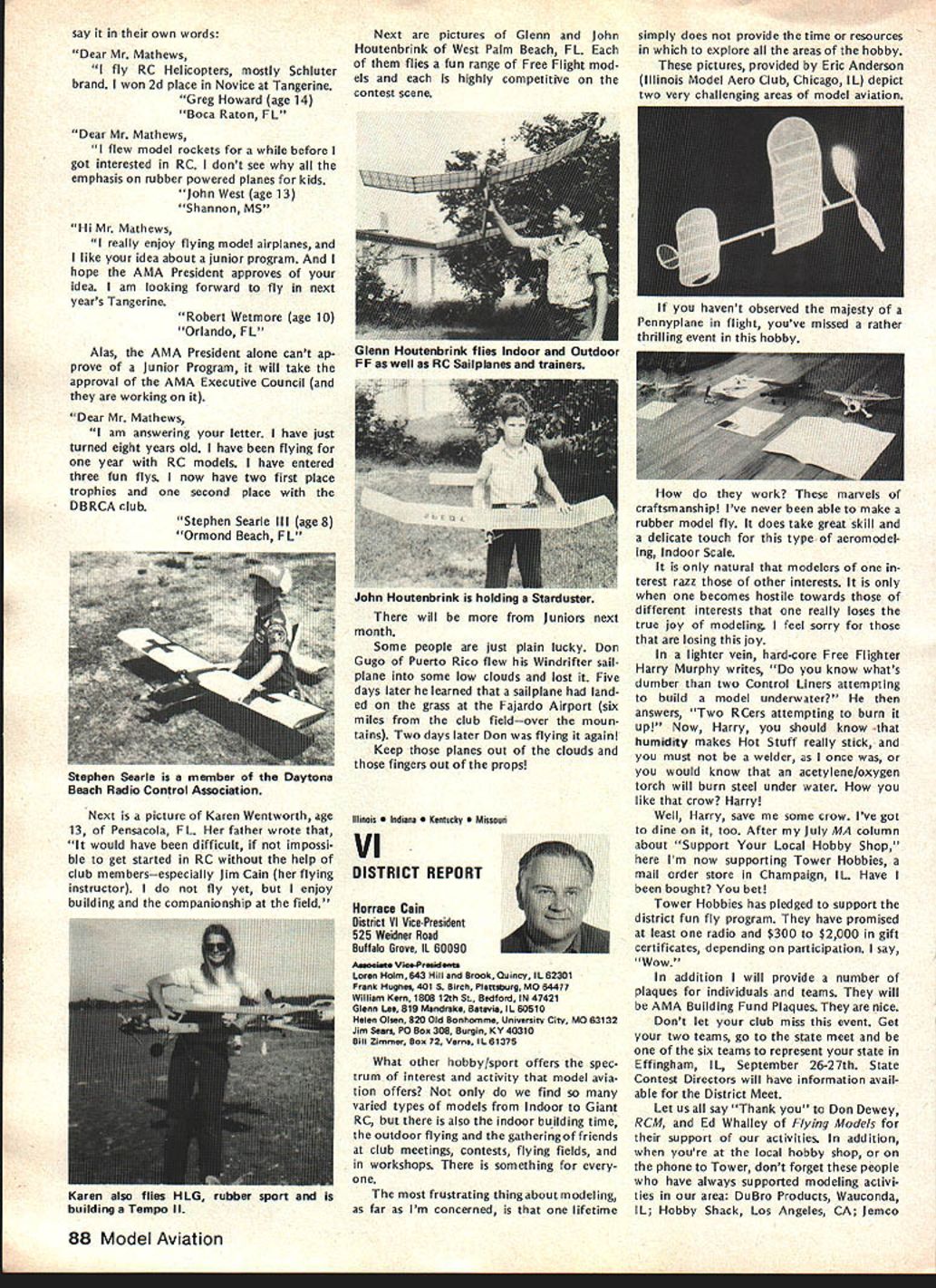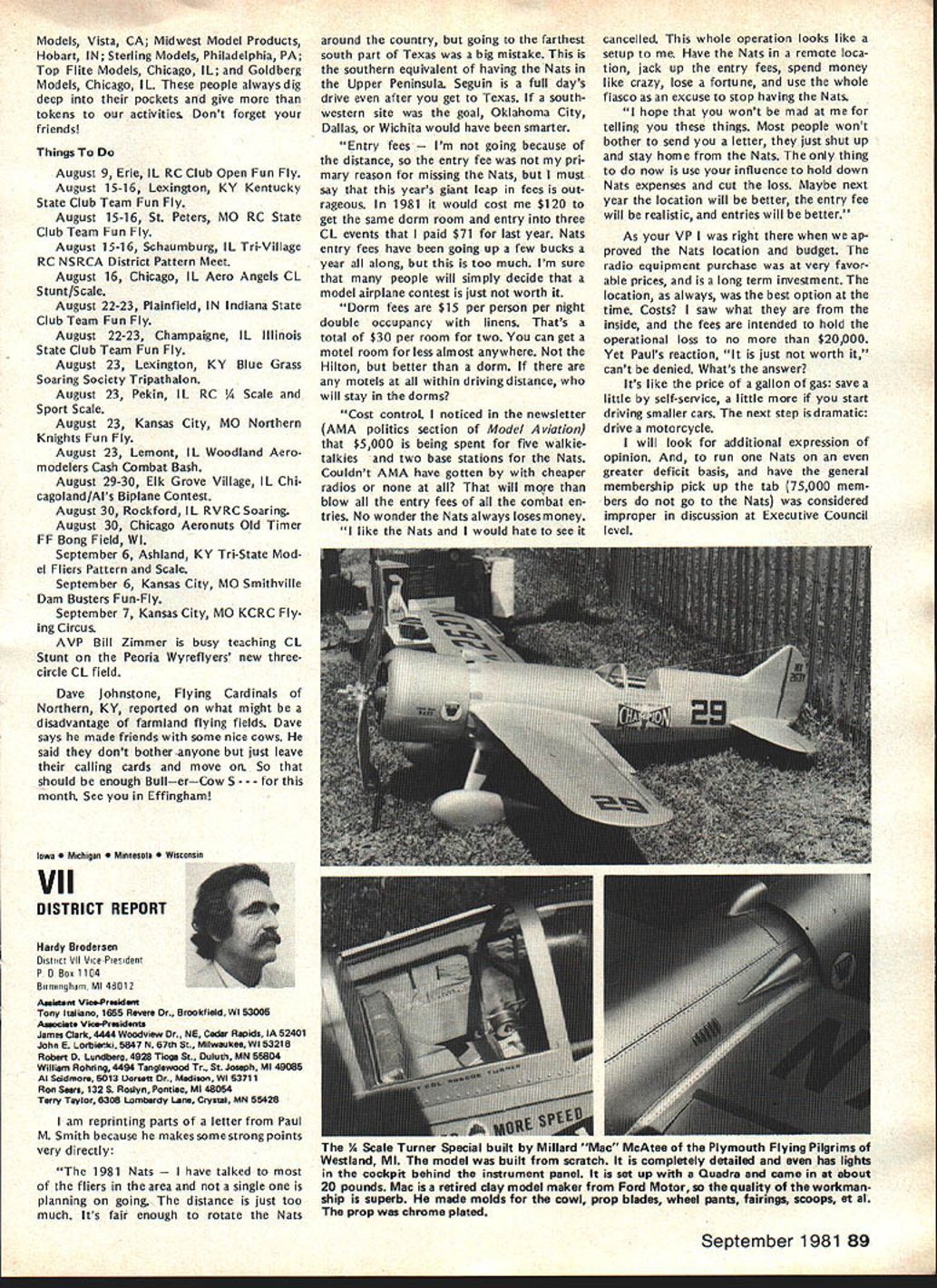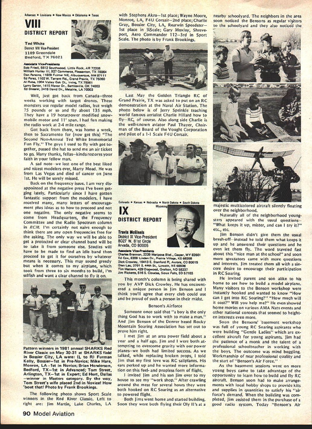 NC Frequency Committee Report Bob Aberle Chairman AMA RC Frequency Committee meeting committee held Washington DC June 5 1981 first almost year attendance Commit tee members present Bob Aberle Chair man Jack Albrecht Dave Brown Walt Good Bill Hershberger Dick Jansson Fred Marks John Strong Torrey Williams AMA John Worth Executive Director Carl Maroney Executive Assistant Legal Counsel Jack R Smith Jeremiah Courtney law firm Key items can summarized follows 1 FCC Notice Proposed Rule Making NPRM expected released late fall 1981 2 New RC rules emcompassing some 73 additional channels will likely become effective around mid-1983 3 FCC will asked leave technical specifications except modulation limita tions equipment type certification currently 4 Existing RC equipment may able used indefinitely long frequency changed new odd channels within 10 years rule effectivity date 5 These new odd channels 50 air craft use 23 non-aircraft will time exclusive RC use 6 Pursuant exclusive RC channels future committee will seek approval AMA Executive Council purchase two experimental RC systems 900 MHz 7 For near term AMA will mount campaign discourage new com mercial radio station applicants using existing seven RC channels 8 A new computer program printout has proposed pinpoint power lo cation commercial radio stations operating present seven RC channels throughout country 9 The originally proposed frequency flag control system continues refined Details rather disheartening learn long effort obtain new RC frequencies will extended FCC reasons given delay lack FCC staff manpower large workload un fortunate fact RCers con sidered low priority frequency spectrum users Progress date plus remainder rule making process can best summarized following chart AMA Petition Rule Making RM-3525 submitted November 1978 FCC informed AMA available channels 72-76 MHz band October 1979 After analyzing available channels feasibility AMA released its proposal FCC September 1980 What still must happenl FCC releases Notice Proposed Rule Making NPRM best information now indicates release date December 1981 AMA/IndustrylGeneral Public responds will have 60 days release NPRM return written commentsFeb ruary 1982 FCC releases Report & Order can take 12 18 months under normal circum stancesestimate June 1983 Rule effectivity 30 days after release Report & Orderestimate July 1983 Although projected set milestone dates may annoy modelers im patient lack progress must stress normal period time typical FCC rule making process Whatever tactful lobbying can done continued page 83 Hall Fame Awards Model Aviation Hall Fame Awards means individuals have made outstanding contributions aeromod eling recognized AMA program administrated Council Past Presi dents serve Academys Hall Fame Awards Committee Nominations admissible anyone must submitted form available AMA Headquarters Awards Com mittee selects nominated candidates winners based upon past well pres ent contributions aspects aeromod eling No past president may vote himself group consider nominations other sources However mem bers committee could qualify re flects well esteem Council Past Presidents held note seven committee members have already honored current Council Past Presidents serve Awards Committee dates AMA Presidency Irwin G Ohlsson 194346 Frank B Bushey 1952 Keith H Storey 1953-56 Claude McCul lough 1957 Dr Walter Good 1958-60 continued page 84 September 1981 77 AMA HQ including reports AMA President Secretary-Treasurer Executive Director Vice-Presidents ACADEMY OF MODEL AERONAUTICS 815 Fifteenth Street NW Washington DC 20005 Uob Aberlecurrentuommntee presentea rormer LneIr man John Strong AMAs - ot Appreciation tor almost six years service 1975-1981 position Occasion committees June 5 meeting Washington Hi Johnson May 2 1981 lost Hi doing things loved soaring glider went down near Pearbiossom CA doc tor hiking vicinity confirmed Hi died instantly crash Hi unique among old timers industry explored facet design manufac turing excitement understanding secrets natural laws particularly related flight never wavered contributions modeling interest category through manufactured kits engines compo nents cases ahead time last enterprise RC gliders again attempting forge ahead understanding provide modeler unique better way build fly Hi fountain bursting energy en thusiasm humor always ready give hand interest soaring purest form flight begun early career teenager constructed real glider friends flew hill near Brigham City UT Hi little formal educa tion never completed high school yet mastered fields endeavor en tered model airplane business 1940s Burbank Manufacturing Company later moved Henry Engineering Company Vice-President worked co-de signer classic Brave Warrior Squaw Chief Control Line model kits also involved design CL hard ware such ballcranks control horns fuel tanks spinners wheels became standard model world Around 1952 became partner Kenhi Model Prod ucts designed new line kits cluded Bobcat Cougar same time developed new method die cutting balsa wood unparal led 1956 acquired tooling license Orwick engines changes improvements created what come Johnson Engine became best Rat Racing Combat engine 1960s During time created better glow plug new throttle controllable pitch propeller fuel tanks fuel filters line precision wood propellers various hard ware items advanced model aviation Also during tenure Dynamic Models created die cast aluminum chassis slot racing along imaginable ac cessory helped set new track records around country further advanced slot racing technology late 1960s Hi final ly started Hi Johnson Model Products first partnership later himself Slot car ac cessories gas powered RC cars developed After company moved Pacoima CA products dropped present line products created felt tht plastic foam best mediums creating hi-performance glider plastic fuselages foam wings vacuum formed canopies hardware developed research included new old quest mysteries lift dra