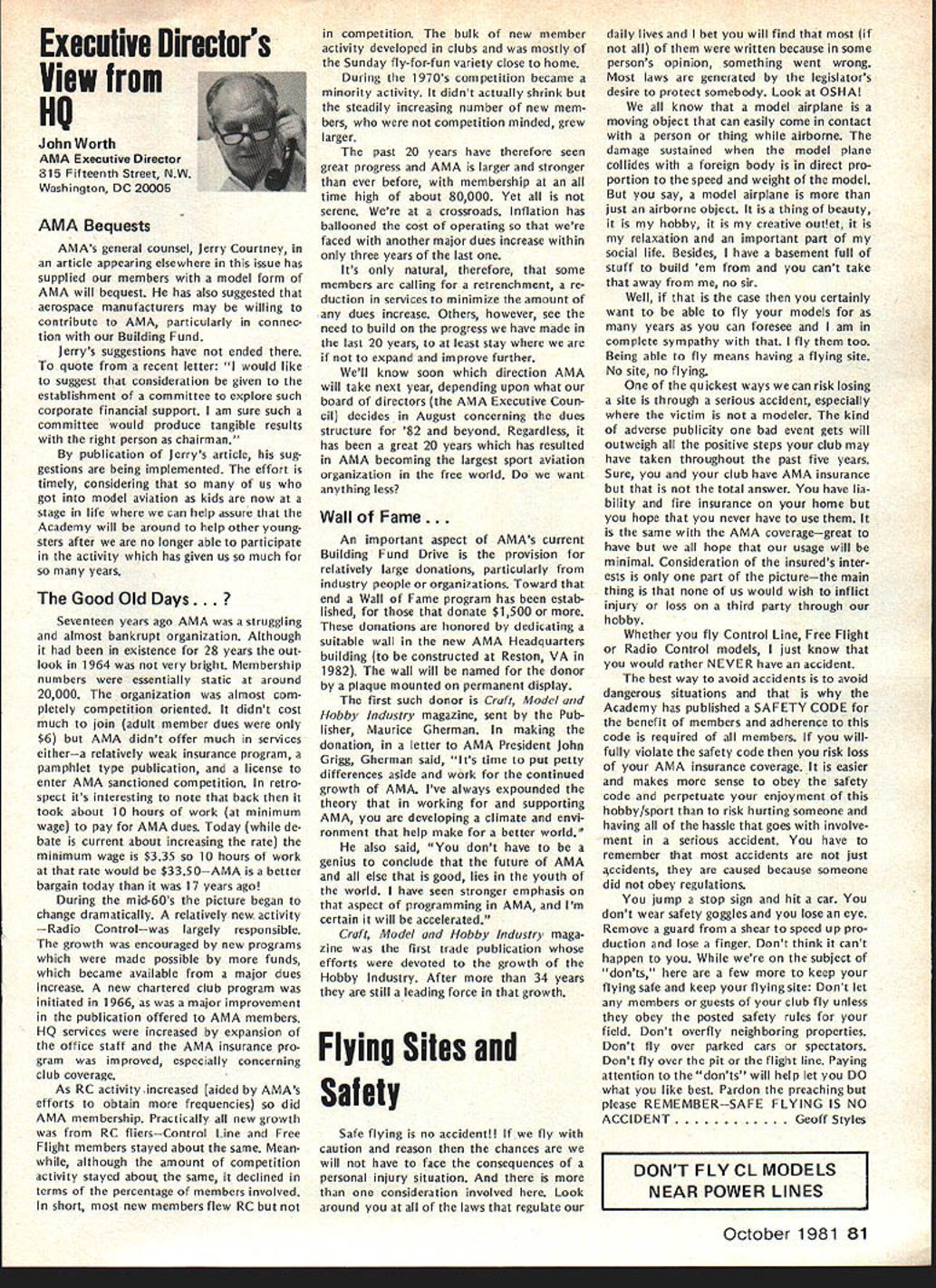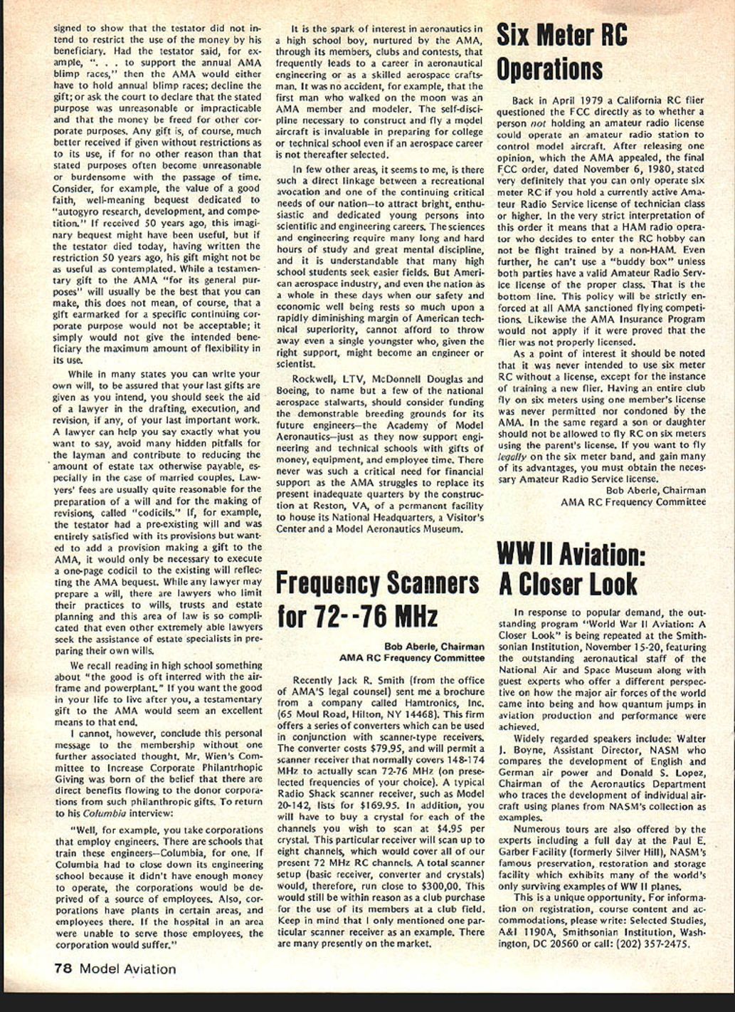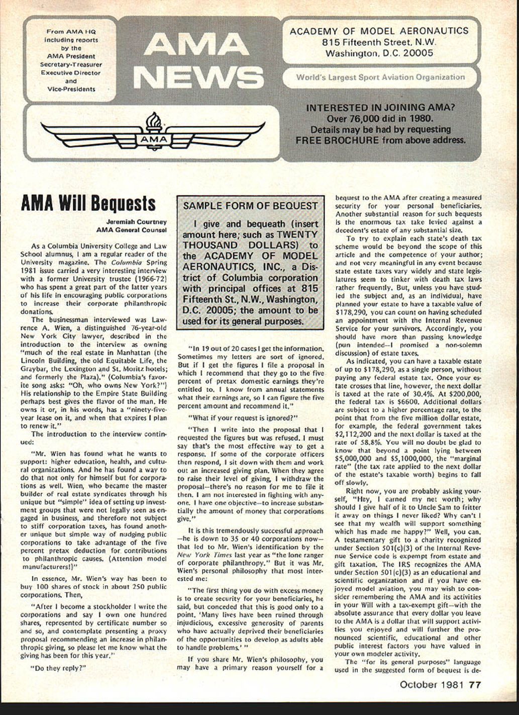 AMA Will Bequests Jeremiah Courtney AMA General Counsel As Columbia University College Law School alumnus am regular reader University magazine Columbia Spring 1981 issue carried very interesting interview former University trustee 1966-72 has spent great part latter years life encouraging public corporations increase corporate philanthropic donations businessman interviewed Law rence Wien distinguished 76-year-old New York City lawyer described introduction interview owning much real estate Manhattan Lincoln Building old Equitable Life Graybar Lexington St Moritz hotels formerly Plaza Columbias favor ite song asks Oh owns New York' relationship Empire State Building perhaps best gives flavor man owns words has ninety-five year lease expires plan renew introduction interview contin ued Mr Wien has found what wants support higher education health cultu ral organizations has found way himself corpora tions well Wien became master builder real estate syndicates through unique simple idea setting up invest ment groups legally seen en gaged business therefore subject stiff corporation taxes has found anoth er unique simple way nudging public corporations take advantage five percent pretax deduction contributions philanthropic causes Attention model manufacturers essence Mr Wiens way has buy 100 shares stock about 250 public corporations After become stockholder write corporations say own hundred shares represented certificate number so contemplate presenting proxy proposal recommending increase philan thropic giving please let know what giving has year reply 19 out 20 cases get information Sometimes letters sort ignored get figures file proposal recommend go five percent pretax domestic earnings theyre entitled know annual statements what earnings can figure five percent amount recommend What request ignored write proposal requested figures refused must say thats effective way get response some corporate officers respond sit down work out increased giving plan agree raise level giving withdraw proposaltheres no reason file am interested fighting have objectiveto increase substan tially amount money corporations give tremendously successful approach down 35 40 corporations now led Mr Wiens identification New York Times last year lone ranger corporate philanthropy Mr Wiens personal philosophy inter ested first thing excess money create security beneficiaries said conceded good point lives have ruined through injudicious excessive generosity parents have actually deprived beneficiaries opportunities develop adults able handle problems share Mr Wiens philosophy may have primary reason yourself bequest AMA after creating measured security personal beneficiaries Another substantial reason such bequests enormous tax take levied against decedents estate substantial size try explain states death tax scheme would beyond scope article competence author very meaningful event because state estate taxes vary widely state legis latures seem tinker death tax laws rather frequently unless have stud ied subject individual have planned estate have taxable value $178290 can count having scheduled appointment Internal Revenue Service survivors Accordingly should have passing knowledge pun intendedI promised non-solemn discussion estate taxes As indicated can have taxable estate up $1 78290 single person paying federal estate tax Once es tate crosses line however next dollar taxed rate 304% $200000 federal tax $6600 Additional dollars subject higher percentage rate point five million dollar estate example federal government takes $2112200 next dollar taxed rate 588% will no doubt glad know beyond point lying between $5000000 $51000000 marginal rate tax rate applied next dollar estates taxable worth begins fall off slowly Right now probably asking self Hey earned net worth should give half Uncle Sam fritter away things never liked cant see wealth will support something has made happy Well can testamentary gift charity recognized under Section 501 c3 Internal Reve nue Service code expempt estate gift taxation IRS recognizes AMA under Section 501 c3 educational scientific organization have en joyed model aviation may wish con sider remembering AMA its activities Will tax-exempt giftwith absolute assurance dollar leave AMA dollar will support activi ties enjoyed will further pro nounced scientific educational other public interest factors have valued own modeler activity its general purposes language used suggested form bequest de October1981 77 AMA HQ including reports AMA President Seci-etary-T reasu rer Executive Director Vice-Presidents ACADEMY OF MODEL AERONAUTICS 81 5 Fifteenth Street NW Washington DC 20005 signed show testator did tend restrict use money beneficiary testator said ex ample pport annual AMA blimp races AMA would either have hold annual blimp races decline gift ask court declare stated purpose unreasonable impracticable money freed other cor porate purposes Any gift course much better received given restrictions its use no other reason stated purposes often become unreasonable burdensome passage time Consider example value good faith well-meaning bequest dedicated autogyro research development compe tition received 50 years ago imagi nary bequest might have useful testator died today having written restriction 50 years ago gift might useful contemplated testamen tary gift AMA its general pur poses will usually best can make does mean course gift earmarked specific continuing cor porate purpose would acceptable simply would give intended bene ficiary maximum amount flexibility its use states can write own will assured last gifts given intend should seek aid lawyer drafting execution revision last important work lawyer can help say exactly what want say avoid hidden pitfalls layman contribute reducing amount estate tax otherwise payable es pecially case married couples Law yers fees usually quite reasonable preparation will making revisions called codicils example testator pre-existing will entirely
