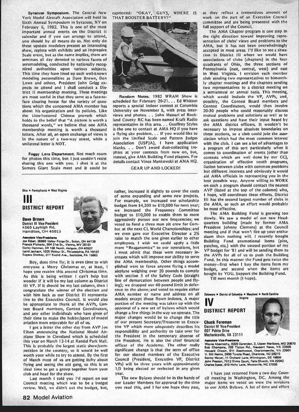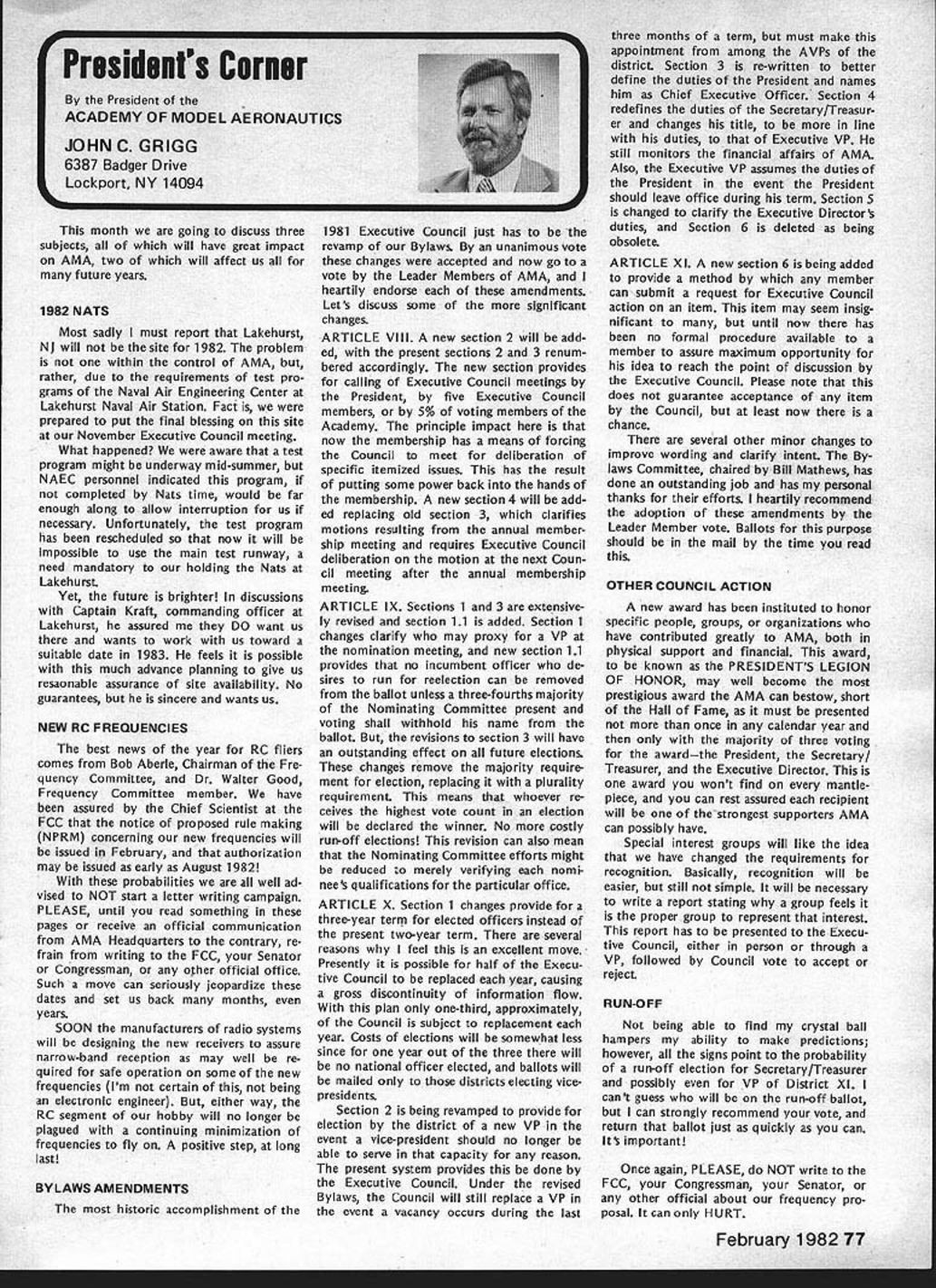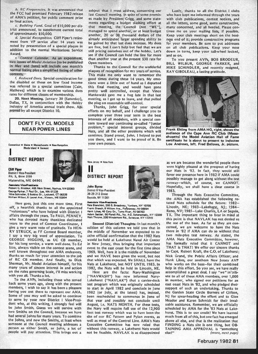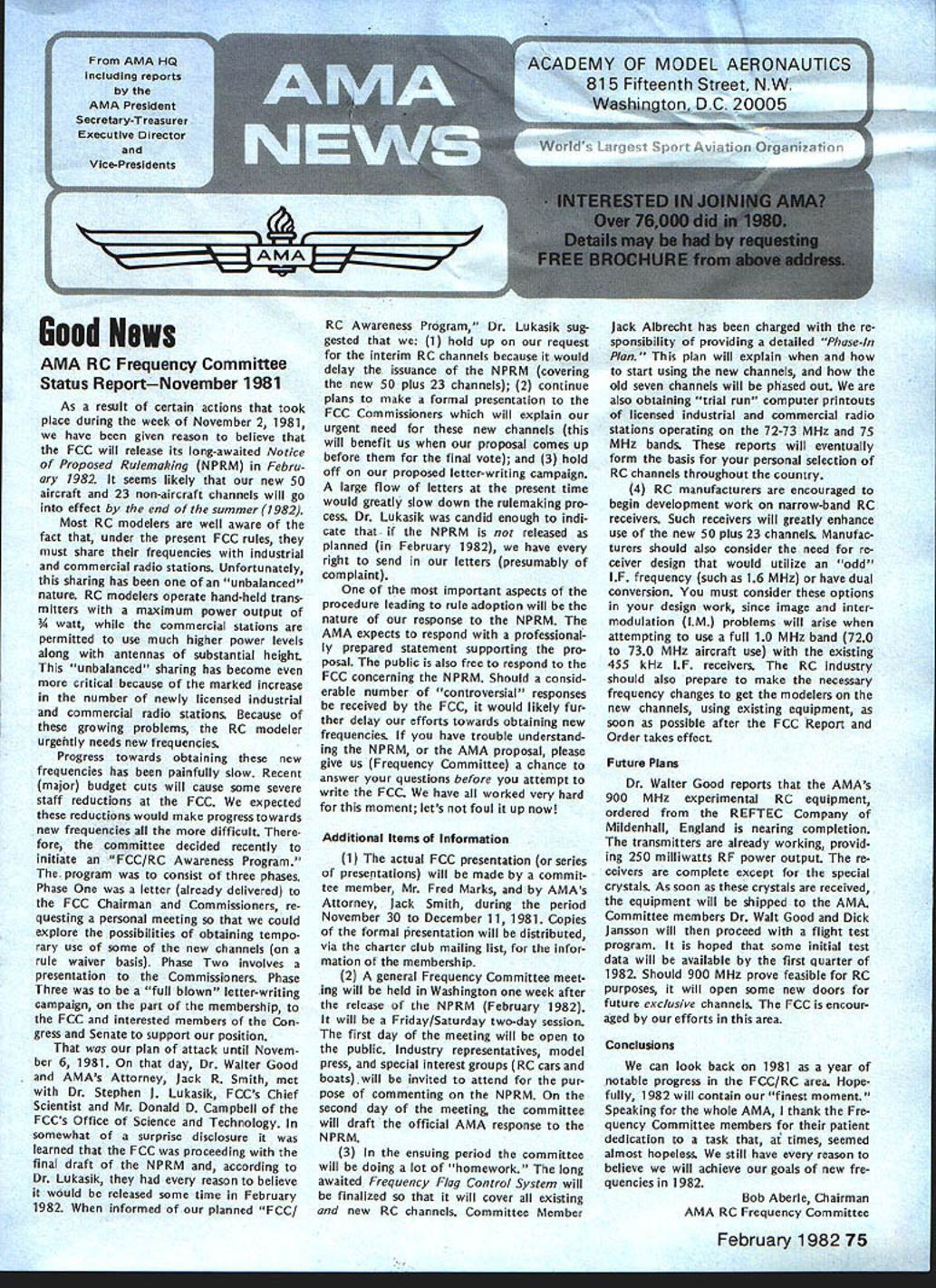 AMA RC Frequency Committee Status ReportNovember 1981 As result certain actions took place during week November 2 1981 have given reason believe FCC will release its long-awaited Notice Proposed Rulemaking NPRM Febru cry 1982 seems likely new 50 aircraft 23 non-aircraft channels will go effect end summer 1982 Most RC modelers well aware fact under present FCC rules must share frequencies industrial commercial radio stations Unfortu nately sharing has unbalanced nature RC modelers operate hand-held trans mitters maximum power output 3/4 watt commercial stations permitted use much higher power levels along antennas substantial height unbalanced sharing has become critical because marked increase number newly licensed industrial commercial radio stations Because growing problems RC modeler urgehtly needs new frequencies Progress towards obtaining new frequencies has painfully slow Recent major budget cuts will cause some severe staff reductions FCC expected reductions would make progress towards new frequencies difficult fore committee decided recently initiate FCC/RC Awareness Program program consist three phases Phase letter already delivered FCC Chairman Commissioners re questing personal meeting could explore possibilities obtaining tempo rary use some new channels rule waiver basis Phase Two involves presentation Commissioners Phase Three full blown letter-writing campaign part membership FCC interested members Con gress Senate support position plan attack until Novem ber 6 1981 day Dr Walter Good AMAs Attorney Jack R Smith met Dr Stephen J Lukasik FCCs Chief Scientist Mr Donald D Campbell FCCs Office Science Technology somewhat surprise disclosure learned FCC proceeding final draft NPRM according Dr Lukasik reason believe would released some time February 1982 informed planned FCC/ RC Awareness Program Dr Lukasik sug gested 1 hold up request interim RC channels because would delay issuance NPRM covering new 50 plus 23 channels 2 continue plans make formal presentation FCC Commissioners will explain urgent need new channels will benefit us proposal comes up before final vote 3 hold off proposed letter-writing campaign large flow letters present time would greatly slow down rulemaking pro cess Dr Lukasik candid enough indi cate NPRM released planned February 1982 have right send letters presumably complaint important aspects procedure leading rule adoption will nature response NPRM AMA expects respond professional ly prepared statement supporting pro posal public also free respond FCC concerning NPRM Should consid erable number controversial responses received FCC would likely fur ther delay efforts towards obtaining new frequencies have trouble understand ing NPRM AMA proposal please give us Frequency Committee chance answer questions before attempt write FCC have worked very hard moment lets foul up now Additional Items Information 1 actual FCC presentation series presentations will made commit tee member Mr Fred Marks AMAs Attorney Jack Smith during period November 30 December 11 1981 Copies formal presentation will distributed via charter club mailing list infor mation membership 2 general Frequency Committee meet ing will held Washington week after release NPRM February 1982 will Friday/Saturday two-day session first day meeting will open public Industry representatives model press special interest groups RC cars boats will invited attend pur pose commenting NPRM second day meeting committee will draft official AMA response NPRM 3 ensuing period committee will doing lot homework long awaited Frequency Flag Control System will finalized will cover existing new RC channels Committee Member Jack Albrecht has charged re sponsibility providing detailed Phase-In Plan plan will explain start using new channels old seven channels will phased out also obtaining trial run computer printouts licensed industrial commercial radio stations operating 72-73 MHz 75 MHz bands reports will eventually form basis personal selection RC channels throughout country 4 RC manufacturers encouraged begin development work narrow-band RC receivers Such receivers will greatly enhance use new 50 plus 23 channels Manufac turers should also consider need re ceiver design would utilize odd lF frequency such 16 MHz have dual conversion must consider options design work since image intermodulation lM problems will arise attempting use full 10 MHz band 720 730 MHz aircraft use existing 455 kHz IF receivers RC industry should also prepare make necessary frequency changes get modelers new channels using existing equipment soon possible after FCC Report Order takes effect Future Plans Dr Walter Good reports AMAs 900 MHz experimental RC equipment ordered REFTEC Company Mildenhall England nearing completion transmitters already working provid ing 250 milliwatts RF power output re ceivers complete except special crystals As soon crystals received equipment will shipped AMA Committee members Dr Walt Good Dick Jansson will proceed flight test program hoped some initial test data will available first quarter 1982 Should 900 MHz prove feasible RC purposes will open some new doors future exclusive channels FCC encour aged efforts area Conclusions can look back 1981 year notable progress FCC/RC area Hope fully 1982 will contain finest moment Speaking whole AMA thank Fre quency Committee members patient dedication task times seemed almost hopeless still have reason believe will achieve goals new fre quencies 1982 Bob Aberle Chairman AMA RC Frequency Committee February 1982 75 AMA HQ including reports AMA President Secretary-Treasurer Executive Director Vice-Presidents L ACADEMY OF MODEL AERONAUTICS 815 Fifteenth Street NW Washington D Good News Synopsis- November 7-8 1981 Executive Council Meeting following summarizes actions November 7-8 1981 AMA Executive Council meeting Arlington VA near Washington DC copy official minutes may obtained upon request AMA Head quarters available approximately February 15 minutes will become officia
