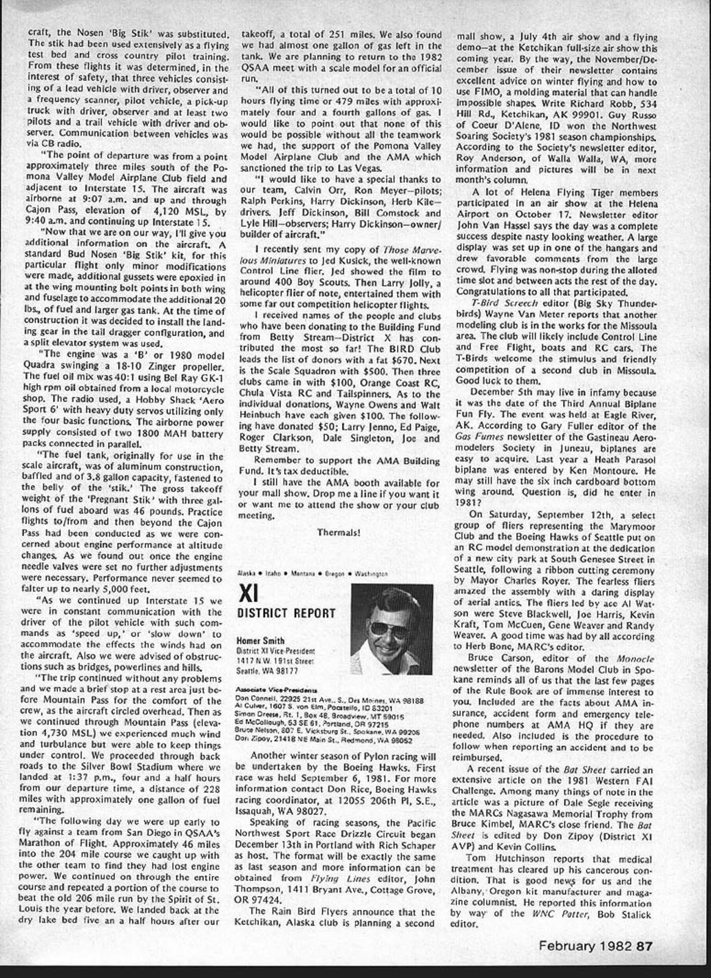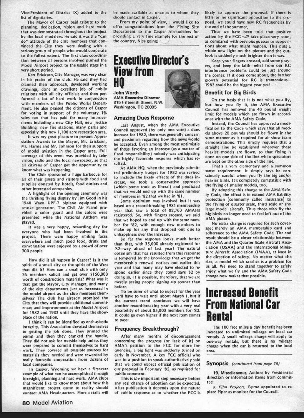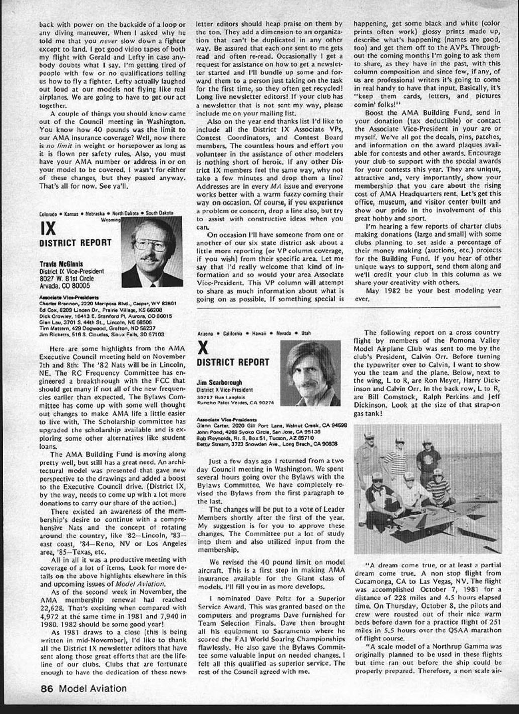 AMA RC Frequency Committee Status ReportNovember 1981 As result certain actions took place during week November 2 1981 have given reason believe FCC will release its long-awaited Notice Proposed Rulemaking NPRM Febru cry 1982 seems likely new 50 aircraft 23 non-aircraft channels will go effect end summer 1982 Most RC modelers well aware fact under present FCC rules must share frequencies industrial commercial radio stations Unfortu nately sharing has unbalanced nature RC modelers operate hand-held trans mitters maximum power output 3/4 watt commercial stations permitted use much higher power levels along antennas substantial height unbalanced sharing has become critical because marked increase number newly licensed industrial commercial radio stations Because growing problems RC modeler urgehtly needs new frequencies Progress towards obtaining new frequencies has painfully slow Recent major budget cuts will cause some severe staff reductions FCC expected reductions would make progress towards new frequencies difficult fore committee decided recently initiate FCC/RC Awareness Program program consist three phases Phase letter already delivered FCC Chairman Commissioners re questing personal meeting could explore possibilities obtaining tempo rary use some new channels rule waiver basis Phase Two involves presentation Commissioners Phase Three full blown letter-writing campaign part membership FCC interested members Con gress Senate support position plan attack until Novem ber 6 1981 day Dr Walter Good AMAs Attorney Jack R Smith met Dr Stephen J Lukasik FCCs Chief Scientist Mr Donald D Campbell FCCs Office Science Technology somewhat surprise disclosure learned FCC proceeding final draft NPRM according Dr Lukasik reason believe would released some time February 1982 informed planned FCC/ RC Awareness Program Dr Lukasik sug gested 1 hold up request interim RC channels because would delay issuance NPRM covering new 50 plus 23 channels 2 continue plans make formal presentation FCC Commissioners will explain urgent need new channels will benefit us proposal comes up before final vote 3 hold off proposed letter-writing campaign large flow letters present time would greatly slow down rulemaking pro cess Dr Lukasik candid enough indi cate NPRM released planned February 1982 have right send letters presumably complaint important aspects procedure leading rule adoption will nature response NPRM AMA expects respond professional ly prepared statement supporting pro posal public also free respond FCC concerning NPRM Should consid erable number controversial responses received FCC would likely fur ther delay efforts towards obtaining new frequencies have trouble understand ing NPRM AMA proposal please give us Frequency Committee chance answer questions before attempt write FCC have worked very hard moment lets foul up now Additional Items Information 1 actual FCC presentation series presentations will made commit tee member Mr Fred Marks AMAs Attorney Jack Smith during period November 30 December 11 1981 Copies formal presentation will distributed via charter club mailing list infor mation membership 2 general Frequency Committee meet ing will held Washington week after release NPRM February 1982 will Friday/Saturday two-day session first day meeting will open public Industry representatives model press special interest groups RC cars boats will invited attend pur pose commenting NPRM second day meeting committee will draft official AMA response NPRM 3 ensuing period committee will doing lot homework long awaited Frequency Flag Control System will finalized will cover existing new RC channels Committee Member Jack Albrecht has charged re sponsibility providing detailed Phase-In Plan plan will explain start using new channels old seven channels will phased out also obtaining trial run computer printouts licensed industrial commercial radio stations operating 72-73 MHz 75 MHz bands reports will eventually form basis personal selection RC channels throughout country 4 RC manufacturers encouraged begin development work narrow-band RC receivers Such receivers will greatly enhance use new 50 plus 23 channels Manufac turers should also consider need re ceiver design would utilize odd lF frequency such 16 MHz have dual conversion must consider options design work since image intermodulation lM problems will arise attempting use full 10 MHz band 720 730 MHz aircraft use existing 455 kHz IF receivers RC industry should also prepare make necessary frequency changes get modelers new channels using existing equipment soon possible after FCC Report Order takes effect Future Plans Dr Walter Good reports AMAs 900 MHz experimental RC equipment ordered REFTEC Company Mildenhall England nearing completion transmitters already working provid ing 250 milliwatts RF power output re ceivers complete except special crystals As soon crystals received equipment will shipped AMA Committee members Dr Walt Good Dick Jansson will proceed flight test program hoped some initial test data will available first quarter 1982 Should 900 MHz prove feasible RC purposes will open some new doors future exclusive channels FCC encour aged efforts area Conclusions can look back 1981 year notable progress FCC/RC area Hope fully 1982 will contain finest moment Speaking whole AMA thank Fre quency Committee members patient dedication task times seemed almost hopeless still have reason believe will achieve goals new fre quencies 1982 Bob Aberle Chairman AMA RC Frequency Committee February 1982 75 AMA HQ including reports AMA President Secretary-Treasurer Executive Director Vice-Presidents L ACADEMY OF MODEL AERONAUTICS 815 Fifteenth Street NW Washington D Good News Synopsis- November 7-8 1981 Executive Council Meeting following summarizes actions November 7-8 1981 AMA Executive Council meeting Arlington VA near Washington DC copy official minutes may obtained upon request AMA Head quarters available approximately February 15 minutes will become officia