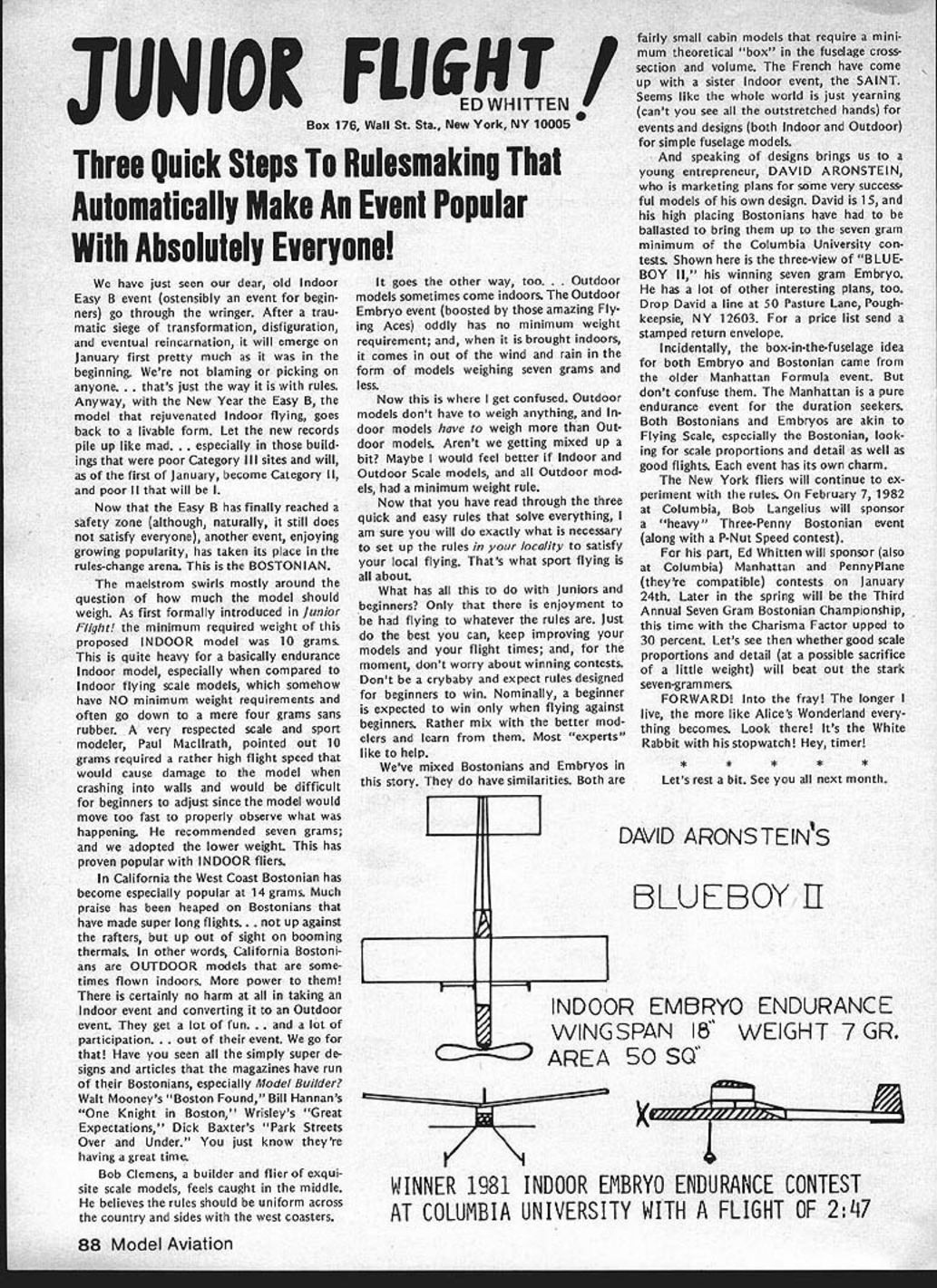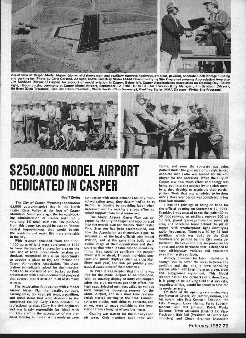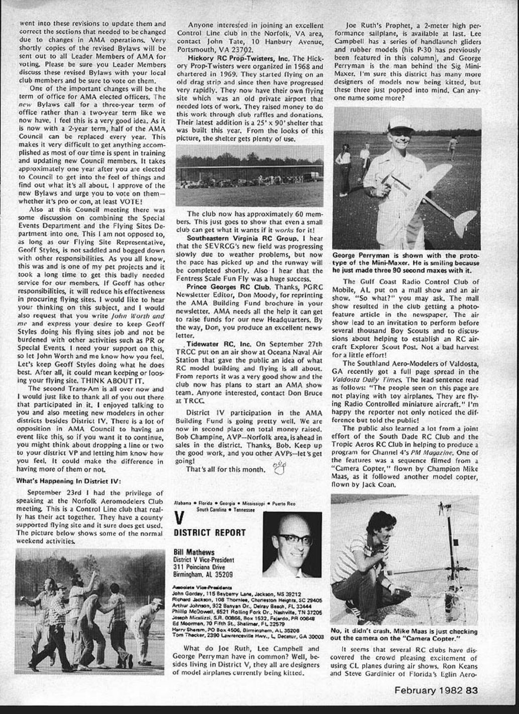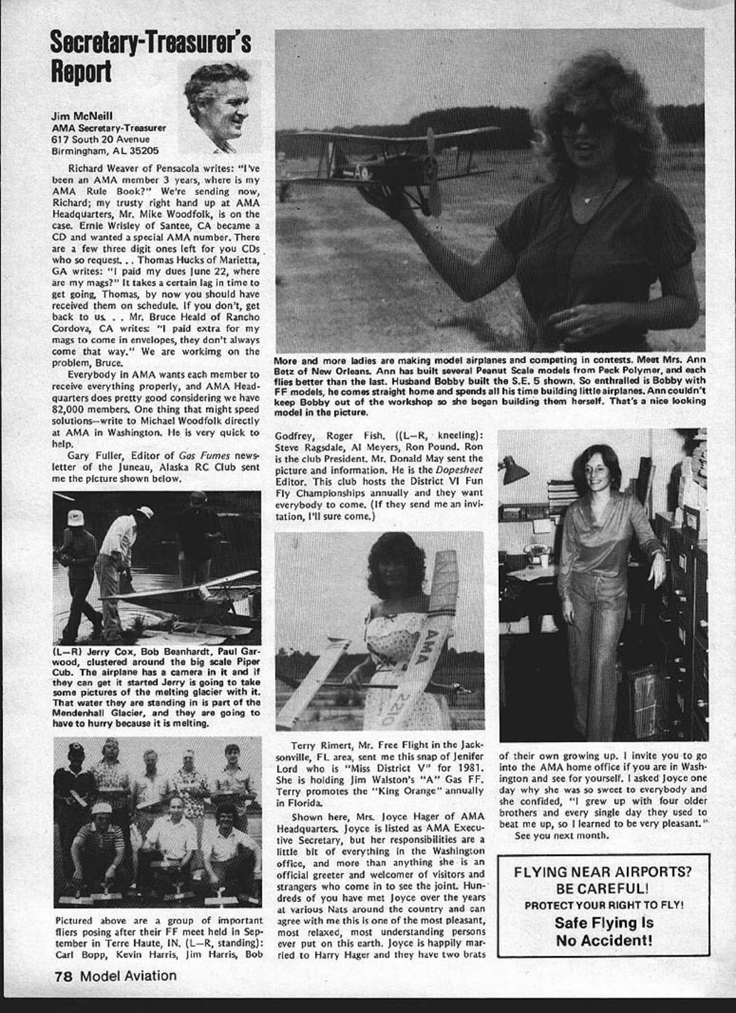 AMA RC Frequency Committee Status ReportNovember 1981 As result certain actions took place during week November 2 1981 have given reason believe FCC will release its long-awaited Notice Proposed Rulemaking NPRM Febru cry 1982 seems likely new 50 aircraft 23 non-aircraft channels will go effect end summer 1982 Most RC modelers well aware fact under present FCC rules must share frequencies industrial commercial radio stations Unfortu nately sharing has unbalanced nature RC modelers operate hand-held trans mitters maximum power output 3/4 watt commercial stations permitted use much higher power levels along antennas substantial height unbalanced sharing has become critical because marked increase number newly licensed industrial commercial radio stations Because growing problems RC modeler urgehtly needs new frequencies Progress towards obtaining new frequencies has painfully slow Recent major budget cuts will cause some severe staff reductions FCC expected reductions would make progress towards new frequencies difficult fore committee decided recently initiate FCC/RC Awareness Program program consist three phases Phase letter already delivered FCC Chairman Commissioners re questing personal meeting could explore possibilities obtaining tempo rary use some new channels rule waiver basis Phase Two involves presentation Commissioners Phase Three full blown letter-writing campaign part membership FCC interested members Con gress Senate support position plan attack until Novem ber 6 1981 day Dr Walter Good AMAs Attorney Jack R Smith met Dr Stephen J Lukasik FCCs Chief Scientist Mr Donald D Campbell FCCs Office Science Technology somewhat surprise disclosure learned FCC proceeding final draft NPRM according Dr Lukasik reason believe would released some time February 1982 informed planned FCC/ RC Awareness Program Dr Lukasik sug gested 1 hold up request interim RC channels because would delay issuance NPRM covering new 50 plus 23 channels 2 continue plans make formal presentation FCC Commissioners will explain urgent need new channels will benefit us proposal comes up before final vote 3 hold off proposed letter-writing campaign large flow letters present time would greatly slow down rulemaking pro cess Dr Lukasik candid enough indi cate NPRM released planned February 1982 have right send letters presumably complaint important aspects procedure leading rule adoption will nature response NPRM AMA expects respond professional ly prepared statement supporting pro posal public also free respond FCC concerning NPRM Should consid erable number controversial responses received FCC would likely fur ther delay efforts towards obtaining new frequencies have trouble understand ing NPRM AMA proposal please give us Frequency Committee chance answer questions before attempt write FCC have worked very hard moment lets foul up now Additional Items Information 1 actual FCC presentation series presentations will made commit tee member Mr Fred Marks AMAs Attorney Jack Smith during period November 30 December 11 1981 Copies formal presentation will distributed via charter club mailing list infor mation membership 2 general Frequency Committee meet ing will held Washington week after release NPRM February 1982 will Friday/Saturday two-day session first day meeting will open public Industry representatives model press special interest groups RC cars boats will invited attend pur pose commenting NPRM second day meeting committee will draft official AMA response NPRM 3 ensuing period committee will doing lot homework long awaited Frequency Flag Control System will finalized will cover existing new RC channels Committee Member Jack Albrecht has charged re sponsibility providing detailed Phase-In Plan plan will explain start using new channels old seven channels will phased out also obtaining trial run computer printouts licensed industrial commercial radio stations operating 72-73 MHz 75 MHz bands reports will eventually form basis personal selection RC channels throughout country 4 RC manufacturers encouraged begin development work narrow-band RC receivers Such receivers will greatly enhance use new 50 plus 23 channels Manufac turers should also consider need re ceiver design would utilize odd lF frequency such 16 MHz have dual conversion must consider options design work since image intermodulation lM problems will arise attempting use full 10 MHz band 720 730 MHz aircraft use existing 455 kHz IF receivers RC industry should also prepare make necessary frequency changes get modelers new channels using existing equipment soon possible after FCC Report Order takes effect Future Plans Dr Walter Good reports AMAs 900 MHz experimental RC equipment ordered REFTEC Company Mildenhall England nearing completion transmitters already working provid ing 250 milliwatts RF power output re ceivers complete except special crystals As soon crystals received equipment will shipped AMA Committee members Dr Walt Good Dick Jansson will proceed flight test program hoped some initial test data will available first quarter 1982 Should 900 MHz prove feasible RC purposes will open some new doors future exclusive channels FCC encour aged efforts area Conclusions can look back 1981 year notable progress FCC/RC area Hope fully 1982 will contain finest moment Speaking whole AMA thank Fre quency Committee members patient dedication task times seemed almost hopeless still have reason believe will achieve goals new fre quencies 1982 Bob Aberle Chairman AMA RC Frequency Committee February 1982 75 AMA HQ including reports AMA President Secretary-Treasurer Executive Director Vice-Presidents L ACADEMY OF MODEL AERONAUTICS 815 Fifteenth Street NW Washington D Good News Synopsis- November 7-8 1981 Executive Council Meeting following summarizes actions November 7-8 1981 AMA Executive Council meeting Arlington VA near Washington DC copy official minutes may obtained upon request AMA Head quarters available approximately February 15 minutes will become officia