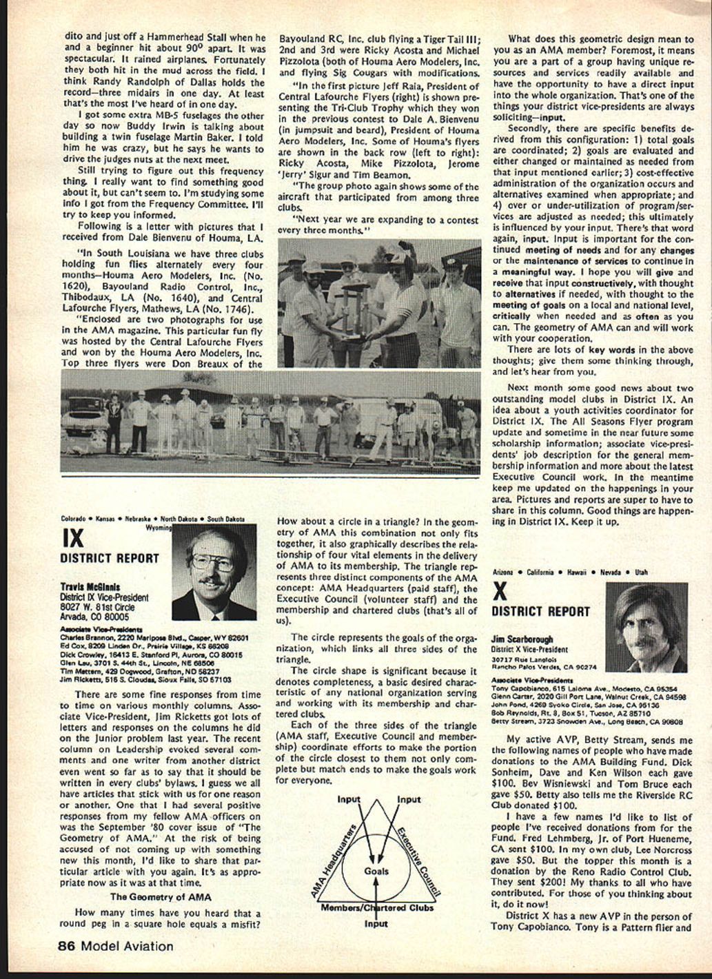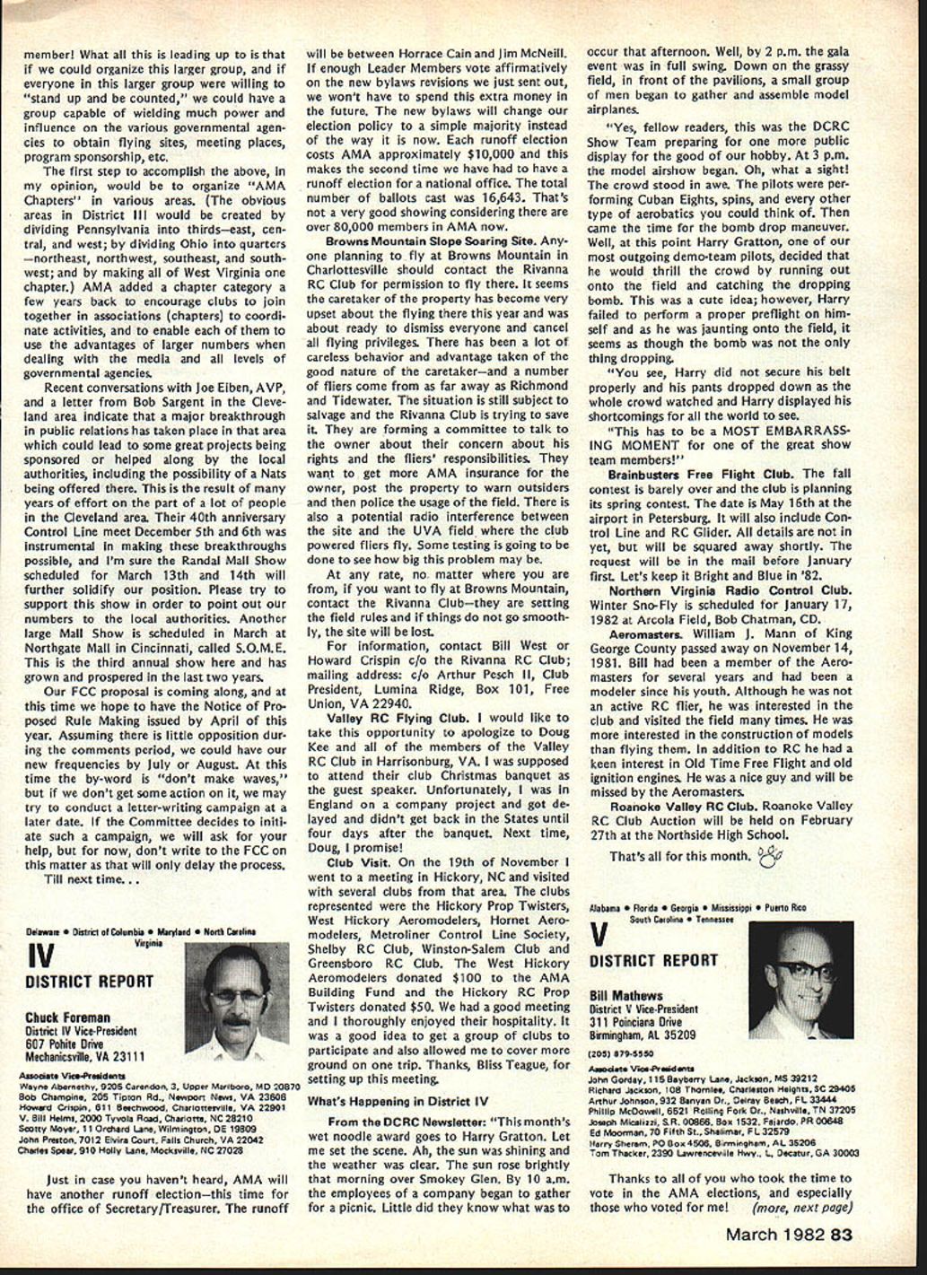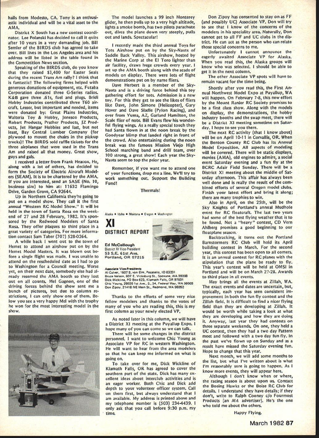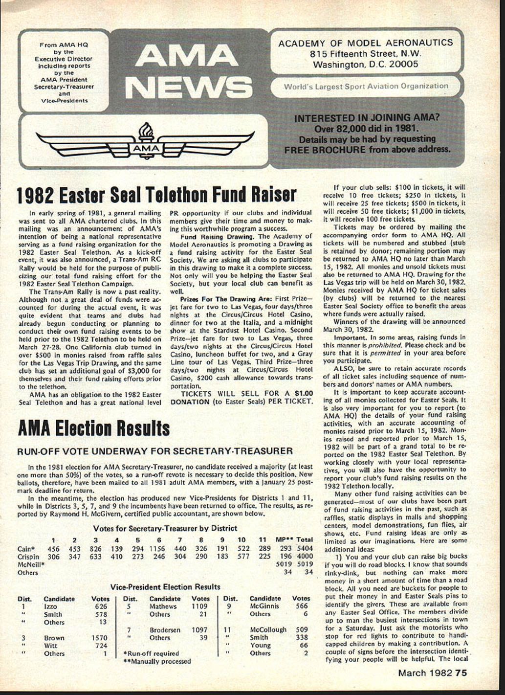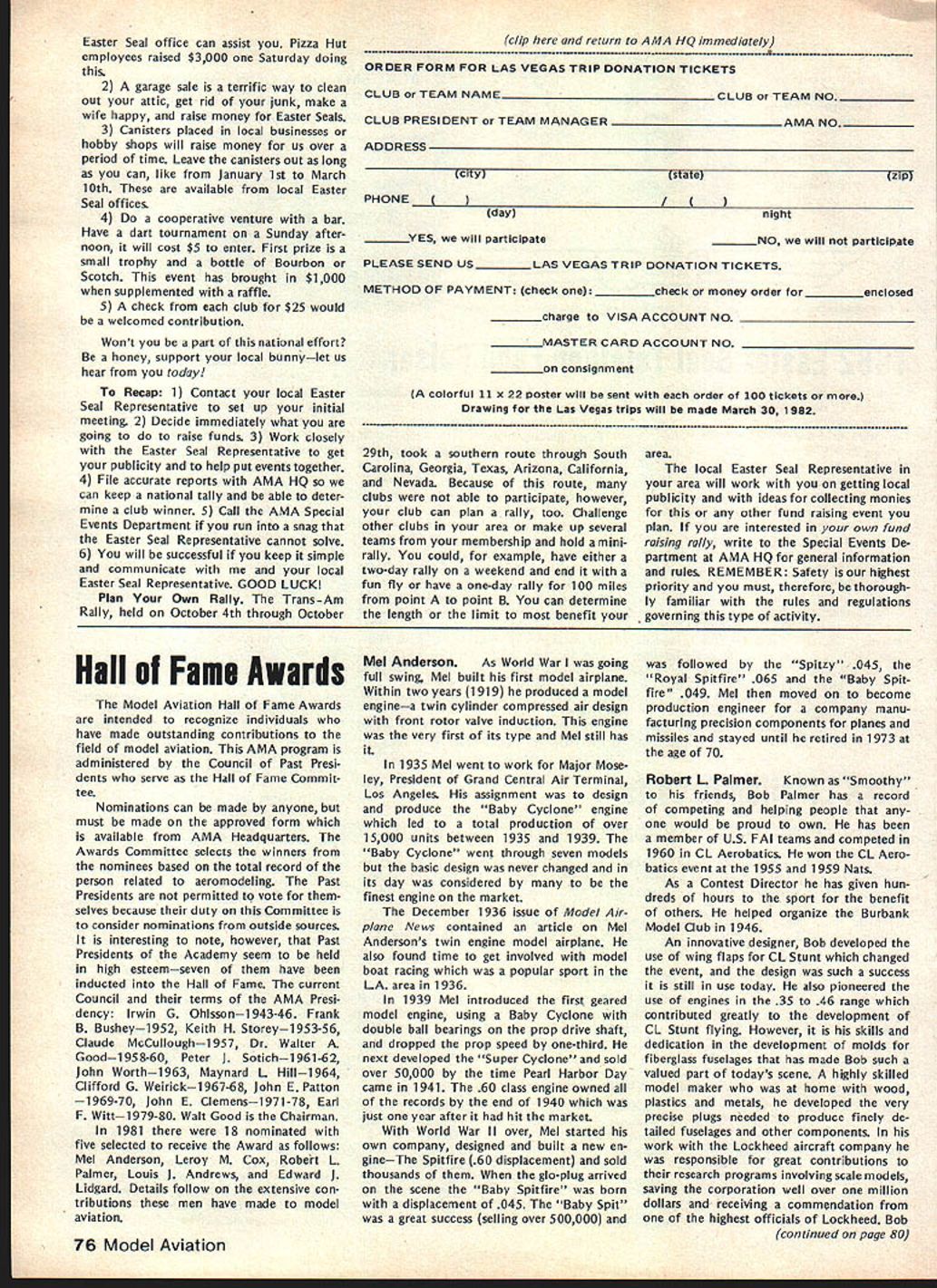 r early spring 1981 general mailing sent AMA chartered clubs mailing announcement AMAs intention being national representative serving fund raising organization 1982 Easter Seal Telethon As kick-off event also announced Trans-Am RC Rally would held purpose publi cizing total fund raising effort 1982 Easter Seal Telethon Campaign Trans-Am Rally now past reality Although great deal funds ac counted during actual event quite evident teams clubs already begun conducting planning conduct own fund raising events held prior 1982 Telethon held March 27-28 California club turned over $500 monies raised raffle sales Las Vegas Trip Drawing same club has set additional goal $3000 themselves fund raising efforts prior telethon AMA has obligation 1982 Easter Seal Telethon has great national level PR opportunity clubs individual members give time money mak ing worthwhile program success Fund Raising Drawing Academy Model Aeronautics promoting Drawing fund raising activity Easter Seal Society asking clubs participate drawing make complete success will helping Easter Seal Society local club can benefit well Prizes Drawing Are First Prize jet fare two Las Vegas four days/three nights Circus/Circus Hotel Casino dinner two Italia midnight show Stardust Hotel Casino Second Prizejet fare two Las Vegas three days/two nights Circus/Circus Hotel Casino luncheon buffet two Gray Line tour Las Vegas Third Prizethree days/two nights Circus/Circus Hotel Casino $200 cash allowance towards trans portation TICKETS WILL SELL FOR $100 DONATION Easter Seals PER TICKET AMA Election Results RUN-OFF VOTE UNDERWAY FOR SECRETARY-TREASURER 1981 election AMA Secretary-Treasurer no candidate received majority least 50% votes run-off revote necessary decide position New ballots therefore have mailed 1981 adult AMA members january25 post mark deadline return meantime election has produced new Vice-Presidents Districts 1 11 Districts 3 5 7 9 incumbents have returned office results re ported Raymond H McGivern certified public accountant shown below Votes Secretary-Treasurer District Cain* Crispin McNeill* Others 123456 4564538261392941156 306347633410273246 78 440326 304290 91011MP**Total 1915222892935404 1835772251964000 50195019 3434 Vice-President Election Results Dist Candidate 1Izzo Smith Others 3Brown Witt Others Votes 626 578 13 1570 724 Dist 5 7 CandidateVotesDist Mathews11099 Others21 Brodersen109711 Others39 *Runoff required **Manually processed Candidate McGinnis Others Votes 566 6 McCollough509 Smith338 Young66 Others2 club sells $100 tickets will receive 10 free tickets $250 tickets will receive 25 free tickets $500 tickets will receive 50 free tickets $1000 tickets will receive 100 free tickets Tickets may ordered mailing accompanying order form AMA HQ tickets will numbered stubbed stub retained donor remaining portion may returned AMA HQ no later March 15 1982 monies unsold tickets must also returned AMA HQ Drawing Las Vegas trip will held March 30 1982 Monies received AMA HQ ticket sales clubs will returned nearest Easter Seal Society office benefit areas funds actually raised Winners drawing will announced March 30 1982 Important some areas raising funds manner prohibited Please check sure permitted area before participate ALSO sure retain accurate records ticket sales including sequence num bers donors names AMA numbers important keep accurate account ing monies collected Easter Seals also very important report AMA HQ details fund raising activities accurate accounting monies raised prior March 15 1982 Mon ies raised reported prior March 15 1982 will part grand total re ported 1982 Easter Seal Telethon working closely local representa tives will also have opportunity report clubs fund raising results 1982 Telethon locally other fund raising activities can generatedmost clubs have part fund raising activities past such raffles static displays malls shopping centers model demonstrations fun flies air shows etc Fund raising ideas limited imaginations some additional ideas 1 club can raise big bucks will road blocks know sounds rinky-dink nothing can make money short amount time road block need buckets people put money Easter Seals pins identify givers available Easter Seal Office members divide up man busiest intersections town Saturday Just ask motorists stop red lights contribute handi capped children making contribution couple signs before intersection identi fying people will helpful local March 198275 AMA HQ Executive Director including reports AMA President Secretary-Treasurer Vice-Presidents L ACADEMY OF MODEL AERONAUTICS 815 Fifteenth Street NW Washington DC 20005 1982 Easter Seal Telethon Fund Raiser Easter Seal office can assist Pizza Hut employees raised $3000 Saturday doing th 2 A garage sale terrific way clean out attic get rid junk make wife happy raise money Easter Seals 3 Canisters placed local businesses hobby shops will raise money us over period time Leave canisters out long can like January 1st March 10th available local Easter Seal offices 4 Do cooperative venture bar Have dart tournament Sunday after noon will cost $5 enter First prize small trophy bottle Bourbon Scotch event has brought $1000 supplemented raffle 5 A check club $25 would welcomed contribution Wont part national effort honey support local bunnylet us hear today Recap 1 Contact local Easter Seal Representative set up initial meeting 2 Decide immediately what going to raise funds 3 Work closely Easter Seal Representative get publicity help put events together 4 File accurate reports AMA HQ can keep national tally able deter club winner 5 Call AMA Special Events Department run snag Easter Seal Representative cannot solve 6 You will successful keep simple communicate local Easter Seal Representative GOOD LUCK Plan Own Rally Trans-Am Rally held October 4th through October clip return AMA HQ immediately - .--.--S-. ORDER FORM FOR LAS VEGAS TRIP DONATION TICKETS CLUB TEAM NAME_________________________ CLUB TEAM NO_________ CLUB PRESIDENT 