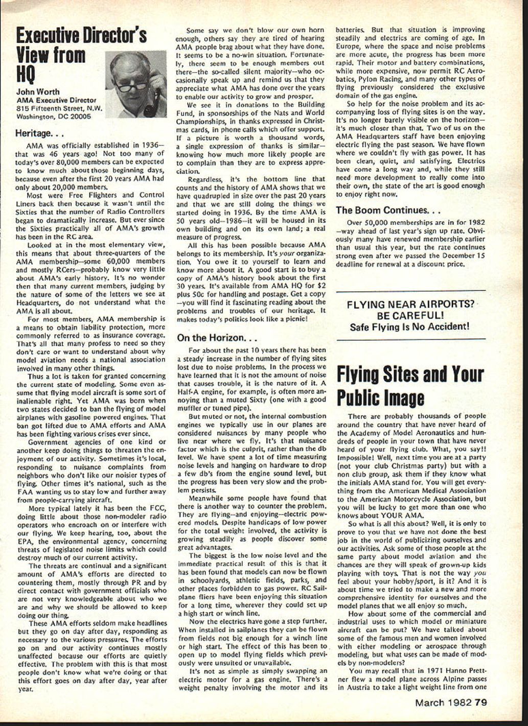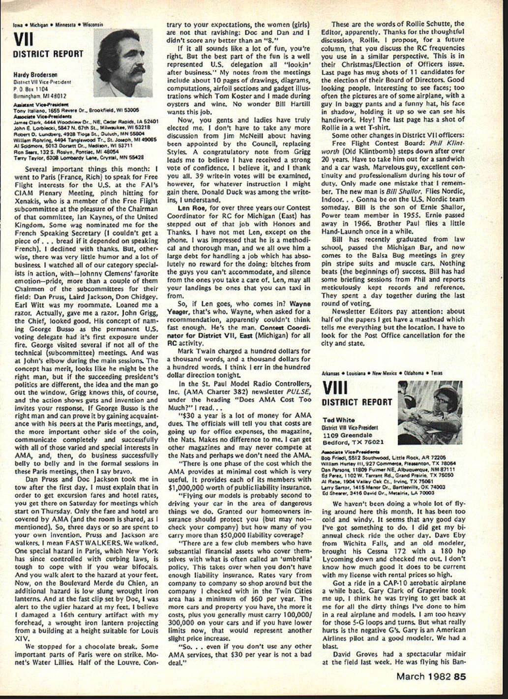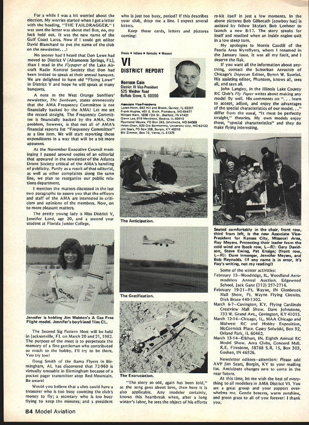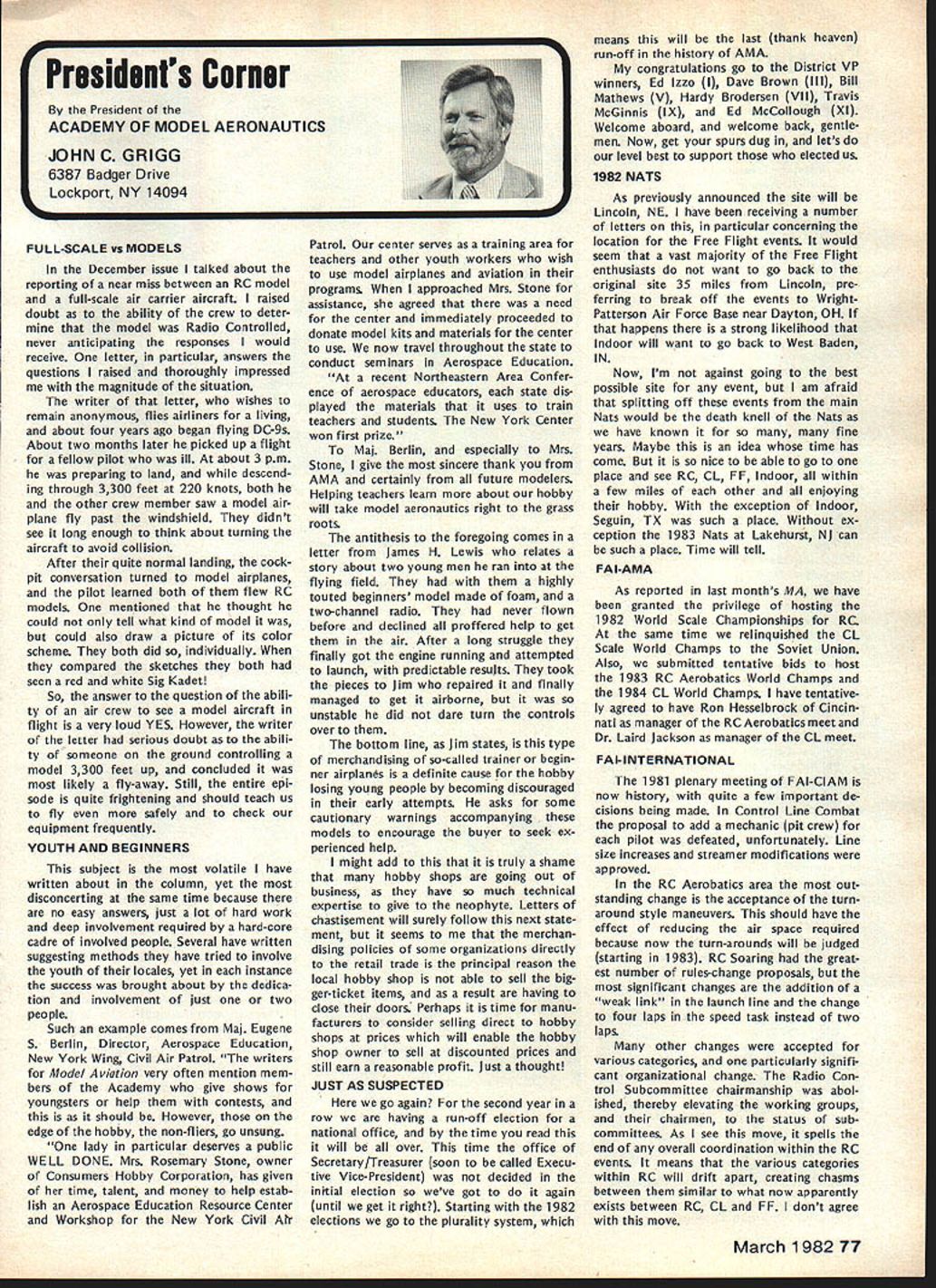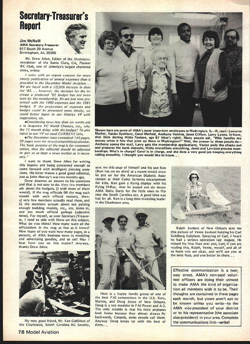 r early spring 1981 general mailing sent AMA chartered clubs mailing announcement AMAs intention being national representative serving fund raising organization 1982 Easter Seal Telethon As kick-off event also announced Trans-Am RC Rally would held purpose publi cizing total fund raising effort 1982 Easter Seal Telethon Campaign Trans-Am Rally now past reality Although great deal funds ac counted during actual event quite evident teams clubs already begun conducting planning conduct own fund raising events held prior 1982 Telethon held March 27-28 California club turned over $500 monies raised raffle sales Las Vegas Trip Drawing same club has set additional goal $3000 themselves fund raising efforts prior telethon AMA has obligation 1982 Easter Seal Telethon has great national level PR opportunity clubs individual members give time money mak ing worthwhile program success Fund Raising Drawing Academy Model Aeronautics promoting Drawing fund raising activity Easter Seal Society asking clubs participate drawing make complete success will helping Easter Seal Society local club can benefit well Prizes Drawing Are First Prize jet fare two Las Vegas four days/three nights Circus/Circus Hotel Casino dinner two Italia midnight show Stardust Hotel Casino Second Prizejet fare two Las Vegas three days/two nights Circus/Circus Hotel Casino luncheon buffet two Gray Line tour Las Vegas Third Prizethree days/two nights Circus/Circus Hotel Casino $200 cash allowance towards trans portation TICKETS WILL SELL FOR $100 DONATION Easter Seals PER TICKET AMA Election Results RUN-OFF VOTE UNDERWAY FOR SECRETARY-TREASURER 1981 election AMA Secretary-Treasurer no candidate received majority least 50% votes run-off revote necessary decide position New ballots therefore have mailed 1981 adult AMA members january25 post mark deadline return meantime election has produced new Vice-Presidents Districts 1 11 Districts 3 5 7 9 incumbents have returned office results re ported Raymond H McGivern certified public accountant shown below Votes Secretary-Treasurer District Cain* Crispin McNeill* Others 123456 4564538261392941156 306347633410273246 78 440326 304290 91011MP**Total 1915222892935404 1835772251964000 50195019 3434 Vice-President Election Results Dist Candidate 1Izzo Smith Others 3Brown Witt Others Votes 626 578 13 1570 724 Dist 5 7 CandidateVotesDist Mathews11099 Others21 Brodersen109711 Others39 *Runoff required **Manually processed Candidate McGinnis Others Votes 566 6 McCollough509 Smith338 Young66 Others2 club sells $100 tickets will receive 10 free tickets $250 tickets will receive 25 free tickets $500 tickets will receive 50 free tickets $1000 tickets will receive 100 free tickets Tickets may ordered mailing accompanying order form AMA HQ tickets will numbered stubbed stub retained donor remaining portion may returned AMA HQ no later March 15 1982 monies unsold tickets must also returned AMA HQ Drawing Las Vegas trip will held March 30 1982 Monies received AMA HQ ticket sales clubs will returned nearest Easter Seal Society office benefit areas funds actually raised Winners drawing will announced March 30 1982 Important some areas raising funds manner prohibited Please check sure permitted area before participate ALSO sure retain accurate records ticket sales including sequence num bers donors names AMA numbers important keep accurate account ing monies collected Easter Seals also very important report AMA HQ details fund raising activities accurate accounting monies raised prior March 15 1982 Mon ies raised reported prior March 15 1982 will part grand total re ported 1982 Easter Seal Telethon working closely local representa tives will also have opportunity report clubs fund raising results 1982 Telethon locally other fund raising activities can generatedmost clubs have part fund raising activities past such raffles static displays malls shopping centers model demonstrations fun flies air shows etc Fund raising ideas limited imaginations some additional ideas 1 club can raise big bucks will road blocks know sounds rinky-dink nothing can make money short amount time road block need buckets people put money Easter Seals pins identify givers available Easter Seal Office members divide up man busiest intersections town Saturday Just ask motorists stop red lights contribute handi capped children making contribution couple signs before intersection identi fying people will helpful local March 198275 AMA HQ Executive Director including reports AMA President Secretary-Treasurer Vice-Presidents L ACADEMY OF MODEL AERONAUTICS 815 Fifteenth Street NW Washington DC 20005 1982 Easter Seal Telethon Fund Raiser Easter Seal office can assist Pizza Hut employees raised $3000 Saturday doing th 2 A garage sale terrific way clean out attic get rid junk make wife happy raise money Easter Seals 3 Canisters placed local businesses hobby shops will raise money us over period time Leave canisters out long can like January 1st March 10th available local Easter Seal offices 4 Do cooperative venture bar Have dart tournament Sunday after noon will cost $5 enter First prize small trophy bottle Bourbon Scotch event has brought $1000 supplemented raffle 5 A check club $25 would welcomed contribution Wont part national effort honey support local bunnylet us hear today Recap 1 Contact local Easter Seal Representative set up initial meeting 2 Decide immediately what going to raise funds 3 Work closely Easter Seal Representative get publicity help put events together 4 File accurate reports AMA HQ can keep national tally able deter club winner 5 Call AMA Special Events Department run snag Easter Seal Representative cannot solve 6 You will successful keep simple communicate local Easter Seal Representative GOOD LUCK Plan Own Rally Trans-Am Rally held October 4th through October clip return AMA HQ immediately - .--.--S-. ORDER FORM FOR LAS VEGAS TRIP DONATION TICKETS CLUB TEAM NAME_________________________ CLUB TEAM NO_________ CLUB PRESIDENT 