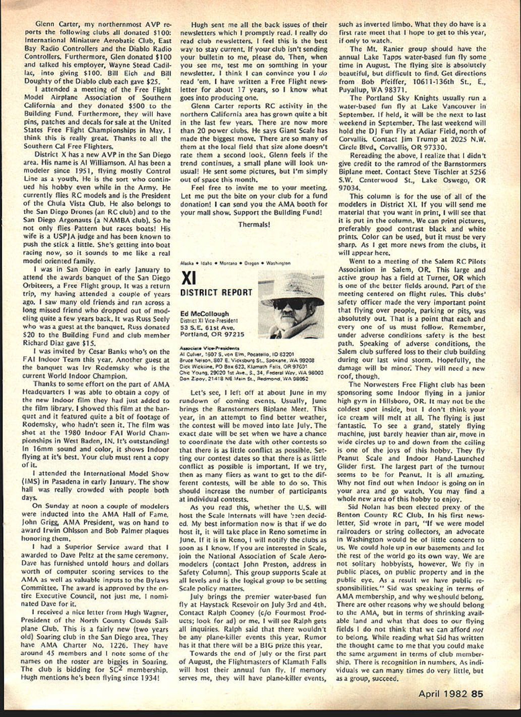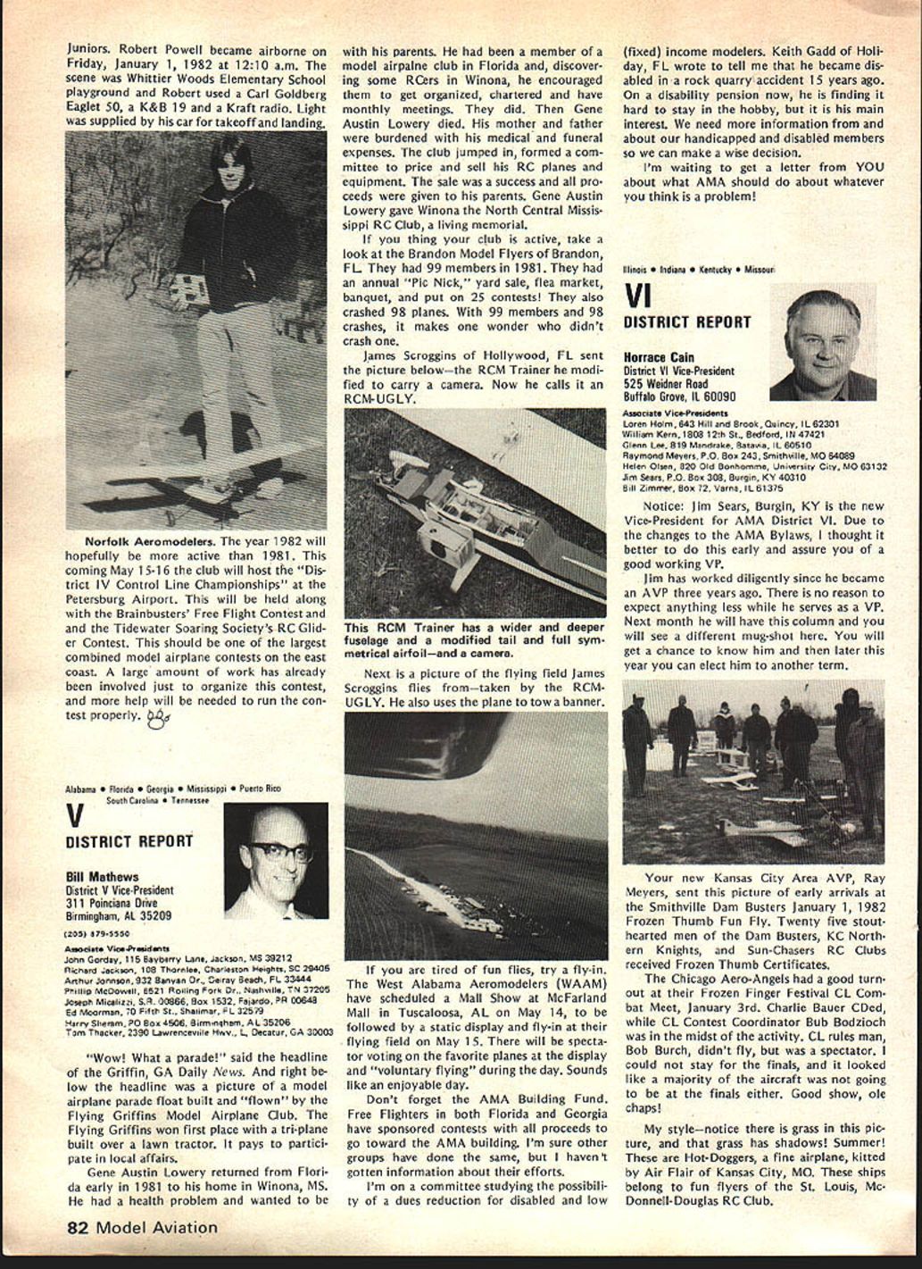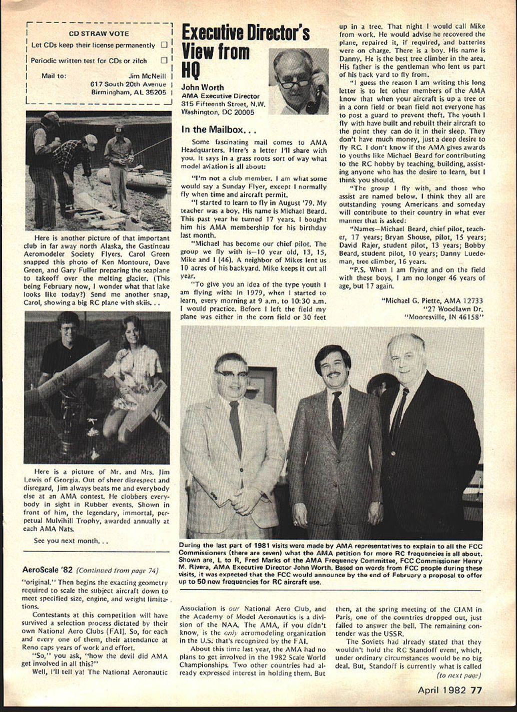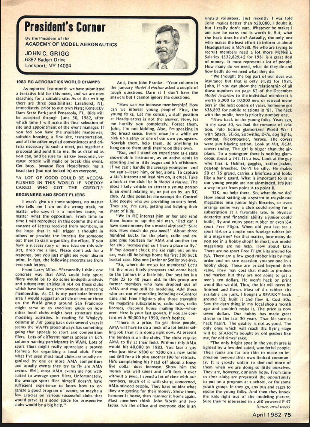 F r L QOrro\ co\e borW p1o1sbWs Best Radio Control Scale Models World Precision Standoff Scale Coming United States 1982 Patty Groves Contest Manager chanceperhaps chance see best world has offer RC Scale happens June Specifically June 1319 1982 Thats date FAI Scale World Championships place Reno NV USA Its opportunity comes just once two years itself makes extraordinary event time its held someplace else world So like Halleys Comet something like just doesnt come around too often Now what is world class competition sanctioned Commission Internationale Aero Modellisme Federation McNsiII Victor Runoff Aeronautique Internationale FAI United States has member since 1905 world body governs aeronautical sporting events Radio Control Scale days can almost compared jubilee days old Cleveland Air Races Technological advances design construction electronics make RC Scale aeromodelings excit ing categories Reno will two classes FAI competition F4C Standoff Class F4C often termed museum true Precision Scale ultimate Scale aeromodeling aircraft miniature detailed replicas man-carrying airplanes exacting reproduction airplane exists now As requested have participated tabulation votes 1981 AMA Runoff Election office National Secretary/Treasurer Academy Model Aeronautics Incorporated connection 13656 Ballots received processing amount 207 rejected reasons stated Exhibit leaving 13449 Ballots eligible tabulation certify tabulation resulted following Office National Secretary/Treasurer Horrace D Cain Jim McNeill Totals Processed Computer 4521 8687 13208 Manually Processed 75 166 241 Very truly yours signed Raymond H McGivern Certified Public Accountant existed some point aviation history judged equal basis duplication structure appearance flight per formance realism model func tioning hand-crafted masterpiece has designed built flown its remote pilot use prefabricated mass-pro duced components discouraged point incentives given originality ingenu ity Following meticulous static examina tion panel five international judges model takes air given three opportunities score best flight per forming both required maneuvers selected pilot best represent subject order account variation complexity subjects bonus factor applied flight score bonus based conditions inherent particular aircraft example models having retract able landing gear twin engines receive 5% flight bonus over singleengine tail-draggers Standoff Scale recent innovation international competition Static judging detailed because judgesliterally stand off model judged dis tance S meters about 16 feet view flight flight program Total however identical F4C Class aircraft 4596 Building time models usually 8853 runs least year addition 13449 time required obtain historical en gineering documentation color data detailed photographs drawings full-sized Con tinoed page 77 74 Model Aviation AMA HQ Executive Director includinq reports AMA President SecretarvTreaSurer Vice-Presidents ACADEMY OF MODEL AERONAUTICS 815 Fifteenth Street NW VVm Id LSPA ii i n h p Washington DC 20005 Presidents Corner President ACADEMY OF MODEL AERONAUTICS JOHN C GRIGG 6387 Badger Drive Lockport NY 14094A 1983 RC AEROBATICS WORLD CHAMPS As reported iast month have submitted tentative bid meet now searching suitable site As writing three possibilities Lakehurst NJ immediately pri6r own Nats Kentucky Dam State Park Pensacola FL Bids will accepted through June 30 1982 after time will make final selection site appointment event manager feel have available manpower suitable housing fine site transportation other myriad conveniences cri teria necessary such meet put together proposal send detailed can sure list key personnel cause people will make break event Get busy because Ron Hesseibrock has head start locked everyone LOT OF GOOD COULD BE ACCOM PLISHED IN THIS WORLD IF NOBODY CARED WHO GOT THE CREDIT BEGINNERS AND SPORT FLIERS wont give up subjects no matter tells am wrong track no matter says hopeless cause no matter what opposition time time will reproduce column main content letters received members hope will trigger thought others provide impetus someone out start organizing effort have success story new idea sub ject drop line Please dont ask response just might see idea print fact following excerpts two such letters Larry MilesPersonally think concrete way AMA could help sport fliers would some in-depth analysis subsequent articles MA clubs have long term success attracting mmbership As CL particular interest area would suggest article two three WAM group around San Francisco might serve excellent guide other local clubs might best structure modeling activities reading Ed Whaleys column FM going back over several years seems WAMs group always has something going appeals sport competition fliers Lots different names appear Eds column naming participants WAM Lots sport fliers might really appreciate proven formula organizing local club what Ive seen local clubs usually ganized AMA competitors usually events try fly AMA events Well AMA events wellsuited average sport fliers Unfortunately average sport flier himself doesnt have sufficient experience know ganize good program events maybe few articles various successful clubs would serve good guide prospective clubs would big help John FrankeYour column January Model Aviation asked couple tough questions Darn dont have answers cannot ignore questions can increase membership can interest young people First young folks Let concur staff position Headquarters answer Now let horrify completely Forget John Im kidding Also Im speaking broad sense once pick up stray own youngsters Nourish help anything hang until theyre own stand experience asa state snowmobile instructor active adult scouting little league its offshoots cant handle average youngsterand cantleave him alone capture kids interest lead him cruel Take look club list Model Aviation likely vehicle attract young person event relating put RC club point let exempt Control Line people