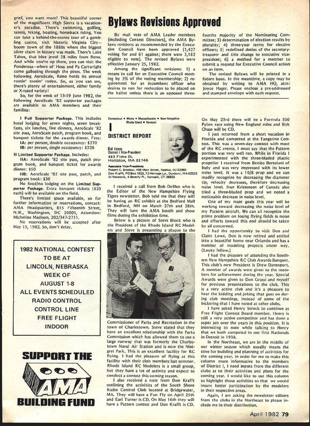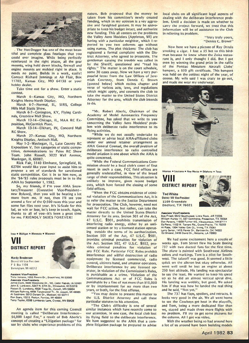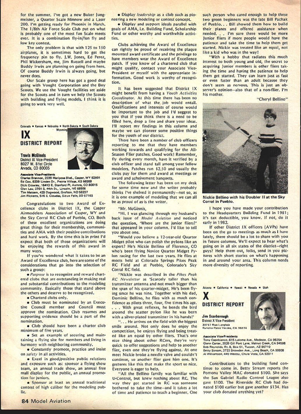 F r L QOrro\ co\e borW p1o1sbWs Best Radio Control Scale Models World Precision Standoff Scale Coming United States 1982 Patty Groves Contest Manager chanceperhaps chance see best world has offer RC Scale happens June Specifically June 1319 1982 Thats date FAI Scale World Championships place Reno NV USA Its opportunity comes just once two years itself makes extraordinary event time its held someplace else world So like Halleys Comet something like just doesnt come around too often Now what is world class competition sanctioned Commission Internationale Aero Modellisme Federation McNsiII Victor Runoff Aeronautique Internationale FAI United States has member since 1905 world body governs aeronautical sporting events Radio Control Scale days can almost compared jubilee days old Cleveland Air Races Technological advances design construction electronics make RC Scale aeromodelings excit ing categories Reno will two classes FAI competition F4C Standoff Class F4C often termed museum true Precision Scale ultimate Scale aeromodeling aircraft miniature detailed replicas man-carrying airplanes exacting reproduction airplane exists now As requested have participated tabulation votes 1981 AMA Runoff Election office National Secretary/Treasurer Academy Model Aeronautics Incorporated connection 13656 Ballots received processing amount 207 rejected reasons stated Exhibit leaving 13449 Ballots eligible tabulation certify tabulation resulted following Office National Secretary/Treasurer Horrace D Cain Jim McNeill Totals Processed Computer 4521 8687 13208 Manually Processed 75 166 241 Very truly yours signed Raymond H McGivern Certified Public Accountant existed some point aviation history judged equal basis duplication structure appearance flight per formance realism model func tioning hand-crafted masterpiece has designed built flown its remote pilot use prefabricated mass-pro duced components discouraged point incentives given originality ingenu ity Following meticulous static examina tion panel five international judges model takes air given three opportunities score best flight per forming both required maneuvers selected pilot best represent subject order account variation complexity subjects bonus factor applied flight score bonus based conditions inherent particular aircraft example models having retract able landing gear twin engines receive 5% flight bonus over singleengine tail-draggers Standoff Scale recent innovation international competition Static judging detailed because judgesliterally stand off model judged dis tance S meters about 16 feet view flight flight program Total however identical F4C Class aircraft 4596 Building time models usually 8853 runs least year addition 13449 time required obtain historical en gineering documentation color data detailed photographs drawings full-sized Con tinoed page 77 74 Model Aviation AMA HQ Executive Director includinq reports AMA President SecretarvTreaSurer Vice-Presidents ACADEMY OF MODEL AERONAUTICS 815 Fifteenth Street NW VVm Id LSPA ii i n h p Washington DC 20005 Presidents Corner President ACADEMY OF MODEL AERONAUTICS JOHN C GRIGG 6387 Badger Drive Lockport NY 14094A 1983 RC AEROBATICS WORLD CHAMPS As reported iast month have submitted tentative bid meet now searching suitable site As writing three possibilities Lakehurst NJ immediately pri6r own Nats Kentucky Dam State Park Pensacola FL Bids will accepted through June 30 1982 after time will make final selection site appointment event manager feel have available manpower suitable housing fine site transportation other myriad conveniences cri teria necessary such meet put together proposal send detailed can sure list key personnel cause people will make break event Get busy because Ron Hesseibrock has head start locked everyone LOT OF GOOD COULD BE ACCOM PLISHED IN THIS WORLD IF NOBODY CARED WHO GOT THE CREDIT BEGINNERS AND SPORT FLIERS wont give up subjects no matter tells am wrong track no matter says hopeless cause no matter what opposition time time will reproduce column main content letters received members hope will trigger thought others provide impetus someone out start organizing effort have success story new idea sub ject drop line Please dont ask response just might see idea print fact following excerpts two such letters Larry MilesPersonally think concrete way AMA could help sport fliers would some in-depth analysis subsequent articles MA clubs have long term success attracting mmbership As CL particular interest area would suggest article two three WAM group around San Francisco might serve excellent guide other local clubs might best structure modeling activities reading Ed Whaleys column FM going back over several years seems WAMs group always has something going appeals sport competition fliers Lots different names appear Eds column naming participants WAM Lots sport fliers might really appreciate proven formula organizing local club what Ive seen local clubs usually ganized AMA competitors usually events try fly AMA events Well AMA events wellsuited average sport fliers Unfortunately average sport flier himself doesnt have sufficient experience know ganize good program events maybe few articles various successful clubs would serve good guide prospective clubs would big help John FrankeYour column January Model Aviation asked couple tough questions Darn dont have answers cannot ignore questions can increase membership can interest young people First young folks Let concur staff position Headquarters answer Now let horrify completely Forget John Im kidding Also Im speaking broad sense once pick up stray own youngsters Nourish help anything hang until theyre own stand experience asa state snowmobile instructor active adult scouting little league its offshoots cant handle average youngsterand cantleave him alone capture kids interest lead him cruel Take look club list Model Aviation likely vehicle attract young person event relating put RC club point let exempt Control Line people