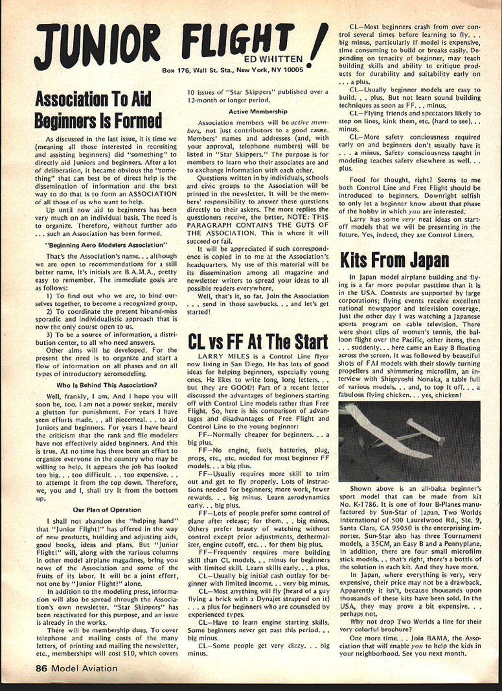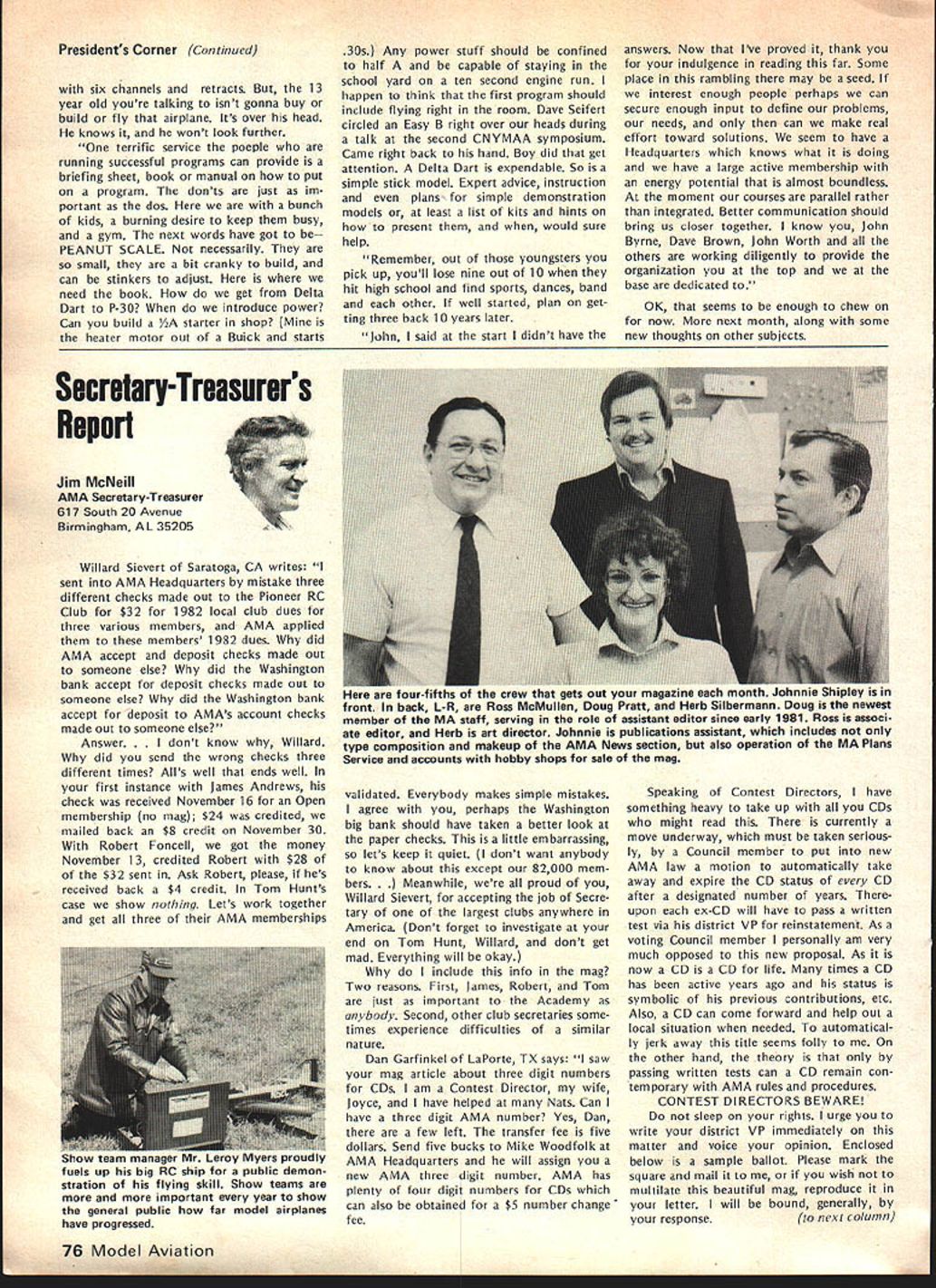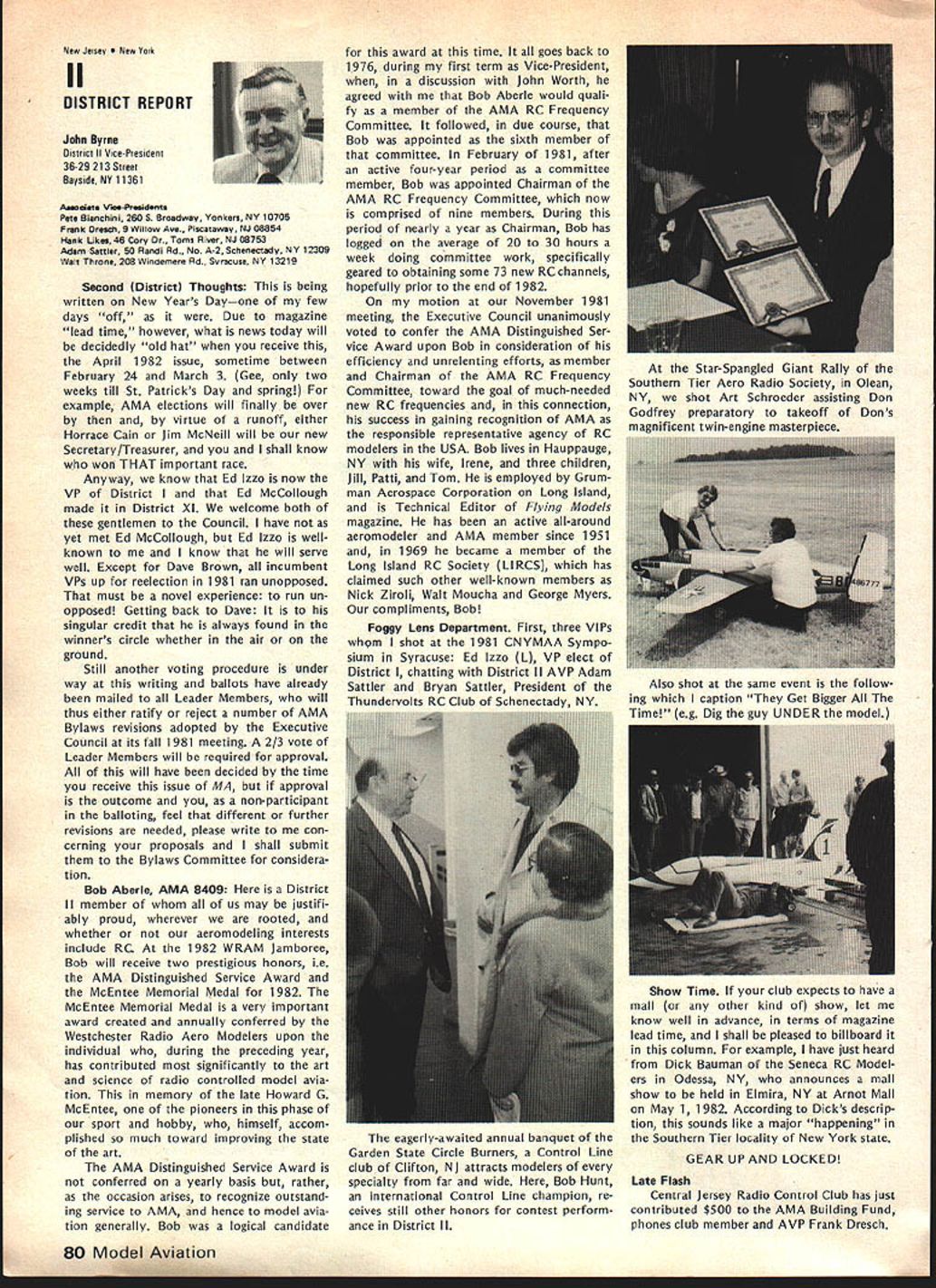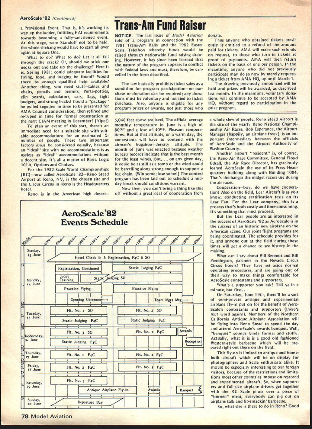 F r L QOrro\ co\e borW p1o1sbWs Best Radio Control Scale Models World Precision Standoff Scale Coming United States 1982 Patty Groves Contest Manager chanceperhaps chance see best world has offer RC Scale happens June Specifically June 1319 1982 Thats date FAI Scale World Championships place Reno NV USA Its opportunity comes just once two years itself makes extraordinary event time its held someplace else world So like Halleys Comet something like just doesnt come around too often Now what is world class competition sanctioned Commission Internationale Aero Modellisme Federation McNsiII Victor Runoff Aeronautique Internationale FAI United States has member since 1905 world body governs aeronautical sporting events Radio Control Scale days can almost compared jubilee days old Cleveland Air Races Technological advances design construction electronics make RC Scale aeromodelings excit ing categories Reno will two classes FAI competition F4C Standoff Class F4C often termed museum true Precision Scale ultimate Scale aeromodeling aircraft miniature detailed replicas man-carrying airplanes exacting reproduction airplane exists now As requested have participated tabulation votes 1981 AMA Runoff Election office National Secretary/Treasurer Academy Model Aeronautics Incorporated connection 13656 Ballots received processing amount 207 rejected reasons stated Exhibit leaving 13449 Ballots eligible tabulation certify tabulation resulted following Office National Secretary/Treasurer Horrace D Cain Jim McNeill Totals Processed Computer 4521 8687 13208 Manually Processed 75 166 241 Very truly yours signed Raymond H McGivern Certified Public Accountant existed some point aviation history judged equal basis duplication structure appearance flight per formance realism model func tioning hand-crafted masterpiece has designed built flown its remote pilot use prefabricated mass-pro duced components discouraged point incentives given originality ingenu ity Following meticulous static examina tion panel five international judges model takes air given three opportunities score best flight per forming both required maneuvers selected pilot best represent subject order account variation complexity subjects bonus factor applied flight score bonus based conditions inherent particular aircraft example models having retract able landing gear twin engines receive 5% flight bonus over singleengine tail-draggers Standoff Scale recent innovation international competition Static judging detailed because judgesliterally stand off model judged dis tance S meters about 16 feet view flight flight program Total however identical F4C Class aircraft 4596 Building time models usually 8853 runs least year addition 13449 time required obtain historical en gineering documentation color data detailed photographs drawings full-sized Con tinoed page 77 74 Model Aviation AMA HQ Executive Director includinq reports AMA President SecretarvTreaSurer Vice-Presidents ACADEMY OF MODEL AERONAUTICS 815 Fifteenth Street NW VVm Id LSPA ii i n h p Washington DC 20005 Presidents Corner President ACADEMY OF MODEL AERONAUTICS JOHN C GRIGG 6387 Badger Drive Lockport NY 14094A 1983 RC AEROBATICS WORLD CHAMPS As reported iast month have submitted tentative bid meet now searching suitable site As writing three possibilities Lakehurst NJ immediately pri6r own Nats Kentucky Dam State Park Pensacola FL Bids will accepted through June 30 1982 after time will make final selection site appointment event manager feel have available manpower suitable housing fine site transportation other myriad conveniences cri teria necessary such meet put together proposal send detailed can sure list key personnel cause people will make break event Get busy because Ron Hesseibrock has head start locked everyone LOT OF GOOD COULD BE ACCOM PLISHED IN THIS WORLD IF NOBODY CARED WHO GOT THE CREDIT BEGINNERS AND SPORT FLIERS wont give up subjects no matter tells am wrong track no matter says hopeless cause no matter what opposition time time will reproduce column main content letters received members hope will trigger thought others provide impetus someone out start organizing effort have success story new idea sub ject drop line Please dont ask response just might see idea print fact following excerpts two such letters Larry MilesPersonally think concrete way AMA could help sport fliers would some in-depth analysis subsequent articles MA clubs have long term success attracting mmbership As CL particular interest area would suggest article two three WAM group around San Francisco might serve excellent guide other local clubs might best structure modeling activities reading Ed Whaleys column FM going back over several years seems WAMs group always has something going appeals sport competition fliers Lots different names appear Eds column naming participants WAM Lots sport fliers might really appreciate proven formula organizing local club what Ive seen local clubs usually ganized AMA competitors usually events try fly AMA events Well AMA events wellsuited average sport fliers Unfortunately average sport flier himself doesnt have sufficient experience know ganize good program events maybe few articles various successful clubs would serve good guide prospective clubs would big help John FrankeYour column January Model Aviation asked couple tough questions Darn dont have answers cannot ignore questions can increase membership can interest young people First young folks Let concur staff position Headquarters answer Now let horrify completely Forget John Im kidding Also Im speaking broad sense once pick up stray own youngsters Nourish help anything hang until theyre own stand experience asa state snowmobile instructor active adult scouting little league its offshoots cant handle average youngsterand cantleave him alone capture kids interest lead him cruel Take look club list Model Aviation likely vehicle attract young person event relating put RC club point let exempt Control Line people
