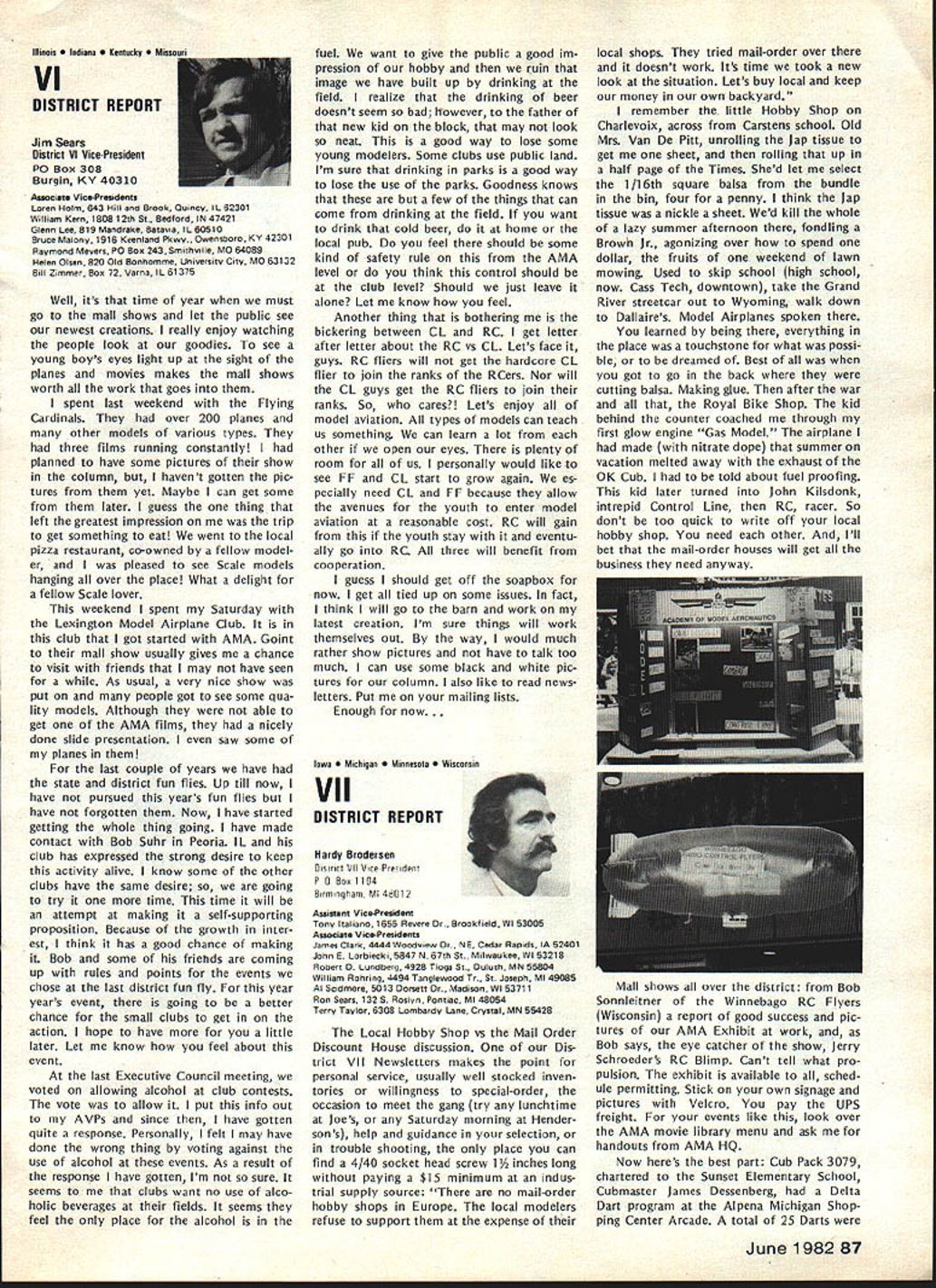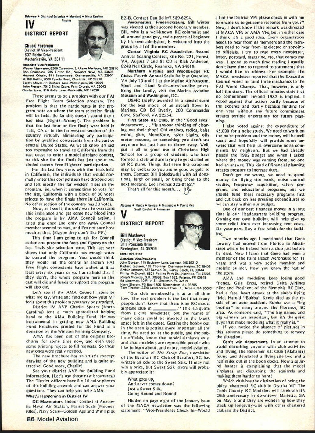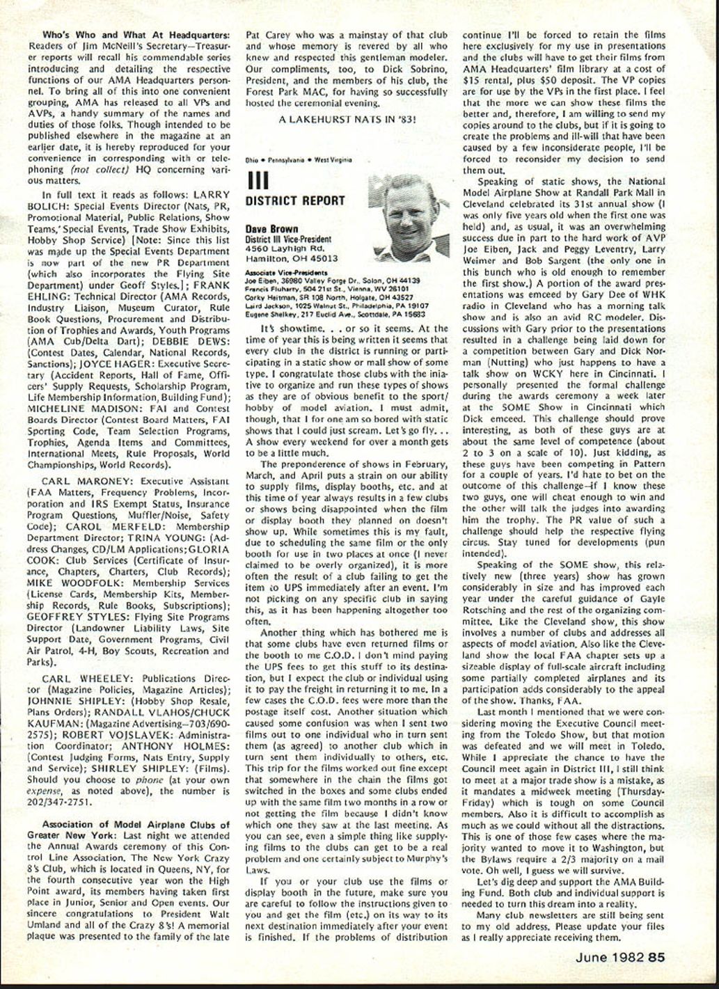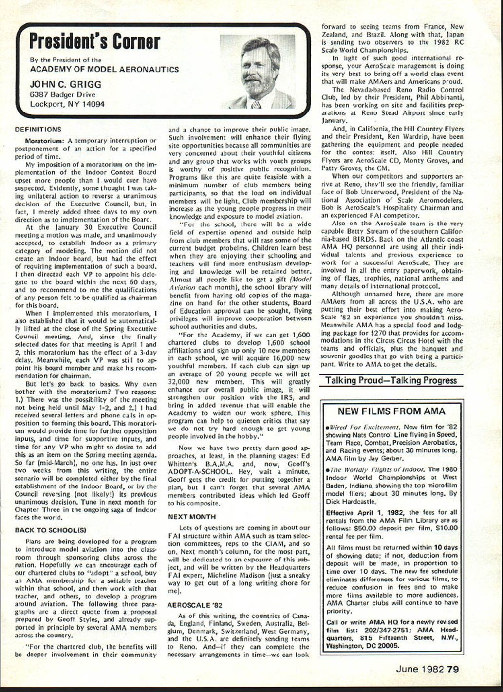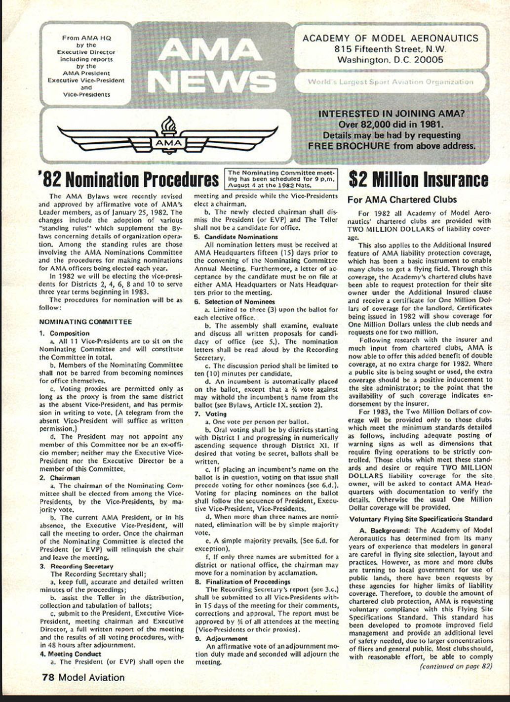 From AMA HQ bY Executive Director including reports AMA President Executive Vice-President Vice-Presidents Nominating Committee meet 82 Nomination Procedure August 4 1982 Nats $2FI Sing has scheduled 9 pm _______________illion Insurance AMA Bylaws recently revised approved affirmative vote AMAs Leader members January 25 1982 changes include adoption various standing rules supplement laws concerning details organization opera tion Among standing rules involving AMA Nominations Committee procedures making nominations AMA officers being elected year 1982 will electing vice-presi dents Districts 2 4 6 8 10 serve three year terms beginning 1983 procedures nomination will follow NOMINATING COMMITTEE 1 Composition a All 11 Vice-Presidents sit Nominating Committee will constitute Committee total b Members Nominating Committee shall barred becoming nominees office themselves c Voting proxies permitted long proxy same district absent Vice-President has permis sion writing vote telegram absent Vice-President will suffice written permission d The President may appoint member Committee nor ex-offi cio member neither may Executive VicePresident nor Executive Director member Committee 2 Chairman a The chairman Nominating Com mittee shall elected among VicePresidents Vice-Presidents ma jority vote b The current AMA President absence Executive Vice-President will call meeting order Once chairman Nominating Committee elected President EVP will relinquish chair leave meeting 3 Recording Secretary Recording Secretary shall a keep full accurate detailed written minutes proceedings b assist Teller distribution collection tabulation ballots c submit President Executive VicePresident meeting chairman Executive Director full written report meeting results voting procedures 48 hours after adjournment 4 Meeting Conduct a The President EVP shall open meeting preside Vice-Presidents elect chairman b The newly elected chairman shall dis miss President EVP Teller shall candidate office 5 Candidate Nominations nomination letters must received AMA Headquarters fifteen 15 days prior convening Nominating Committee Annual Meeting Furthermore letter ac ceptance candidate must file either AMA Headquarters Nats Headquar ters prior meeting 6 Selection Nominees a Limited three 3 upon ballot elective office b The assembly shall examine evaluate discuss written proposals candi dacy office see 5 nomination letters shall read aloud Recording Secretary c The discussion period shall limited ten 10 minutes per candidate d An incumbent automatically placed ballot except 34 vote against may withold incumbents name ballot see Bylaws Article IX section 2 7 Voting a One vote per person per ballot b Oral voting shall districts starting District progressing numerically ascending sequence through District Xl desired voting secret ballots shall written c If placing incumbents name ballot question voting issue shall precede voting other nominees see 6d Voting placing nominees ballot shall follow sequence President Execu tive Vice-President Vice-Presidents d When three names nomi nated elimination will simple majority vote e A simple majority prevails See 6d exception f If three names submitted district national office chairman may move nomination acclamation 8 Finalization Proceedings Recording Secretarys report see 3c shall submitted Vice-Presidents 15 days meeting comments corrections approval report must approved 34 attendees meeting Vice-Presidents proxies 9 Adjournment An affirmative vote adjournment mo tion duly made seconded will adjourn meeting AMA Chartered Clubs 1982 Academy Model Aero nautics chartered clubs provided TWO MILLION DOLLARS liability cover age also applies Additional Insured feature AMA liability protection coverage has basic instrument enable clubs get flying field Through coverage Academys chartered clubs have able request protection site owner under Additional Insured clause receive certificate Million Dol lars coverage landlord Certificates being issued 1982 will show coverage Million Dollars unless club needs requests two million Following research insurer much input chartered clubs AMA now able offer added benefit double coverage no extra charge 1982 public site being sought used extra coverage should positive inducement site administrator point availability such coverage indicates en dorsement insurer 1983 Two Million Dollars cov erage will provided clubs meet minimum standards detailed follows including adequate posting warning signs well dimensions require flying operations strictly con trolled clubs meet stand ards desire require TWO MILLION DOLLARS liability coverage site owner will asked contact AMA Head quarters documentation verify details Otherwise usual Million Dollar coverage will provided Voluntary Flying Site Specifications Standard A Background Academy Model Aeronautics has determined its years experience modelers general careful flying site selection layout practices However more clubs turning local government use public lands have requests agencies higher limits liability coverage Therefore double amount chartered club protection AMA requesting voluntary compliance Flying Site Specifications Standard standard has developed promote improved field management provide additional level safety needed due larger concentrations fliers general public Most clubs should reasonable effort able comply continued page 82 78 Model Aviation Presidents Corner President ACADEMY OF MODEL AERONAUTICS JOHN C GRIGG 6387 Badger Drive Lockport NY 14094 DEFINITIONS Moratorium A temporary interruption postponement action specified period time imposition moratorium im plementation Indoor Contest Board upset people would ever have suspected Evidently some thought tak ing unilateral action reverse unanimous decision Executive Council fact merely added three days own direction implementation Board January 30 Executive Council meeting motion made unanimously accepted establish Indoor primary category modeling motion did create Ind