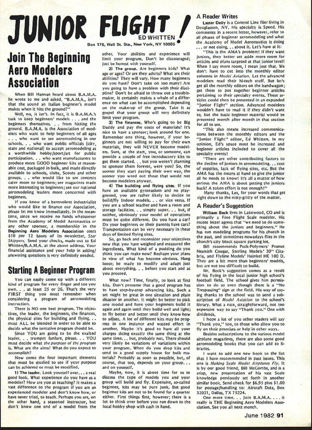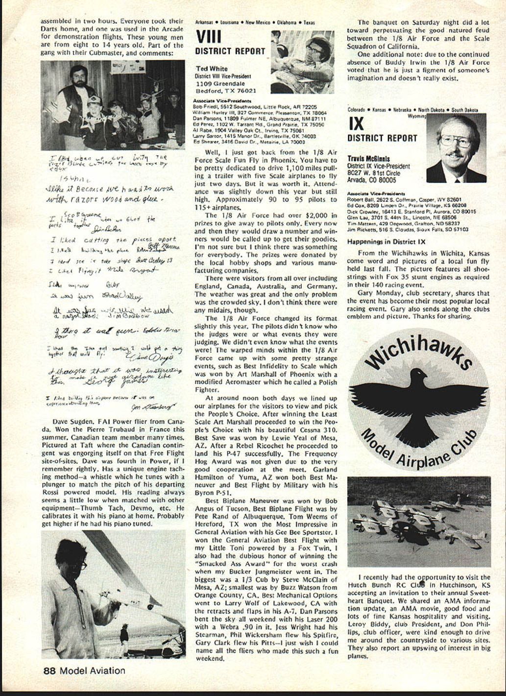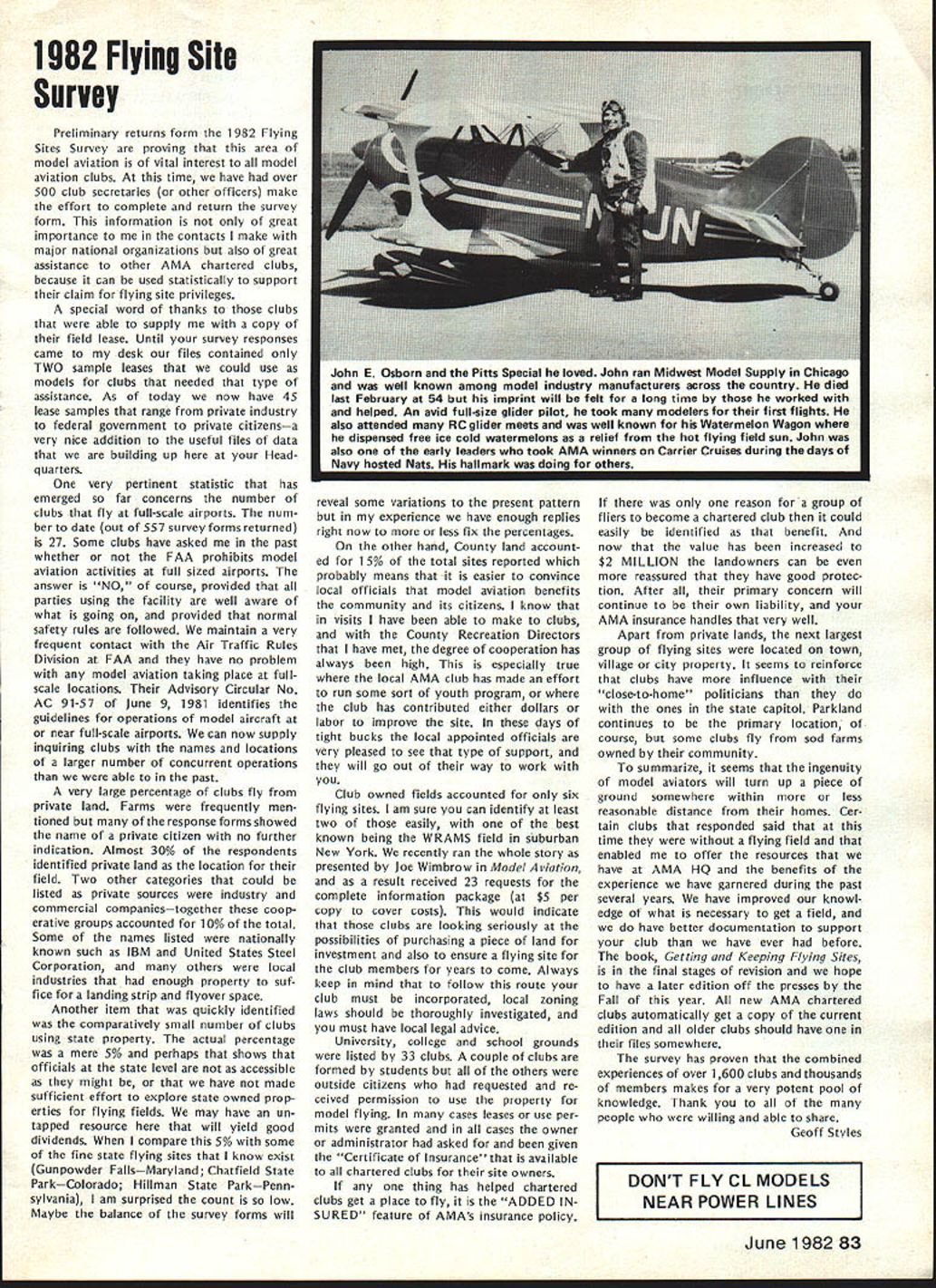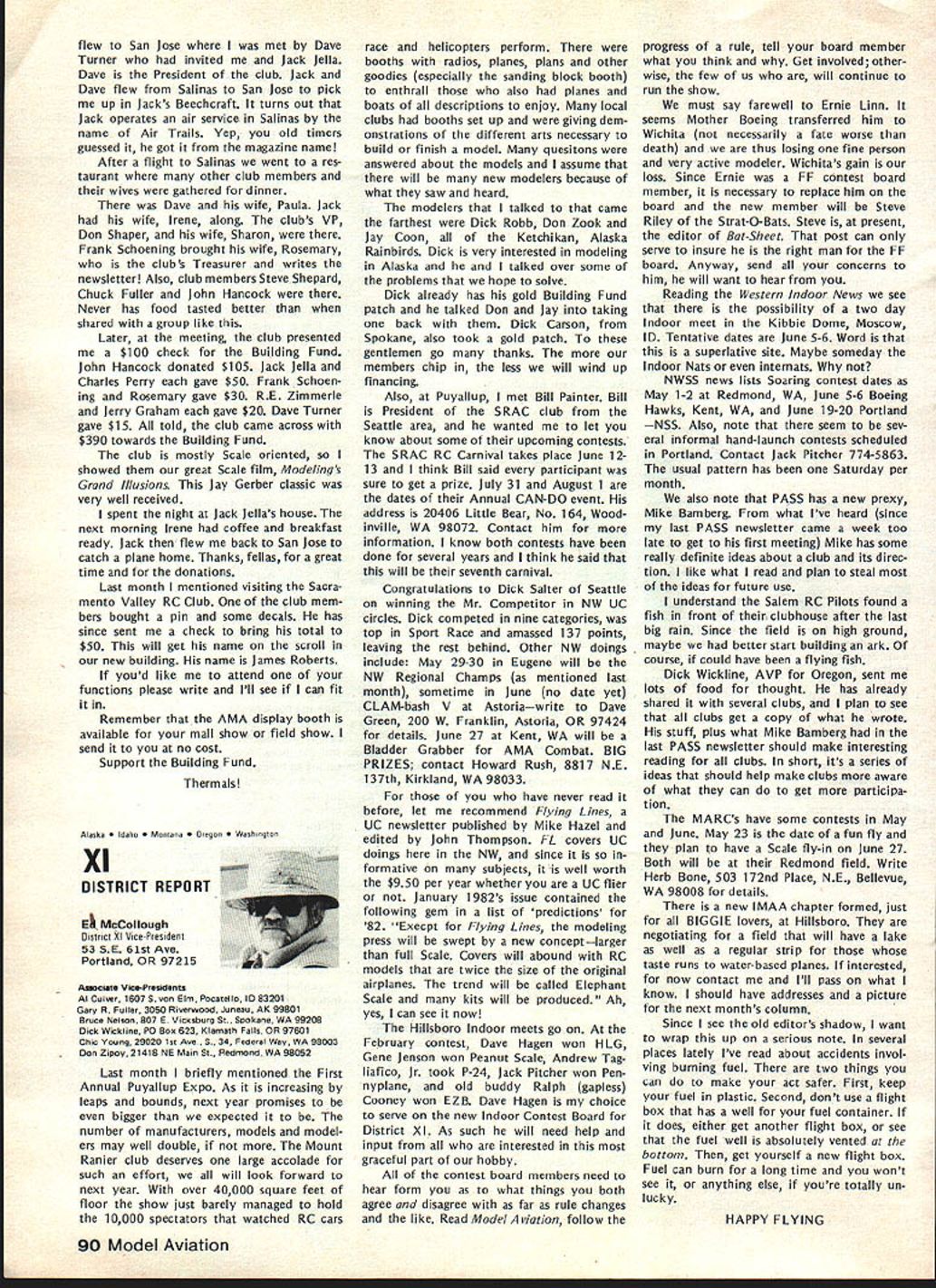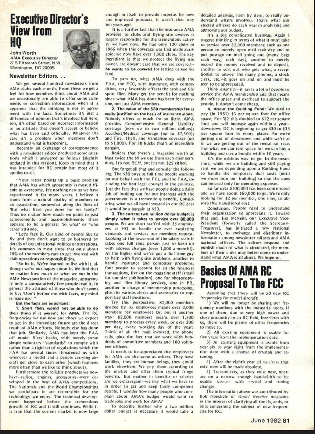 From AMA HQ bY Executive Director including reports AMA President Executive Vice-President Vice-Presidents Nominating Committee meet 82 Nomination Procedure August 4 1982 Nats $2FI Sing has scheduled 9 pm _______________illion Insurance AMA Bylaws recently revised approved affirmative vote AMAs Leader members January 25 1982 changes include adoption various standing rules supplement laws concerning details organization opera tion Among standing rules involving AMA Nominations Committee procedures making nominations AMA officers being elected year 1982 will electing vice-presi dents Districts 2 4 6 8 10 serve three year terms beginning 1983 procedures nomination will follow NOMINATING COMMITTEE 1 Composition a All 11 Vice-Presidents sit Nominating Committee will constitute Committee total b Members Nominating Committee shall barred becoming nominees office themselves c Voting proxies permitted long proxy same district absent Vice-President has permis sion writing vote telegram absent Vice-President will suffice written permission d The President may appoint member Committee nor ex-offi cio member neither may Executive VicePresident nor Executive Director member Committee 2 Chairman a The chairman Nominating Com mittee shall elected among VicePresidents Vice-Presidents ma jority vote b The current AMA President absence Executive Vice-President will call meeting order Once chairman Nominating Committee elected President EVP will relinquish chair leave meeting 3 Recording Secretary Recording Secretary shall a keep full accurate detailed written minutes proceedings b assist Teller distribution collection tabulation ballots c submit President Executive VicePresident meeting chairman Executive Director full written report meeting results voting procedures 48 hours after adjournment 4 Meeting Conduct a The President EVP shall open meeting preside Vice-Presidents elect chairman b The newly elected chairman shall dis miss President EVP Teller shall candidate office 5 Candidate Nominations nomination letters must received AMA Headquarters fifteen 15 days prior convening Nominating Committee Annual Meeting Furthermore letter ac ceptance candidate must file either AMA Headquarters Nats Headquar ters prior meeting 6 Selection Nominees a Limited three 3 upon ballot elective office b The assembly shall examine evaluate discuss written proposals candi dacy office see 5 nomination letters shall read aloud Recording Secretary c The discussion period shall limited ten 10 minutes per candidate d An incumbent automatically placed ballot except 34 vote against may withold incumbents name ballot see Bylaws Article IX section 2 7 Voting a One vote per person per ballot b Oral voting shall districts starting District progressing numerically ascending sequence through District Xl desired voting secret ballots shall written c If placing incumbents name ballot question voting issue shall precede voting other nominees see 6d Voting placing nominees ballot shall follow sequence President Execu tive Vice-President Vice-Presidents d When three names nomi nated elimination will simple majority vote e A simple majority prevails See 6d exception f If three names submitted district national office chairman may move nomination acclamation 8 Finalization Proceedings Recording Secretarys report see 3c shall submitted Vice-Presidents 15 days meeting comments corrections approval report must approved 34 attendees meeting Vice-Presidents proxies 9 Adjournment An affirmative vote adjournment mo tion duly made seconded will adjourn meeting AMA Chartered Clubs 1982 Academy Model Aero nautics chartered clubs provided TWO MILLION DOLLARS liability cover age also applies Additional Insured feature AMA liability protection coverage has basic instrument enable clubs get flying field Through coverage Academys chartered clubs have able request protection site owner under Additional Insured clause receive certificate Million Dol lars coverage landlord Certificates being issued 1982 will show coverage Million Dollars unless club needs requests two million Following research insurer much input chartered clubs AMA now able offer added benefit double coverage no extra charge 1982 public site being sought used extra coverage should positive inducement site administrator point availability such coverage indicates en dorsement insurer 1983 Two Million Dollars cov erage will provided clubs meet minimum standards detailed follows including adequate posting warning signs well dimensions require flying operations strictly con trolled clubs meet stand ards desire require TWO MILLION DOLLARS liability coverage site owner will asked contact AMA Head quarters documentation verify details Otherwise usual Million Dollar coverage will provided Voluntary Flying Site Specifications Standard A Background Academy Model Aeronautics has determined its years experience modelers general careful flying site selection layout practices However more clubs turning local government use public lands have requests agencies higher limits liability coverage Therefore double amount chartered club protection AMA requesting voluntary compliance Flying Site Specifications Standard standard has developed promote improved field management provide additional level safety needed due larger concentrations fliers general public Most clubs should reasonable effort able comply continued page 82 78 Model Aviation Presidents Corner President ACADEMY OF MODEL AERONAUTICS JOHN C GRIGG 6387 Badger Drive Lockport NY 14094 DEFINITIONS Moratorium A temporary interruption postponement action specified period time imposition moratorium im plementation Indoor Contest Board upset people would ever have suspected Evidently some thought tak ing unilateral action reverse unanimous decision Executive Council fact merely added three days own direction implementation Board January 30 Executive Council meeting motion made unanimously accepted establish Indoor primary category modeling motion did create Ind
