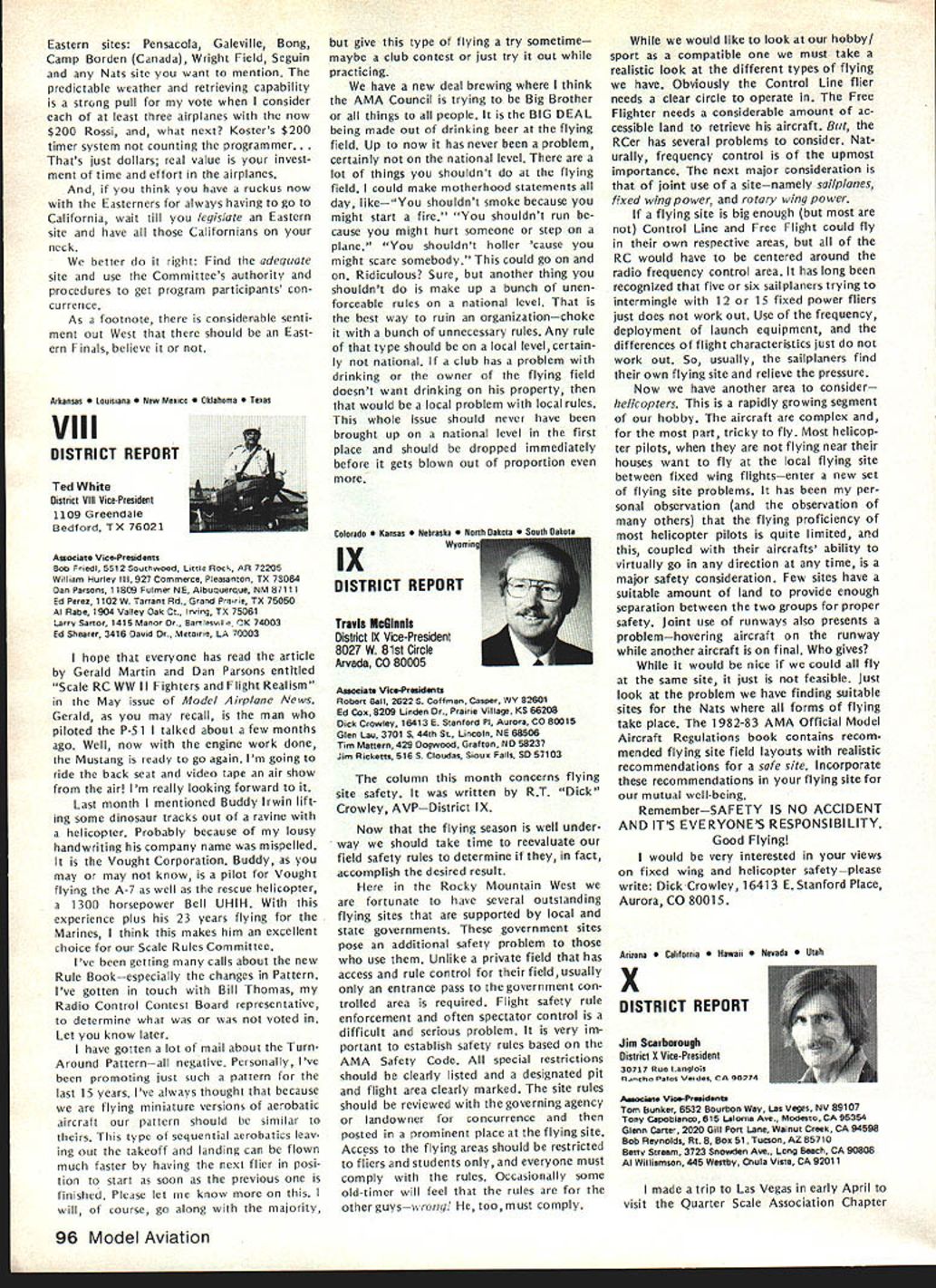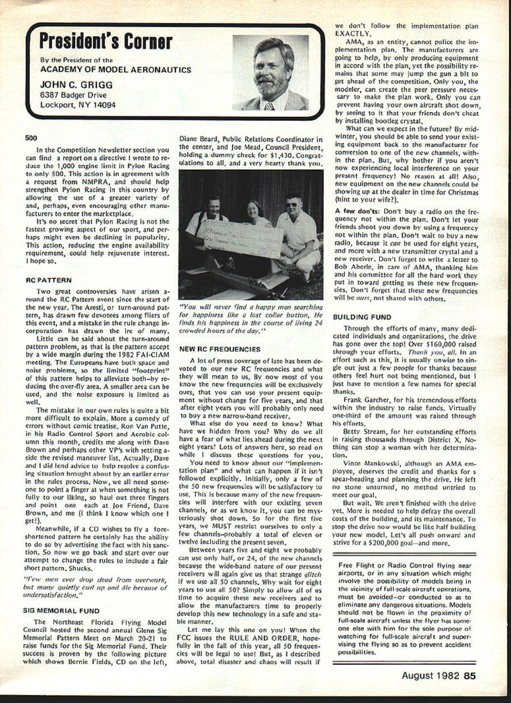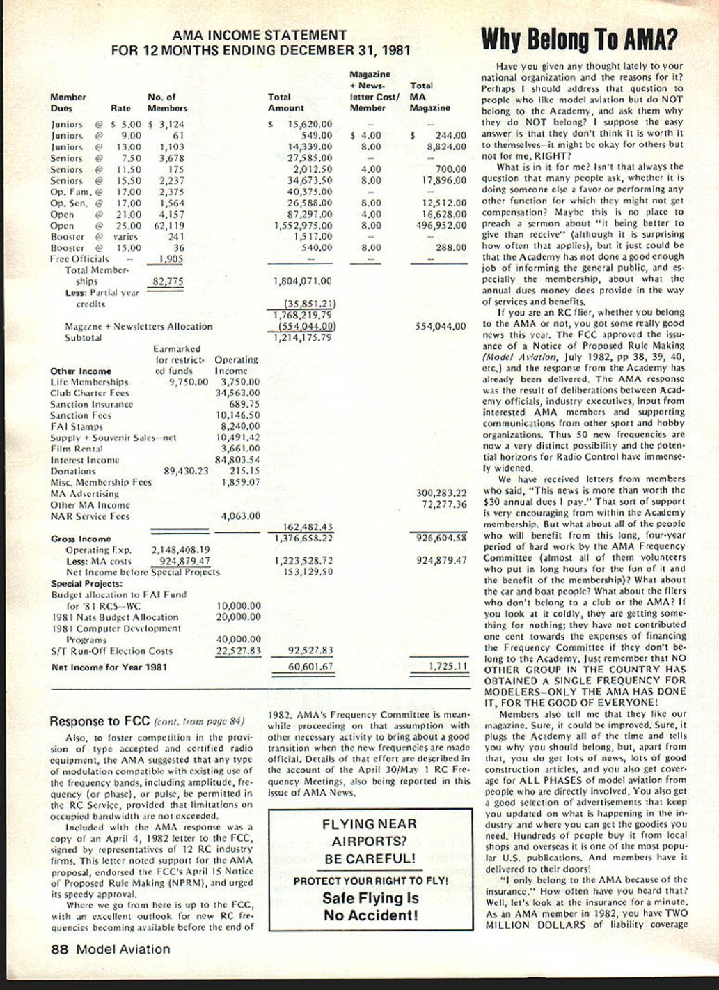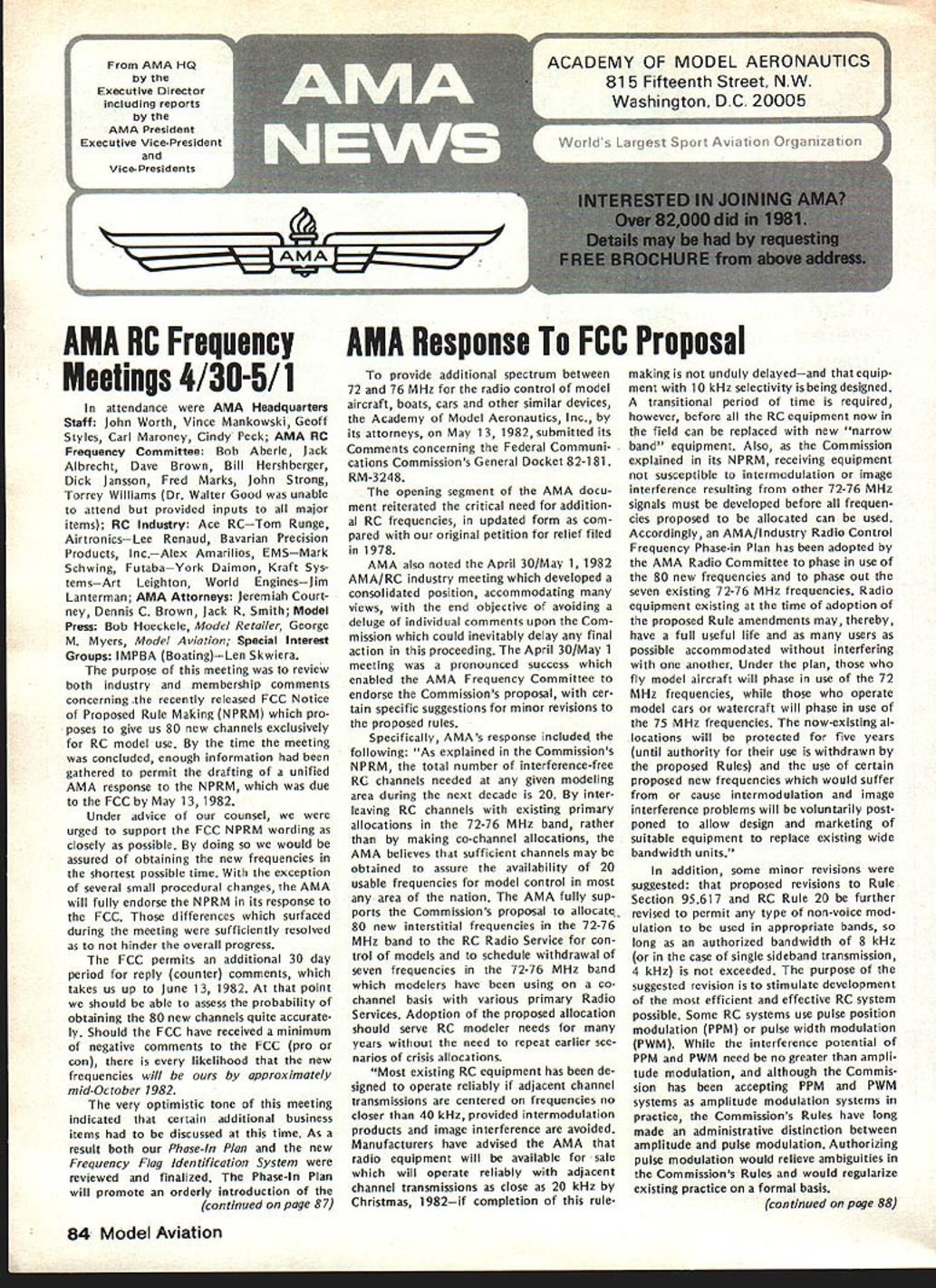 I AMA NC Frequency Meetings I3O-5/ 1 attendance AMA Headquarters Staff John Worth Vince Mankowski Geoff Styles Carl Maroney Cindy Peck AMA RC Frequency Committee Bob Aberle Jack Albrecht Dave Brown Bill Hershberger Dick Jansson Fred Marks John Strong Torrey Williams Dr Walter Good unable attend provided inputs major items RC Industry Ace RCTom Runge Airtronics Lee Renaud Bavarian Precision Products IncAlex Amarilios EMSMark Schwing FutabaYork Daimon Kraft Sys temsArt Leighton World EnginesJim Lanterman AMA Attorneys Jeremiah Court ney Dennis C Brown Jack R Smith Model Press Bob Hoeckele Model Retailer George M Myers Model Aviation Special Interest Groups IM PBA Boating Len Skwiera purpose meeting review both industry membership comments concerning recently released FCC Notice Proposed Rule Making NPRM pro poses give us 80 new channels exclusively RC model use time meeting concluded enough information gathered permit drafting unified AMA response NPRM due FCC May 131982 Under advice counsel urged support FCC NPRM wording closely possible doing would assured obtaining new frequencies shortest possible time exception several small procedural changes AMA will fully endorse NPRM its response FCC differences surfaced during meeting sufficiently resolved hinder overall progress FCC permits additional 30 day period reply counter comments takes us up June 13 1982 point should able assess probability obtaining 80 new channels quite accurate ly Should FCC have received minimum negative comments FCC pro con likelihood new frequencies will approximately mid-October 1982 very optimistic tone meeting indicated certain additional business items discussed time As result both Phase-In Plan new Frequency Flag Identification System reviewed finalized Phase-In Plan will promote orderly introduction continued page 87 provide additional spectrum between 72 76 MHz radio control model aircraft boats cars other similar devices Academy Model Aeronautics Inc its attorneys May 1 3 1982 submitted its Comments concerning Federal Communi cations Commissions General Docket 82-181 RM-3248 opening segment AMA docu ment reiterated critical need addition al RC frequencies updated form com pared original petition relief filed 1978 AMA also noted April 30/May 1 1982 AMA/RC industry meeting developed consolidated position accommodating views end objective avoiding deluge individual comments upon Com mission could inevitably delay final action proceeding April 30/May 1 meeting pronounced success enabled AMA Frequency Committee endorse Commissions proposal cer tain specific suggestions minor revisions proposed rules Specifically AMAs response included following As explained Commissions NPRM total number interference-free RC channels needed given modeling area during next decade 20 inter leaving RC channels existing primary allocations 72-76 MI-lz band rather making co-channel allocations AMA believes sufficient channels may obtained assure availability 20 usable frequencies model control area nation AMA fully sup ports Commissions proposal allocate, 80 new interstitial frequencies 72-76 MHz band RC Radio Service con trol models schedule withdrawal seven frequencies 72-76 MHz band modelers have using co channel basis various primary Radio Services Adoption proposed allocation should serve RC modeler needs years need repeat earlier sce narios crisis allocations Most existing RC equipment has de signed operate reliably adjacent channel transmissions centered frequencies no closer 40 kHz provided intermodulation products image interference avoided Manufacturers have advised AMA radio equipment will available sale will operate reliably adjacent channel transmissions close 20 kHz Christmas 1982if completion rulemaking unduly delayedand equip ment 10 kHz selectivity being designed transitional period time required however before RC equipment now field can replaced new narrow band equipment Also Commission explained its NPRM receiving equipment susceptible intermodulation image interference resulting other 72-76 MHz signals must developed before frequen cies proposed allocated can used Accordingly AMA/Industry Radio Control Frequency Phase-in Plan has adopted AMA Radio Committee phase use 80 new frequencies phase out seven existing 72-76 MHz frequencies Radio equipment existing time adoption proposed Rule amendments may thereby have full useful life users possible accommodated interfering another Under plan fly model aircraft will phase use 72 MHz frequencies operate model cars watercraft will phase use 75 MHz frequencies now-existing al locations will protected five years until authority use withdrawn proposed Rules use certain proposed new frequencies would suffer cause intermodulation image interference problems will voluntarily post poned allow design marketing suitable equipment replace existing wide bandwidth units addition minor revisions suggested proposed revisions Rule Section 95617 RC Rule 20 further revised permit type non-voice mod ulation used appropriate bands long authorized bandwidth 8 kHz case single sideband transmission 4 kHz exceeded purpose suggested revision stimulate development efficient effective RC system possible Some RC systems use pulse position modulation PPM pulse width modulation PWM interference potential PPM PWM need no greater ampli tude modulation although Commis sion has accepting PPM PWM systems amplitude modulation systems practice Commissions Rules have long made administrative distinction between amplitude pulse modulation Authorizing pulse modulation would relieve ambiguities Commissions Rules would regularize existing practice formal basis continued page 88 84 Model Aviation AMA HQ bY Executive Director including reports AMA President Executive Vice-President Vice-Presidents L ACADEMY OF MODEL AERONAUTICS Washington DC 20005 81 5 Fifteenth Street NW AMA Response FCC Proposal Presidents Corner President ACADEMY OF MODEL AERONAUTICS JOHN C GRIGG 6387 Badger Drive Lockport NY 14094 500 Competitio