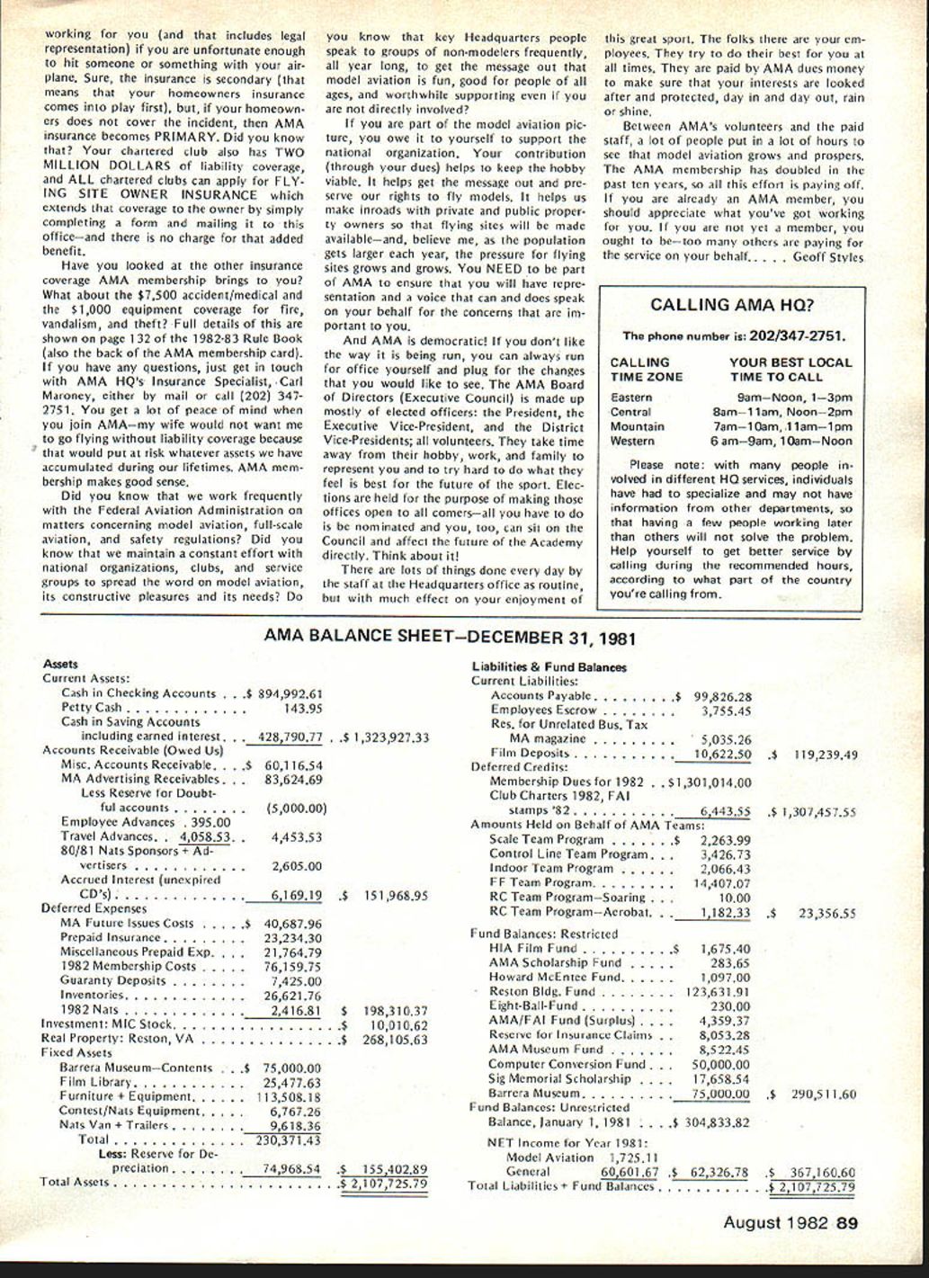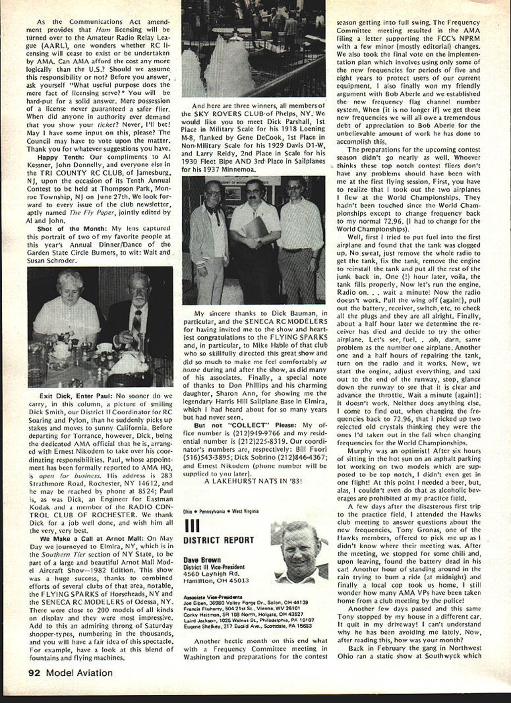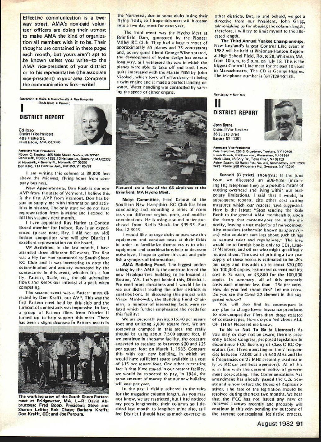 I AMA NC Frequency Meetings I3O-5/ 1 attendance AMA Headquarters Staff John Worth Vince Mankowski Geoff Styles Carl Maroney Cindy Peck AMA RC Frequency Committee Bob Aberle Jack Albrecht Dave Brown Bill Hershberger Dick Jansson Fred Marks John Strong Torrey Williams Dr Walter Good unable attend provided inputs major items RC Industry Ace RCTom Runge Airtronics Lee Renaud Bavarian Precision Products IncAlex Amarilios EMSMark Schwing FutabaYork Daimon Kraft Sys temsArt Leighton World EnginesJim Lanterman AMA Attorneys Jeremiah Court ney Dennis C Brown Jack R Smith Model Press Bob Hoeckele Model Retailer George M Myers Model Aviation Special Interest Groups IM PBA Boating Len Skwiera purpose meeting review both industry membership comments concerning recently released FCC Notice Proposed Rule Making NPRM pro poses give us 80 new channels exclusively RC model use time meeting concluded enough information gathered permit drafting unified AMA response NPRM due FCC May 131982 Under advice counsel urged support FCC NPRM wording closely possible doing would assured obtaining new frequencies shortest possible time exception several small procedural changes AMA will fully endorse NPRM its response FCC differences surfaced during meeting sufficiently resolved hinder overall progress FCC permits additional 30 day period reply counter comments takes us up June 13 1982 point should able assess probability obtaining 80 new channels quite accurate ly Should FCC have received minimum negative comments FCC pro con likelihood new frequencies will approximately mid-October 1982 very optimistic tone meeting indicated certain additional business items discussed time As result both Phase-In Plan new Frequency Flag Identification System reviewed finalized Phase-In Plan will promote orderly introduction continued page 87 provide additional spectrum between 72 76 MHz radio control model aircraft boats cars other similar devices Academy Model Aeronautics Inc its attorneys May 1 3 1982 submitted its Comments concerning Federal Communi cations Commissions General Docket 82-181 RM-3248 opening segment AMA docu ment reiterated critical need addition al RC frequencies updated form com pared original petition relief filed 1978 AMA also noted April 30/May 1 1982 AMA/RC industry meeting developed consolidated position accommodating views end objective avoiding deluge individual comments upon Com mission could inevitably delay final action proceeding April 30/May 1 meeting pronounced success enabled AMA Frequency Committee endorse Commissions proposal cer tain specific suggestions minor revisions proposed rules Specifically AMAs response included following As explained Commissions NPRM total number interference-free RC channels needed given modeling area during next decade 20 inter leaving RC channels existing primary allocations 72-76 MI-lz band rather making co-channel allocations AMA believes sufficient channels may obtained assure availability 20 usable frequencies model control area nation AMA fully sup ports Commissions proposal allocate, 80 new interstitial frequencies 72-76 MHz band RC Radio Service con trol models schedule withdrawal seven frequencies 72-76 MHz band modelers have using co channel basis various primary Radio Services Adoption proposed allocation should serve RC modeler needs years need repeat earlier sce narios crisis allocations Most existing RC equipment has de signed operate reliably adjacent channel transmissions centered frequencies no closer 40 kHz provided intermodulation products image interference avoided Manufacturers have advised AMA radio equipment will available sale will operate reliably adjacent channel transmissions close 20 kHz Christmas 1982if completion rulemaking unduly delayedand equip ment 10 kHz selectivity being designed transitional period time required however before RC equipment now field can replaced new narrow band equipment Also Commission explained its NPRM receiving equipment susceptible intermodulation image interference resulting other 72-76 MHz signals must developed before frequen cies proposed allocated can used Accordingly AMA/Industry Radio Control Frequency Phase-in Plan has adopted AMA Radio Committee phase use 80 new frequencies phase out seven existing 72-76 MHz frequencies Radio equipment existing time adoption proposed Rule amendments may thereby have full useful life users possible accommodated interfering another Under plan fly model aircraft will phase use 72 MHz frequencies operate model cars watercraft will phase use 75 MHz frequencies now-existing al locations will protected five years until authority use withdrawn proposed Rules use certain proposed new frequencies would suffer cause intermodulation image interference problems will voluntarily post poned allow design marketing suitable equipment replace existing wide bandwidth units addition minor revisions suggested proposed revisions Rule Section 95617 RC Rule 20 further revised permit type non-voice mod ulation used appropriate bands long authorized bandwidth 8 kHz case single sideband transmission 4 kHz exceeded purpose suggested revision stimulate development efficient effective RC system possible Some RC systems use pulse position modulation PPM pulse width modulation PWM interference potential PPM PWM need no greater ampli tude modulation although Commis sion has accepting PPM PWM systems amplitude modulation systems practice Commissions Rules have long made administrative distinction between amplitude pulse modulation Authorizing pulse modulation would relieve ambiguities Commissions Rules would regularize existing practice formal basis continued page 88 84 Model Aviation AMA HQ bY Executive Director including reports AMA President Executive Vice-President Vice-Presidents L ACADEMY OF MODEL AERONAUTICS Washington DC 20005 81 5 Fifteenth Street NW AMA Response FCC Proposal Presidents Corner President ACADEMY OF MODEL AERONAUTICS JOHN C GRIGG 6387 Badger Drive Lockport NY 14094 500 Competitio