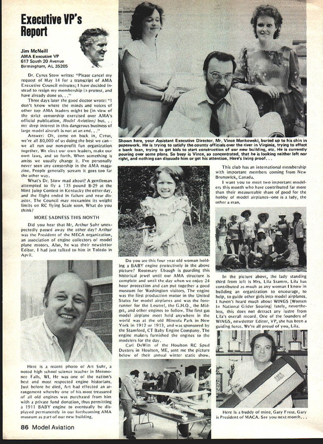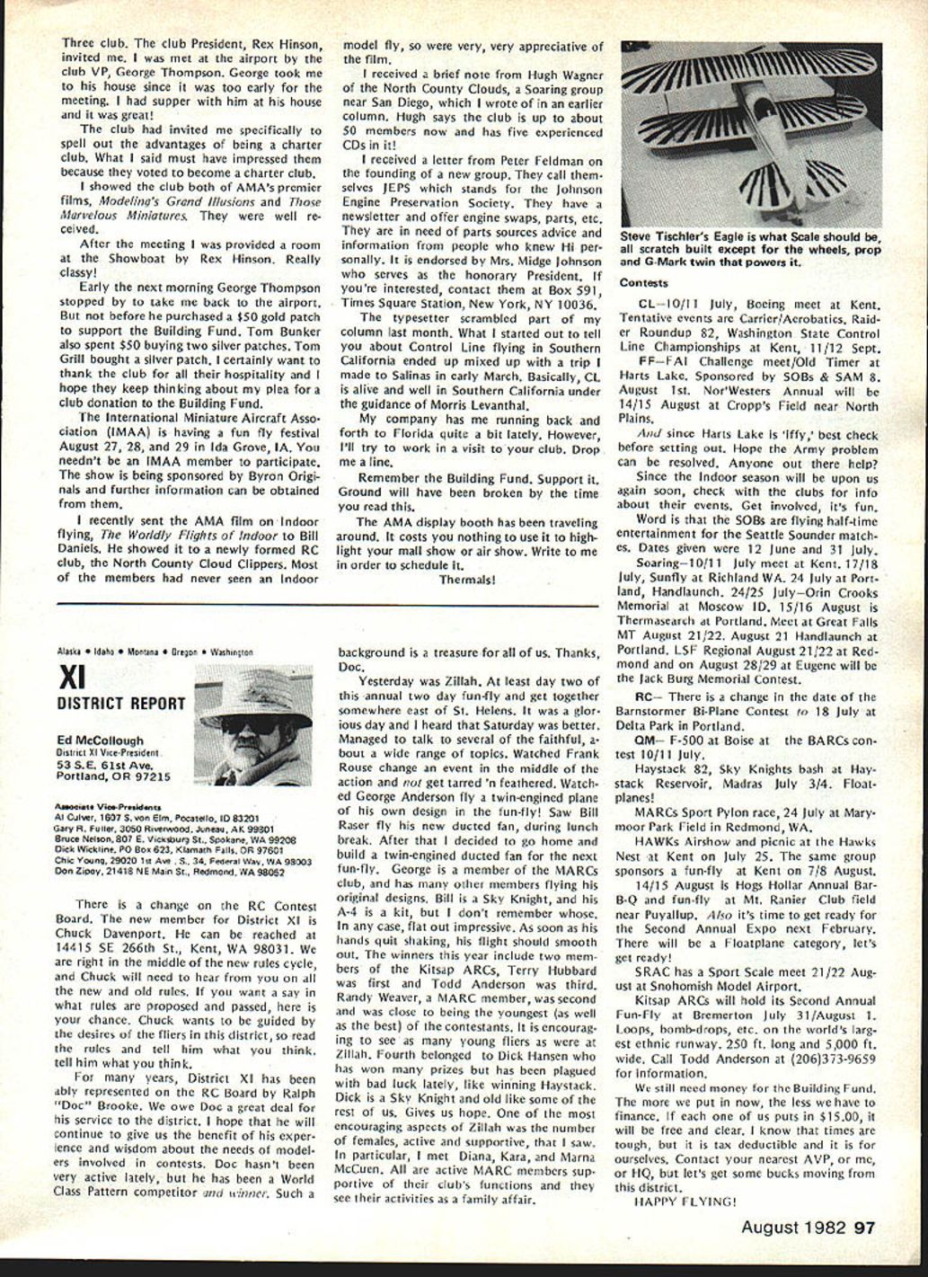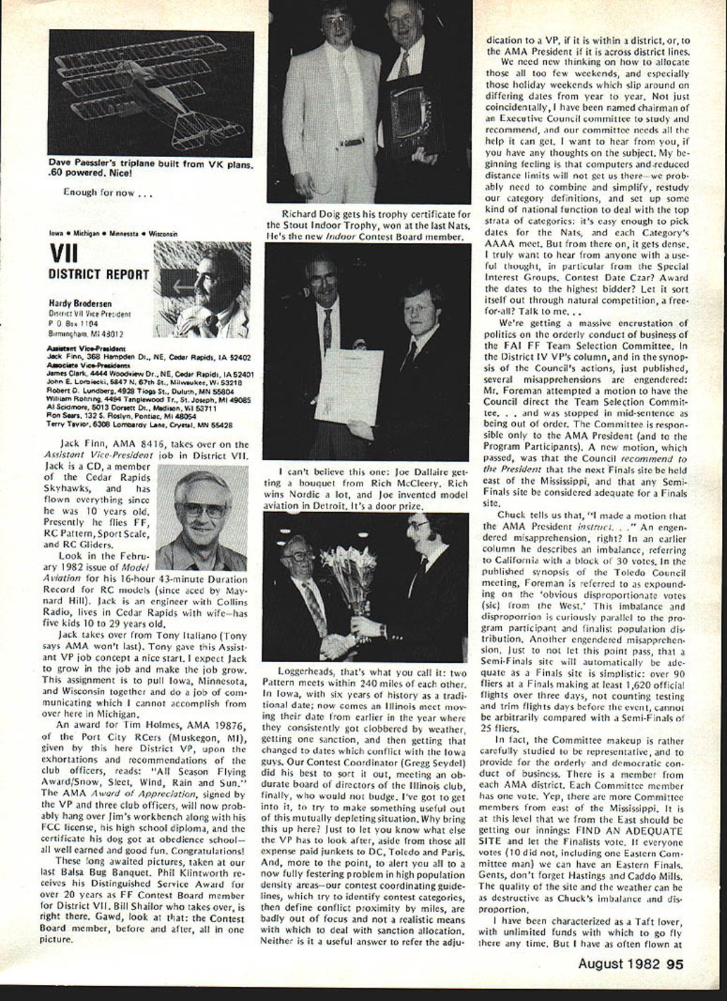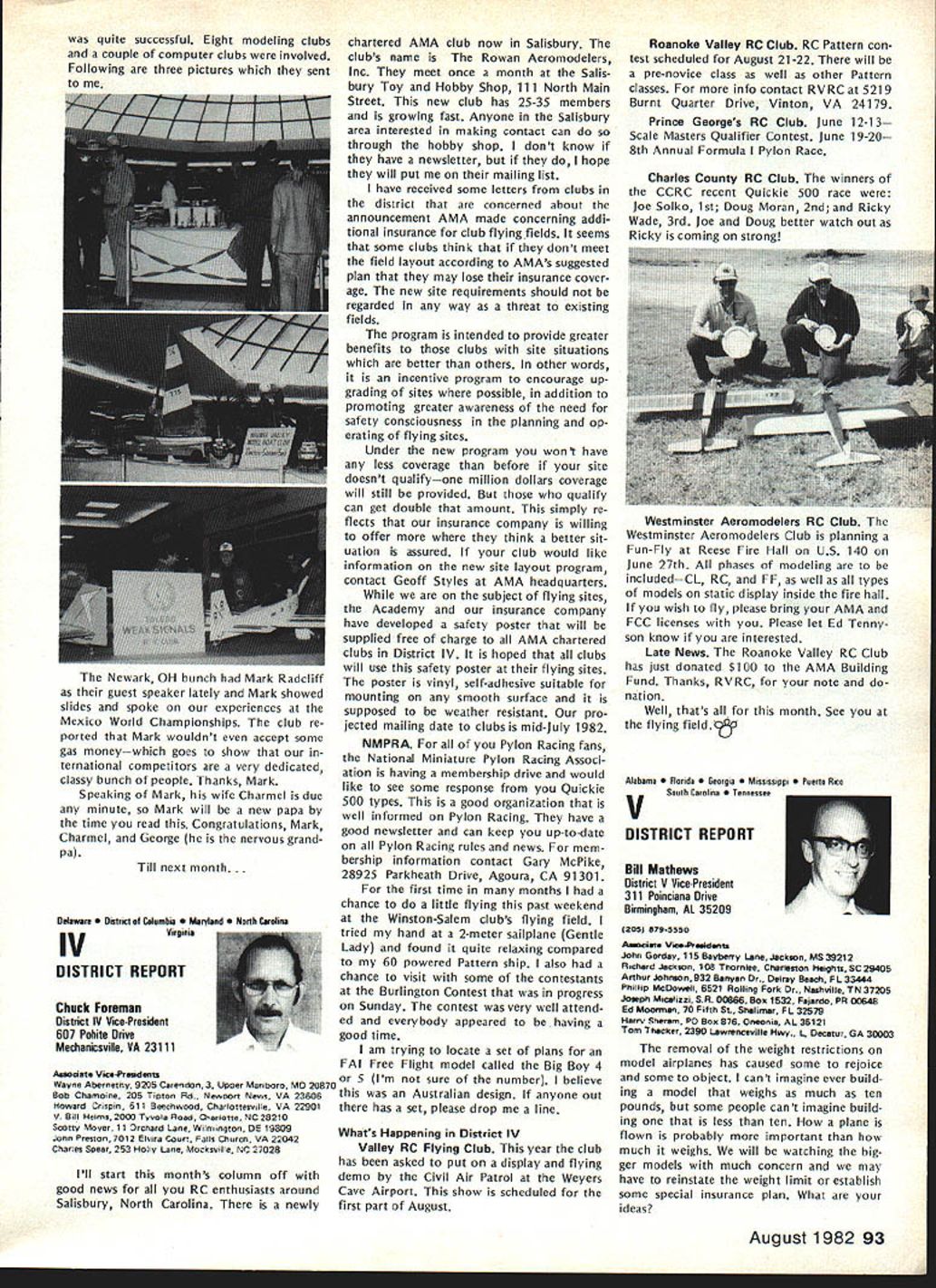 I AMA NC Frequency Meetings I3O-5/ 1 attendance AMA Headquarters Staff John Worth Vince Mankowski Geoff Styles Carl Maroney Cindy Peck AMA RC Frequency Committee Bob Aberle Jack Albrecht Dave Brown Bill Hershberger Dick Jansson Fred Marks John Strong Torrey Williams Dr Walter Good unable attend provided inputs major items RC Industry Ace RCTom Runge Airtronics Lee Renaud Bavarian Precision Products IncAlex Amarilios EMSMark Schwing FutabaYork Daimon Kraft Sys temsArt Leighton World EnginesJim Lanterman AMA Attorneys Jeremiah Court ney Dennis C Brown Jack R Smith Model Press Bob Hoeckele Model Retailer George M Myers Model Aviation Special Interest Groups IM PBA Boating Len Skwiera purpose meeting review both industry membership comments concerning recently released FCC Notice Proposed Rule Making NPRM pro poses give us 80 new channels exclusively RC model use time meeting concluded enough information gathered permit drafting unified AMA response NPRM due FCC May 131982 Under advice counsel urged support FCC NPRM wording closely possible doing would assured obtaining new frequencies shortest possible time exception several small procedural changes AMA will fully endorse NPRM its response FCC differences surfaced during meeting sufficiently resolved hinder overall progress FCC permits additional 30 day period reply counter comments takes us up June 13 1982 point should able assess probability obtaining 80 new channels quite accurate ly Should FCC have received minimum negative comments FCC pro con likelihood new frequencies will approximately mid-October 1982 very optimistic tone meeting indicated certain additional business items discussed time As result both Phase-In Plan new Frequency Flag Identification System reviewed finalized Phase-In Plan will promote orderly introduction continued page 87 provide additional spectrum between 72 76 MHz radio control model aircraft boats cars other similar devices Academy Model Aeronautics Inc its attorneys May 1 3 1982 submitted its Comments concerning Federal Communi cations Commissions General Docket 82-181 RM-3248 opening segment AMA docu ment reiterated critical need addition al RC frequencies updated form com pared original petition relief filed 1978 AMA also noted April 30/May 1 1982 AMA/RC industry meeting developed consolidated position accommodating views end objective avoiding deluge individual comments upon Com mission could inevitably delay final action proceeding April 30/May 1 meeting pronounced success enabled AMA Frequency Committee endorse Commissions proposal cer tain specific suggestions minor revisions proposed rules Specifically AMAs response included following As explained Commissions NPRM total number interference-free RC channels needed given modeling area during next decade 20 inter leaving RC channels existing primary allocations 72-76 MI-lz band rather making co-channel allocations AMA believes sufficient channels may obtained assure availability 20 usable frequencies model control area nation AMA fully sup ports Commissions proposal allocate, 80 new interstitial frequencies 72-76 MHz band RC Radio Service con trol models schedule withdrawal seven frequencies 72-76 MHz band modelers have using co channel basis various primary Radio Services Adoption proposed allocation should serve RC modeler needs years need repeat earlier sce narios crisis allocations Most existing RC equipment has de signed operate reliably adjacent channel transmissions centered frequencies no closer 40 kHz provided intermodulation products image interference avoided Manufacturers have advised AMA radio equipment will available sale will operate reliably adjacent channel transmissions close 20 kHz Christmas 1982if completion rulemaking unduly delayedand equip ment 10 kHz selectivity being designed transitional period time required however before RC equipment now field can replaced new narrow band equipment Also Commission explained its NPRM receiving equipment susceptible intermodulation image interference resulting other 72-76 MHz signals must developed before frequen cies proposed allocated can used Accordingly AMA/Industry Radio Control Frequency Phase-in Plan has adopted AMA Radio Committee phase use 80 new frequencies phase out seven existing 72-76 MHz frequencies Radio equipment existing time adoption proposed Rule amendments may thereby have full useful life users possible accommodated interfering another Under plan fly model aircraft will phase use 72 MHz frequencies operate model cars watercraft will phase use 75 MHz frequencies now-existing al locations will protected five years until authority use withdrawn proposed Rules use certain proposed new frequencies would suffer cause intermodulation image interference problems will voluntarily post poned allow design marketing suitable equipment replace existing wide bandwidth units addition minor revisions suggested proposed revisions Rule Section 95617 RC Rule 20 further revised permit type non-voice mod ulation used appropriate bands long authorized bandwidth 8 kHz case single sideband transmission 4 kHz exceeded purpose suggested revision stimulate development efficient effective RC system possible Some RC systems use pulse position modulation PPM pulse width modulation PWM interference potential PPM PWM need no greater ampli tude modulation although Commis sion has accepting PPM PWM systems amplitude modulation systems practice Commissions Rules have long made administrative distinction between amplitude pulse modulation Authorizing pulse modulation would relieve ambiguities Commissions Rules would regularize existing practice formal basis continued page 88 84 Model Aviation AMA HQ bY Executive Director including reports AMA President Executive Vice-President Vice-Presidents L ACADEMY OF MODEL AERONAUTICS Washington DC 20005 81 5 Fifteenth Street NW AMA Response FCC Proposal Presidents Corner President ACADEMY OF MODEL AERONAUTICS JOHN C GRIGG 6387 Badger Drive Lockport NY 14094 500 Competitio