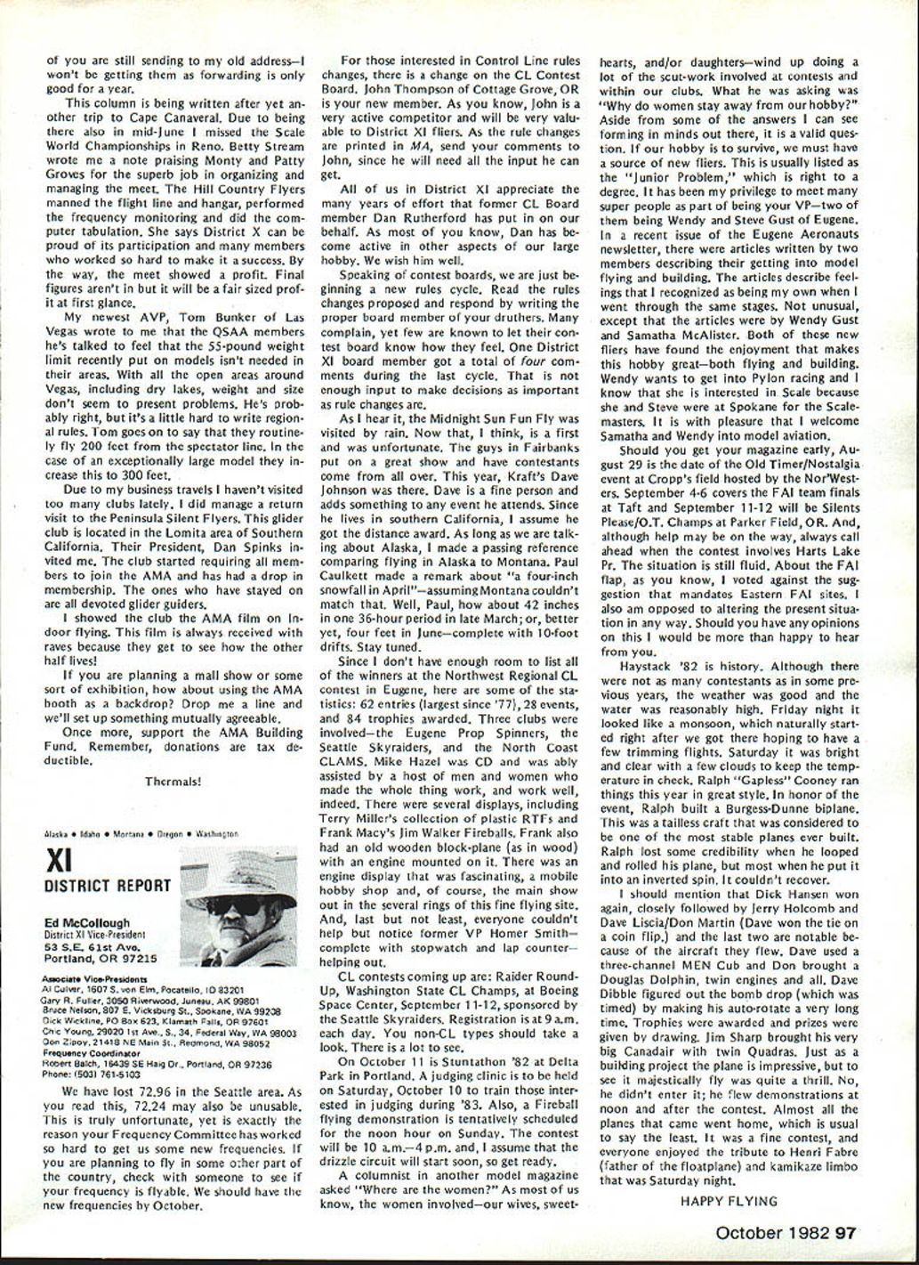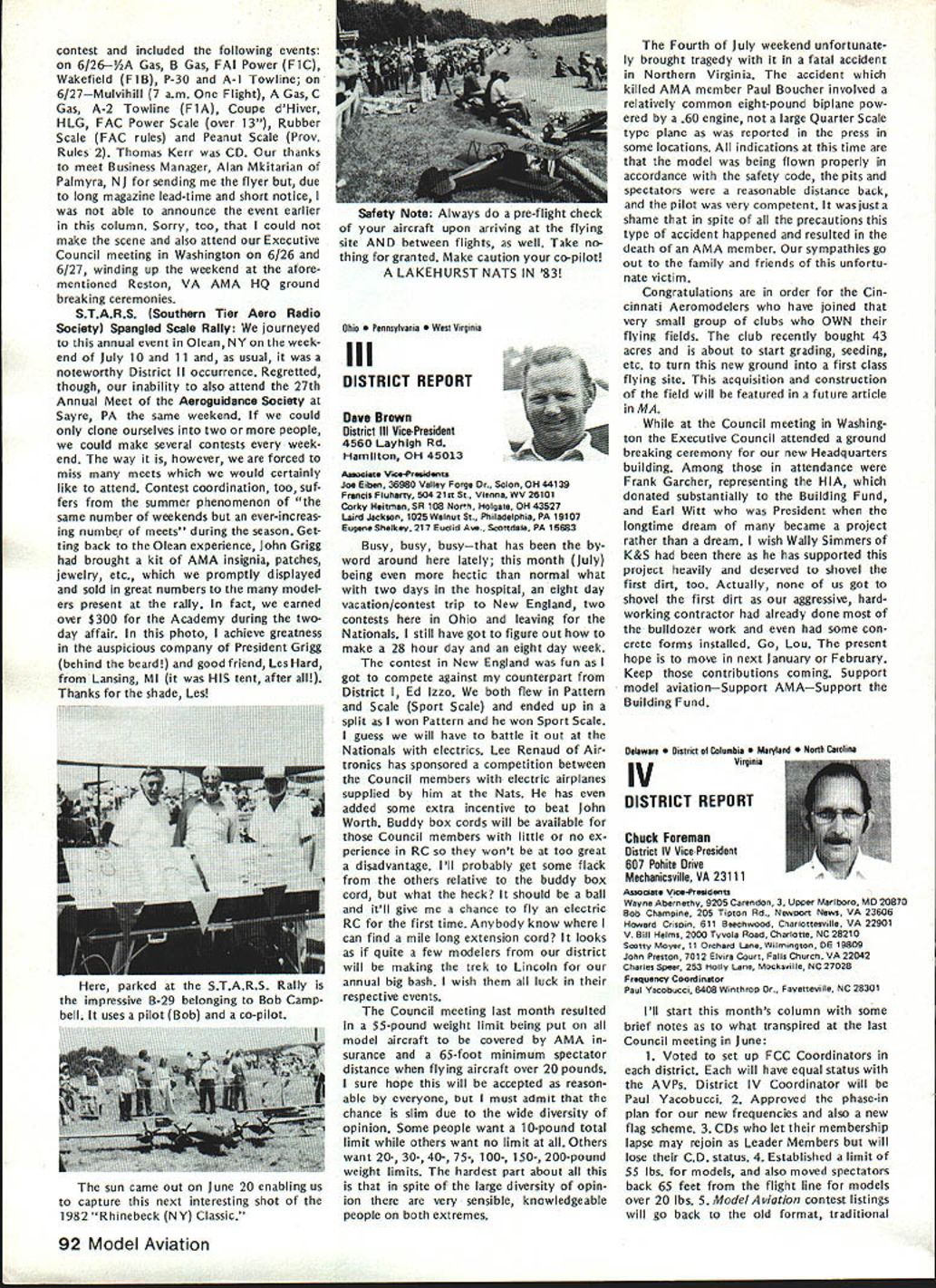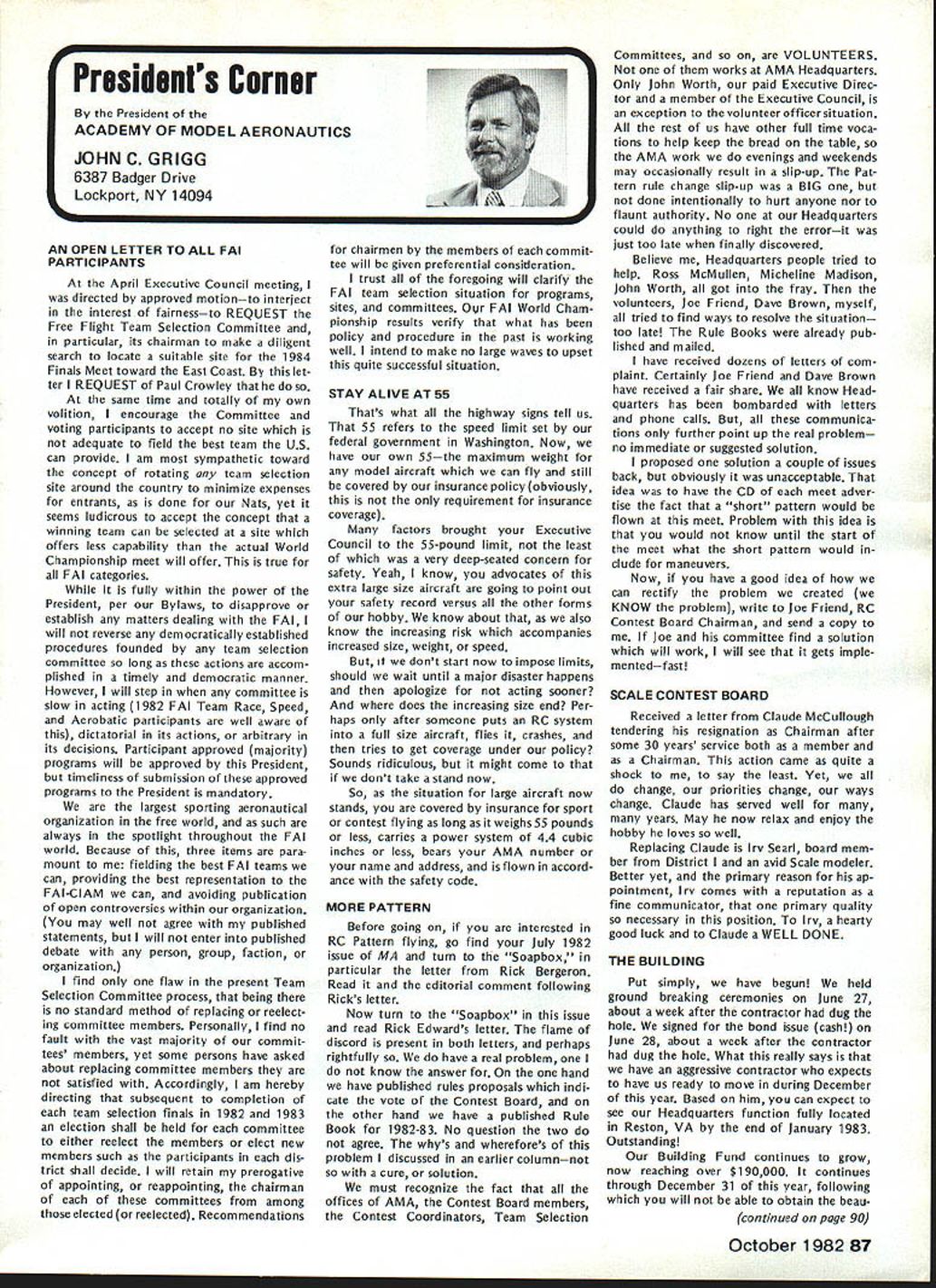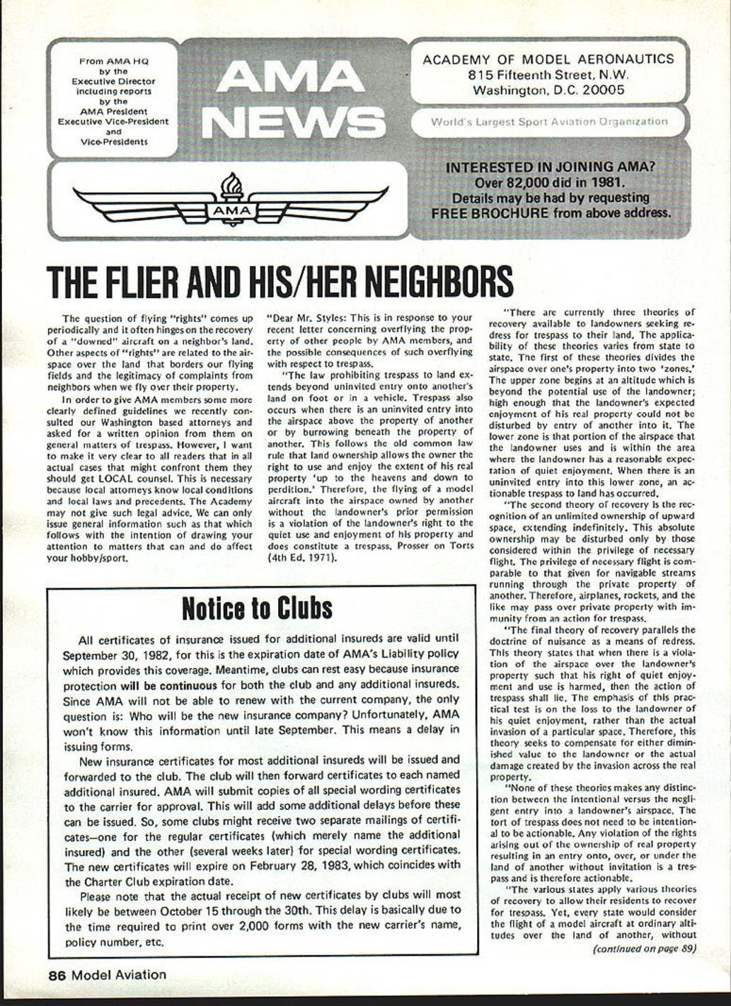THE FLIER AND HIS/HER NEIGHBORS question flying rights comes up periodically often hinges recovery downed aircraft neighbors land Other aspects rights related air space over land borders flying fields legitimacy complaints neighbors fly over property order give AMA members some clearly defined guidelines recently con sulted Washington based attorneys asked written opinion general matters trespass However want make very clear readers actual cases might confront should get LOCAL counsel necessary because local attorneys know local conditions local laws precedents Academy may give such legal advice can issue general information such follows intention drawing attention matters can affect hobby/sport Dear Mr Styles response recent letter concerning overflying prop erty other people AMA members possible consequences such overflying respect trespass law prohibiting trespass land ex tends beyond uninvited entry onto anothers land foot vehicle Trespass also occurs uninvited entry airspace above property another burrowing beneath property another follows old common law rule land ownership allows owner right use enjoy extent real property up heavens down perdition Therefore flying model aircraft airspace owned another landowners prior permission violation landowners right quiet use enjoyment property does constitute trespass Prosser Torts 4th Ed 1971 currently three theories recovery available landowners seeking re dress trespass land applica bility theories varies state state first theories divides airspace over ones property two zones upper zone begins altitude beyond potential use landowner high enough landowners expected enjoyment real property could disturbed entry another lower zone portion airspace landowner uses within area landowner has reasonable expec tation quiet enjoyment uninvited entry lower zone ac tionable trespass land has occurred second theory recovery rec ognition unlimited ownership upward space extending indefinitely absolute ownership may disturbed considered within privilege necessary flight privilege necessary flight com parable given navigable streams running through private property another Therefore airplanes rockets like may pass over private property im munity action trespass final theory recovery parallels doctrine nuisance means redress theory states viola tion airspace over landowners property such right quiet enjoy ment use harmed action trespass shall lie emphasis prac tical test loss landowner quiet enjoyment rather actual invasion particular space Therefore theory seeks compensate either dimin ished value landowner actual damage created invasion across real property None theories makes distinc tion between intentional versus negli gent entry landowners airspace tort trespass does need intention al actionable Any violation rights arising out ownership real property resulting entry onto over under land another invitation tres pass therefore actionable various states apply various theories recovery allow residents recover trespass Yet state would consider flight model aircraft ordinary alti tudes over land another continued page 89 86 Model Aviation AMA HQ bY Executive Director including reports bY AMA President Executive Vice-President Vice-Presidents L ACADEMY OF MODEL AERONAUTICS Washington DC 200051 81 5 Fifteenth Street NW Notice Clubs certificates insurance issued additional insureds valid until September 30 1982 expiration date AMAs Liability policy provides coverage Meantime clubs can rest easy because insurance protection will continuous both club additional insureds Since AMA will able renew current company question will new insurance company Unfortunately AMA wont know information until late September means delay issuing forms New insurance certificates additional insureds will issued forwarded club club will forward certificates named additional insured AMA will submit copies special wording certificates carrier approval will add some additional delays before can issued So some clubs might receive two separate mailings certifi catesone regular certificates merely name additional insured other several weeks later special wording certificates new certificates will expire February 28 1983 coincides Charter Club expiration date Please note actual receipt new certificates clubs will likely between October 15 through 30th delay basically due time required print over 2000 forms new carriers name policy number etc Presidents Corner President ACADEMY OF MODEL AERONAUTICS JOHN C GRIGG 6387 Badger Drive Lockport NY 14094 OPEN LETTER TO ALL FAI PARTICIPANTS April Executive Council meeting directed approved motionto interject interest fairnessto REQUEST Free Flight Team Selection Committee particular its chairman make diligent search locate suitable site 1984 Finals Meet toward East Coast let ter REQUEST Paul Crowley same time totally own volition encourage Committee voting participants accept no site adequate field best team US can provide am sympathetic toward concept rotating team selection site around country minimize expenses entrants done Nats yet seems ludicrous accept concept winning team can selected site offers less capability actual World Championship meet will offer true FAI categories fully within power President per Bylaws disapprove establish matters dealing FAI will reverse democratically established procedures founded team selection committee long actions accom plished timely democratic manner However will step committee slow acting 1982 FAI Team Race Speed Aerobatic participants well aware dictatorial its actions arbitrary its decisions Participant approved majority programs will approved President timeliness submission approved programs President mandatory largest sporting aeronautical organization free world such always spotlight throughout FAI world Because three items para mount fielding best FAI teams can providing best representation FAI-CIAM can avoiding publication open controversies within organization may well agree published statements 