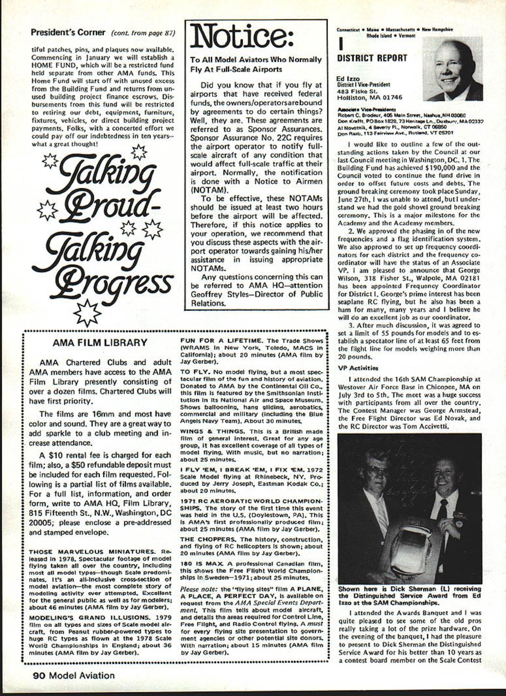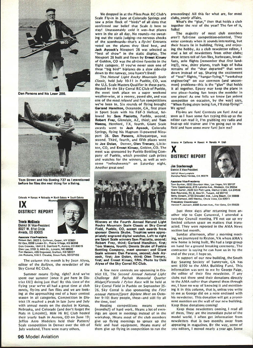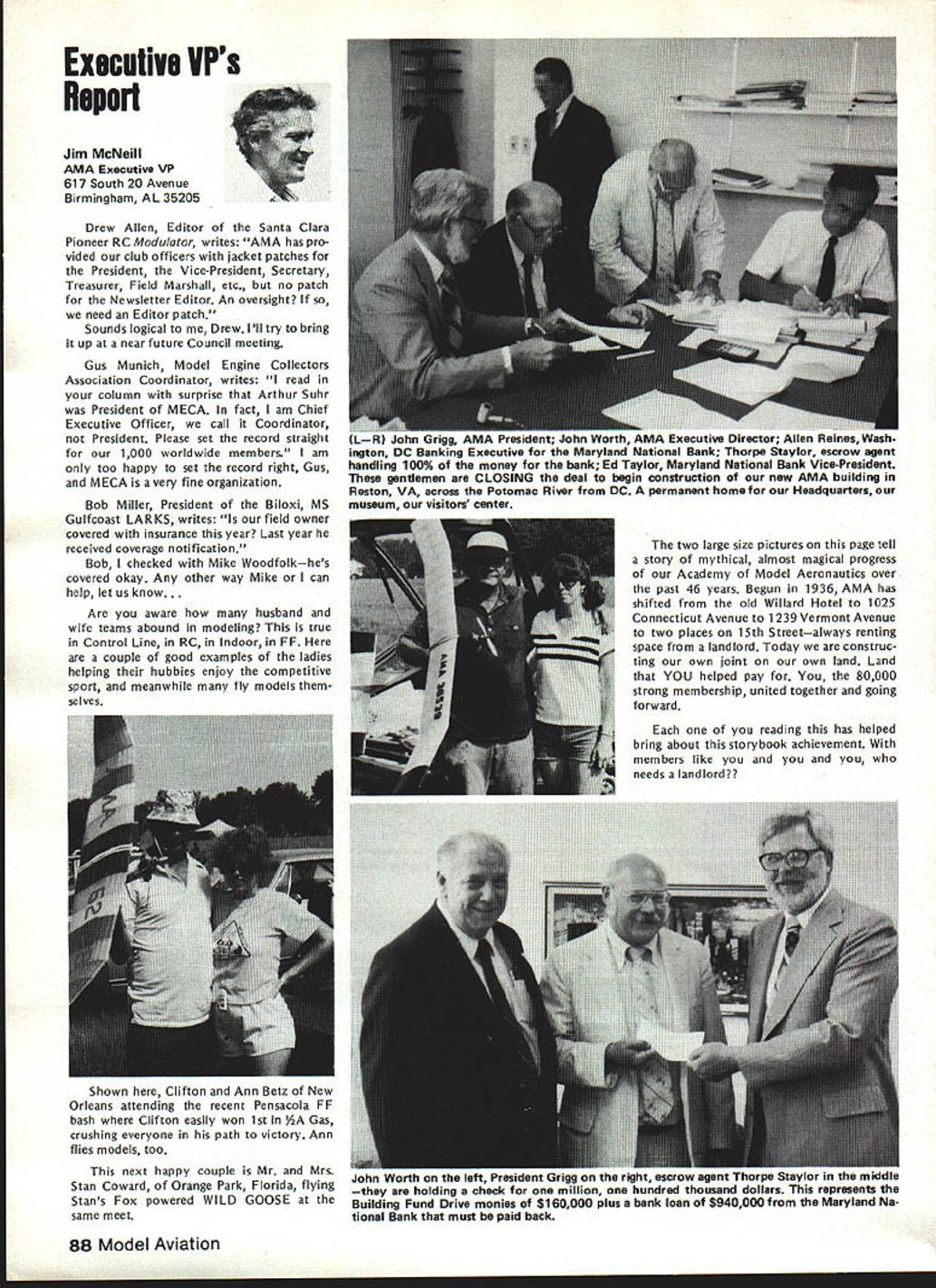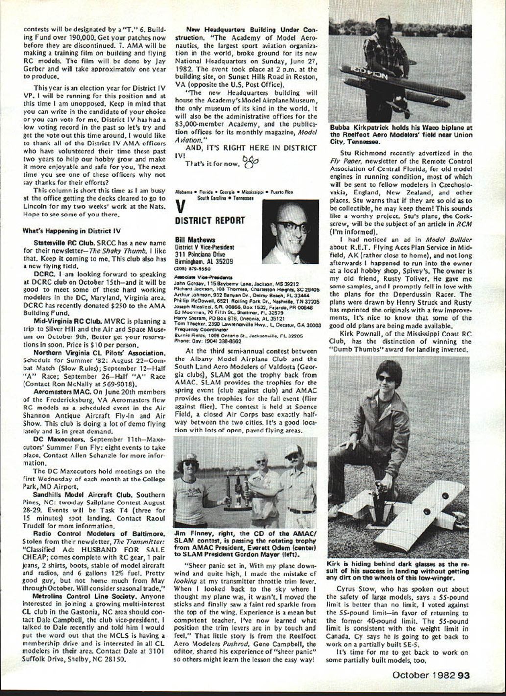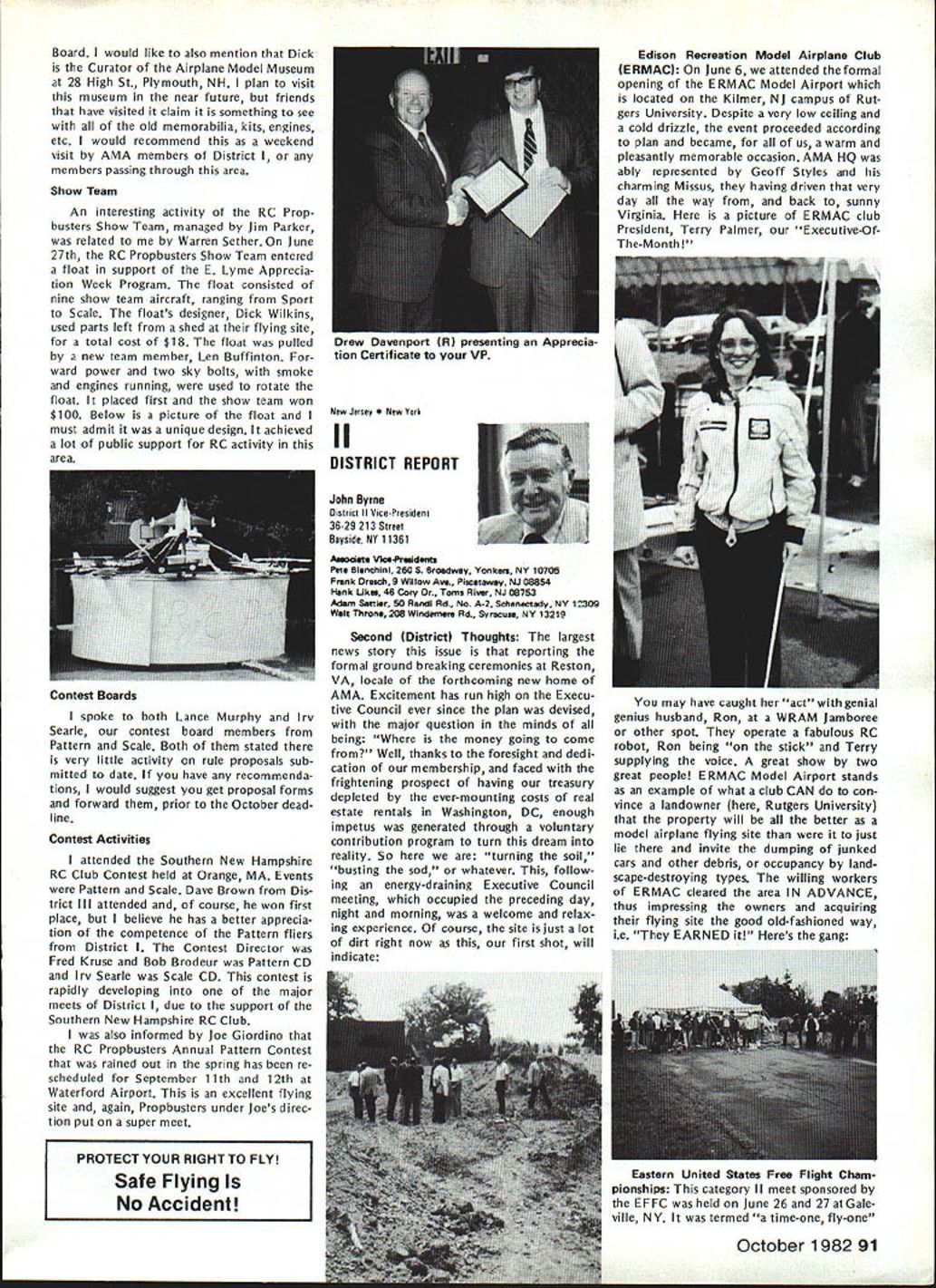 THE FLIER AND HIS/HER NEIGHBORS question flying rights comes up periodically often hinges recovery downed aircraft neighbors land Other aspects rights related air space over land borders flying fields legitimacy complaints neighbors fly over property order give AMA members some clearly defined guidelines recently con sulted Washington based attorneys asked written opinion general matters trespass However want make very clear readers actual cases might confront should get LOCAL counsel necessary because local attorneys know local conditions local laws precedents Academy may give such legal advice can issue general information such follows intention drawing attention matters can affect hobby/sport Dear Mr Styles response recent letter concerning overflying prop erty other people AMA members possible consequences such overflying respect trespass law prohibiting trespass land ex tends beyond uninvited entry onto anothers land foot vehicle Trespass also occurs uninvited entry airspace above property another burrowing beneath property another follows old common law rule land ownership allows owner right use enjoy extent real property up heavens down perdition Therefore flying model aircraft airspace owned another landowners prior permission violation landowners right quiet use enjoyment property does constitute trespass Prosser Torts 4th Ed 1971 currently three theories recovery available landowners seeking re dress trespass land applica bility theories varies state state first theories divides airspace over ones property two zones upper zone begins altitude beyond potential use landowner high enough landowners expected enjoyment real property could disturbed entry another lower zone portion airspace landowner uses within area landowner has reasonable expec tation quiet enjoyment uninvited entry lower zone ac tionable trespass land has occurred second theory recovery rec ognition unlimited ownership upward space extending indefinitely absolute ownership may disturbed considered within privilege necessary flight privilege necessary flight com parable given navigable streams running through private property another Therefore airplanes rockets like may pass over private property im munity action trespass final theory recovery parallels doctrine nuisance means redress theory states viola tion airspace over landowners property such right quiet enjoy ment use harmed action trespass shall lie emphasis prac tical test loss landowner quiet enjoyment rather actual invasion particular space Therefore theory seeks compensate either dimin ished value landowner actual damage created invasion across real property None theories makes distinc tion between intentional versus negli gent entry landowners airspace tort trespass does need intention al actionable Any violation rights arising out ownership real property resulting entry onto over under land another invitation tres pass therefore actionable various states apply various theories recovery allow residents recover trespass Yet state would consider flight model aircraft ordinary alti tudes over land another continued page 89 86 Model Aviation AMA HQ bY Executive Director including reports bY AMA President Executive Vice-President Vice-Presidents L ACADEMY OF MODEL AERONAUTICS Washington DC 200051 81 5 Fifteenth Street NW Notice Clubs certificates insurance issued additional insureds valid until September 30 1982 expiration date AMAs Liability policy provides coverage Meantime clubs can rest easy because insurance protection will continuous both club additional insureds Since AMA will able renew current company question will new insurance company Unfortunately AMA wont know information until late September means delay issuing forms New insurance certificates additional insureds will issued forwarded club club will forward certificates named additional insured AMA will submit copies special wording certificates carrier approval will add some additional delays before can issued So some clubs might receive two separate mailings certifi catesone regular certificates merely name additional insured other several weeks later special wording certificates new certificates will expire February 28 1983 coincides Charter Club expiration date Please note actual receipt new certificates clubs will likely between October 15 through 30th delay basically due time required print over 2000 forms new carriers name policy number etc Presidents Corner President ACADEMY OF MODEL AERONAUTICS JOHN C GRIGG 6387 Badger Drive Lockport NY 14094 OPEN LETTER TO ALL FAI PARTICIPANTS April Executive Council meeting directed approved motionto interject interest fairnessto REQUEST Free Flight Team Selection Committee particular its chairman make diligent search locate suitable site 1984 Finals Meet toward East Coast let ter REQUEST Paul Crowley same time totally own volition encourage Committee voting participants accept no site adequate field best team US can provide am sympathetic toward concept rotating team selection site around country minimize expenses entrants done Nats yet seems ludicrous accept concept winning team can selected site offers less capability actual World Championship meet will offer true FAI categories fully within power President per Bylaws disapprove establish matters dealing FAI will reverse democratically established procedures founded team selection committee long actions accom plished timely democratic manner However will step committee slow acting 1982 FAI Team Race Speed Aerobatic participants well aware dictatorial its actions arbitrary its decisions Participant approved majority programs will approved President timeliness submission approved programs President mandatory largest sporting aeronautical organization free world such always spotlight throughout FAI world Because three items para mount fielding best FAI teams can providing best representation FAI-CIAM can avoiding publication open controversies within organization may well agree published statements 
