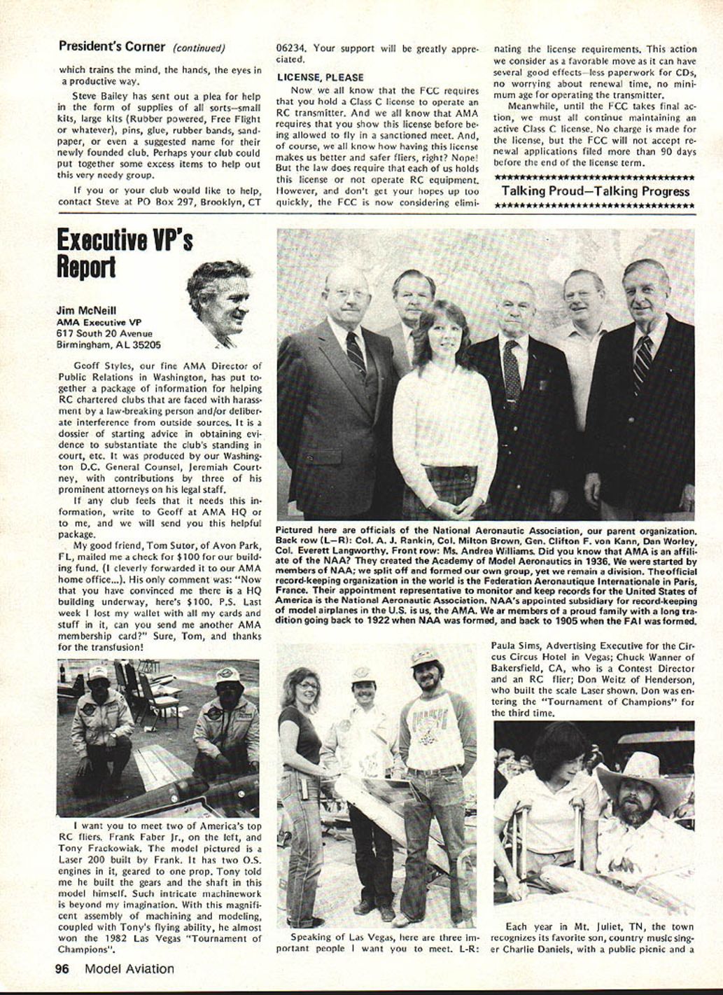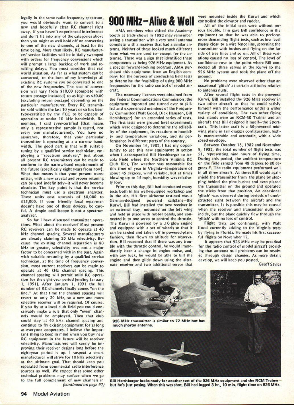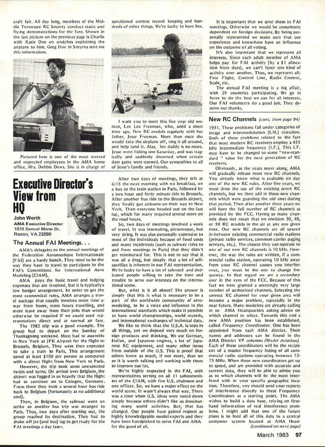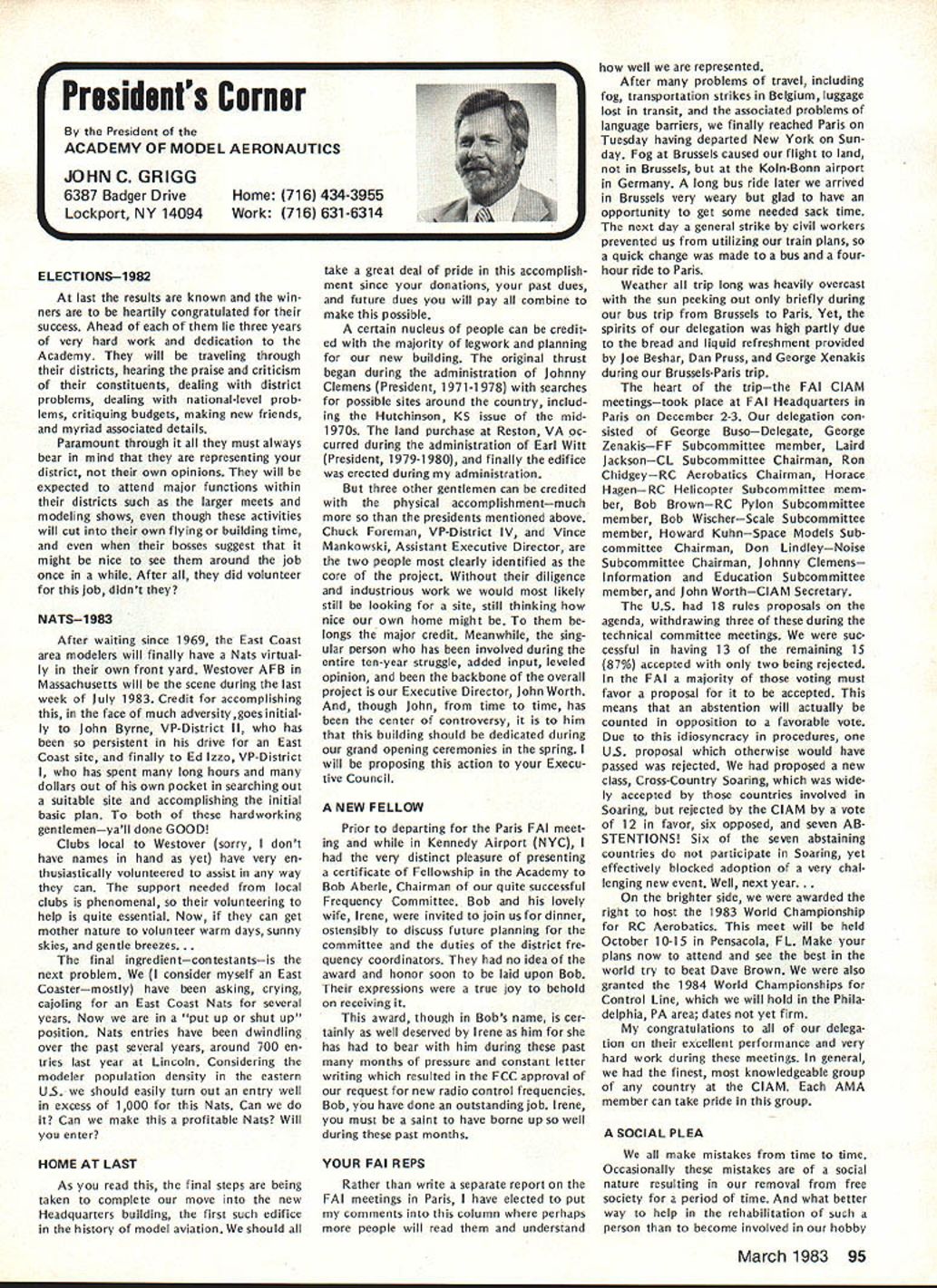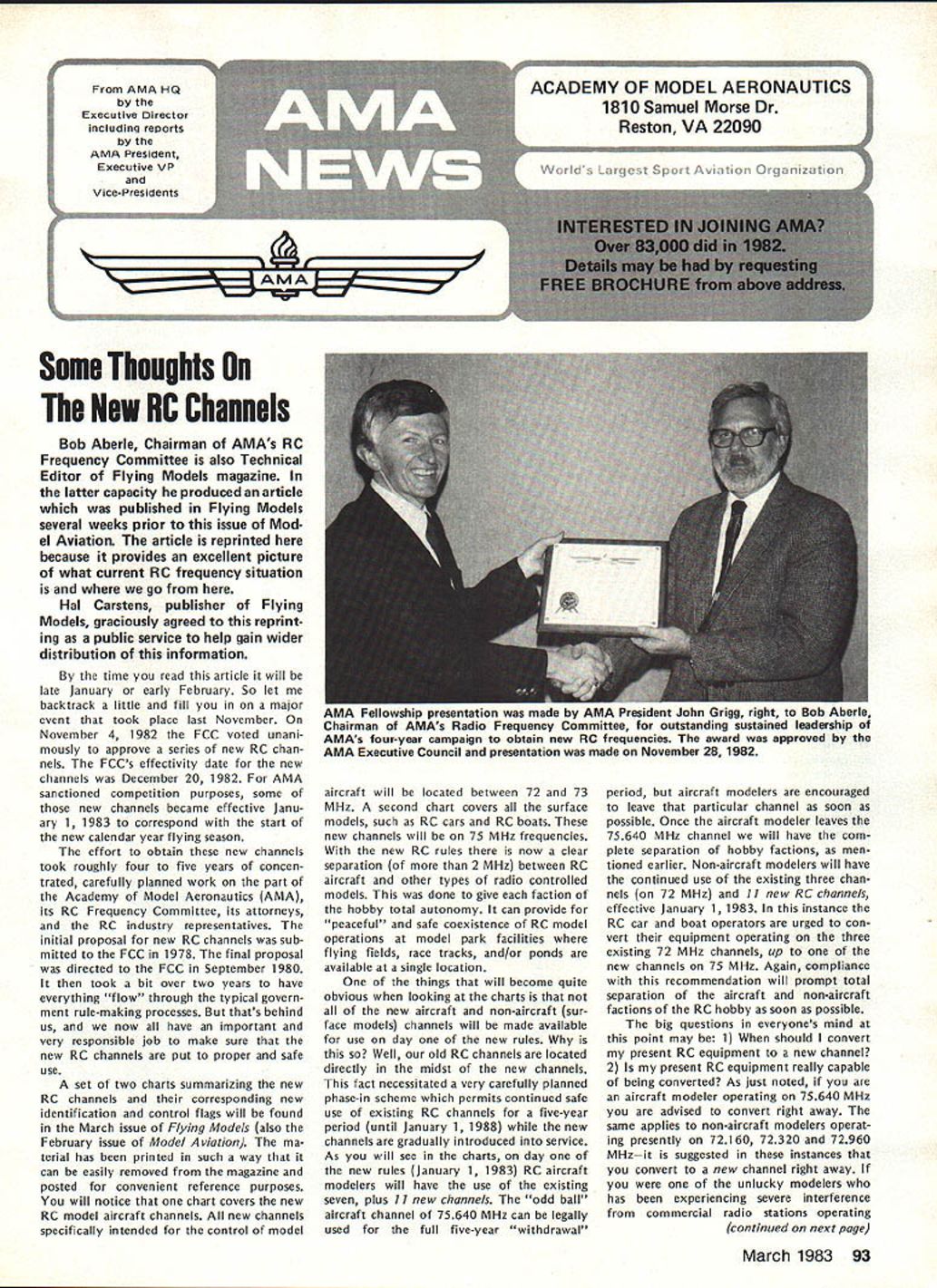 Some Thoughts New NC Channels Bob Aberle Chairman AMAs RC Frequency Committee also Technical Editor Flying Models magazine latter capacity produced article published Flying Models several weeks prior issue Mod el Aviation article reprinted because provides excellent picture what current RC frequency situation go Hal Carstens publisher Flying Models graciously agreed reprint ing public service help gain wider distribution information time read article will late January early February So let backtrack little fill major event took place last November November 4 1982 FCC voted unani mously approve series new RC chan nels FCCs effectivity date new channels December 20 1982 AMA sanctioned competition purposes some new channels became effective Janu ary 1 1983 correspond start new calendar year flying season effort obtain new channels took roughly four five years concen trated carefully planned work part Academy Model Aeronautics AMA its RC Frequency Committee its attorneys RC industry representatives initial proposal new RC channels sub mitted FCC 1978 final proposal directed FCC September 1980 took bit over two years have everything flow through typical govern ment rule-making processes thats behind us now have important very responsible job make sure new RC channels put proper safe use set two charts summarizing new RC channels corresponding new identification control flags will found March issue Flying Models also February issue Model Aviation ma terial has printed such way can easily removed magazine posted convenient reference purposes will notice chart covers new RC model aircraft channels new channels specifically intended control model aircraft will located between 72 73 MHz second chart covers surface models such RC cars RC boats new channels will 75 MHz frequencies new RC rules now clear separation 2 MHz between RC aircraft other types radio controlled models done give faction hobby total autonomy can provide peaceful safe coexistence RC model operations model park facilities flying fields race tracks andlor ponds available single location things will become quite obvious looking charts new aircraft non-aircraft sur face models channels will made available use day new rules Well old RC channels located directly midst new channels fact necessitated very carefully planned phase-in scheme permits continued safe use existing RC channels five-year period until January 11988 new channels gradually introduced service As will see charts day new rules January 1 1983 RC aircraft modelers will have use existing seven plus 11 new channels odd ball aircraft channel 75640 MHz can legally used full five-year withdrawal period aircraft modelers encouraged leave particular channel soon possible Once aircraft modeler leaves 75640 MHz channel will have com plete separation hobby factions men tioned earlier Non-aircraft modelers will have continued use existing three chan nels 72 MHz 71 new RC channels effective January 1 1983 instance RC car boat operators urged con vert equipment operating three existing 72 MHz channels up new channels 75 MHz Again compliance recommendation will prompt total separation aircraft non-aircraft factions RC hobby soon possible big questions everyones mind point may 1 should convert present RC equipment new channel 2 present RC equipment really capable being converted As just noted aircraft modeler operating 75640 MHz advised convert right away same applies non-aircraft modelers operat ing presently 72160 72320 72960 MHzit suggested instances convert new channel right away unlucky modelers has experiencing severe interference commercial radio stations operating continued next page March 1983 93 AMA HQ Executive Director including reports AMA President Executive VP Vice-Presidents ACADEMY OF MODEL AERONAUTICS Samuel Morse Dr Reston VA 22090 VVA d v ~on Ogaruzt o MIVIM uwsnp presenseiun mauc uy ivu rresueii John Grigg right Bob jerle Chairman AMAs Radio Frequency Committee outstanding sustained leadership AMAs four-year campaign obtain new RC frequencies award approved AMA Executive Council presentation made November 28 1982 legally same radio frequency spectrum would obviously want convert new hopefully clear RC channel right away havent experienced interference dont fit categories above might well hold off converting new channels least time being likely RC manufactur ers service facilities will initially swamped orders frequency conversions will prompt large backlog work re sulting delays must consider real world situation As far what system can converted best knowledge existing RC systems can converted new frequencies cost conver sion will vary $1000 complete return postage included high $3000 excluding return postage depending particular manufacturer RC transmit ter sold within last 10 years has type-certified FCC capable operation under 10 kHz bandwidth Re member said type-certified means representative sample tested manufacturered have no assurance therefore particular transmitter operating a narrow band width good part suitable tuning qualified service technician em ploying spectrum analyzer just about present RC transmitters can made conform narrow-band requirements future specifically eight years now What means present trans mitter new crystal proper retuning can used indefinitelyit will never become obsolete key point service technician must use spectrum analyzer units cost upwards $8000 $15000 friendly local repairman doesnt have devices care ful simple oscilliscope spectrum analyzer So far have discussed transmitter opera tions What about receiver Most present RC reveivers can made operate 40 kHz channel spacing Several manufacturers already claiming 20 kHz selectivity cause existing channel separation 80 kI-lz greater selectivity major factor concerned past Again suitable re-tuning qualified service technician time frequency conver sion current receivers can made operate 40 kHz channel spacing channel spacing will permit solid RC opera tion eight-year period endi