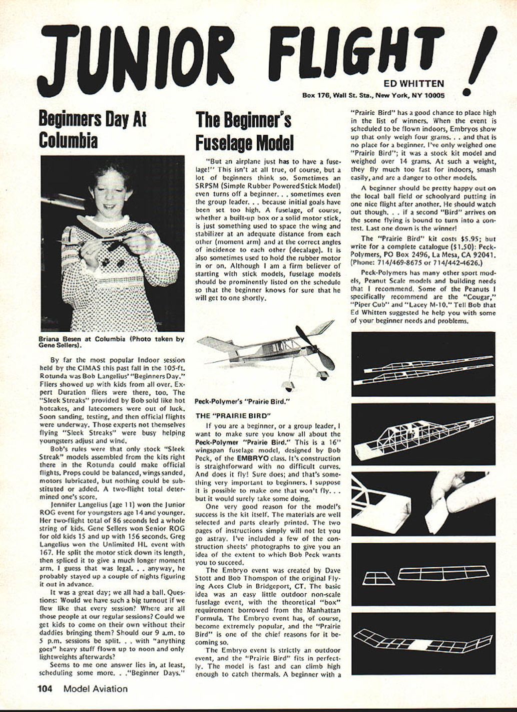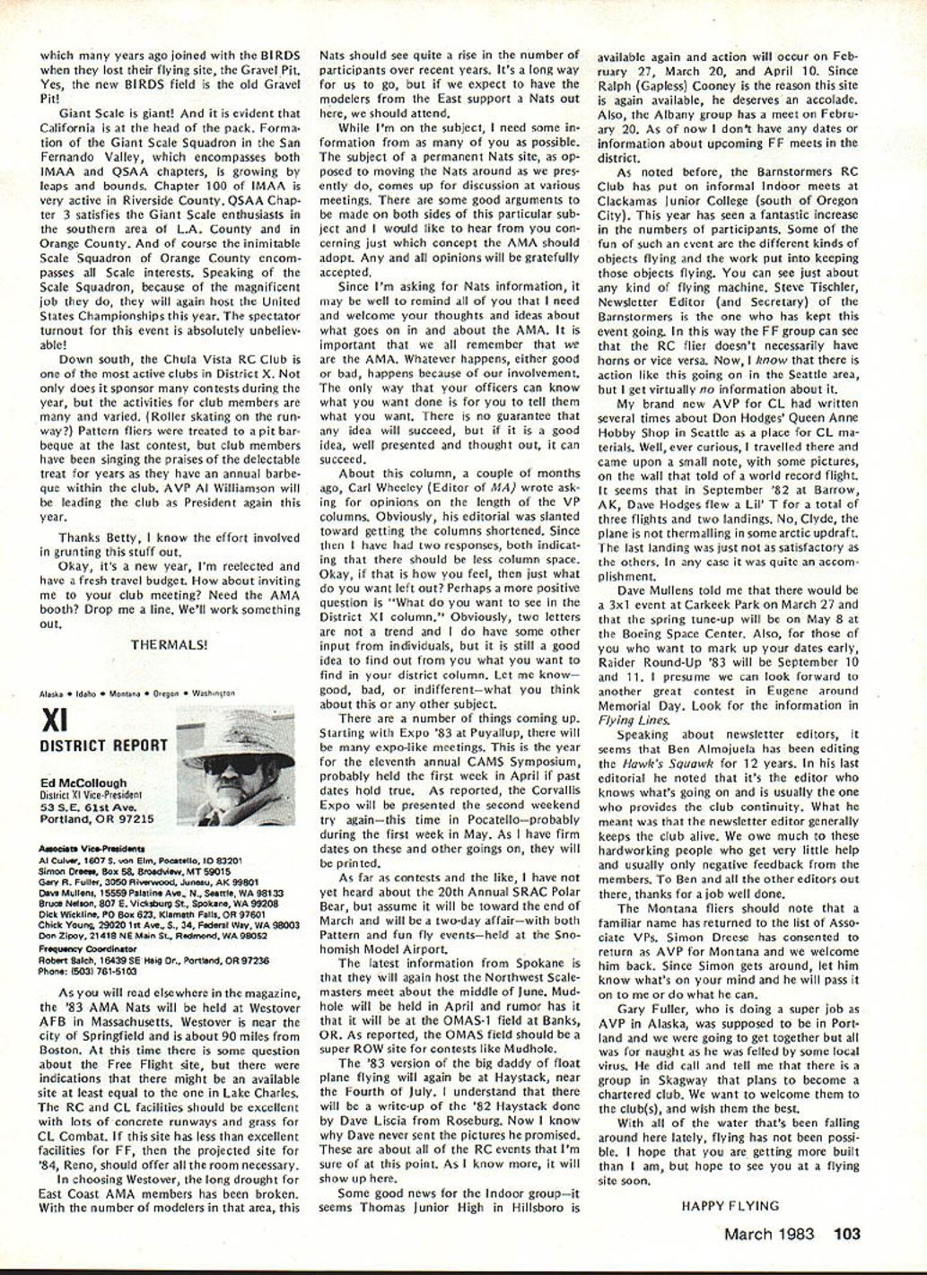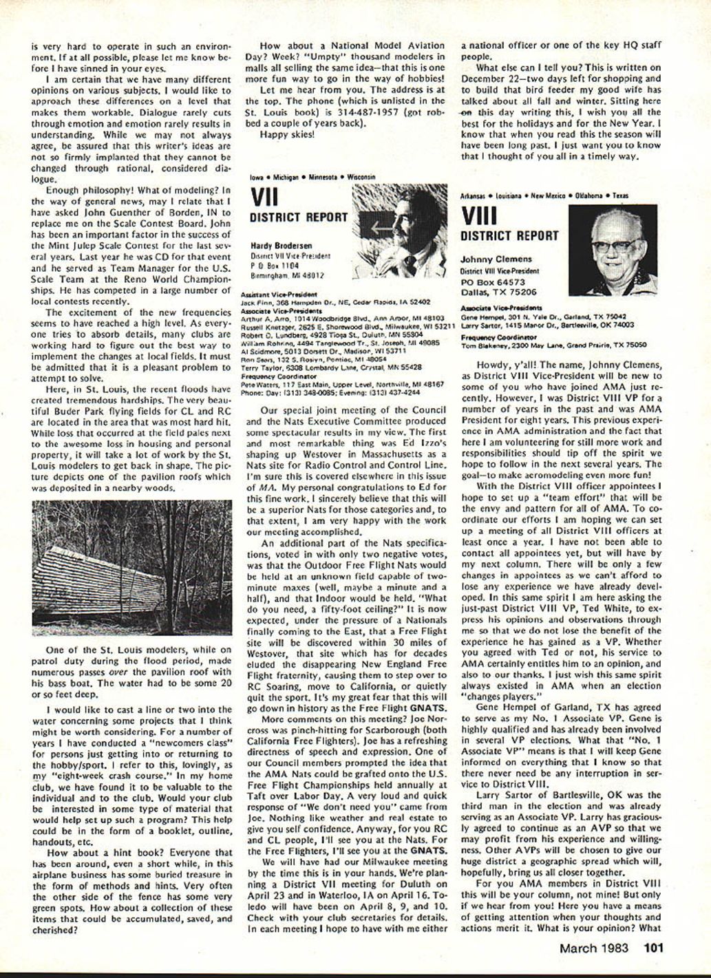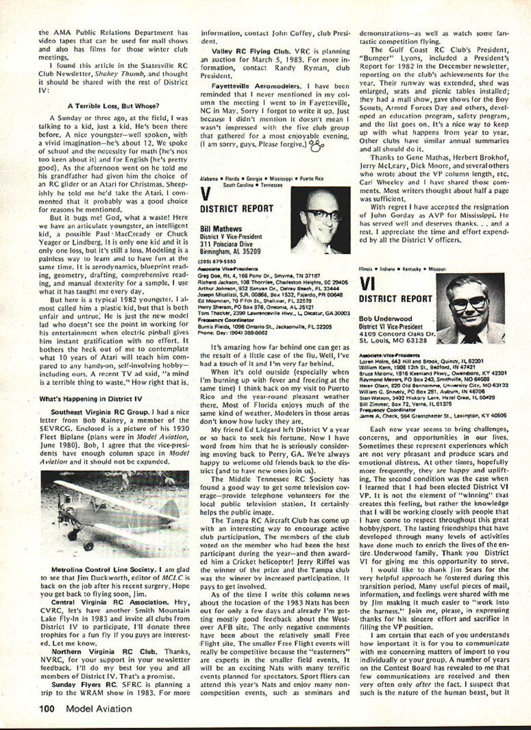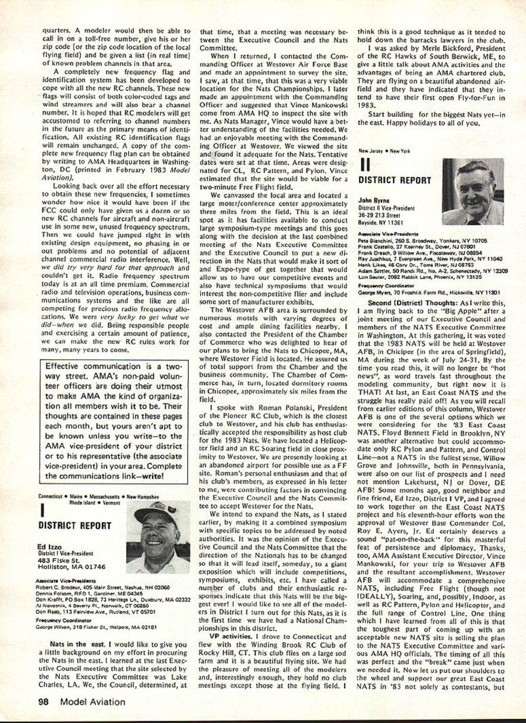 Some Thoughts New NC Channels Bob Aberle Chairman AMAs RC Frequency Committee also Technical Editor Flying Models magazine latter capacity produced article published Flying Models several weeks prior issue Mod el Aviation article reprinted because provides excellent picture what current RC frequency situation go Hal Carstens publisher Flying Models graciously agreed reprint ing public service help gain wider distribution information time read article will late January early February So let backtrack little fill major event took place last November November 4 1982 FCC voted unani mously approve series new RC chan nels FCCs effectivity date new channels December 20 1982 AMA sanctioned competition purposes some new channels became effective Janu ary 1 1983 correspond start new calendar year flying season effort obtain new channels took roughly four five years concen trated carefully planned work part Academy Model Aeronautics AMA its RC Frequency Committee its attorneys RC industry representatives initial proposal new RC channels sub mitted FCC 1978 final proposal directed FCC September 1980 took bit over two years have everything flow through typical govern ment rule-making processes thats behind us now have important very responsible job make sure new RC channels put proper safe use set two charts summarizing new RC channels corresponding new identification control flags will found March issue Flying Models also February issue Model Aviation ma terial has printed such way can easily removed magazine posted convenient reference purposes will notice chart covers new RC model aircraft channels new channels specifically intended control model aircraft will located between 72 73 MHz second chart covers surface models such RC cars RC boats new channels will 75 MHz frequencies new RC rules now clear separation 2 MHz between RC aircraft other types radio controlled models done give faction hobby total autonomy can provide peaceful safe coexistence RC model operations model park facilities flying fields race tracks andlor ponds available single location things will become quite obvious looking charts new aircraft non-aircraft sur face models channels will made available use day new rules Well old RC channels located directly midst new channels fact necessitated very carefully planned phase-in scheme permits continued safe use existing RC channels five-year period until January 11988 new channels gradually introduced service As will see charts day new rules January 1 1983 RC aircraft modelers will have use existing seven plus 11 new channels odd ball aircraft channel 75640 MHz can legally used full five-year withdrawal period aircraft modelers encouraged leave particular channel soon possible Once aircraft modeler leaves 75640 MHz channel will have com plete separation hobby factions men tioned earlier Non-aircraft modelers will have continued use existing three chan nels 72 MHz 71 new RC channels effective January 1 1983 instance RC car boat operators urged con vert equipment operating three existing 72 MHz channels up new channels 75 MHz Again compliance recommendation will prompt total separation aircraft non-aircraft factions RC hobby soon possible big questions everyones mind point may 1 should convert present RC equipment new channel 2 present RC equipment really capable being converted As just noted aircraft modeler operating 75640 MHz advised convert right away same applies non-aircraft modelers operat ing presently 72160 72320 72960 MHzit suggested instances convert new channel right away unlucky modelers has experiencing severe interference commercial radio stations operating continued next page March 1983 93 AMA HQ Executive Director including reports AMA President Executive VP Vice-Presidents ACADEMY OF MODEL AERONAUTICS Samuel Morse Dr Reston VA 22090 VVA d v ~on Ogaruzt o MIVIM uwsnp presenseiun mauc uy ivu rresueii John Grigg right Bob jerle Chairman AMAs Radio Frequency Committee outstanding sustained leadership AMAs four-year campaign obtain new RC frequencies award approved AMA Executive Council presentation made November 28 1982 legally same radio frequency spectrum would obviously want convert new hopefully clear RC channel right away havent experienced interference dont fit categories above might well hold off converting new channels least time being likely RC manufactur ers service facilities will initially swamped orders frequency conversions will prompt large backlog work re sulting delays must consider real world situation As far what system can converted best knowledge existing RC systems can converted new frequencies cost conver sion will vary $1000 complete return postage included high $3000 excluding return postage depending particular manufacturer RC transmit ter sold within last 10 years has type-certified FCC capable operation under 10 kHz bandwidth Re member said type-certified means representative sample tested manufacturered have no assurance therefore particular transmitter operating a narrow band width good part suitable tuning qualified service technician em ploying spectrum analyzer just about present RC transmitters can made conform narrow-band requirements future specifically eight years now What means present trans mitter new crystal proper retuning can used indefinitelyit will never become obsolete key point service technician must use spectrum analyzer units cost upwards $8000 $15000 friendly local repairman doesnt have devices care ful simple oscilliscope spectrum analyzer So far have discussed transmitter opera tions What about receiver Most present RC reveivers can made operate 40 kHz channel spacing Several manufacturers already claiming 20 kHz selectivity cause existing channel separation 80 kI-lz greater selectivity major factor concerned past Again suitable re-tuning qualified service technician time frequency conver sion current receivers can made operate 40 kHz channel spacing channel spacing will permit solid RC opera tion eight-year period endi