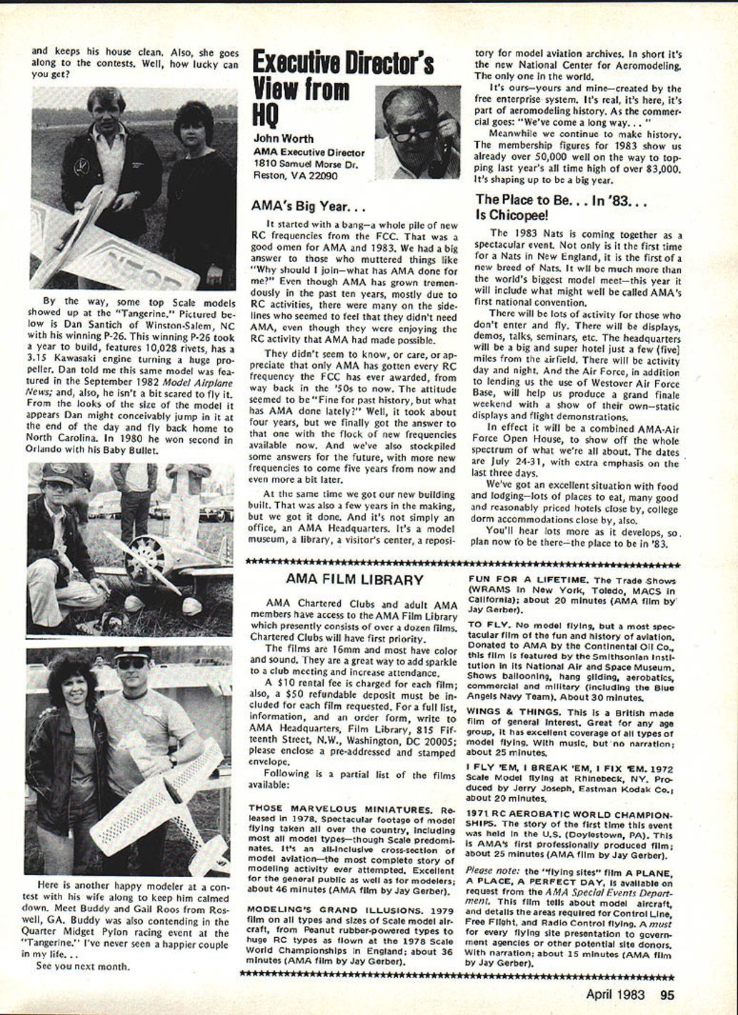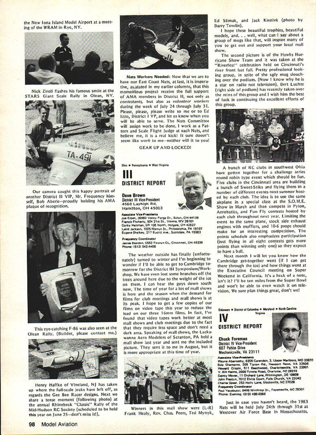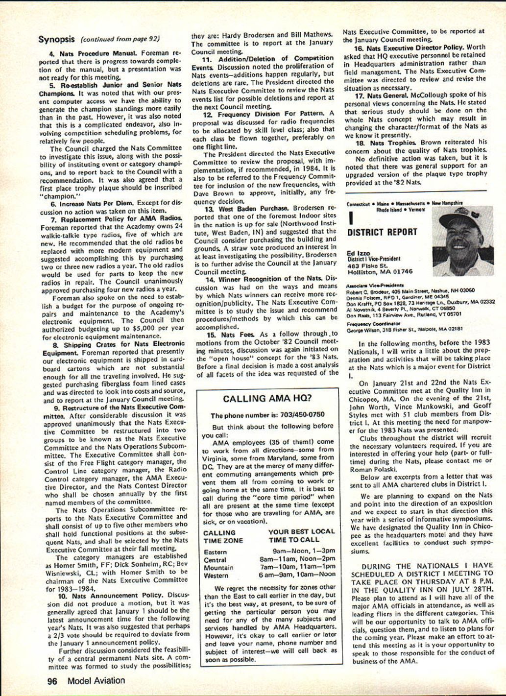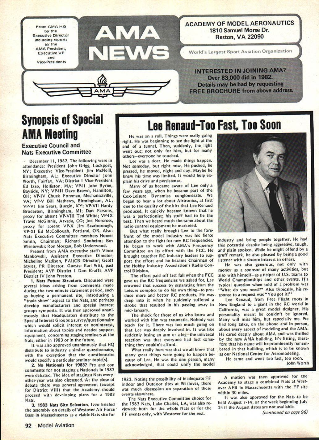 p h L Synopsis ot Special AMA Meeting Executive Council Nats Executive Committee December 11 1982 following attendance President John Grigg Lokpprt NY Executive Vice-President Jim McNeill Birmingham AL Executive Director John Worth Fairfax VA District Vice-President Ed Izzo Holliston MA VP-li John Byrne Bayside NY VP-Ill Dave Brown Hamilton OH VP-IV Chuck Foreman Mechanicsville VA VP-V Bill Mathews Birmingham AL VP-VI Jim Sears Burgin KY VP-VII Hardy Brodersen Birmingham Ml Dan Parsons proxy absent VP-VIII Ted White VP-IX Travis McGinnis Arvada CO Joe Norcross proxy absent VP-X Jim Scarborough VP-XI Ed McCollough Portland OR Also Nats Executive Committee members Homer Smith Chairman Richard Sonheim Bev Wisniewski Ron Morgan Bob Underwood Present AMA executive staff Vince Mankowski Assistant Executive Director Micheline Madison FAI/CB Director Geoff Styles PR Director Guests Earl Witt past President AVP District Don Krafft AVP District IV John Preston 1 Nats Future Structure Discussed several ideas arising comments made during two minute statement period such buying permanent site introducing trade show aspect Nats perhaps develop manufacturers special interest groups symposia approved unani mously Headquarters distribute Special Interest Groups survey/questionnaire would solicit interest noninterest information about topics needed support equipment concerning staging seminars Nats either 1983 future also approved unanimously HQ distribute industry similar questionnaire exception questionnaire would specify particular seminar topics 2 No Nationals 1983 Pro con comments staging Nationals 1983 debated idea staging Nats everyother-year also discussed close debate general agreement except District VIII Academy should proceed developing plans 1983 N ats 3 1983 Nats Site Selection Izzo briefed assembly details Westover Air Force Base Massachusetts viable Nats site roll Things really going right beginning see light end tunnel suddenly light went out him otherseveryone touched Lee doer made things happen someday right now pushed pressed moved night day Maybe knew time limited would help ex plain drive persistence us became aware Lee few years ago became part Cox-Leisure Dynamics conglomerate began hear lot about Airtronics first due quality kits Lee Renaud produced quickly became known perfectionist stuff best heard much same about radio control equipment marketed what really brought Lee fore front model industry fierce attention fight new RC frequencies began work AMAs Frequency Committee its effort FCC brought together RC industry leaders sup port effort became Chairman Hobby Industry Associations Radio Con trol Division effort paid off last fall FCC gave us RC frequencies asked Lee crowned success separating Leisure complex own thingto pro duce better RC products deep suddenly suffered stroke resulted passing away mid-January shock us know worked him traumatic Nobody ready too much going Lee deeply involved like suddenly losing arm legthe universal reaction everyone lost some thing couldnt afford What really hurt knew great things going happen cause Lee person acknowledged could unify model 1983 Noting possibility inadequate FF Indoor Outdoor sites Westover much discussion separation events elsewhere Nats Executive Committee choice 1983 Nats Lake Charles LA also re viewed both whole Nats FF events Westover rest industry bring people together potential despite being aggressive tough plain spoken might offend gruff remark also pleased being good listener sincere interest others also generous money sponsor activities also himseltas nelper US teams World Championships other events typical question told problem What need Also typically re sponse request got itl~ Lee Renaud Free Flight roots New England giant RC world California great model designer personality meant couldnt ignored will miss him especially long talks phone person about aspect modeling AMA cared deeply about AMA thrilled new AMA building Its fitting fore name will prominently remem bered building known National Center Aeromodeling came went too fast too soon John Worth motion tnen approved Academy stage combined Nats Westover AFB Massachusetts FF site within 30 miles also approved Nats held August 7-14 week beginning July 24 August dates available continued page 96 92 Model Aviation AMA HQ Executive Director including reports AMA President Executive VP Vice-Presidents ACADEMY OF MODEL AERONAUTICS 1810 Samuel Morse Dr Reston VA 22090 Worlds Larqest Sport Aviation Oryani~ton Lee RenaudToo Fast Too Soon Presidents Corner President ACADEMY OF MODEL AERONAUTICS JOHN C GRIGG 6387 Badger DriveHome 716 434-3955 Lockport NY 14094Work 716 631-6314 GOODBYE Farewell see ya laterterms use leaving friend very dear friend Lee Re naud bid farewell us early year soar forever modelers have gone before Lee founder owner mov ing force behind Airtronics Inc Downey CA designer very popular Aquila Sagitta sailplanes among others recent years marketed very fine Airtronics brand radio control system staunch supporter AMA FAI Soaring team things modeling efforts added gaining great deal support new AMA building will greatly missed hobby know join expressing deepest sympathies family friends ELECTRIFYING have talked about electric-powered models before yet time get close realize future model ing may lie power source Flying fields lost daily seems due noise com plaintselectric can solve problem New developments increasing power reliability power medium now rate capability power source avail able short Schnuerle 61 state ment may out date time reaches print Emil Giezendanner rumor has intends fly electric-powered Pattern airplane 1983 World Aerobatic Championships Pensacola Electric power may soon have its own World Championships time US AMA begin prepare electric future Toward end have asked AMA VP appoint delegate newly-to-be established electric flight team selection com mittee will necessary set up series qualification meets final team selection meet time p
