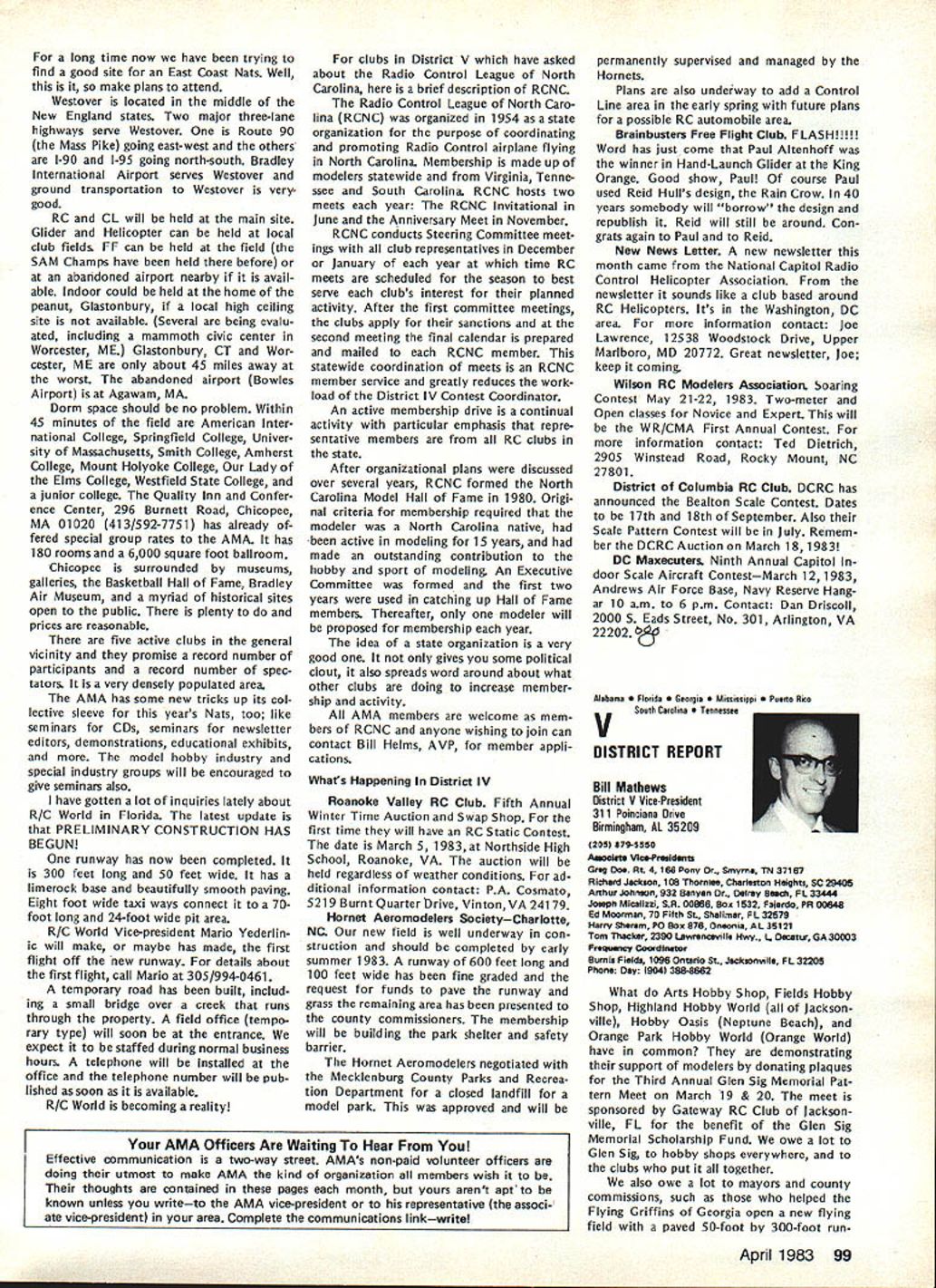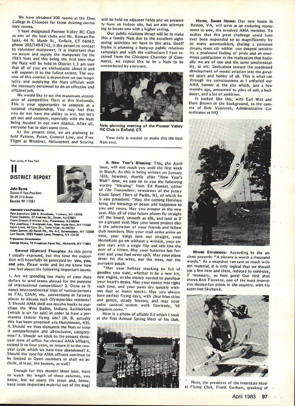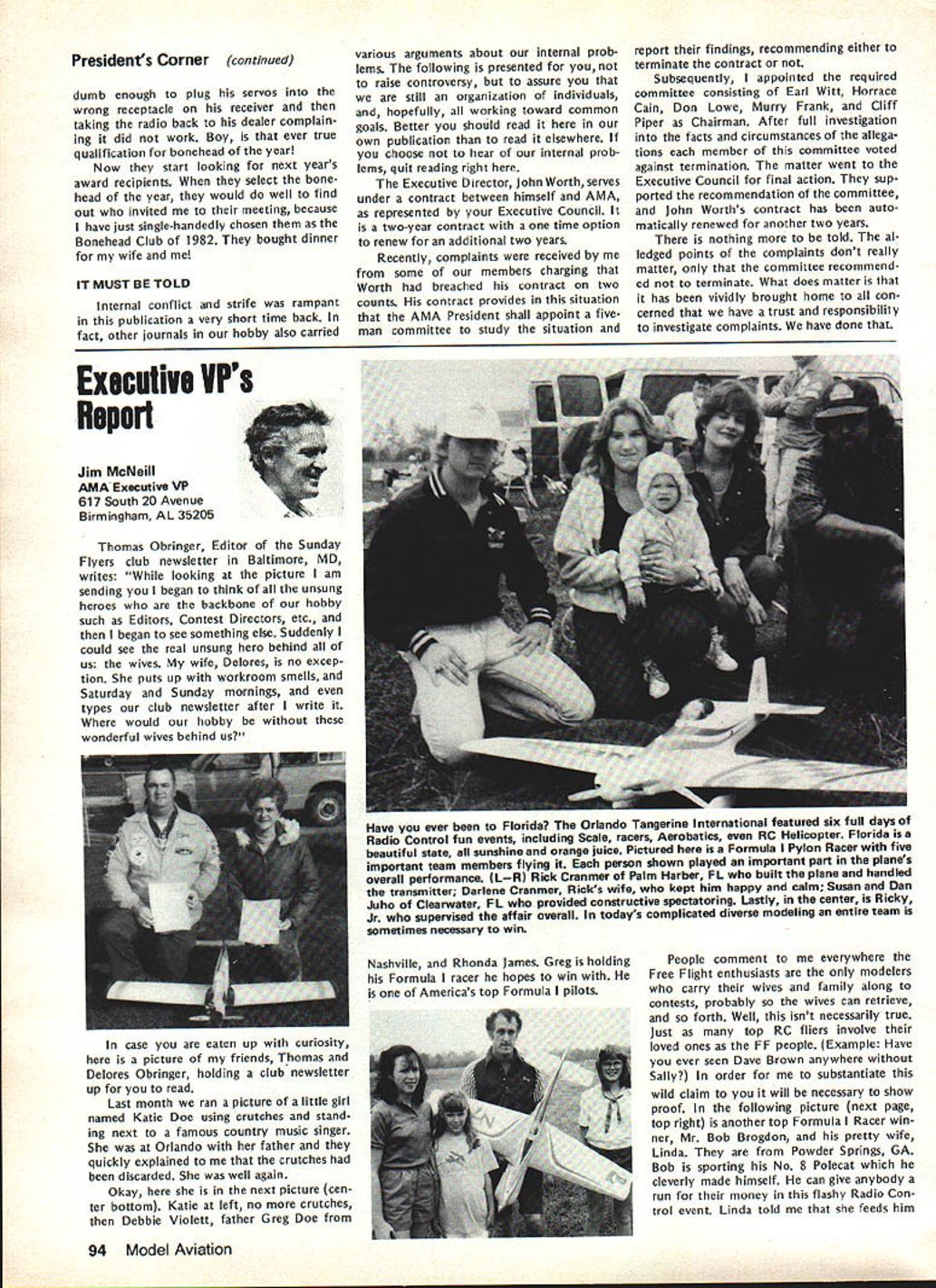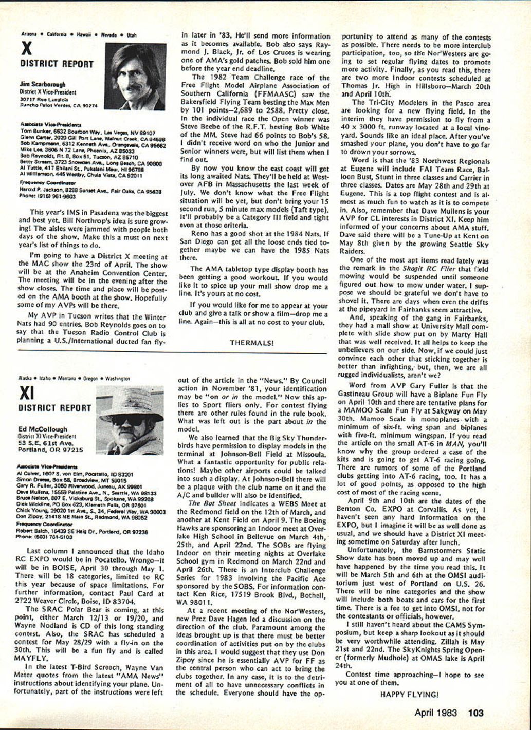 p h L Synopsis ot Special AMA Meeting Executive Council Nats Executive Committee December 11 1982 following attendance President John Grigg Lokpprt NY Executive Vice-President Jim McNeill Birmingham AL Executive Director John Worth Fairfax VA District Vice-President Ed Izzo Holliston MA VP-li John Byrne Bayside NY VP-Ill Dave Brown Hamilton OH VP-IV Chuck Foreman Mechanicsville VA VP-V Bill Mathews Birmingham AL VP-VI Jim Sears Burgin KY VP-VII Hardy Brodersen Birmingham Ml Dan Parsons proxy absent VP-VIII Ted White VP-IX Travis McGinnis Arvada CO Joe Norcross proxy absent VP-X Jim Scarborough VP-XI Ed McCollough Portland OR Also Nats Executive Committee members Homer Smith Chairman Richard Sonheim Bev Wisniewski Ron Morgan Bob Underwood Present AMA executive staff Vince Mankowski Assistant Executive Director Micheline Madison FAI/CB Director Geoff Styles PR Director Guests Earl Witt past President AVP District Don Krafft AVP District IV John Preston 1 Nats Future Structure Discussed several ideas arising comments made during two minute statement period such buying permanent site introducing trade show aspect Nats perhaps develop manufacturers special interest groups symposia approved unani mously Headquarters distribute Special Interest Groups survey/questionnaire would solicit interest noninterest information about topics needed support equipment concerning staging seminars Nats either 1983 future also approved unanimously HQ distribute industry similar questionnaire exception questionnaire would specify particular seminar topics 2 No Nationals 1983 Pro con comments staging Nationals 1983 debated idea staging Nats everyother-year also discussed close debate general agreement except District VIII Academy should proceed developing plans 1983 N ats 3 1983 Nats Site Selection Izzo briefed assembly details Westover Air Force Base Massachusetts viable Nats site roll Things really going right beginning see light end tunnel suddenly light went out him otherseveryone touched Lee doer made things happen someday right now pushed pressed moved night day Maybe knew time limited would help ex plain drive persistence us became aware Lee few years ago became part Cox-Leisure Dynamics conglomerate began hear lot about Airtronics first due quality kits Lee Renaud produced quickly became known perfectionist stuff best heard much same about radio control equipment marketed what really brought Lee fore front model industry fierce attention fight new RC frequencies began work AMAs Frequency Committee its effort FCC brought together RC industry leaders sup port effort became Chairman Hobby Industry Associations Radio Con trol Division effort paid off last fall FCC gave us RC frequencies asked Lee crowned success separating Leisure complex own thingto pro duce better RC products deep suddenly suffered stroke resulted passing away mid-January shock us know worked him traumatic Nobody ready too much going Lee deeply involved like suddenly losing arm legthe universal reaction everyone lost some thing couldnt afford What really hurt knew great things going happen cause Lee person acknowledged could unify model 1983 Noting possibility inadequate FF Indoor Outdoor sites Westover much discussion separation events elsewhere Nats Executive Committee choice 1983 Nats Lake Charles LA also re viewed both whole Nats FF events Westover rest industry bring people together potential despite being aggressive tough plain spoken might offend gruff remark also pleased being good listener sincere interest others also generous money sponsor activities also himseltas nelper US teams World Championships other events typical question told problem What need Also typically re sponse request got itl~ Lee Renaud Free Flight roots New England giant RC world California great model designer personality meant couldnt ignored will miss him especially long talks phone person about aspect modeling AMA cared deeply about AMA thrilled new AMA building Its fitting fore name will prominently remem bered building known National Center Aeromodeling came went too fast too soon John Worth motion tnen approved Academy stage combined Nats Westover AFB Massachusetts FF site within 30 miles also approved Nats held August 7-14 week beginning July 24 August dates available continued page 96 92 Model Aviation AMA HQ Executive Director including reports AMA President Executive VP Vice-Presidents ACADEMY OF MODEL AERONAUTICS 1810 Samuel Morse Dr Reston VA 22090 Worlds Larqest Sport Aviation Oryani~ton Lee RenaudToo Fast Too Soon Presidents Corner President ACADEMY OF MODEL AERONAUTICS JOHN C GRIGG 6387 Badger DriveHome 716 434-3955 Lockport NY 14094Work 716 631-6314 GOODBYE Farewell see ya laterterms use leaving friend very dear friend Lee Re naud bid farewell us early year soar forever modelers have gone before Lee founder owner mov ing force behind Airtronics Inc Downey CA designer very popular Aquila Sagitta sailplanes among others recent years marketed very fine Airtronics brand radio control system staunch supporter AMA FAI Soaring team things modeling efforts added gaining great deal support new AMA building will greatly missed hobby know join expressing deepest sympathies family friends ELECTRIFYING have talked about electric-powered models before yet time get close realize future model ing may lie power source Flying fields lost daily seems due noise com plaintselectric can solve problem New developments increasing power reliability power medium now rate capability power source avail able short Schnuerle 61 state ment may out date time reaches print Emil Giezendanner rumor has intends fly electric-powered Pattern airplane 1983 World Aerobatic Championships Pensacola Electric power may soon have its own World Championships time US AMA begin prepare electric future Toward end have asked AMA VP appoint delegate newly-to-be established electric flight team selection com mittee will necessary set up series qualification meets final team selection meet time p