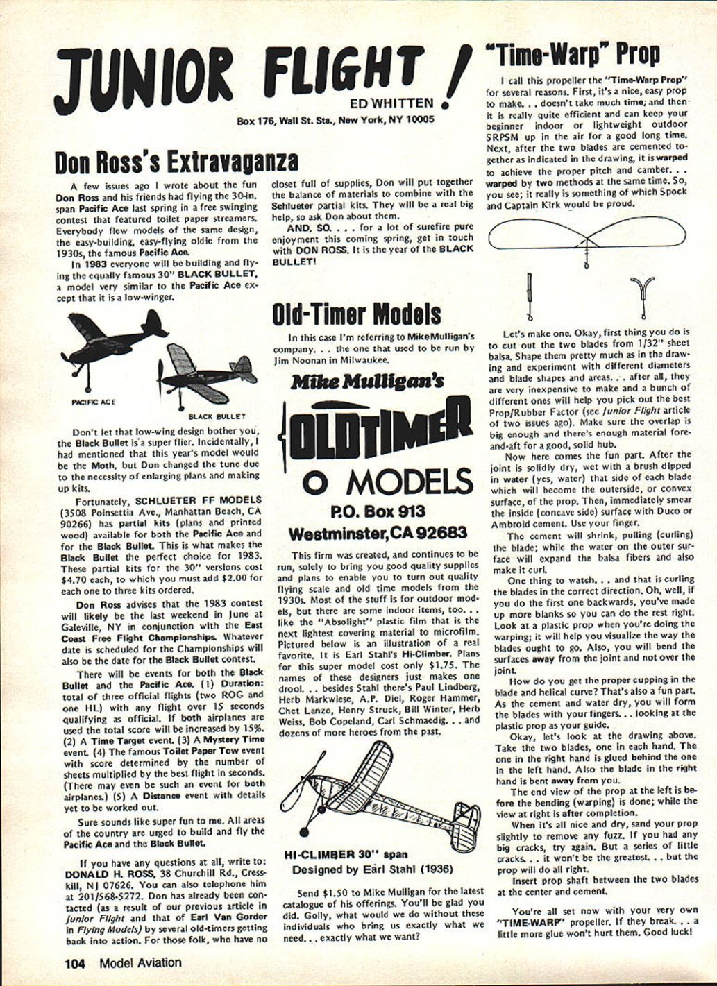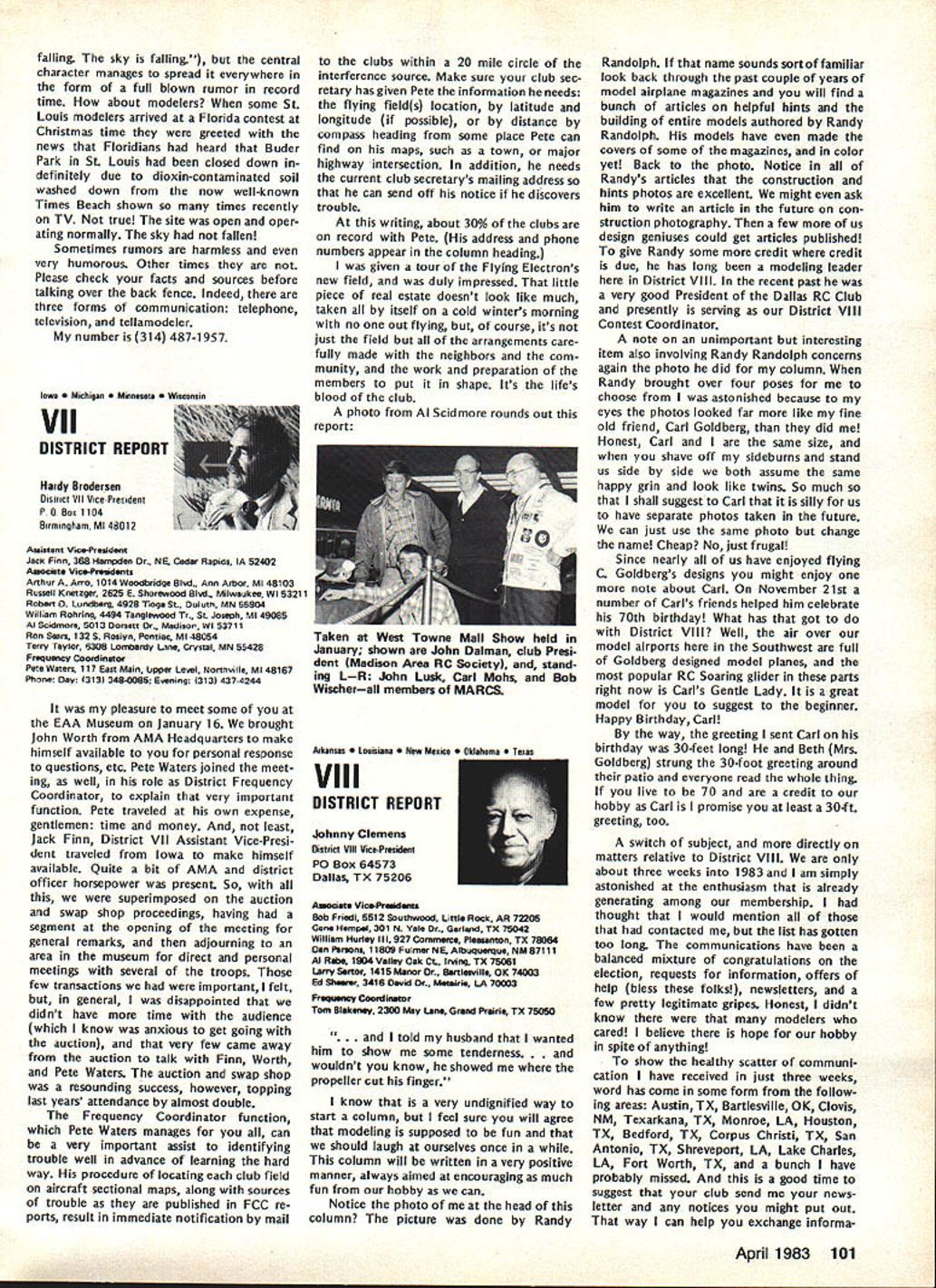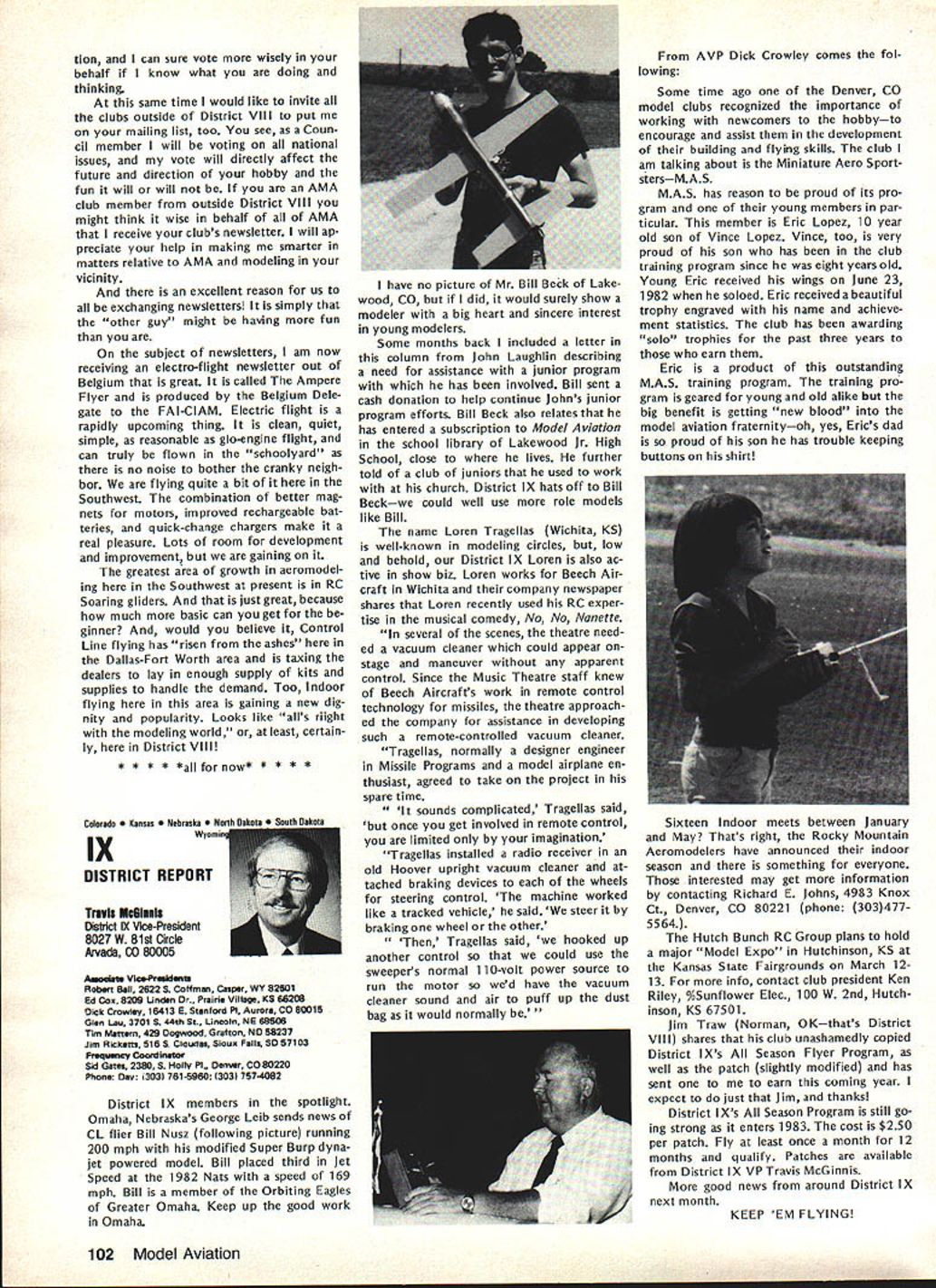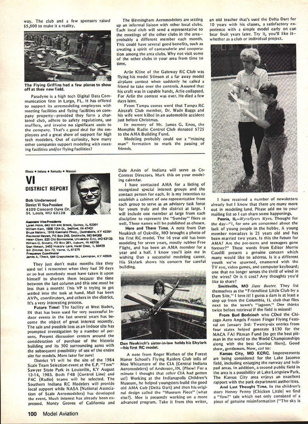 p h L Synopsis ot Special AMA Meeting Executive Council Nats Executive Committee December 11 1982 following attendance President John Grigg Lokpprt NY Executive Vice-President Jim McNeill Birmingham AL Executive Director John Worth Fairfax VA District Vice-President Ed Izzo Holliston MA VP-li John Byrne Bayside NY VP-Ill Dave Brown Hamilton OH VP-IV Chuck Foreman Mechanicsville VA VP-V Bill Mathews Birmingham AL VP-VI Jim Sears Burgin KY VP-VII Hardy Brodersen Birmingham Ml Dan Parsons proxy absent VP-VIII Ted White VP-IX Travis McGinnis Arvada CO Joe Norcross proxy absent VP-X Jim Scarborough VP-XI Ed McCollough Portland OR Also Nats Executive Committee members Homer Smith Chairman Richard Sonheim Bev Wisniewski Ron Morgan Bob Underwood Present AMA executive staff Vince Mankowski Assistant Executive Director Micheline Madison FAI/CB Director Geoff Styles PR Director Guests Earl Witt past President AVP District Don Krafft AVP District IV John Preston 1 Nats Future Structure Discussed several ideas arising comments made during two minute statement period such buying permanent site introducing trade show aspect Nats perhaps develop manufacturers special interest groups symposia approved unani mously Headquarters distribute Special Interest Groups survey/questionnaire would solicit interest noninterest information about topics needed support equipment concerning staging seminars Nats either 1983 future also approved unanimously HQ distribute industry similar questionnaire exception questionnaire would specify particular seminar topics 2 No Nationals 1983 Pro con comments staging Nationals 1983 debated idea staging Nats everyother-year also discussed close debate general agreement except District VIII Academy should proceed developing plans 1983 N ats 3 1983 Nats Site Selection Izzo briefed assembly details Westover Air Force Base Massachusetts viable Nats site roll Things really going right beginning see light end tunnel suddenly light went out him otherseveryone touched Lee doer made things happen someday right now pushed pressed moved night day Maybe knew time limited would help ex plain drive persistence us became aware Lee few years ago became part Cox-Leisure Dynamics conglomerate began hear lot about Airtronics first due quality kits Lee Renaud produced quickly became known perfectionist stuff best heard much same about radio control equipment marketed what really brought Lee fore front model industry fierce attention fight new RC frequencies began work AMAs Frequency Committee its effort FCC brought together RC industry leaders sup port effort became Chairman Hobby Industry Associations Radio Con trol Division effort paid off last fall FCC gave us RC frequencies asked Lee crowned success separating Leisure complex own thingto pro duce better RC products deep suddenly suffered stroke resulted passing away mid-January shock us know worked him traumatic Nobody ready too much going Lee deeply involved like suddenly losing arm legthe universal reaction everyone lost some thing couldnt afford What really hurt knew great things going happen cause Lee person acknowledged could unify model 1983 Noting possibility inadequate FF Indoor Outdoor sites Westover much discussion separation events elsewhere Nats Executive Committee choice 1983 Nats Lake Charles LA also re viewed both whole Nats FF events Westover rest industry bring people together potential despite being aggressive tough plain spoken might offend gruff remark also pleased being good listener sincere interest others also generous money sponsor activities also himseltas nelper US teams World Championships other events typical question told problem What need Also typically re sponse request got itl~ Lee Renaud Free Flight roots New England giant RC world California great model designer personality meant couldnt ignored will miss him especially long talks phone person about aspect modeling AMA cared deeply about AMA thrilled new AMA building Its fitting fore name will prominently remem bered building known National Center Aeromodeling came went too fast too soon John Worth motion tnen approved Academy stage combined Nats Westover AFB Massachusetts FF site within 30 miles also approved Nats held August 7-14 week beginning July 24 August dates available continued page 96 92 Model Aviation AMA HQ Executive Director including reports AMA President Executive VP Vice-Presidents ACADEMY OF MODEL AERONAUTICS 1810 Samuel Morse Dr Reston VA 22090 Worlds Larqest Sport Aviation Oryani~ton Lee RenaudToo Fast Too Soon Presidents Corner President ACADEMY OF MODEL AERONAUTICS JOHN C GRIGG 6387 Badger DriveHome 716 434-3955 Lockport NY 14094Work 716 631-6314 GOODBYE Farewell see ya laterterms use leaving friend very dear friend Lee Re naud bid farewell us early year soar forever modelers have gone before Lee founder owner mov ing force behind Airtronics Inc Downey CA designer very popular Aquila Sagitta sailplanes among others recent years marketed very fine Airtronics brand radio control system staunch supporter AMA FAI Soaring team things modeling efforts added gaining great deal support new AMA building will greatly missed hobby know join expressing deepest sympathies family friends ELECTRIFYING have talked about electric-powered models before yet time get close realize future model ing may lie power source Flying fields lost daily seems due noise com plaintselectric can solve problem New developments increasing power reliability power medium now rate capability power source avail able short Schnuerle 61 state ment may out date time reaches print Emil Giezendanner rumor has intends fly electric-powered Pattern airplane 1983 World Aerobatic Championships Pensacola Electric power may soon have its own World Championships time US AMA begin prepare electric future Toward end have asked AMA VP appoint delegate newly-to-be established electric flight team selection com mittee will necessary set up series qualification meets final team selection meet time p
