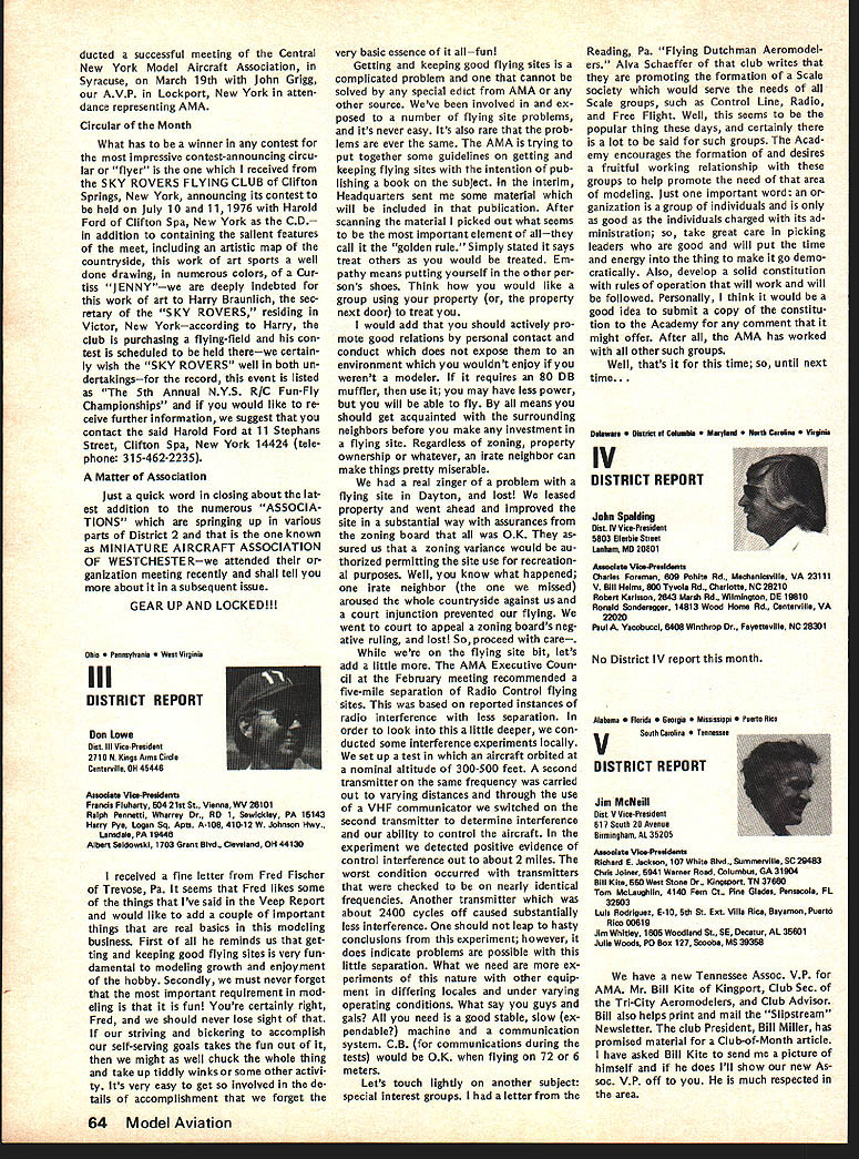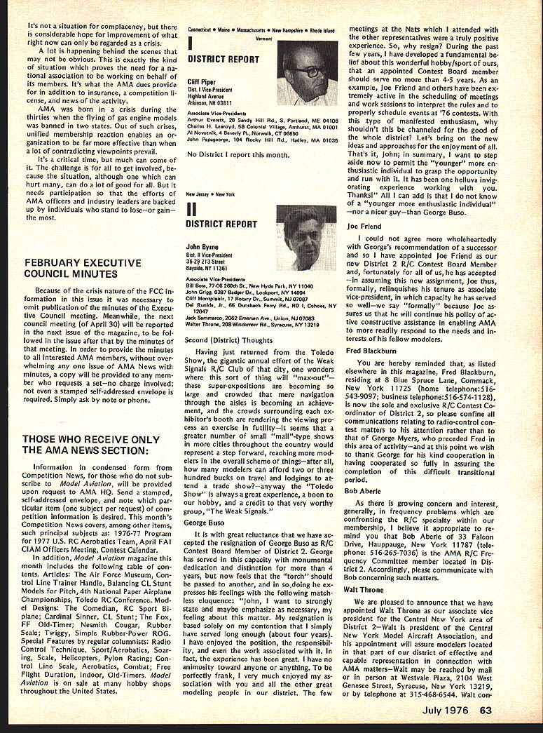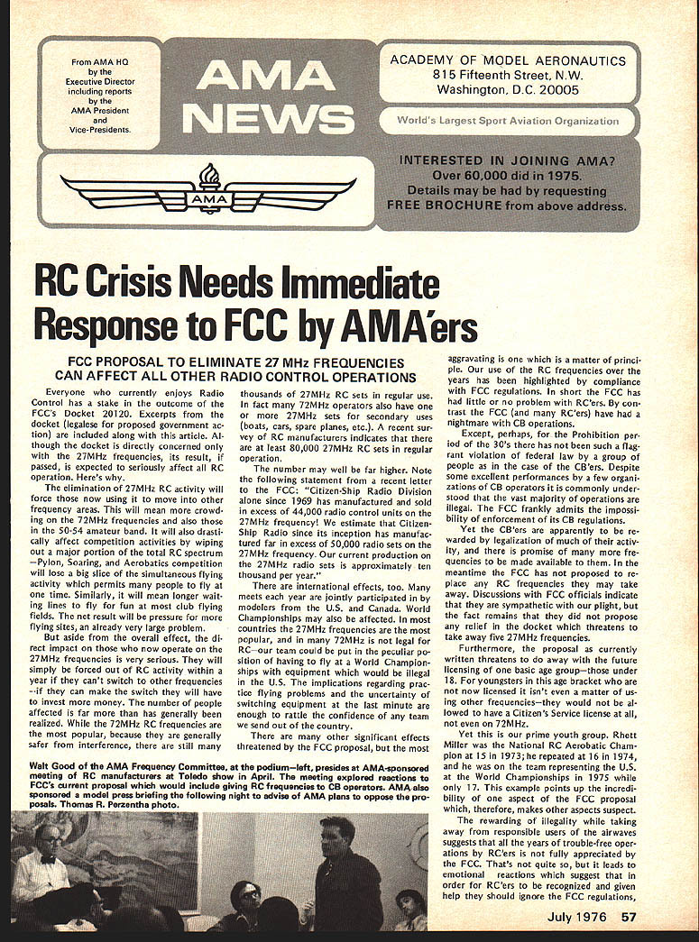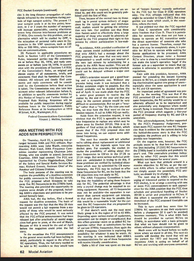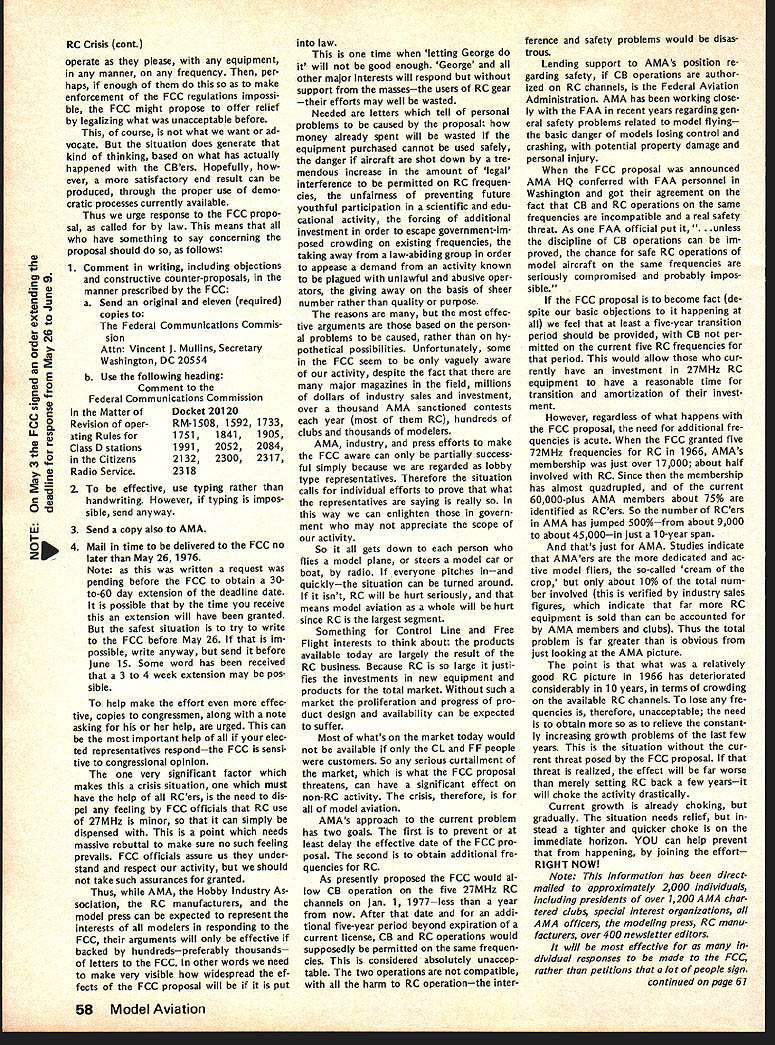 FCC PROPOSAL TO ELIMINATE 27 MHz FREQUENCIES CAN AFFECT ALL OTHER RADIO CONTROL OPERATIONS Everyone currently enjoys Radio Control has stake outcome FCCs Docket 20120 Excerpts docket legalese proposed government ac tion included along article Al though docket directly concerned 27MHz frequencies its result passed expected seriously affect RC operation Heres elimination 27MHz RC activity will force now using move other frequency areas will mean crowd ing 72MHz frequencies also 50-54 amateur band will also drasti cally affect competition activities wiping out major portion total RC spectrum Pylon Soaring Aerobatics competition will lose big slice simultaneous flying activity permits people fly time Similarly will mean longer wait ing lines fly fun club flying fields net result will pressure flying sites already very large problem aside overall effect di rect impact now operate 27MHz frequencies very serious will simply forced out RC activity within year cant switch other frequencies --if can make switch will have invest money number people affected far has generally realized 72MHz RC frequencies popular because generally safer interference still thousands 27MHz RC sets regular use fact 72MHz operators also have 27MHz sets secondary uses boats cars spare planes etc4 recent sur vey RC manufacturers indicates least 80000 27MHz RC sets regular operation number may well far higher Note following statement recent letter FCC Citizen-Ship Radio Division alone since 1969 has manufactured sold excess 44000 radio control units 27MHz frequency estimate Citizen Ship Radio since its inception has manufac tured far excess 50000 radio sets 27MHz frequency current production 27MHz radio sets approximately ten thousand per year international effects too meets year jointly participated modelers US Canada World Championships may also affected countries 27MHz frequencies popular 72MHz legal RCour team could put peculiar po sition having fly World Champion ships equipment would illegal US implications regarding prac tice flying problems uncertainty switching equipment last minute enough rattle confidence team send out country other significant effects threatened FCC proposal Walt Good AMA Frequency Committee podiumleft presides AMA-sponsored meeting RC manufacturers Toledo show April meeting explored reactions FCCs current proposal would include giving RC frequencies CB operators AM&also sponsored model press briefing following night advise AMA plans oppose pro posals Thomas R Perzentha ohoto aggravating matter princi ple use RC frequencies over years has highlighted compliance FCC regulations short FCC has little no problem RCers con trast FCC RCers have nightmare CB operations Except perhaps Prohibition per iod 30s has such flag rant violation federal law group people case CBers Despite some excellent performances few organi zations CB operators commonly under stood vast majority operations illegal FCC frankly admits impossi bility enforcement its CB regulations Yet CBers apparently re warded legalization much activ ity promise fre quencies made available meantime FCC has proposed re place RC frequencies may take away Discussions FCC officials indicate sympathetic plight fact remains did propose relief docket threatens take away five 27MHz frequencies Furthermore proposal currently written threatens away future licensing basic age groupthose under 18 youngsters age bracket now licensed isnt matter us ing other frequenciesthey would al lowed have Citizens Service license 72MHz Yet prime youth group Rhett Miller National RC Aerobatic Cham pion 15 1973 repeated 16 1974 team representing US World Championships 1975 17 example points up incredi bility aspect FCC proposal therefore makes other aspects suspect rewarding illegality taking away responsible users airwaves suggests years trouble-free oper ations RCers fully appreciated FCC Thats quite leads emotional reactions suggest order RCers recognized given help should ignore FCC regulations AMA HQ Executive Director including reports AMA President Vice-Presidents ACADEMY OF MODEL AERONAUTICS 815 Fifteenth Street NW Washington DC 20005 RC Crisis Needs Immediate Response FCC AMAers RC Crisis cont operate please equipment manner frequency per haps enough make enforcement FCC regulations impossi ble FCC might propose offer relief legalizing what unacceptable before course what want ad vocate situation does generate kind thinking based what has actually happened CBers Hopefully ever satisfactory end result can produced through proper use demo cratic processes currently available Thus urge response FCC propo sal called law means have something say concerning proposal should follows 1 Comment writing including objections constructive counter-proposals manner prescribed FCC a Send original eleven required copies Federal Communications Commis sion Attn Vincent J Mullins Secretary Washington DC 20554 b Use following heading Comment Federal Communications Commission Matter ofDocket20120 Revision oper-RM-1508 1592 sting Rules for17511841 Class D stations19912052 Citizens21322300 Radio Service2318 2 To effective use typing rather handwriting However typing impos sible send anyway 3 Send copy also AMA 4 Mail time delivered FCC no later May 26 1976 Note as written request pending before FCC obtain 30 to-60 day extension deadline date possible time receive extension will have granted safest situation try write FCC before May 26 im possible write anyway send before June 15 Some word has received 3 4 week extension may pos sible help make effort effec tive copies congressmen along note asking help urged can important help elec ted representatives respondthe FCC sensi tive congressional opinion very significant factor makes crisis situation must have help RCers need dis pel feeling FCC officials RC use 27MHz minor can simply dispensed point needs massive rebuttal make sure no such feeling prevails FCC officials assure us under stand respect activity should take such assurances gran
