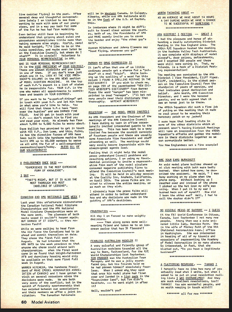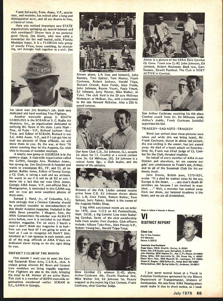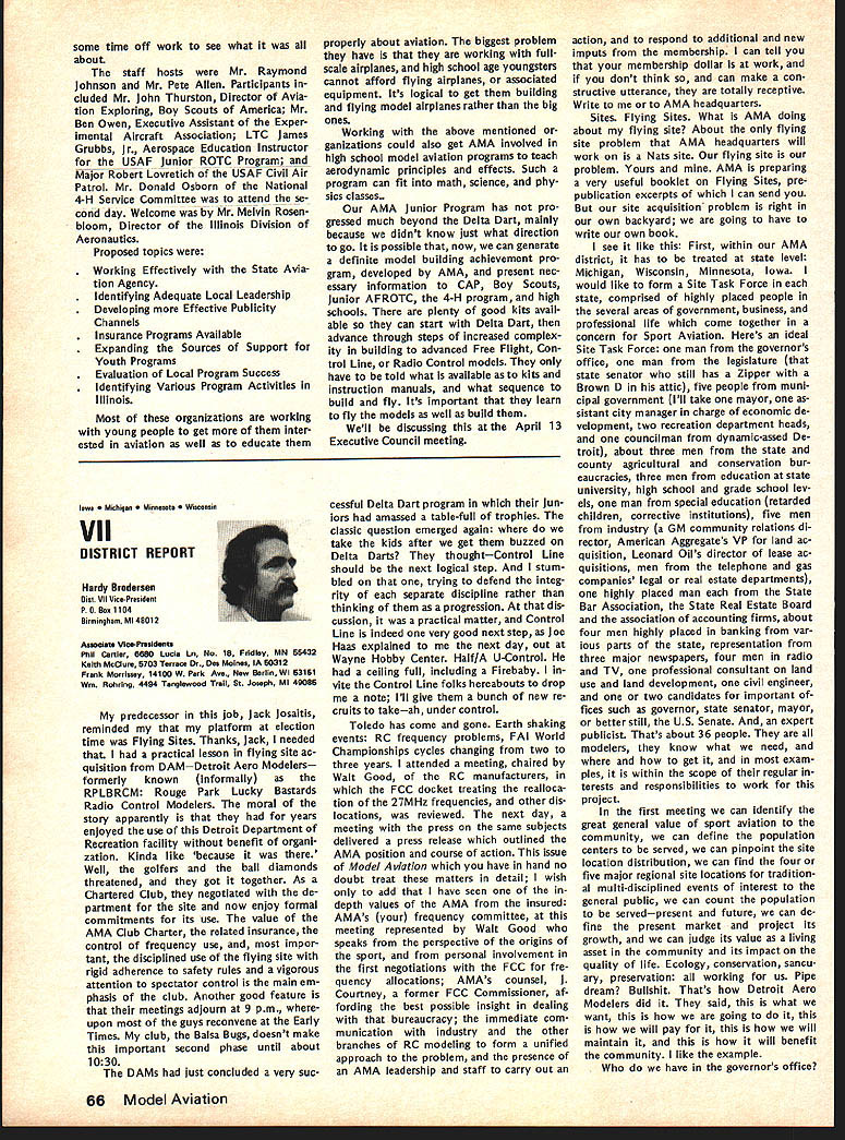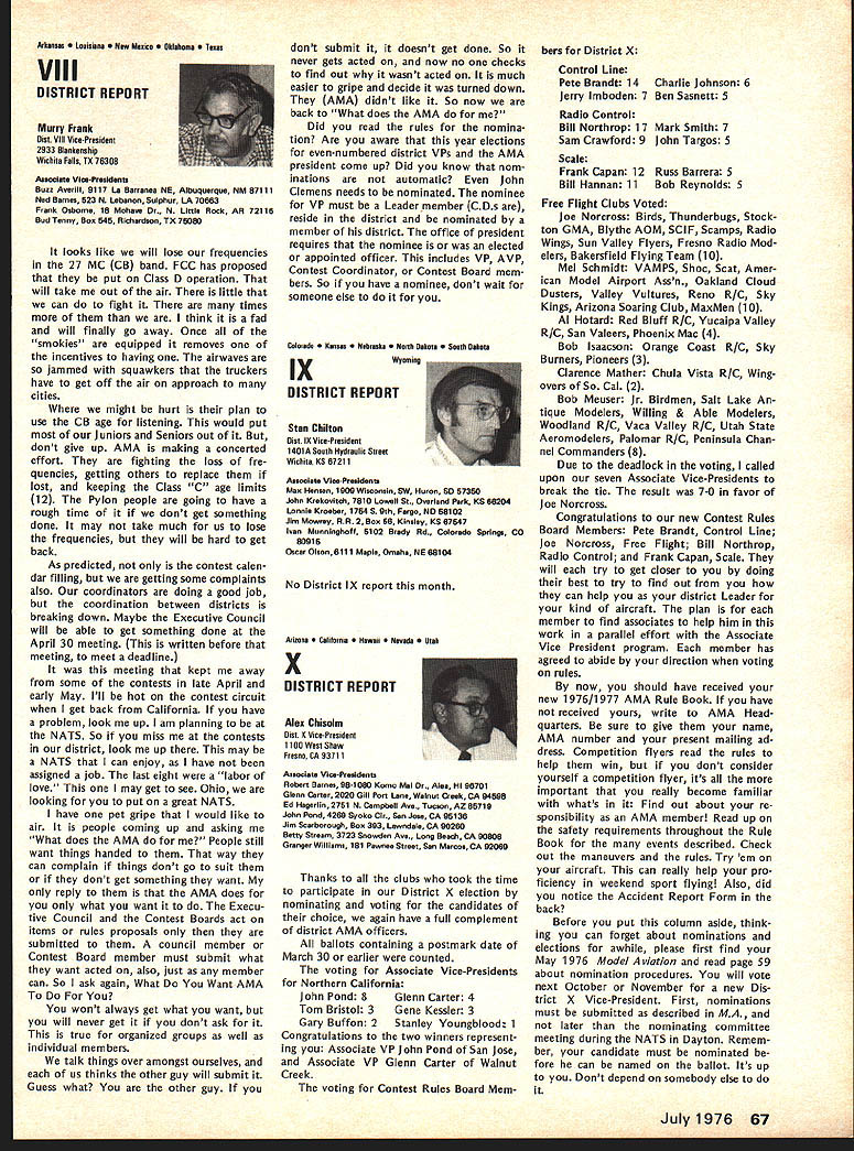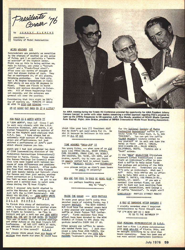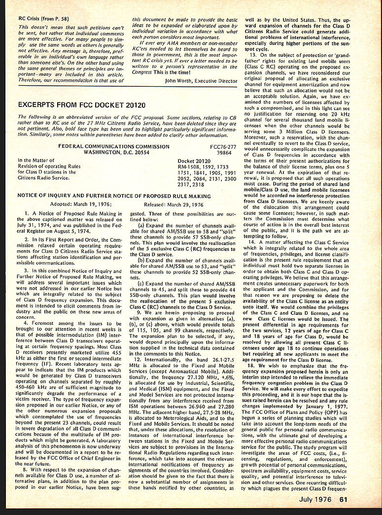 FCC PROPOSAL TO ELIMINATE 27 MHz FREQUENCIES CAN AFFECT ALL OTHER RADIO CONTROL OPERATIONS Everyone currently enjoys Radio Control has stake outcome FCCs Docket 20120 Excerpts docket legalese proposed government ac tion included along article Al though docket directly concerned 27MHz frequencies its result passed expected seriously affect RC operation Heres elimination 27MHz RC activity will force now using move other frequency areas will mean crowd ing 72MHz frequencies also 50-54 amateur band will also drasti cally affect competition activities wiping out major portion total RC spectrum Pylon Soaring Aerobatics competition will lose big slice simultaneous flying activity permits people fly time Similarly will mean longer wait ing lines fly fun club flying fields net result will pressure flying sites already very large problem aside overall effect di rect impact now operate 27MHz frequencies very serious will simply forced out RC activity within year cant switch other frequencies --if can make switch will have invest money number people affected far has generally realized 72MHz RC frequencies popular because generally safer interference still thousands 27MHz RC sets regular use fact 72MHz operators also have 27MHz sets secondary uses boats cars spare planes etc4 recent sur vey RC manufacturers indicates least 80000 27MHz RC sets regular operation number may well far higher Note following statement recent letter FCC Citizen-Ship Radio Division alone since 1969 has manufactured sold excess 44000 radio control units 27MHz frequency estimate Citizen Ship Radio since its inception has manufac tured far excess 50000 radio sets 27MHz frequency current production 27MHz radio sets approximately ten thousand per year international effects too meets year jointly participated modelers US Canada World Championships may also affected countries 27MHz frequencies popular 72MHz legal RCour team could put peculiar po sition having fly World Champion ships equipment would illegal US implications regarding prac tice flying problems uncertainty switching equipment last minute enough rattle confidence team send out country other significant effects threatened FCC proposal Walt Good AMA Frequency Committee podiumleft presides AMA-sponsored meeting RC manufacturers Toledo show April meeting explored reactions FCCs current proposal would include giving RC frequencies CB operators AM&also sponsored model press briefing following night advise AMA plans oppose pro posals Thomas R Perzentha ohoto aggravating matter princi ple use RC frequencies over years has highlighted compliance FCC regulations short FCC has little no problem RCers con trast FCC RCers have nightmare CB operations Except perhaps Prohibition per iod 30s has such flag rant violation federal law group people case CBers Despite some excellent performances few organi zations CB operators commonly under stood vast majority operations illegal FCC frankly admits impossi bility enforcement its CB regulations Yet CBers apparently re warded legalization much activ ity promise fre quencies made available meantime FCC has proposed re place RC frequencies may take away Discussions FCC officials indicate sympathetic plight fact remains did propose relief docket threatens take away five 27MHz frequencies Furthermore proposal currently written threatens away future licensing basic age groupthose under 18 youngsters age bracket now licensed isnt matter us ing other frequenciesthey would al lowed have Citizens Service license 72MHz Yet prime youth group Rhett Miller National RC Aerobatic Cham pion 15 1973 repeated 16 1974 team representing US World Championships 1975 17 example points up incredi bility aspect FCC proposal therefore makes other aspects suspect rewarding illegality taking away responsible users airwaves suggests years trouble-free oper ations RCers fully appreciated FCC Thats quite leads emotional reactions suggest order RCers recognized given help should ignore FCC regulations AMA HQ Executive Director including reports AMA President Vice-Presidents ACADEMY OF MODEL AERONAUTICS 815 Fifteenth Street NW Washington DC 20005 RC Crisis Needs Immediate Response FCC AMAers RC Crisis cont operate please equipment manner frequency per haps enough make enforcement FCC regulations impossi ble FCC might propose offer relief legalizing what unacceptable before course what want ad vocate situation does generate kind thinking based what has actually happened CBers Hopefully ever satisfactory end result can produced through proper use demo cratic processes currently available Thus urge response FCC propo sal called law means have something say concerning proposal should follows 1 Comment writing including objections constructive counter-proposals manner prescribed FCC a Send original eleven required copies Federal Communications Commis sion Attn Vincent J Mullins Secretary Washington DC 20554 b Use following heading Comment Federal Communications Commission Matter ofDocket20120 Revision oper-RM-1508 1592 sting Rules for17511841 Class D stations19912052 Citizens21322300 Radio Service2318 2 To effective use typing rather handwriting However typing impos sible send anyway 3 Send copy also AMA 4 Mail time delivered FCC no later May 26 1976 Note as written request pending before FCC obtain 30 to-60 day extension deadline date possible time receive extension will have granted safest situation try write FCC before May 26 im possible write anyway send before June 15 Some word has received 3 4 week extension may pos sible help make effort effec tive copies congressmen along note asking help urged can important help elec ted representatives respondthe FCC sensi tive congressional opinion very significant factor makes crisis situation must have help RCers need dis pel feeling FCC officials RC use 27MHz minor can simply dispensed point needs massive rebuttal make sure no such feeling prevails FCC officials assure us under stand respect activity should take such assurances gran