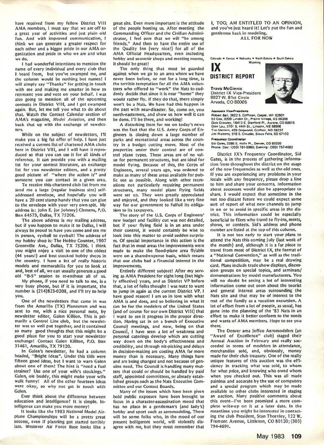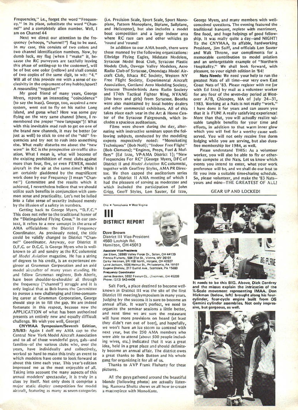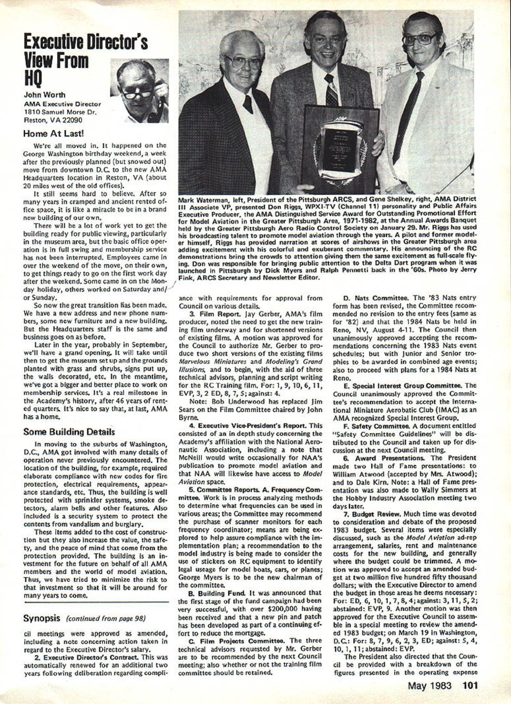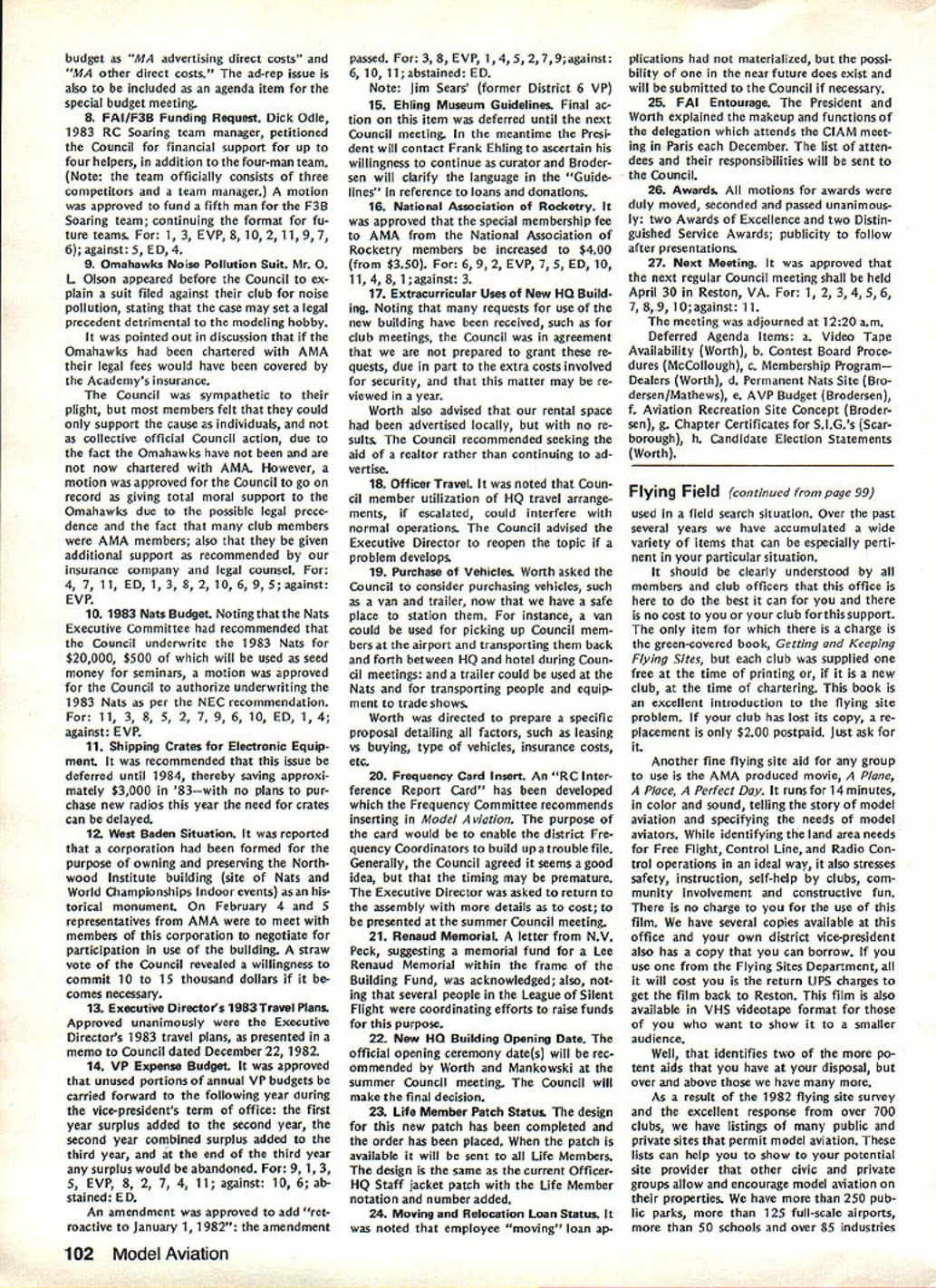 SynopsisExecutive Council Meeting January 29 1983 following summarizes actions AMA Executive Council meeting Anaheim CA copy official minutes may obtained upon request AMA HQ avail able approximately May 15 minutes will become official after Council review next Council meeting April should noted unless indicated otherwise President either abstained voting voted break tie some Council member votes shown particular item member present time voting Note also items necessarily chronological order acted upon attendance President John Grigg Lockport NY Executive Vice-Presi dent Jim McNeill Birmingham AL Execu tive Director John Worth Fairfax VA Vice-President District Ed Izzo Holliston MA VRII John Byrne Bayside NY VP-Ill Dave Brown Hamilton OH VP-IV Chuck Foreman Mechanicsville VA VP-V Bill Mathews Birmingham AL VP-VI Bob Un derwood St Louis MO VP-VII Hardy Brodersen Birmingham MI VP-VIII John Clemens Dallas TX VP-IX Travis McGinnis Arvada CO VP-X Jim Scarborough Rancho Palos Verdes CA VP-XI Ed McCollough Portland OR Present HQ executive staff Vince Man kowski Assistant Executive Director Micheline Madison FAllContest Boards Di rector Gisele Jackson Comptroller Guests Dan Mrs KrafftDistrict AVP Bev WisniewskiNats Executive Com mittee Betty StreamDistrict X AVP Richard OdleF3B team manager Alex BowerF3B team member Jerry KrainockS FVS F Frank HeacoxSociety Electric Aircraft Modelers John ElliotIMAC Louise Izzo Barbara McGinnis JoAnn Foreman regular meeting AMA Execu tive Council brought order 900 am President chaired meeting President made several comments prior taking up agenda Salary confidentialitydue legal ad vice Councils previous action subject null void Executive Director asked re spond letter J Barr decline AMA sponsorship local event Acceptance $250 donation start Lee Renaud Memorial Fund new AMA building see item XX Future distribution newly created form Travis McGinnis submittal agenda items Ev Langworthy Executive Director NAA noted official voting member AMAs Executive Council others NAA will considered proxies 1 Previous Meetings minutes October 23-24 December11 1982 Coun continued page 101 AMA Club Report 1982- 83 As December 31 1982 55 clubs memberships 100 morel Again year Pioneer RC Club California largest AMA club 366 members Club Pioneer RC Club Interstate Model Flying Club DC/RC Sky Masters RC Club Northern Virginia RC Club Valley Forge Signals Boeing Hawks RC Flyers Greater Cincinnati RC Club So Alameda Co RCers BIRDS Inc Goodyear MAC Rockland County RC Jefco Aeromodelers Mid Hudson RC Society Greater Southwest RC Detroit Aeromodelers Hawks Aero Radio Club Blue Angels MAC Tidewater RC Inc South Shore RC Chicagoland RC Tulsa Gluedobbers Orange Coast RC Tn-Valley RC Flyers Cape Ann RC MAC Suncoast Aeromodelers Tn Village RCers Prince Georges RC Sacramento Area Modelers Condors RC Club Coral Springs Manned Spacecraft Center RC St Paul Minnesota RC Cleveland RCCIub Palomar RC Flyers Denver RC Eagles Miniature Aircraft Modelers RAMS Somers RC South Eastern Virginia RC Group East Bay RC Northwest Houston RC Club Charles River RCers Suburban Aero Club Chicago Pomona Valley MAC Western Ohio RC Society West Pasco Model Pilots Association Midwest Sun Downers Flying Club Radio Aero Modelers Montgomery Dallas RC Club Grassfield Club State ers Knox County RC Society CA366Madison Area RC Society Signal Seekers RC Riverview RC Flyers Twin City RC NY340 MD264 Ml237 VA231 PA228 WA200 OH194 CA181 CA176 OH172 NY168 CO167 NY155 TX152 MI147 OH147 Ml146 NY146 VA143 MA140 IL136 OK135 CA134 MN134 MA133 FL132 IL127 MD125 CA119 FL118 TX118 VA112 CA110 TX109 MA108 IL108 CA107 OH106 FL105 IN104 AL104 TX103 MN103 TN102 WI102 Ml102 NJ101 MN101 NC Frequency Committee Changes Following AMAs very successful four year campaign obtain new RC frequencies its natural some regrouping among have served long hard vol unteers should take place Thus Bob Aberle committee chairman much effort has retired have committee members Dick Jansson John Strong Com mittee member Walt Good has also backed off completelyhe still serves consult ant Meanwhile two new committee members have joined continuing effort George Myers Al Watson George also Model v/ar/ons RC Techniques columnist new chairman Al assistant Frequency Coordinator AMA District 11 northwest part US new committee member AMA RC Frequency Committee February 26 1983 therefore follows George MyersChairman Jack Albrecht Dave Brown Bill Hershberger Fred Marks Al Watson Torrey Williams Dr Walter GoodConsultant 98 Model Aviation AMA HQ bY Executive Director including reports bY AMA President Executive VP Vice-Presidents Gtzzz7 MN118 OH116 CA116 CO115 CA114 NY113 Presidents Corner President ACADEMY OF MODEL AERONAUTICS JOHN C GRIGG 6387 Badger Drive Home 716 434-3955 Lockport NY 14094Work 716 631-6314 NATS 83 amount publicity attention details indication should greatest Nats ever Local clubsupport response has outstanding Local dignitaries local Chamber Commerce local establish mentsall readying welcome us open arms Planning going very very well Ive receiving letters members regard Nats favorable few downers Since human nature ismost people want hear about believe bad thingsI thought fair give both sides picture First good comments bad letter Jim M typifies good comments writes just re ceived March MA todays mail elated over page ad page 107 re 83 Nats As modeler over 40 years have never able attend Nationals because geographic location August commitments year contest Westover July am somewhat familiar Springfield area did get some good pics last years SAM contest has shot arm East Coast model ing proves has modeling years sending along photo 1947 Thermic SOx other side coin exemplified note received famous modeler name wont print says Further letters sent about Nats site selection have no choice add support views vocal way know boycott 1983 Nats her son nor will attend Nats 1983 Nor will report dividual columnist model magazines because does like treatment alleged ly ha