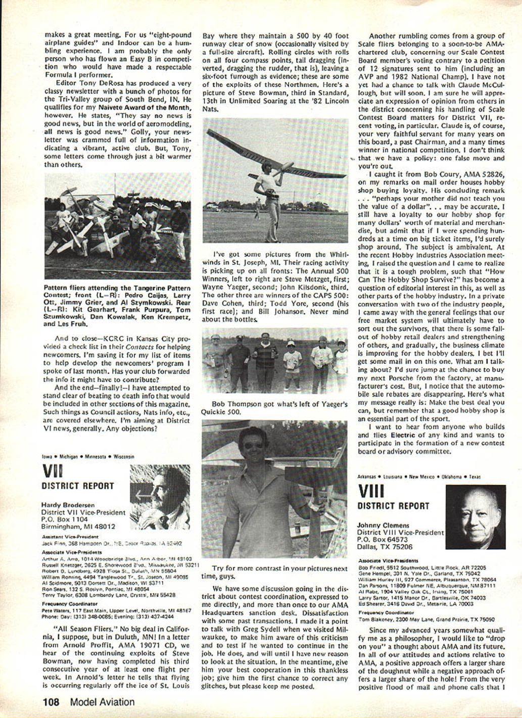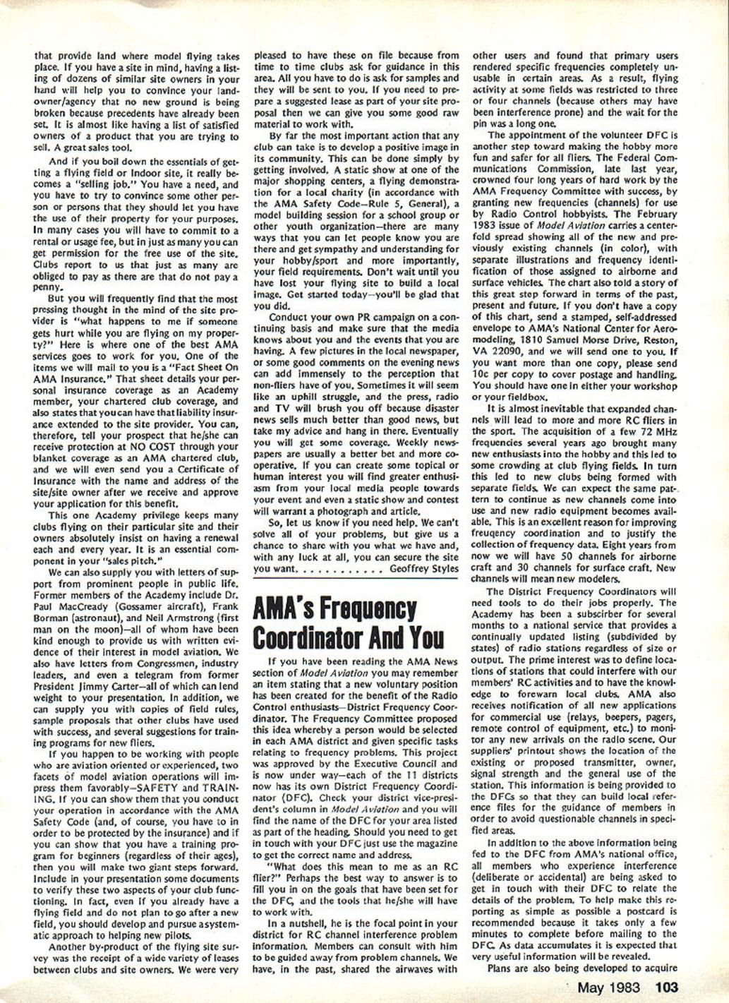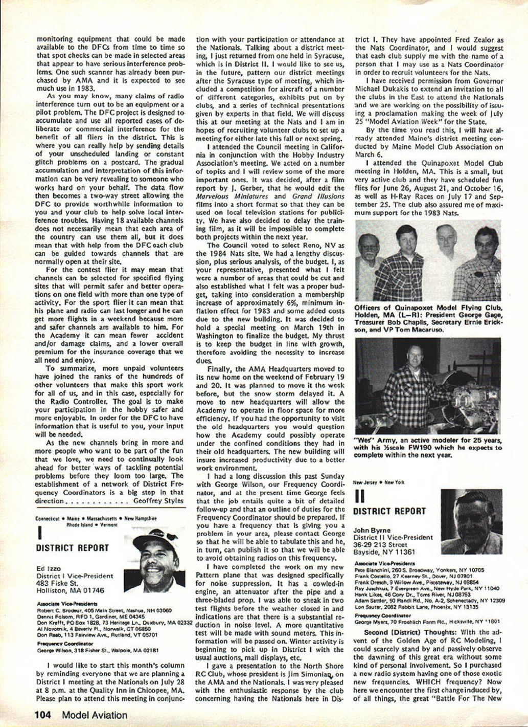 SynopsisExecutive Council Meeting January 29 1983 following summarizes actions AMA Executive Council meeting Anaheim CA copy official minutes may obtained upon request AMA HQ avail able approximately May 15 minutes will become official after Council review next Council meeting April should noted unless indicated otherwise President either abstained voting voted break tie some Council member votes shown particular item member present time voting Note also items necessarily chronological order acted upon attendance President John Grigg Lockport NY Executive Vice-Presi dent Jim McNeill Birmingham AL Execu tive Director John Worth Fairfax VA Vice-President District Ed Izzo Holliston MA VRII John Byrne Bayside NY VP-Ill Dave Brown Hamilton OH VP-IV Chuck Foreman Mechanicsville VA VP-V Bill Mathews Birmingham AL VP-VI Bob Un derwood St Louis MO VP-VII Hardy Brodersen Birmingham MI VP-VIII John Clemens Dallas TX VP-IX Travis McGinnis Arvada CO VP-X Jim Scarborough Rancho Palos Verdes CA VP-XI Ed McCollough Portland OR Present HQ executive staff Vince Man kowski Assistant Executive Director Micheline Madison FAllContest Boards Di rector Gisele Jackson Comptroller Guests Dan Mrs KrafftDistrict AVP Bev WisniewskiNats Executive Com mittee Betty StreamDistrict X AVP Richard OdleF3B team manager Alex BowerF3B team member Jerry KrainockS FVS F Frank HeacoxSociety Electric Aircraft Modelers John ElliotIMAC Louise Izzo Barbara McGinnis JoAnn Foreman regular meeting AMA Execu tive Council brought order 900 am President chaired meeting President made several comments prior taking up agenda Salary confidentialitydue legal ad vice Councils previous action subject null void Executive Director asked re spond letter J Barr decline AMA sponsorship local event Acceptance $250 donation start Lee Renaud Memorial Fund new AMA building see item XX Future distribution newly created form Travis McGinnis submittal agenda items Ev Langworthy Executive Director NAA noted official voting member AMAs Executive Council others NAA will considered proxies 1 Previous Meetings minutes October 23-24 December11 1982 Coun continued page 101 AMA Club Report 1982- 83 As December 31 1982 55 clubs memberships 100 morel Again year Pioneer RC Club California largest AMA club 366 members Club Pioneer RC Club Interstate Model Flying Club DC/RC Sky Masters RC Club Northern Virginia RC Club Valley Forge Signals Boeing Hawks RC Flyers Greater Cincinnati RC Club So Alameda Co RCers BIRDS Inc Goodyear MAC Rockland County RC Jefco Aeromodelers Mid Hudson RC Society Greater Southwest RC Detroit Aeromodelers Hawks Aero Radio Club Blue Angels MAC Tidewater RC Inc South Shore RC Chicagoland RC Tulsa Gluedobbers Orange Coast RC Tn-Valley RC Flyers Cape Ann RC MAC Suncoast Aeromodelers Tn Village RCers Prince Georges RC Sacramento Area Modelers Condors RC Club Coral Springs Manned Spacecraft Center RC St Paul Minnesota RC Cleveland RCCIub Palomar RC Flyers Denver RC Eagles Miniature Aircraft Modelers RAMS Somers RC South Eastern Virginia RC Group East Bay RC Northwest Houston RC Club Charles River RCers Suburban Aero Club Chicago Pomona Valley MAC Western Ohio RC Society West Pasco Model Pilots Association Midwest Sun Downers Flying Club Radio Aero Modelers Montgomery Dallas RC Club Grassfield Club State ers Knox County RC Society CA366Madison Area RC Society Signal Seekers RC Riverview RC Flyers Twin City RC NY340 MD264 Ml237 VA231 PA228 WA200 OH194 CA181 CA176 OH172 NY168 CO167 NY155 TX152 MI147 OH147 Ml146 NY146 VA143 MA140 IL136 OK135 CA134 MN134 MA133 FL132 IL127 MD125 CA119 FL118 TX118 VA112 CA110 TX109 MA108 IL108 CA107 OH106 FL105 IN104 AL104 TX103 MN103 TN102 WI102 Ml102 NJ101 MN101 NC Frequency Committee Changes Following AMAs very successful four year campaign obtain new RC frequencies its natural some regrouping among have served long hard vol unteers should take place Thus Bob Aberle committee chairman much effort has retired have committee members Dick Jansson John Strong Com mittee member Walt Good has also backed off completelyhe still serves consult ant Meanwhile two new committee members have joined continuing effort George Myers Al Watson George also Model v/ar/ons RC Techniques columnist new chairman Al assistant Frequency Coordinator AMA District 11 northwest part US new committee member AMA RC Frequency Committee February 26 1983 therefore follows George MyersChairman Jack Albrecht Dave Brown Bill Hershberger Fred Marks Al Watson Torrey Williams Dr Walter GoodConsultant 98 Model Aviation AMA HQ bY Executive Director including reports bY AMA President Executive VP Vice-Presidents Gtzzz7 MN118 OH116 CA116 CO115 CA114 NY113 Presidents Corner President ACADEMY OF MODEL AERONAUTICS JOHN C GRIGG 6387 Badger Drive Home 716 434-3955 Lockport NY 14094Work 716 631-6314 NATS 83 amount publicity attention details indication should greatest Nats ever Local clubsupport response has outstanding Local dignitaries local Chamber Commerce local establish mentsall readying welcome us open arms Planning going very very well Ive receiving letters members regard Nats favorable few downers Since human nature ismost people want hear about believe bad thingsI thought fair give both sides picture First good comments bad letter Jim M typifies good comments writes just re ceived March MA todays mail elated over page ad page 107 re 83 Nats As modeler over 40 years have never able attend Nationals because geographic location August commitments year contest Westover July am somewhat familiar Springfield area did get some good pics last years SAM contest has shot arm East Coast model ing proves has modeling years sending along photo 1947 Thermic SOx other side coin exemplified note received famous modeler name wont print says Further letters sent about Nats site selection have no choice add support views vocal way know boycott 1983 Nats her son nor will attend Nats 1983 Nor will report dividual columnist model magazines because does like treatment alleged ly ha