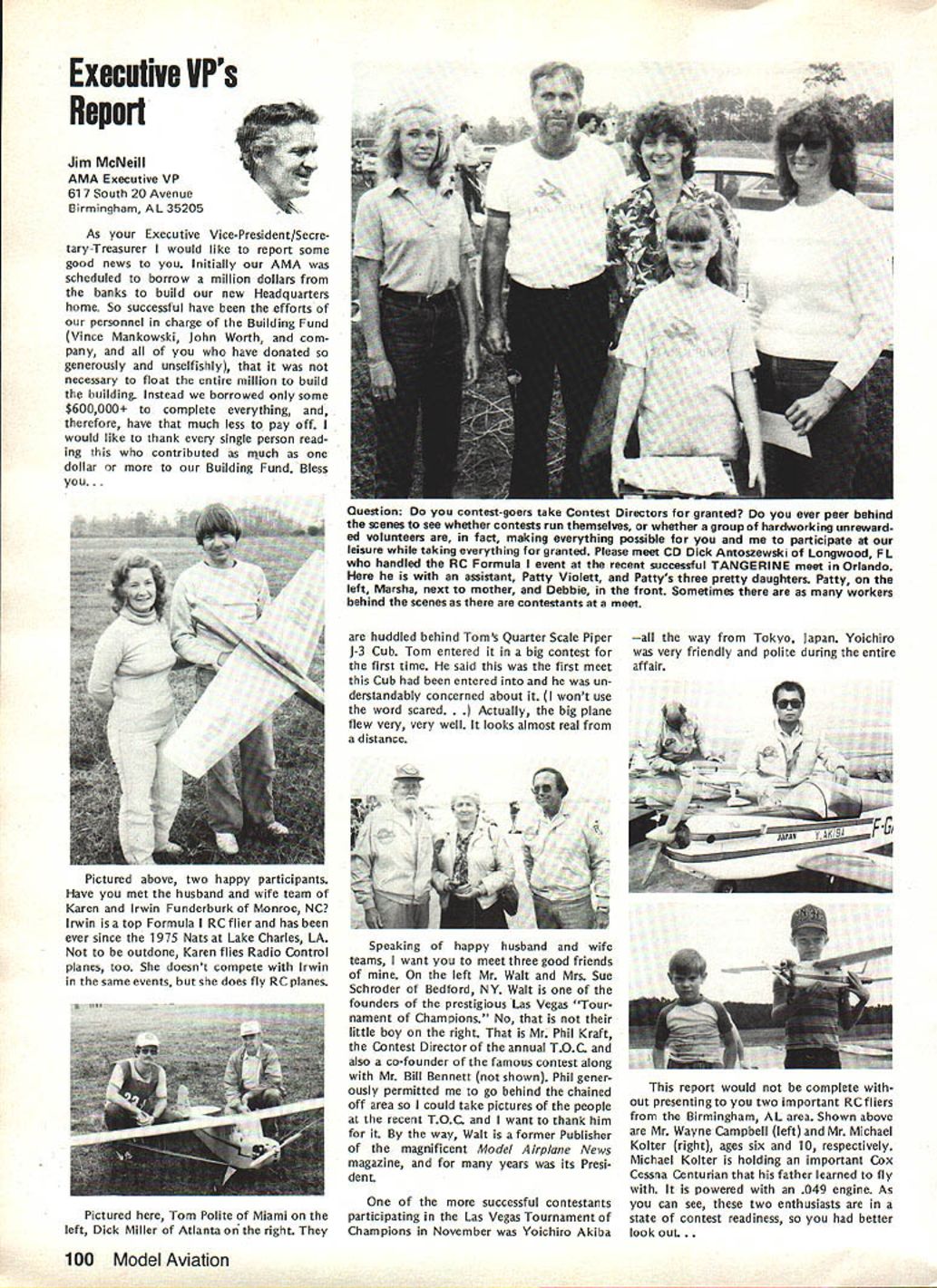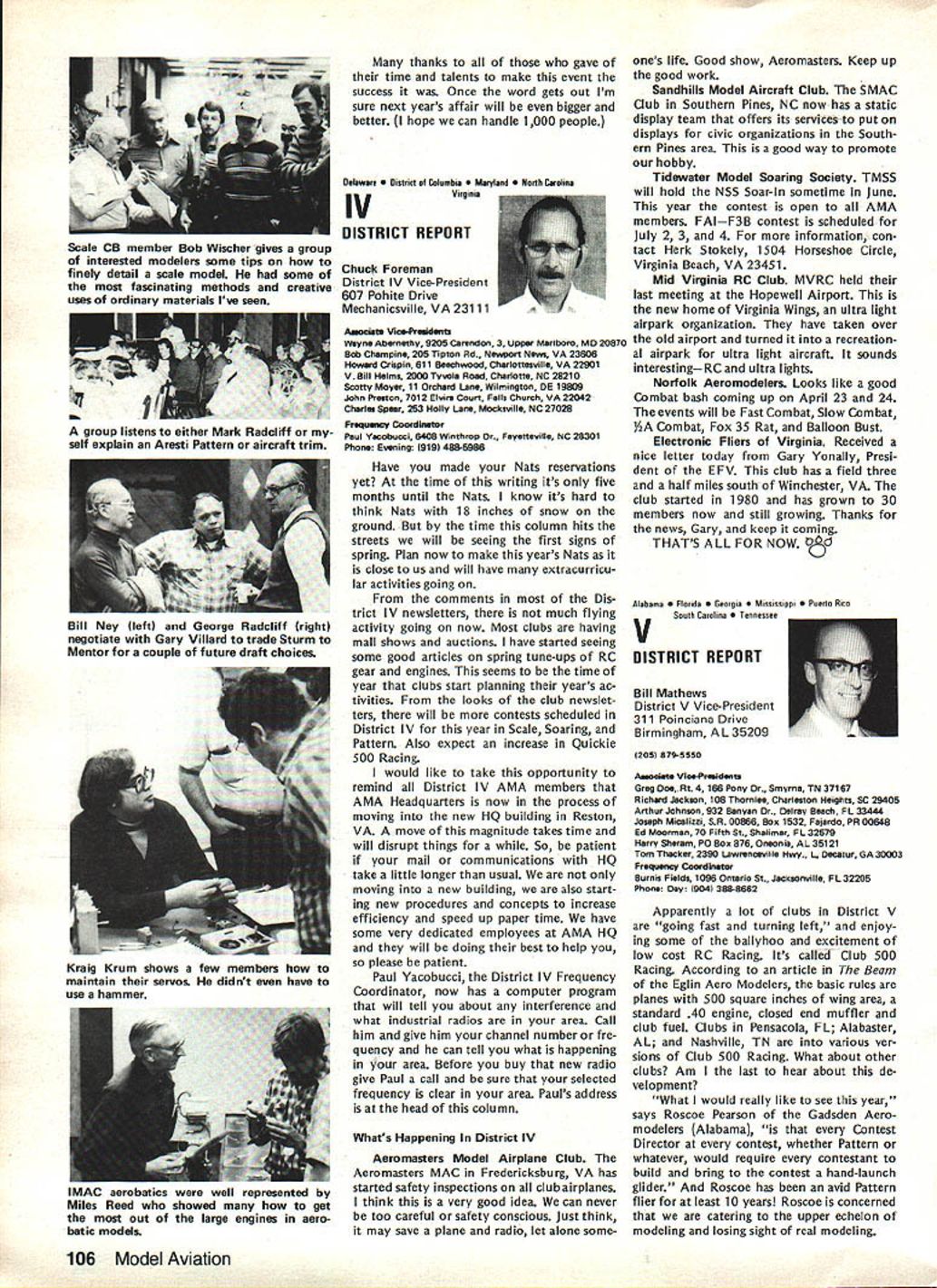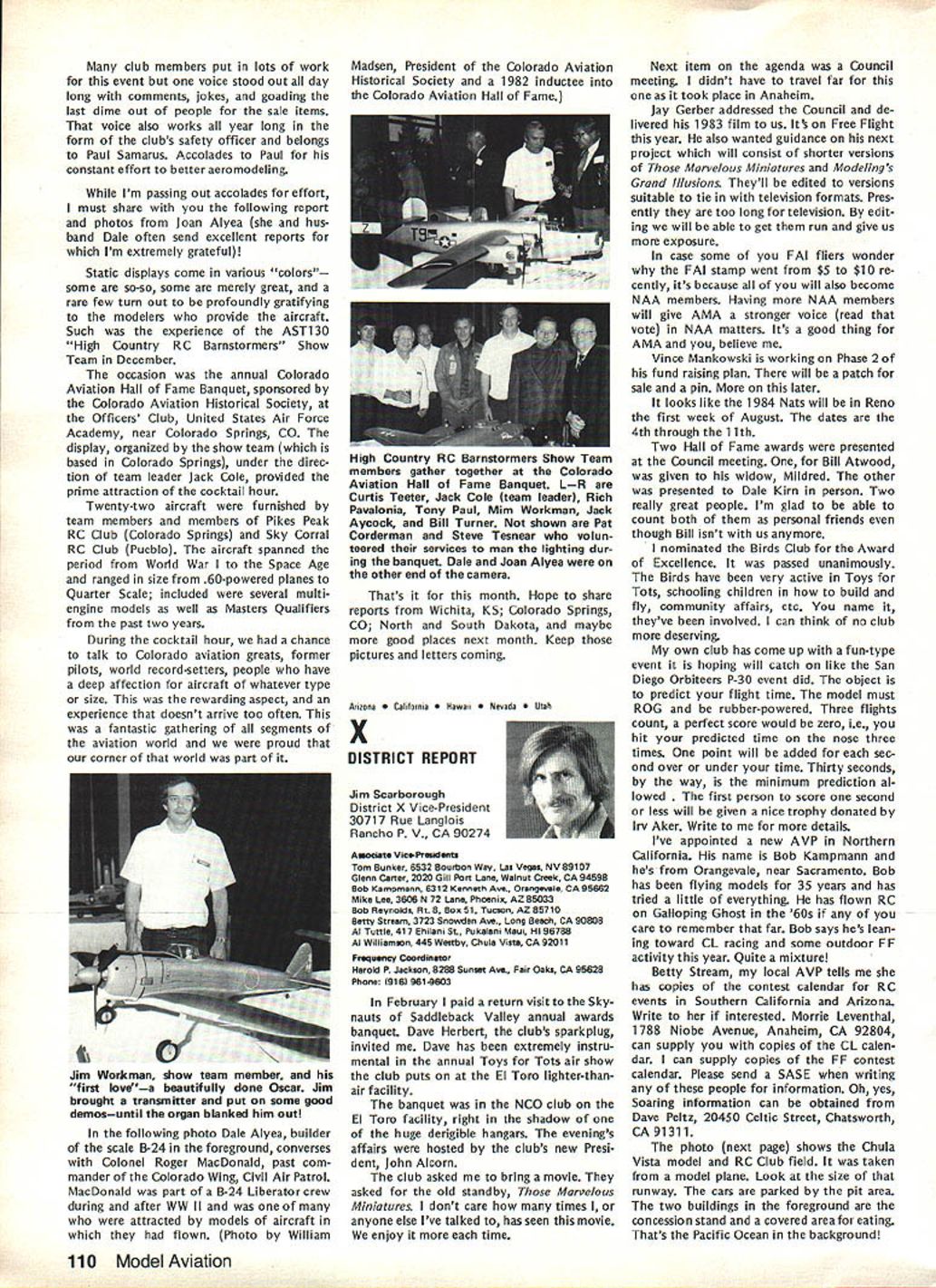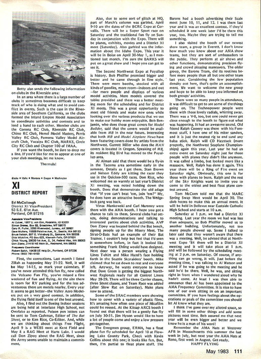 SynopsisExecutive Council Meeting January 29 1983 following summarizes actions AMA Executive Council meeting Anaheim CA copy official minutes may obtained upon request AMA HQ avail able approximately May 15 minutes will become official after Council review next Council meeting April should noted unless indicated otherwise President either abstained voting voted break tie some Council member votes shown particular item member present time voting Note also items necessarily chronological order acted upon attendance President John Grigg Lockport NY Executive Vice-Presi dent Jim McNeill Birmingham AL Execu tive Director John Worth Fairfax VA Vice-President District Ed Izzo Holliston MA VRII John Byrne Bayside NY VP-Ill Dave Brown Hamilton OH VP-IV Chuck Foreman Mechanicsville VA VP-V Bill Mathews Birmingham AL VP-VI Bob Un derwood St Louis MO VP-VII Hardy Brodersen Birmingham MI VP-VIII John Clemens Dallas TX VP-IX Travis McGinnis Arvada CO VP-X Jim Scarborough Rancho Palos Verdes CA VP-XI Ed McCollough Portland OR Present HQ executive staff Vince Man kowski Assistant Executive Director Micheline Madison FAllContest Boards Di rector Gisele Jackson Comptroller Guests Dan Mrs KrafftDistrict AVP Bev WisniewskiNats Executive Com mittee Betty StreamDistrict X AVP Richard OdleF3B team manager Alex BowerF3B team member Jerry KrainockS FVS F Frank HeacoxSociety Electric Aircraft Modelers John ElliotIMAC Louise Izzo Barbara McGinnis JoAnn Foreman regular meeting AMA Execu tive Council brought order 900 am President chaired meeting President made several comments prior taking up agenda Salary confidentialitydue legal ad vice Councils previous action subject null void Executive Director asked re spond letter J Barr decline AMA sponsorship local event Acceptance $250 donation start Lee Renaud Memorial Fund new AMA building see item XX Future distribution newly created form Travis McGinnis submittal agenda items Ev Langworthy Executive Director NAA noted official voting member AMAs Executive Council others NAA will considered proxies 1 Previous Meetings minutes October 23-24 December11 1982 Coun continued page 101 AMA Club Report 1982- 83 As December 31 1982 55 clubs memberships 100 morel Again year Pioneer RC Club California largest AMA club 366 members Club Pioneer RC Club Interstate Model Flying Club DC/RC Sky Masters RC Club Northern Virginia RC Club Valley Forge Signals Boeing Hawks RC Flyers Greater Cincinnati RC Club So Alameda Co RCers BIRDS Inc Goodyear MAC Rockland County RC Jefco Aeromodelers Mid Hudson RC Society Greater Southwest RC Detroit Aeromodelers Hawks Aero Radio Club Blue Angels MAC Tidewater RC Inc South Shore RC Chicagoland RC Tulsa Gluedobbers Orange Coast RC Tn-Valley RC Flyers Cape Ann RC MAC Suncoast Aeromodelers Tn Village RCers Prince Georges RC Sacramento Area Modelers Condors RC Club Coral Springs Manned Spacecraft Center RC St Paul Minnesota RC Cleveland RCCIub Palomar RC Flyers Denver RC Eagles Miniature Aircraft Modelers RAMS Somers RC South Eastern Virginia RC Group East Bay RC Northwest Houston RC Club Charles River RCers Suburban Aero Club Chicago Pomona Valley MAC Western Ohio RC Society West Pasco Model Pilots Association Midwest Sun Downers Flying Club Radio Aero Modelers Montgomery Dallas RC Club Grassfield Club State ers Knox County RC Society CA366Madison Area RC Society Signal Seekers RC Riverview RC Flyers Twin City RC NY340 MD264 Ml237 VA231 PA228 WA200 OH194 CA181 CA176 OH172 NY168 CO167 NY155 TX152 MI147 OH147 Ml146 NY146 VA143 MA140 IL136 OK135 CA134 MN134 MA133 FL132 IL127 MD125 CA119 FL118 TX118 VA112 CA110 TX109 MA108 IL108 CA107 OH106 FL105 IN104 AL104 TX103 MN103 TN102 WI102 Ml102 NJ101 MN101 NC Frequency Committee Changes Following AMAs very successful four year campaign obtain new RC frequencies its natural some regrouping among have served long hard vol unteers should take place Thus Bob Aberle committee chairman much effort has retired have committee members Dick Jansson John Strong Com mittee member Walt Good has also backed off completelyhe still serves consult ant Meanwhile two new committee members have joined continuing effort George Myers Al Watson George also Model v/ar/ons RC Techniques columnist new chairman Al assistant Frequency Coordinator AMA District 11 northwest part US new committee member AMA RC Frequency Committee February 26 1983 therefore follows George MyersChairman Jack Albrecht Dave Brown Bill Hershberger Fred Marks Al Watson Torrey Williams Dr Walter GoodConsultant 98 Model Aviation AMA HQ bY Executive Director including reports bY AMA President Executive VP Vice-Presidents Gtzzz7 MN118 OH116 CA116 CO115 CA114 NY113 Presidents Corner President ACADEMY OF MODEL AERONAUTICS JOHN C GRIGG 6387 Badger Drive Home 716 434-3955 Lockport NY 14094Work 716 631-6314 NATS 83 amount publicity attention details indication should greatest Nats ever Local clubsupport response has outstanding Local dignitaries local Chamber Commerce local establish mentsall readying welcome us open arms Planning going very very well Ive receiving letters members regard Nats favorable few downers Since human nature ismost people want hear about believe bad thingsI thought fair give both sides picture First good comments bad letter Jim M typifies good comments writes just re ceived March MA todays mail elated over page ad page 107 re 83 Nats As modeler over 40 years have never able attend Nationals because geographic location August commitments year contest Westover July am somewhat familiar Springfield area did get some good pics last years SAM contest has shot arm East Coast model ing proves has modeling years sending along photo 1947 Thermic SOx other side coin exemplified note received famous modeler name wont print says Further letters sent about Nats site selection have no choice add support views vocal way know boycott 1983 Nats her son nor will attend Nats 1983 Nor will report dividual columnist model magazines because does like treatment alleged ly ha