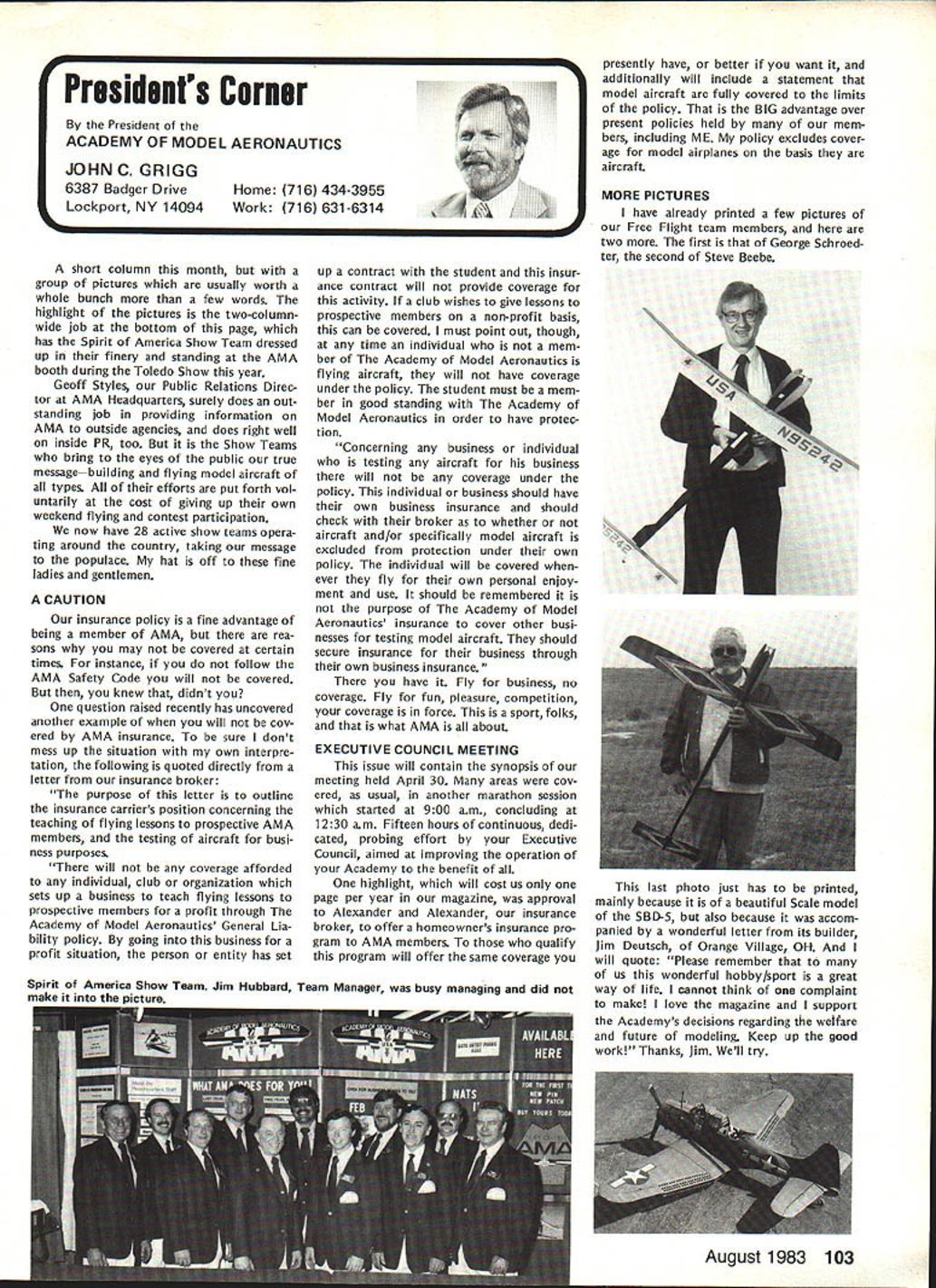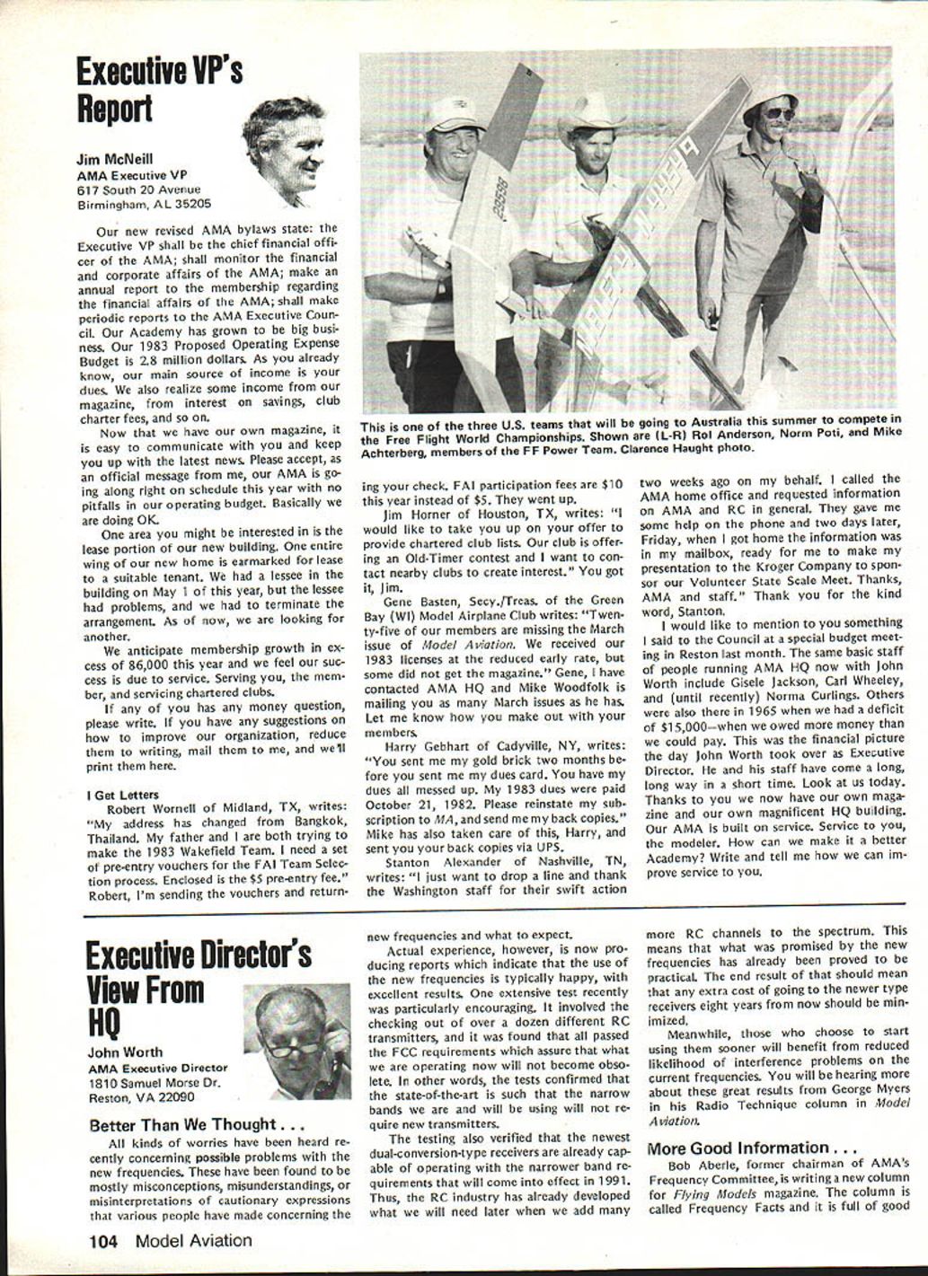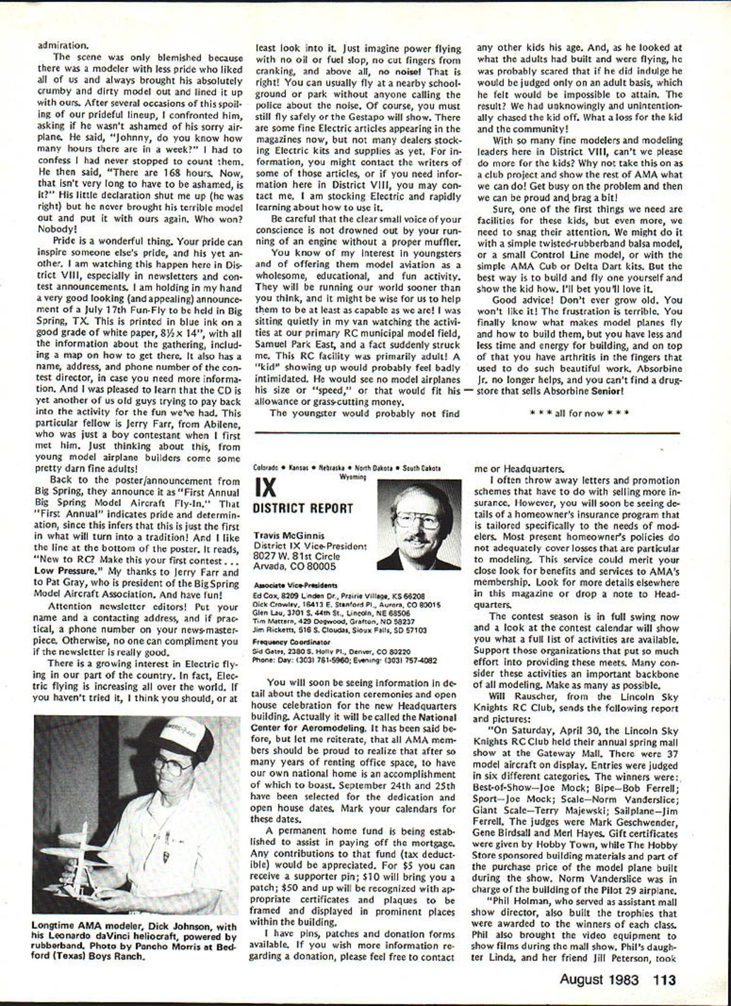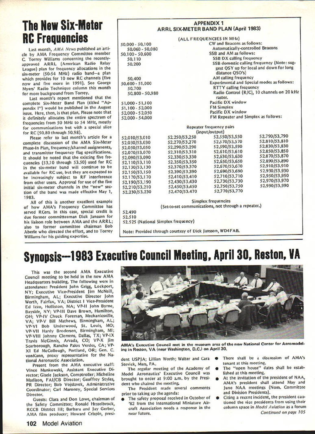 A Great Opportunity AMA Clubs Academy Announces uAdopt.A.SchooIP Project Proposal AMA Public Relations Department suggests AMA chartered clubs Adopt a-School community adop tion would involve purchasing $30 full AMA membership using club funds teacher school math science indus trial arts Club members could assist teacher programs involving model avia tion model aircraft benefit students Model flying demonstrations various types could given club space per mitted Show tell sessions could part teaching sessions demonstrate skills fun gained through model aviation possible school Model Aviation Club could founded three people required Benefits AMA Club would get good recogni tion community public-spirited effort Community governments control much land request flying site would received positive atmosphere local government knew school ef fort AMA club Any problems related noise other complaints would heard much sympathetic forum due clubs helpful attitude Requirements Club members could agree support schedule minimum hours would required work teacher clubs have shift workers could avail able during day Other members work daytime hours could perhaps provide some Saturday morning time school students club no reason load fall heavily person group persons club overall membership recognizes benefits community club willing play small part program PR Values local newspapers radio TV normally looking community involvement human interest stories club achieves its goal helps local students im prove scholastic standings math science bound get recognition may find another local group will sponsor help flying site should remember club flying field can experience some guished months site lost always good idea have other possibilities ready National Impact hear continuously American youngsters need improve math science skills understanding could consider would performing essential public service future benefit United States club participates program program catches nationwide would have very good chance getting national recognition sport something long overdue will happen unless take posi tive steps Adopt-A-School can ve hicle can make happen Club Recognition Academy will present club signs up program Certificate recognizes participation Special patches will available low cost members want shirts jackets Certification club officer will needed ensure work scheme no matter few hours given will eligible special patches Summary opportunity public spirited opportunity put something back community model aviation opportunity reduce taxes getting kids interested model aviation instead some less desirable pastimes today opportunity local hero share love model aircraft appreciative audience make work local teacher less arduous about it?" Sign Up Write Public Relations Department AMA tell us will Tell us name school what plan Public Relations Department can pro vide supporting brochures sample letter make easier ap proach local schooL need to ask us will send what need return mail Send application teacher will start sub scription Model v/at/on right away Get some dialog going chosen teacher put model aviation constructive light community request Recognition Certification club give us name teacher hislher AMA number will rest AMAs Grand Opening official dedication ceremonies National Center Aeromodeling Reston VA will Saturday September 241983 unique structure houses Academys administrative headquarters its model air craft museum museum dedicated preserving historical significant model air craft related memorabilia educa tional instructional use interested people dedication ceremonies will followed Open House celebration Invitations being sent prominent figures govern ment aviation industry Members Academy also invited present Open House festivities will continue Sunday September 25 General public visits Center will possible limited ap pointment basis following dedication wee kend August 1983 101 AMA HQ bY Executive Director including reports AMA President Executive VP Vice-Presidents ACADEMY OF MODEL AERONAUTICS 1810 Samuel Morse Dr Reston VA 22090 AMA HQ SERVICES STAFF 0e S Executive Director John Worth S Assistant Executive Director Vince Mankowski S Executive Secretary Joyce Hager S Comptroller Gisele Jackson S Competition Services Director Micheline Madison S Special Services Director Carl Maroney S Membership Director Carol Merfeld S Public Relations Director Geoff Styles S Special Events Manager Douglas Pratt S Publications Director Carl R Wheeley S Administrative Coordinator Bob Voislavek S S General Counsel Jeremiah Courtney S Asst General Counsel Jack Smith Hew Six-Meter NC Frequencies Last month AMA News published arti cle AMA Frequency Committee member C Torrey Williams concerning recentlyapproved ARRL American Radio Relay League plan frequency allocations six-meter 50-54 MHz radio banda plan provides 10 new RC channels five now five 1991 See George Myers Radio Technique column month background Torrey Last months report mentioned complete Six-Meter Band Plan titled Ap pendix would published August issue plan Please note definitely allocates entire spectrum frequencies 50 MHz 54 MHz mostly communications special slice RC 5080 through 5098 Please refer last months article complete discussion AMA Six-Meter Phase- Plan freq uency/channel assignments transmitter frequency flag specifications should noted existing five fre quencies 5310 through 5350 used RC six-meter band will continue available RC use expected increasingly subject RF interference other users Approval use five initial six-meter channels new sec tion band made effective May 1 1983 another excellent example AMAs Frequency Committee has served RCers case special credit due former committeeman Dick Jansson liaison role between AMA ARRL also former committee chairman Bob Aberle directed effort Torrey Williams guiding expertise APPENDIX 1 ARRL SIX-METER BAND PLAN April 1983 50000 50100 50060 50080 50100- 50600 50110 50200 50400 50600- 51000 507 00 5080