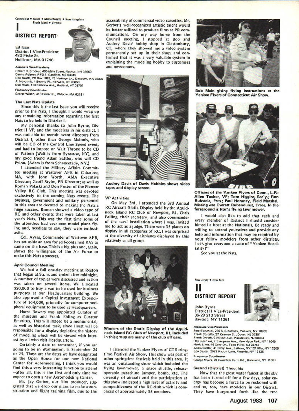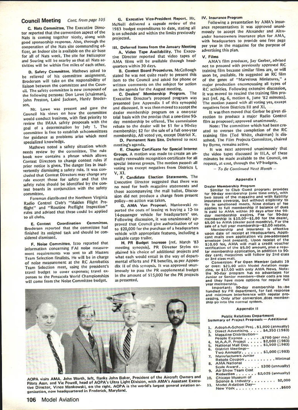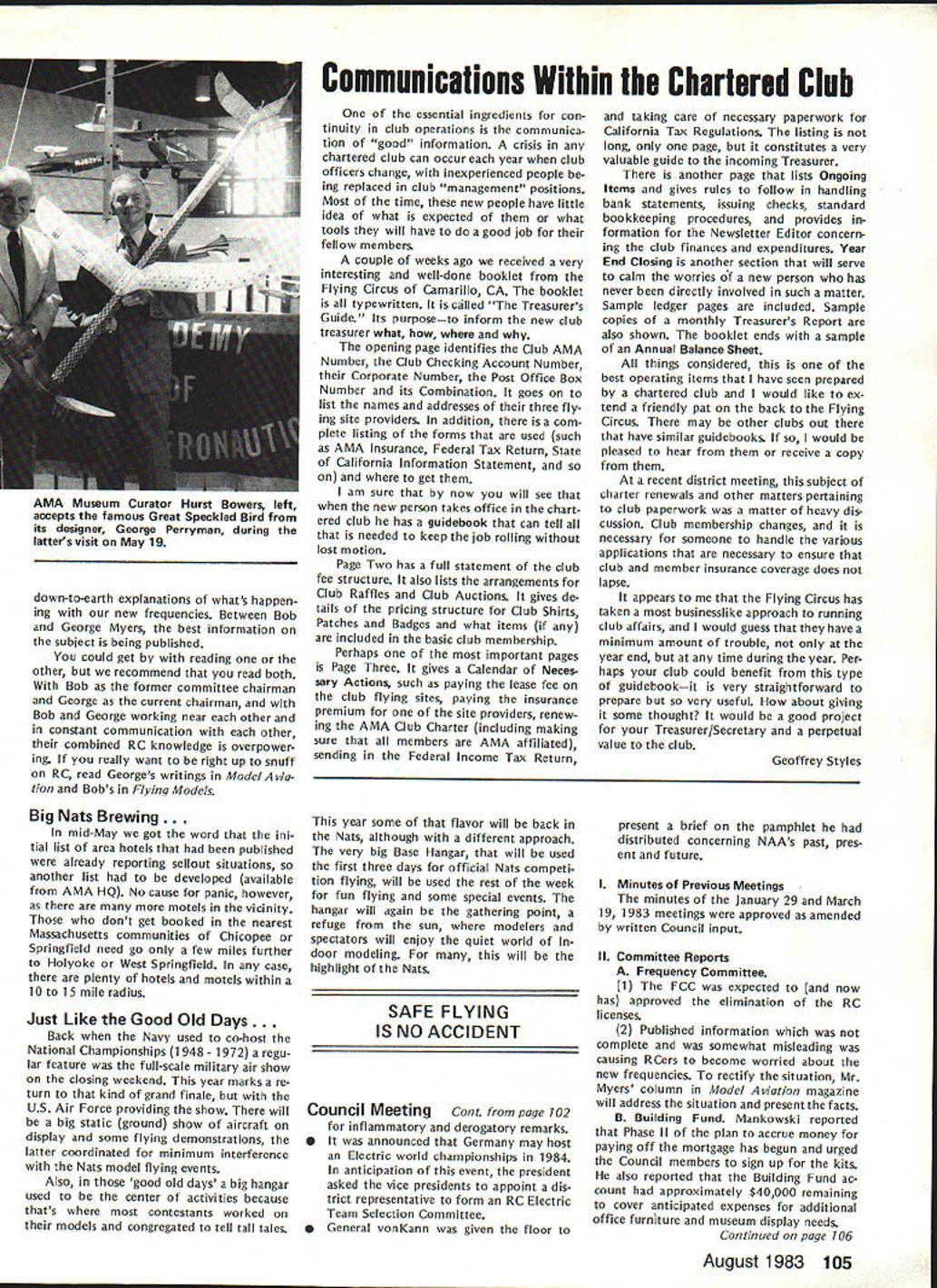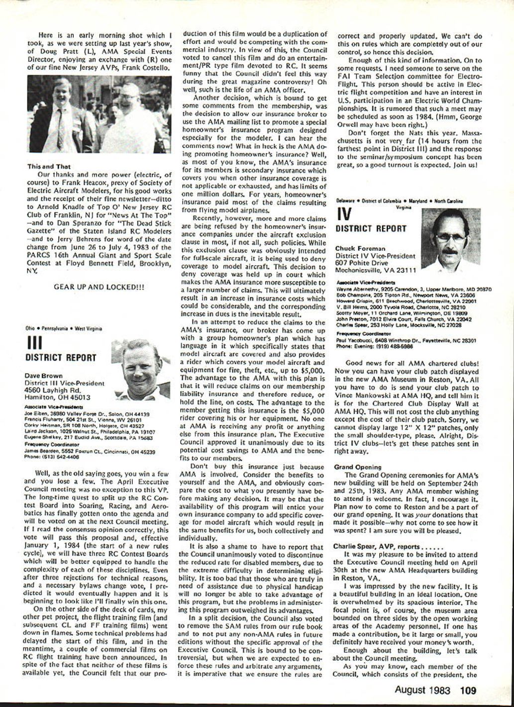 A Great Opportunity AMA Clubs Academy Announces uAdopt.A.SchooIP Project Proposal AMA Public Relations Department suggests AMA chartered clubs Adopt a-School community adop tion would involve purchasing $30 full AMA membership using club funds teacher school math science indus trial arts Club members could assist teacher programs involving model avia tion model aircraft benefit students Model flying demonstrations various types could given club space per mitted Show tell sessions could part teaching sessions demonstrate skills fun gained through model aviation possible school Model Aviation Club could founded three people required Benefits AMA Club would get good recogni tion community public-spirited effort Community governments control much land request flying site would received positive atmosphere local government knew school ef fort AMA club Any problems related noise other complaints would heard much sympathetic forum due clubs helpful attitude Requirements Club members could agree support schedule minimum hours would required work teacher clubs have shift workers could avail able during day Other members work daytime hours could perhaps provide some Saturday morning time school students club no reason load fall heavily person group persons club overall membership recognizes benefits community club willing play small part program PR Values local newspapers radio TV normally looking community involvement human interest stories club achieves its goal helps local students im prove scholastic standings math science bound get recognition may find another local group will sponsor help flying site should remember club flying field can experience some guished months site lost always good idea have other possibilities ready National Impact hear continuously American youngsters need improve math science skills understanding could consider would performing essential public service future benefit United States club participates program program catches nationwide would have very good chance getting national recognition sport something long overdue will happen unless take posi tive steps Adopt-A-School can ve hicle can make happen Club Recognition Academy will present club signs up program Certificate recognizes participation Special patches will available low cost members want shirts jackets Certification club officer will needed ensure work scheme no matter few hours given will eligible special patches Summary opportunity public spirited opportunity put something back community model aviation opportunity reduce taxes getting kids interested model aviation instead some less desirable pastimes today opportunity local hero share love model aircraft appreciative audience make work local teacher less arduous about it?" Sign Up Write Public Relations Department AMA tell us will Tell us name school what plan Public Relations Department can pro vide supporting brochures sample letter make easier ap proach local schooL need to ask us will send what need return mail Send application teacher will start sub scription Model v/at/on right away Get some dialog going chosen teacher put model aviation constructive light community request Recognition Certification club give us name teacher hislher AMA number will rest AMAs Grand Opening official dedication ceremonies National Center Aeromodeling Reston VA will Saturday September 241983 unique structure houses Academys administrative headquarters its model air craft museum museum dedicated preserving historical significant model air craft related memorabilia educa tional instructional use interested people dedication ceremonies will followed Open House celebration Invitations being sent prominent figures govern ment aviation industry Members Academy also invited present Open House festivities will continue Sunday September 25 General public visits Center will possible limited ap pointment basis following dedication wee kend August 1983 101 AMA HQ bY Executive Director including reports AMA President Executive VP Vice-Presidents ACADEMY OF MODEL AERONAUTICS 1810 Samuel Morse Dr Reston VA 22090 AMA HQ SERVICES STAFF 0e S Executive Director John Worth S Assistant Executive Director Vince Mankowski S Executive Secretary Joyce Hager S Comptroller Gisele Jackson S Competition Services Director Micheline Madison S Special Services Director Carl Maroney S Membership Director Carol Merfeld S Public Relations Director Geoff Styles S Special Events Manager Douglas Pratt S Publications Director Carl R Wheeley S Administrative Coordinator Bob Voislavek S S General Counsel Jeremiah Courtney S Asst General Counsel Jack Smith Hew Six-Meter NC Frequencies Last month AMA News published arti cle AMA Frequency Committee member C Torrey Williams concerning recentlyapproved ARRL American Radio Relay League plan frequency allocations six-meter 50-54 MHz radio banda plan provides 10 new RC channels five now five 1991 See George Myers Radio Technique column month background Torrey Last months report mentioned complete Six-Meter Band Plan titled Ap pendix would published August issue plan Please note definitely allocates entire spectrum frequencies 50 MHz 54 MHz mostly communications special slice RC 5080 through 5098 Please refer last months article complete discussion AMA Six-Meter Phase- Plan freq uency/channel assignments transmitter frequency flag specifications should noted existing five fre quencies 5310 through 5350 used RC six-meter band will continue available RC use expected increasingly subject RF interference other users Approval use five initial six-meter channels new sec tion band made effective May 1 1983 another excellent example AMAs Frequency Committee has served RCers case special credit due former committeeman Dick Jansson liaison role between AMA ARRL also former committee chairman Bob Aberle directed effort Torrey Williams guiding expertise APPENDIX 1 ARRL SIX-METER BAND PLAN April 1983 50000 50100 50060 50080 50100- 50600 50110 50200 50400 50600- 51000 507 00 5080