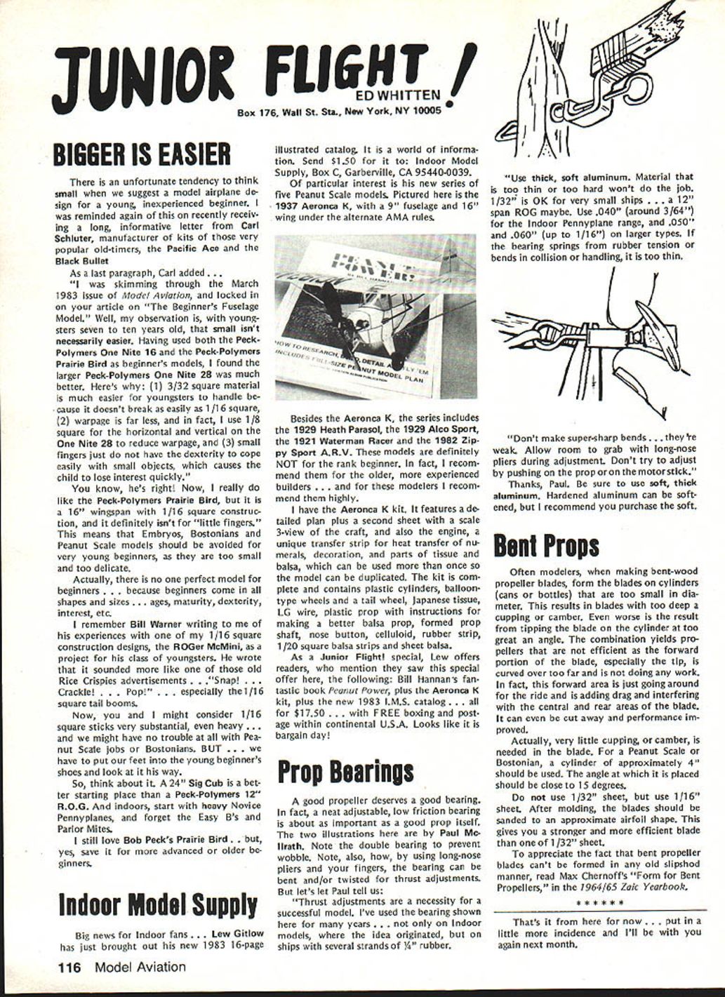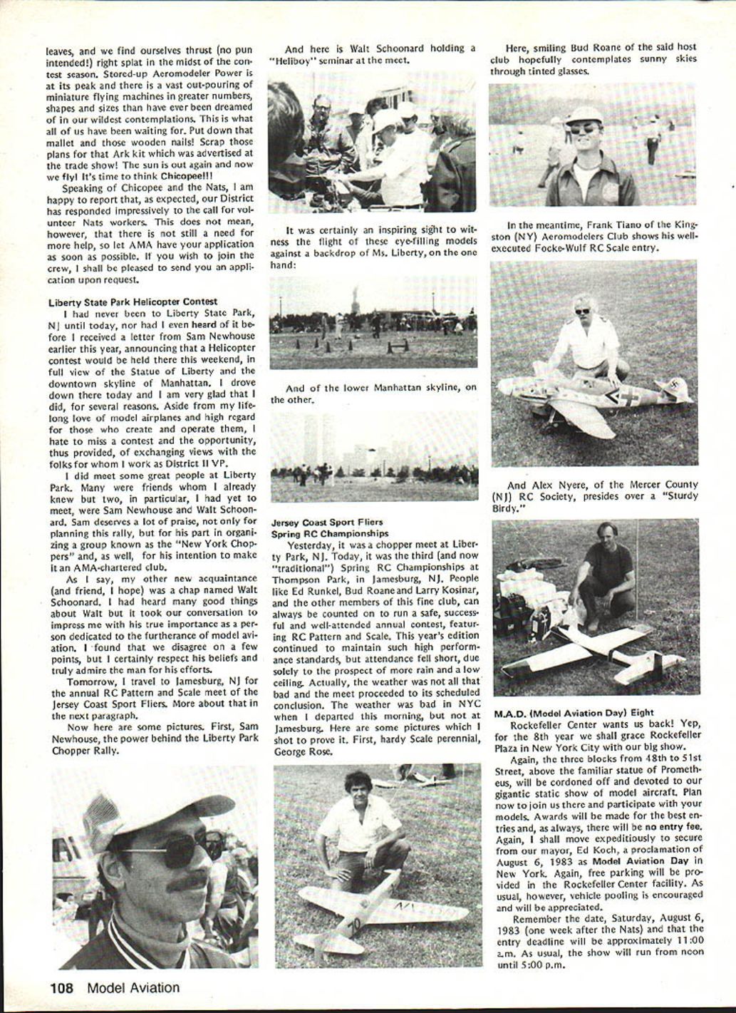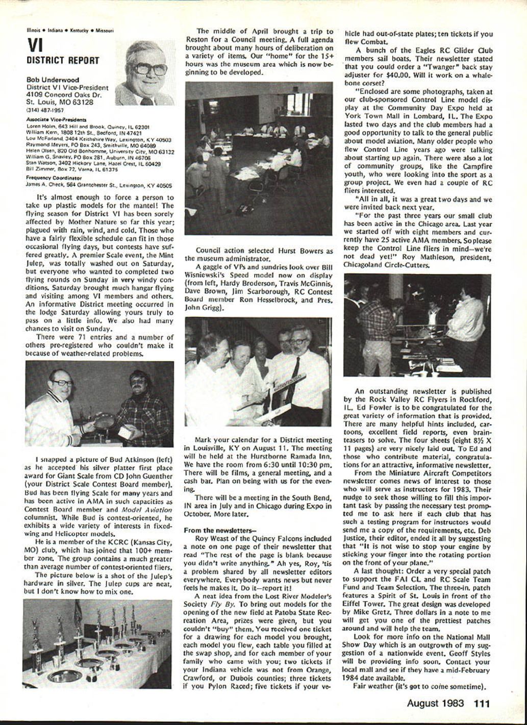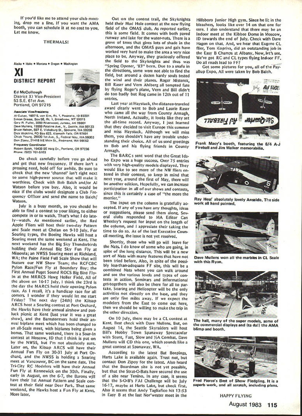 A Great Opportunity AMA Clubs Academy Announces uAdopt.A.SchooIP Project Proposal AMA Public Relations Department suggests AMA chartered clubs Adopt a-School community adop tion would involve purchasing $30 full AMA membership using club funds teacher school math science indus trial arts Club members could assist teacher programs involving model avia tion model aircraft benefit students Model flying demonstrations various types could given club space per mitted Show tell sessions could part teaching sessions demonstrate skills fun gained through model aviation possible school Model Aviation Club could founded three people required Benefits AMA Club would get good recogni tion community public-spirited effort Community governments control much land request flying site would received positive atmosphere local government knew school ef fort AMA club Any problems related noise other complaints would heard much sympathetic forum due clubs helpful attitude Requirements Club members could agree support schedule minimum hours would required work teacher clubs have shift workers could avail able during day Other members work daytime hours could perhaps provide some Saturday morning time school students club no reason load fall heavily person group persons club overall membership recognizes benefits community club willing play small part program PR Values local newspapers radio TV normally looking community involvement human interest stories club achieves its goal helps local students im prove scholastic standings math science bound get recognition may find another local group will sponsor help flying site should remember club flying field can experience some guished months site lost always good idea have other possibilities ready National Impact hear continuously American youngsters need improve math science skills understanding could consider would performing essential public service future benefit United States club participates program program catches nationwide would have very good chance getting national recognition sport something long overdue will happen unless take posi tive steps Adopt-A-School can ve hicle can make happen Club Recognition Academy will present club signs up program Certificate recognizes participation Special patches will available low cost members want shirts jackets Certification club officer will needed ensure work scheme no matter few hours given will eligible special patches Summary opportunity public spirited opportunity put something back community model aviation opportunity reduce taxes getting kids interested model aviation instead some less desirable pastimes today opportunity local hero share love model aircraft appreciative audience make work local teacher less arduous about it?" Sign Up Write Public Relations Department AMA tell us will Tell us name school what plan Public Relations Department can pro vide supporting brochures sample letter make easier ap proach local schooL need to ask us will send what need return mail Send application teacher will start sub scription Model v/at/on right away Get some dialog going chosen teacher put model aviation constructive light community request Recognition Certification club give us name teacher hislher AMA number will rest AMAs Grand Opening official dedication ceremonies National Center Aeromodeling Reston VA will Saturday September 241983 unique structure houses Academys administrative headquarters its model air craft museum museum dedicated preserving historical significant model air craft related memorabilia educa tional instructional use interested people dedication ceremonies will followed Open House celebration Invitations being sent prominent figures govern ment aviation industry Members Academy also invited present Open House festivities will continue Sunday September 25 General public visits Center will possible limited ap pointment basis following dedication wee kend August 1983 101 AMA HQ bY Executive Director including reports AMA President Executive VP Vice-Presidents ACADEMY OF MODEL AERONAUTICS 1810 Samuel Morse Dr Reston VA 22090 AMA HQ SERVICES STAFF 0e S Executive Director John Worth S Assistant Executive Director Vince Mankowski S Executive Secretary Joyce Hager S Comptroller Gisele Jackson S Competition Services Director Micheline Madison S Special Services Director Carl Maroney S Membership Director Carol Merfeld S Public Relations Director Geoff Styles S Special Events Manager Douglas Pratt S Publications Director Carl R Wheeley S Administrative Coordinator Bob Voislavek S S General Counsel Jeremiah Courtney S Asst General Counsel Jack Smith Hew Six-Meter NC Frequencies Last month AMA News published arti cle AMA Frequency Committee member C Torrey Williams concerning recentlyapproved ARRL American Radio Relay League plan frequency allocations six-meter 50-54 MHz radio banda plan provides 10 new RC channels five now five 1991 See George Myers Radio Technique column month background Torrey Last months report mentioned complete Six-Meter Band Plan titled Ap pendix would published August issue plan Please note definitely allocates entire spectrum frequencies 50 MHz 54 MHz mostly communications special slice RC 5080 through 5098 Please refer last months article complete discussion AMA Six-Meter Phase- Plan freq uency/channel assignments transmitter frequency flag specifications should noted existing five fre quencies 5310 through 5350 used RC six-meter band will continue available RC use expected increasingly subject RF interference other users Approval use five initial six-meter channels new sec tion band made effective May 1 1983 another excellent example AMAs Frequency Committee has served RCers case special credit due former committeeman Dick Jansson liaison role between AMA ARRL also former committee chairman Bob Aberle directed effort Torrey Williams guiding expertise APPENDIX 1 ARRL SIX-METER BAND PLAN April 1983 50000 50100 50060 50080 50100- 50600 50110 50200 50400 50600- 51000 507 00 5080