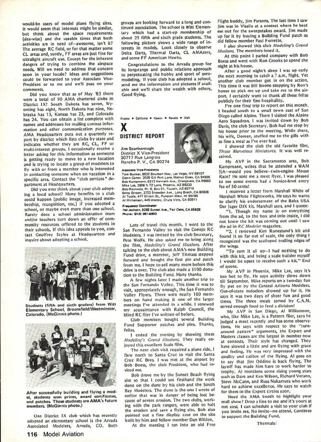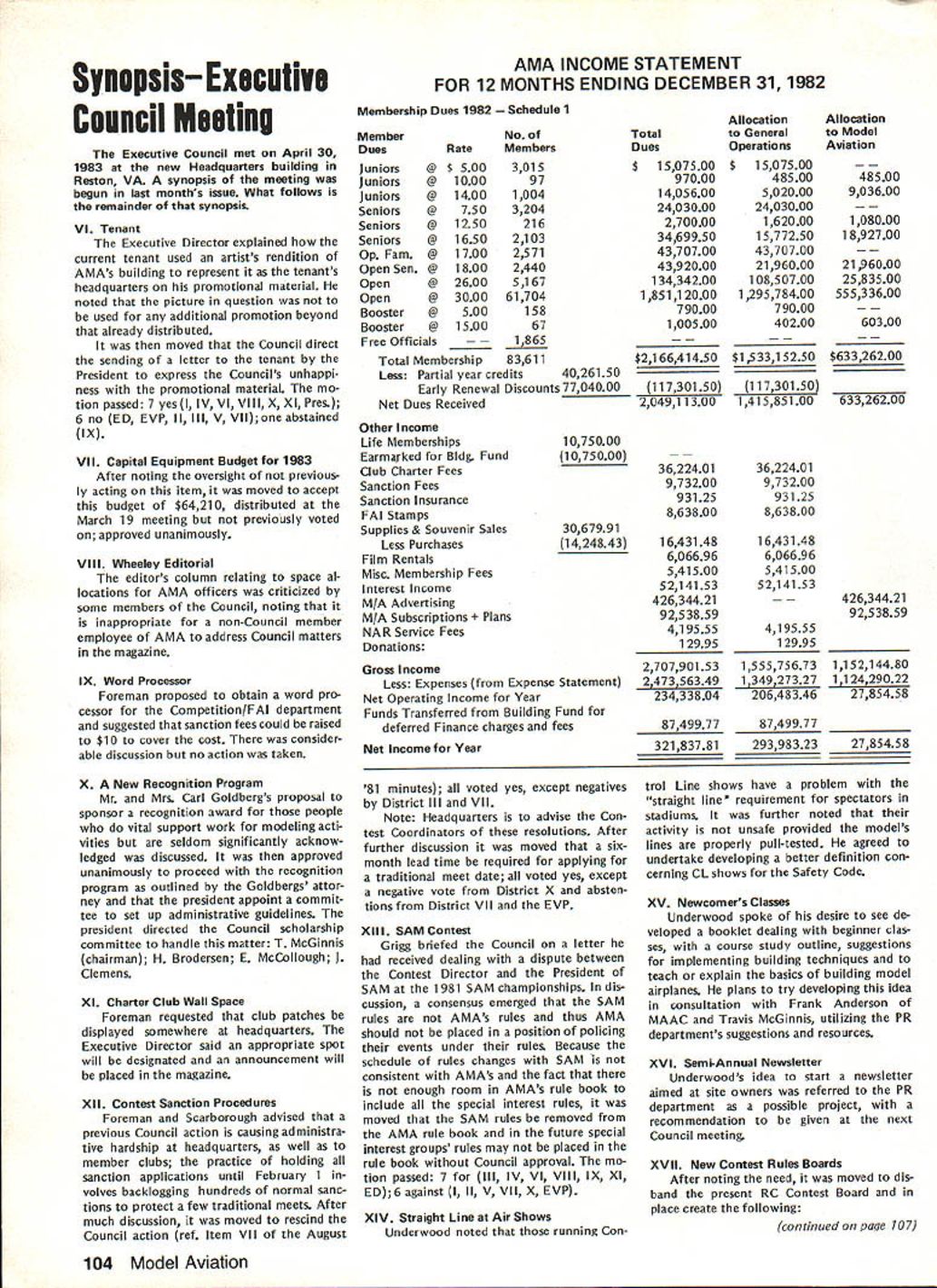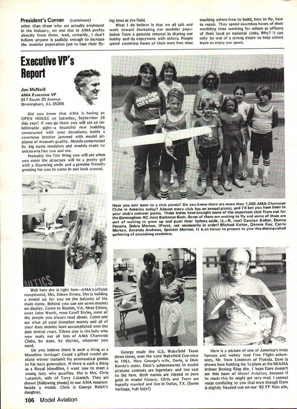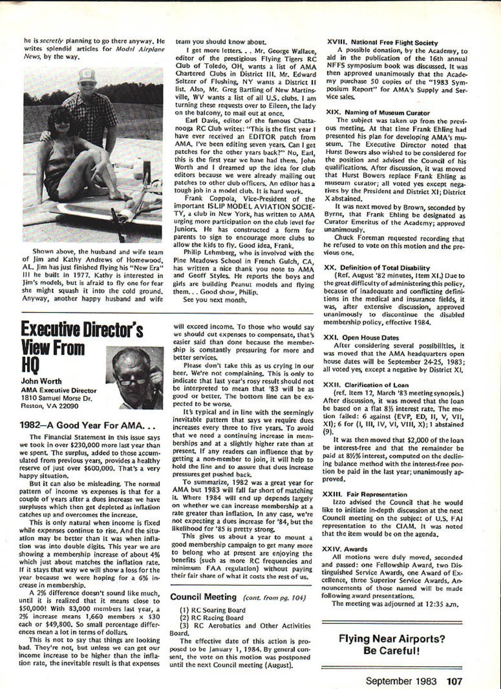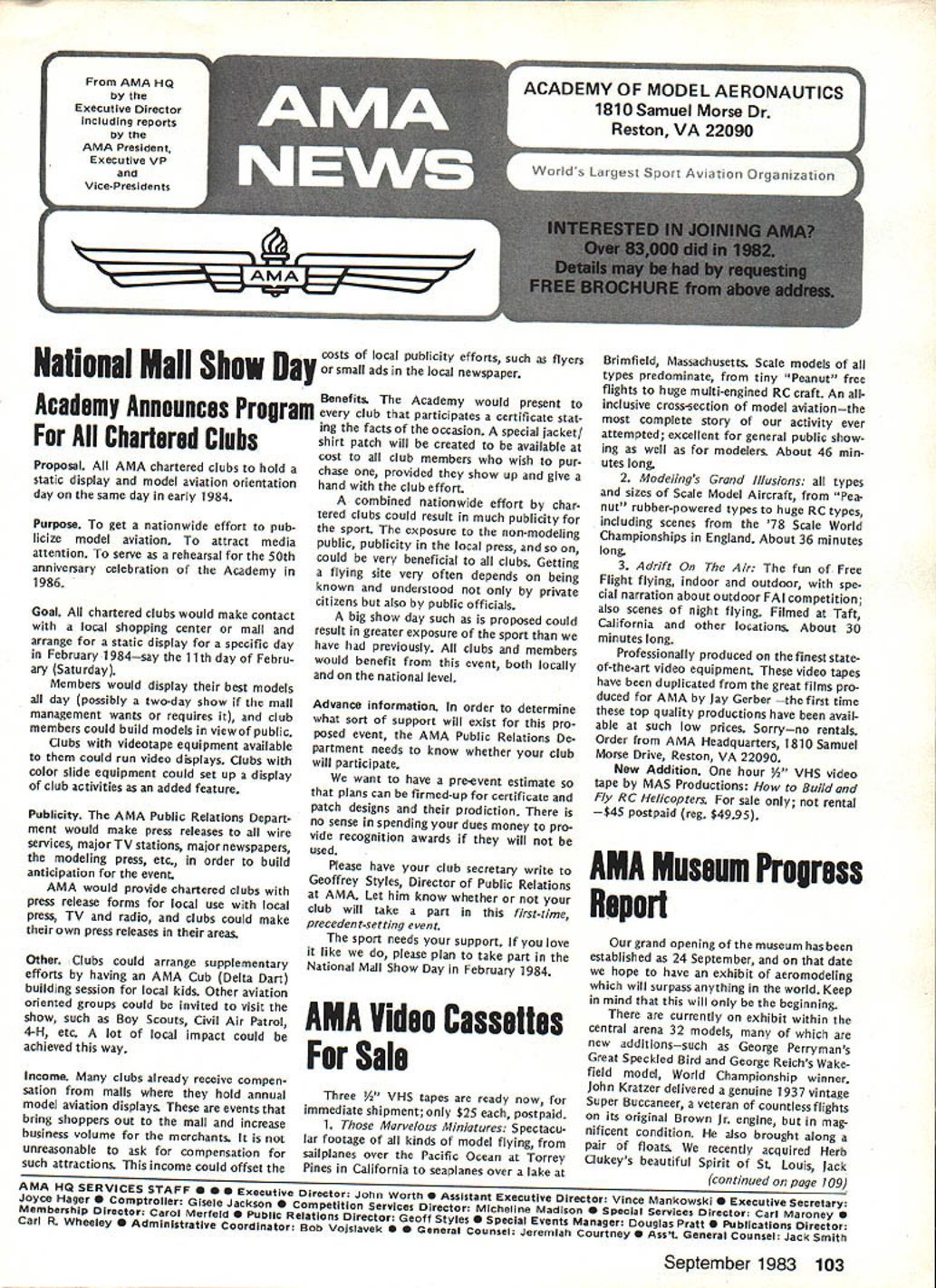 r L L costs local publicity efforts such flyers National Mall Show Day small ads local newspaper Benefits Academy would present Academy Announces Program club participates certificate stat ing facts occasion special jacket F Chartered Clubsshirt patch will created available cost club members wish pur chase provided show up give hand club effort combined nationwide effort char tered clubs could result much publicity sport exposure non-modeling public publicity local press could very beneficial clubs Getting flying site very often depends being known understood private citizens also public officials big show day such proposed could result greater exposure sport have previously clubs members would benefit event both locally national level Advance information order determine what sort support will exist pro posed event AMA Public Relations De partment needs know whether club will participate want have pre-event estimate plans can firmed-up certificate patch designs prodiction no sense spending dues money pro vide recognition awards will used Please have club secretary write Geoffrey Styles Director Public Relations AMA Let him know whether club will take part first-time Precedent-setting event sport needs support love like please plan take part National Mall Show Day February 1984 AMA Video Cassettes Sale Proposal AMA chartered clubs hold static display model aviation orientation day same day early 1984 Purpose get nationwide effort pub licize model aviation attract media attention serve rehearsal 50th anniversary celebration Academy 1986 Goal chartered clubs would make contact local shopping center mall arrange static display specific day February l984say 11th day Febru ary Saturday Members would display best models day possibly two-day show mall management wants requires club members could build models viewof public Clubs videotape equipment available could run video displays Clubs color slide equipment could set up display club activities added feature Publicity AMA Public Relations Depart ment would make press releases wire services major TV stations major newspapers modeling press etc order build anticipation event AMA would provide chartered clubs press release forms local use local press TV radio clubs could make own press releases areas Other Clubs could arrange supplementary efforts having AMA Cub Delta Dart building session local kids Other aviation oriented groups could invited visit show such Boy Scouts Civil Air Patrol 4-H etc lot local impact could achieved way Three VHS tapes ready now immediate shipment $25 postpaid 1 Those Marvelous Miniatures Spectacu lar footage kinds model flying saliplanes over Pacific Ocean Torrey Pines California seaplanes over lake Brimfield Massachusetts Scale models types predominate tiny Peanut free flights huge multi-engined RC craft An allinclusive cross-section model aviationthe complete story activity ever attempted excellent general public show ing well modelers About 46 min utes long 2 Modelings Grand Illusions types sizes Scale Model Aircraft Pea nut rubber-powered types huge RC types including scenes 78 Scale World Championships England About 36 minutes long 3 Adrift Air fun Free Flight flying indoor outdoor spe cial narration about outdoor FAI competition also scenes night flying Filmed Taft California other locations About 30 minutes long Professionally produced finest stateof-the-art video equipment video tapes have duplicated great films pro duced AMA Jay Gerber first time top quality productions have avail able such low prices Sorryno rentals Order AMA Headquarters 1810 Samuel Morse Drive Reston VA 22090 New Addition hour VHS video tape MAS Productions Build Fly PC Helicopters sale rental $45 postpaid reg $4995 AMA Museum Progress Report grand opening museum has established 24 September date hope have exhibit aeromodeling will surpass anything world Keep mind will beginning currently exhibit within central arena 32 models whJch new additionssuch George Perrymans Great Speckled Bird George Reichs Wake field model World Championship winner John Kratzer delivered genuine 1937 vintage Super Buccaneer veteran countless flights its original Brown Jr engine mag nificent condition also brought along pair floats recently acquired Herb Clukeys beautiful Spirit St Louis Jack continued page 109 Income clubs already receive compen sation malls hold annual model aviation displays events bring shoppers out mall increase business volume merchants unreasonable ask compensation such attractions income could offset AMA HQ SERVICES STAFF S @0 Executive Director John Worth 0 Assistant Executive Director Vince Mankowski S Executive Secretary Joyce Hager S Comptroller Gisele Jackson S Competition Services Director Micheline Madison S Special Services Director Carl Maroney S Membership Director Carol Merfeld S Public Relations Director Geoff Styles S Special Events Manager Douglas Pratt S Publications Director Carl R Wheeley S Administrative Coordinator Bob Voislavek S S General Counsel Jeremiah Courtneyg Asst General Counsel Jack Smith September 1983 103 AMA HQ Executive Director including reports AMA President Executive VP Vice-Presidents ACADEMY OF MODEL AERONAUTICS 1810 Samuel Morse Dr Reston VA 22090 Synopsis Executive Council Meeting Executive Council met April 30 1983 new Headquarters building Reston VA synopsis meeting begun last months issue What follows remainder synopsis VI Tenant Executive Director explained current tenant used artists rendition AMAs building represent tenants headquarters promotional material lie noted picture question used additional promotion beyond already distributed moved Council direct sending letter tenant President express Councils unhappi ness promotional material mo tion passed 7 yesl IV VI VIII X Xl Pres 6 no ED EVP II III V VIIone abstained IX VII Capital Equipment Budget 1983 After noting oversight previous ly acting item moved accept budget $64210 distributed March 19 meeting previously voted approved unanimously VI