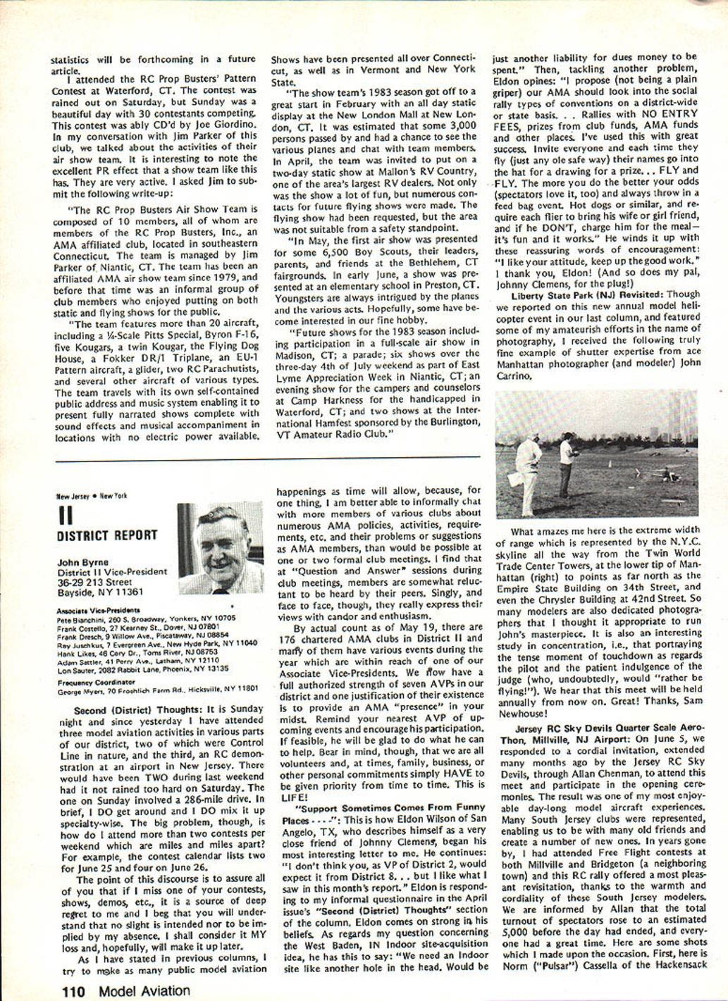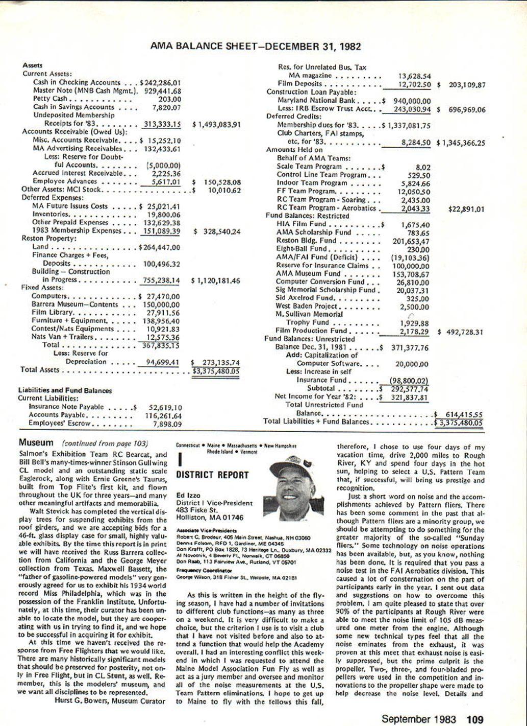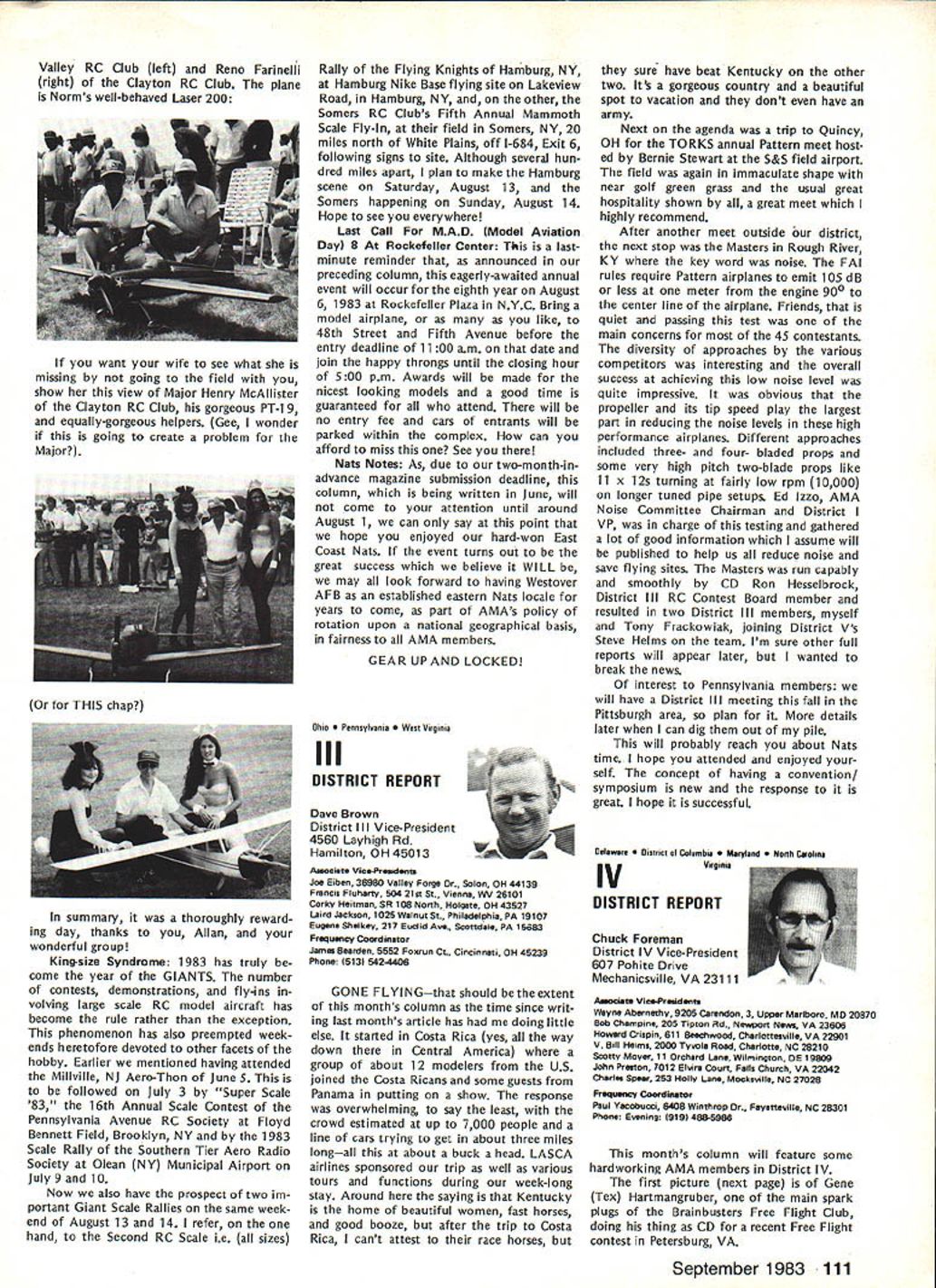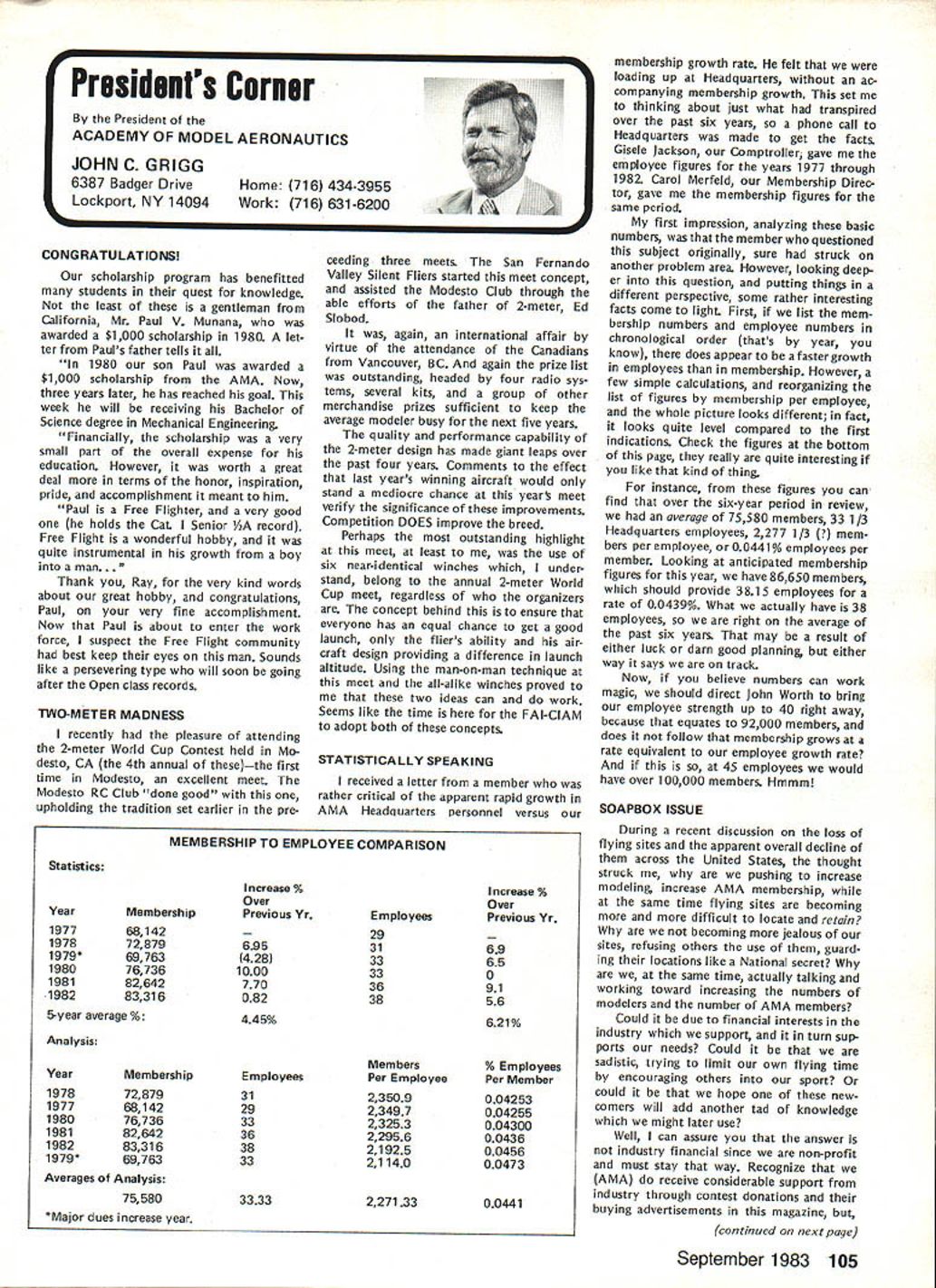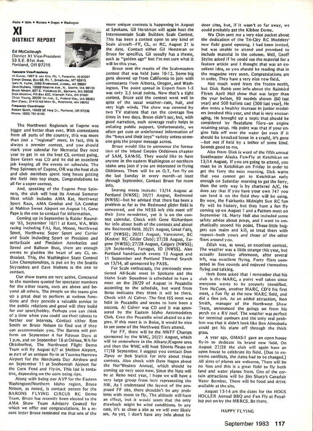 r L L costs local publicity efforts such flyers National Mall Show Day small ads local newspaper Benefits Academy would present Academy Announces Program club participates certificate stat ing facts occasion special jacket F Chartered Clubsshirt patch will created available cost club members wish pur chase provided show up give hand club effort combined nationwide effort char tered clubs could result much publicity sport exposure non-modeling public publicity local press could very beneficial clubs Getting flying site very often depends being known understood private citizens also public officials big show day such proposed could result greater exposure sport have previously clubs members would benefit event both locally national level Advance information order determine what sort support will exist pro posed event AMA Public Relations De partment needs know whether club will participate want have pre-event estimate plans can firmed-up certificate patch designs prodiction no sense spending dues money pro vide recognition awards will used Please have club secretary write Geoffrey Styles Director Public Relations AMA Let him know whether club will take part first-time Precedent-setting event sport needs support love like please plan take part National Mall Show Day February 1984 AMA Video Cassettes Sale Proposal AMA chartered clubs hold static display model aviation orientation day same day early 1984 Purpose get nationwide effort pub licize model aviation attract media attention serve rehearsal 50th anniversary celebration Academy 1986 Goal chartered clubs would make contact local shopping center mall arrange static display specific day February l984say 11th day Febru ary Saturday Members would display best models day possibly two-day show mall management wants requires club members could build models viewof public Clubs videotape equipment available could run video displays Clubs color slide equipment could set up display club activities added feature Publicity AMA Public Relations Depart ment would make press releases wire services major TV stations major newspapers modeling press etc order build anticipation event AMA would provide chartered clubs press release forms local use local press TV radio clubs could make own press releases areas Other Clubs could arrange supplementary efforts having AMA Cub Delta Dart building session local kids Other aviation oriented groups could invited visit show such Boy Scouts Civil Air Patrol 4-H etc lot local impact could achieved way Three VHS tapes ready now immediate shipment $25 postpaid 1 Those Marvelous Miniatures Spectacu lar footage kinds model flying saliplanes over Pacific Ocean Torrey Pines California seaplanes over lake Brimfield Massachusetts Scale models types predominate tiny Peanut free flights huge multi-engined RC craft An allinclusive cross-section model aviationthe complete story activity ever attempted excellent general public show ing well modelers About 46 min utes long 2 Modelings Grand Illusions types sizes Scale Model Aircraft Pea nut rubber-powered types huge RC types including scenes 78 Scale World Championships England About 36 minutes long 3 Adrift Air fun Free Flight flying indoor outdoor spe cial narration about outdoor FAI competition also scenes night flying Filmed Taft California other locations About 30 minutes long Professionally produced finest stateof-the-art video equipment video tapes have duplicated great films pro duced AMA Jay Gerber first time top quality productions have avail able such low prices Sorryno rentals Order AMA Headquarters 1810 Samuel Morse Drive Reston VA 22090 New Addition hour VHS video tape MAS Productions Build Fly PC Helicopters sale rental $45 postpaid reg $4995 AMA Museum Progress Report grand opening museum has established 24 September date hope have exhibit aeromodeling will surpass anything world Keep mind will beginning currently exhibit within central arena 32 models whJch new additionssuch George Perrymans Great Speckled Bird George Reichs Wake field model World Championship winner John Kratzer delivered genuine 1937 vintage Super Buccaneer veteran countless flights its original Brown Jr engine mag nificent condition also brought along pair floats recently acquired Herb Clukeys beautiful Spirit St Louis Jack continued page 109 Income clubs already receive compen sation malls hold annual model aviation displays events bring shoppers out mall increase business volume merchants unreasonable ask compensation such attractions income could offset AMA HQ SERVICES STAFF S @0 Executive Director John Worth 0 Assistant Executive Director Vince Mankowski S Executive Secretary Joyce Hager S Comptroller Gisele Jackson S Competition Services Director Micheline Madison S Special Services Director Carl Maroney S Membership Director Carol Merfeld S Public Relations Director Geoff Styles S Special Events Manager Douglas Pratt S Publications Director Carl R Wheeley S Administrative Coordinator Bob Voislavek S S General Counsel Jeremiah Courtneyg Asst General Counsel Jack Smith September 1983 103 AMA HQ Executive Director including reports AMA President Executive VP Vice-Presidents ACADEMY OF MODEL AERONAUTICS 1810 Samuel Morse Dr Reston VA 22090 Synopsis Executive Council Meeting Executive Council met April 30 1983 new Headquarters building Reston VA synopsis meeting begun last months issue What follows remainder synopsis VI Tenant Executive Director explained current tenant used artists rendition AMAs building represent tenants headquarters promotional material lie noted picture question used additional promotion beyond already distributed moved Council direct sending letter tenant President express Councils unhappi ness promotional material mo tion passed 7 yesl IV VI VIII X Xl Pres 6 no ED EVP II III V VIIone abstained IX VII Capital Equipment Budget 1983 After noting oversight previous ly acting item moved accept budget $64210 distributed March 19 meeting previously voted approved unanimously VI