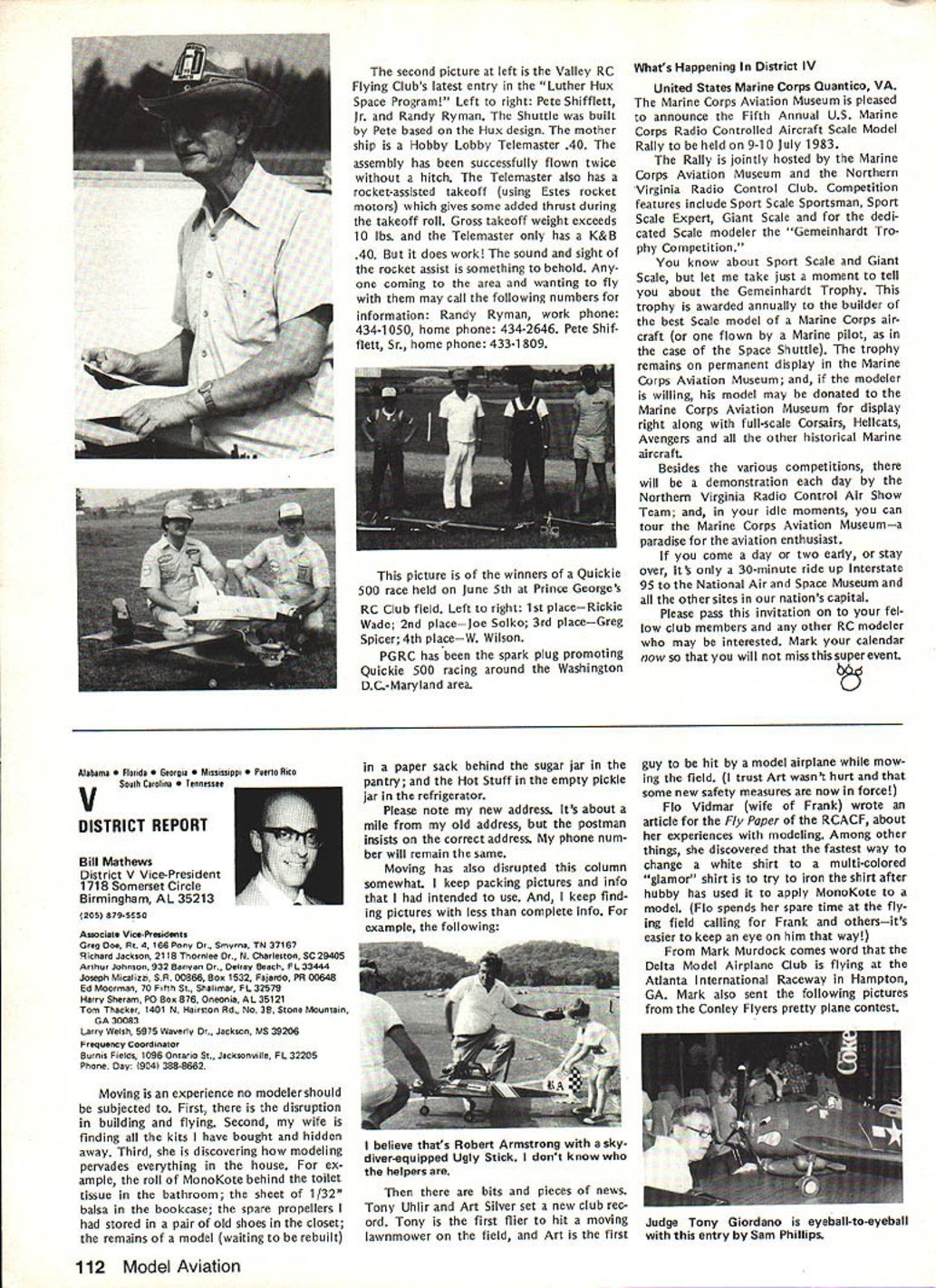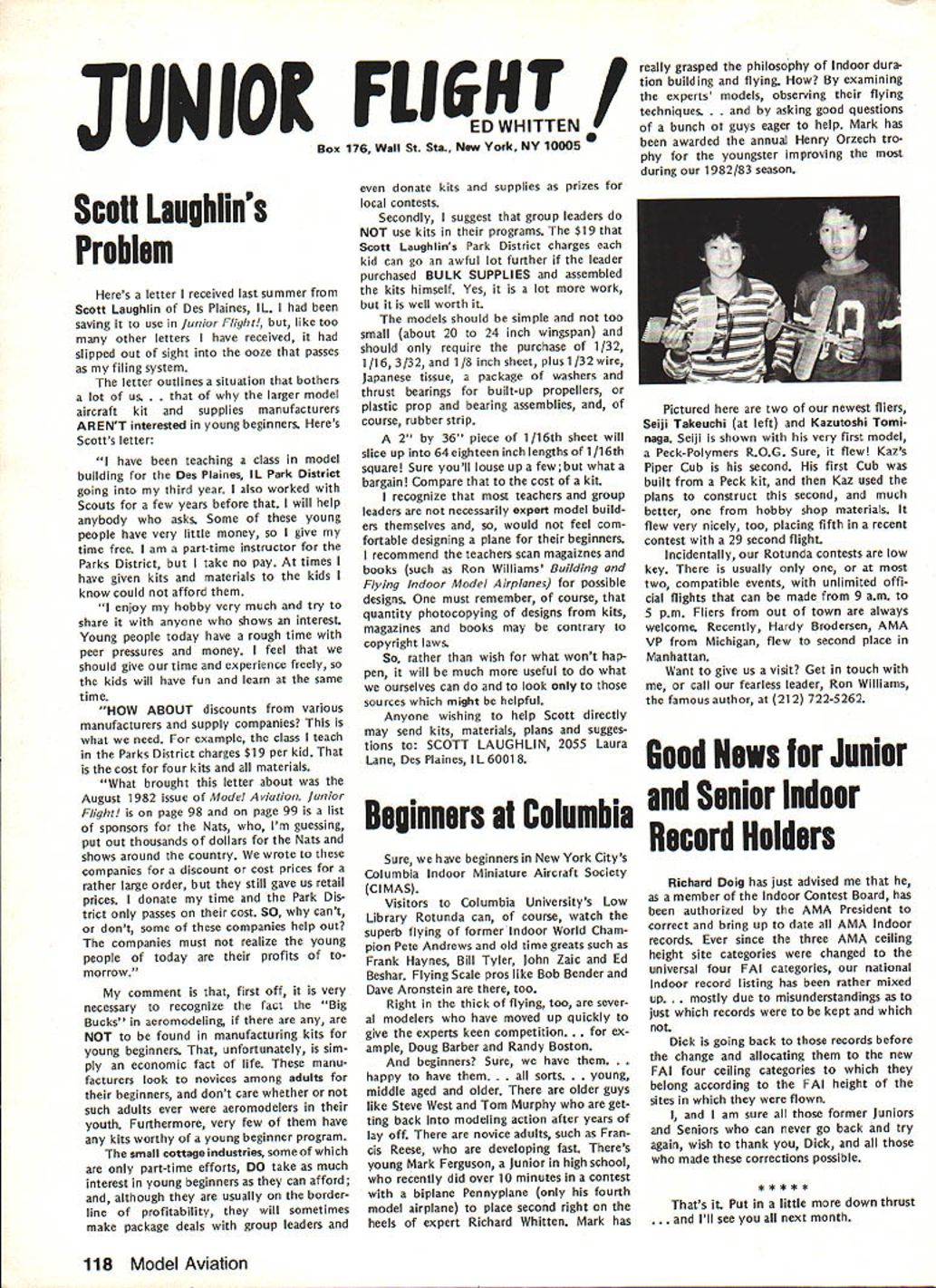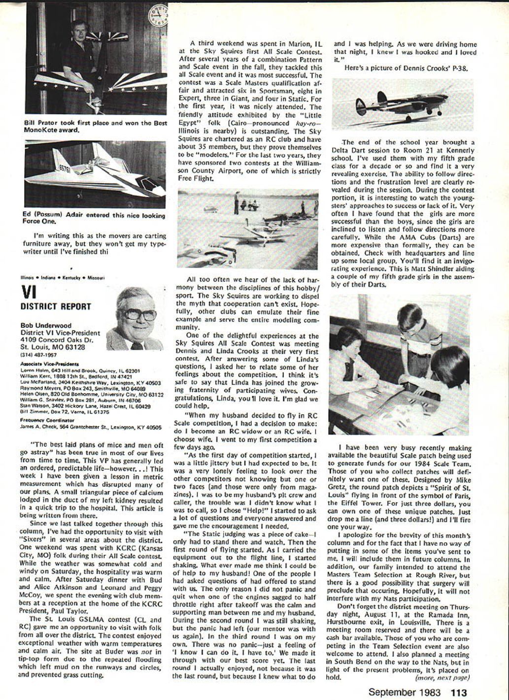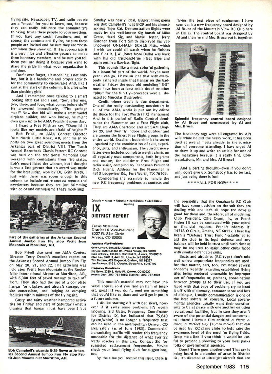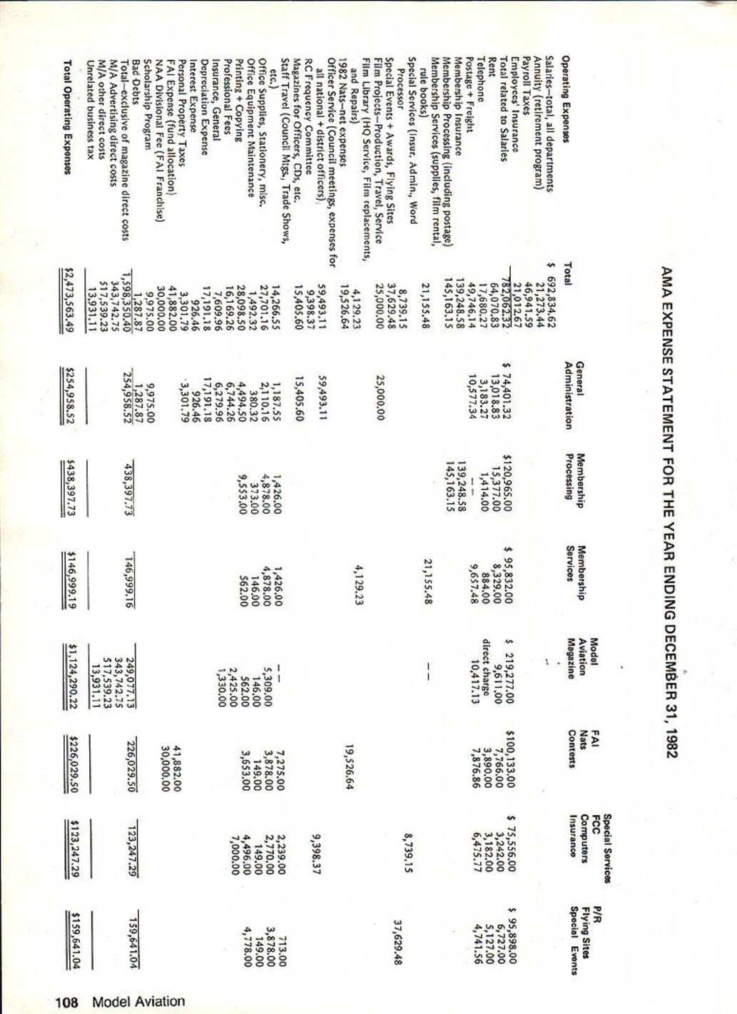 r L L costs local publicity efforts such flyers National Mall Show Day small ads local newspaper Benefits Academy would present Academy Announces Program club participates certificate stat ing facts occasion special jacket F Chartered Clubsshirt patch will created available cost club members wish pur chase provided show up give hand club effort combined nationwide effort char tered clubs could result much publicity sport exposure non-modeling public publicity local press could very beneficial clubs Getting flying site very often depends being known understood private citizens also public officials big show day such proposed could result greater exposure sport have previously clubs members would benefit event both locally national level Advance information order determine what sort support will exist pro posed event AMA Public Relations De partment needs know whether club will participate want have pre-event estimate plans can firmed-up certificate patch designs prodiction no sense spending dues money pro vide recognition awards will used Please have club secretary write Geoffrey Styles Director Public Relations AMA Let him know whether club will take part first-time Precedent-setting event sport needs support love like please plan take part National Mall Show Day February 1984 AMA Video Cassettes Sale Proposal AMA chartered clubs hold static display model aviation orientation day same day early 1984 Purpose get nationwide effort pub licize model aviation attract media attention serve rehearsal 50th anniversary celebration Academy 1986 Goal chartered clubs would make contact local shopping center mall arrange static display specific day February l984say 11th day Febru ary Saturday Members would display best models day possibly two-day show mall management wants requires club members could build models viewof public Clubs videotape equipment available could run video displays Clubs color slide equipment could set up display club activities added feature Publicity AMA Public Relations Depart ment would make press releases wire services major TV stations major newspapers modeling press etc order build anticipation event AMA would provide chartered clubs press release forms local use local press TV radio clubs could make own press releases areas Other Clubs could arrange supplementary efforts having AMA Cub Delta Dart building session local kids Other aviation oriented groups could invited visit show such Boy Scouts Civil Air Patrol 4-H etc lot local impact could achieved way Three VHS tapes ready now immediate shipment $25 postpaid 1 Those Marvelous Miniatures Spectacu lar footage kinds model flying saliplanes over Pacific Ocean Torrey Pines California seaplanes over lake Brimfield Massachusetts Scale models types predominate tiny Peanut free flights huge multi-engined RC craft An allinclusive cross-section model aviationthe complete story activity ever attempted excellent general public show ing well modelers About 46 min utes long 2 Modelings Grand Illusions types sizes Scale Model Aircraft Pea nut rubber-powered types huge RC types including scenes 78 Scale World Championships England About 36 minutes long 3 Adrift Air fun Free Flight flying indoor outdoor spe cial narration about outdoor FAI competition also scenes night flying Filmed Taft California other locations About 30 minutes long Professionally produced finest stateof-the-art video equipment video tapes have duplicated great films pro duced AMA Jay Gerber first time top quality productions have avail able such low prices Sorryno rentals Order AMA Headquarters 1810 Samuel Morse Drive Reston VA 22090 New Addition hour VHS video tape MAS Productions Build Fly PC Helicopters sale rental $45 postpaid reg $4995 AMA Museum Progress Report grand opening museum has established 24 September date hope have exhibit aeromodeling will surpass anything world Keep mind will beginning currently exhibit within central arena 32 models whJch new additionssuch George Perrymans Great Speckled Bird George Reichs Wake field model World Championship winner John Kratzer delivered genuine 1937 vintage Super Buccaneer veteran countless flights its original Brown Jr engine mag nificent condition also brought along pair floats recently acquired Herb Clukeys beautiful Spirit St Louis Jack continued page 109 Income clubs already receive compen sation malls hold annual model aviation displays events bring shoppers out mall increase business volume merchants unreasonable ask compensation such attractions income could offset AMA HQ SERVICES STAFF S @0 Executive Director John Worth 0 Assistant Executive Director Vince Mankowski S Executive Secretary Joyce Hager S Comptroller Gisele Jackson S Competition Services Director Micheline Madison S Special Services Director Carl Maroney S Membership Director Carol Merfeld S Public Relations Director Geoff Styles S Special Events Manager Douglas Pratt S Publications Director Carl R Wheeley S Administrative Coordinator Bob Voislavek S S General Counsel Jeremiah Courtneyg Asst General Counsel Jack Smith September 1983 103 AMA HQ Executive Director including reports AMA President Executive VP Vice-Presidents ACADEMY OF MODEL AERONAUTICS 1810 Samuel Morse Dr Reston VA 22090 Synopsis Executive Council Meeting Executive Council met April 30 1983 new Headquarters building Reston VA synopsis meeting begun last months issue What follows remainder synopsis VI Tenant Executive Director explained current tenant used artists rendition AMAs building represent tenants headquarters promotional material lie noted picture question used additional promotion beyond already distributed moved Council direct sending letter tenant President express Councils unhappi ness promotional material mo tion passed 7 yesl IV VI VIII X Xl Pres 6 no ED EVP II III V VIIone abstained IX VII Capital Equipment Budget 1983 After noting oversight previous ly acting item moved accept budget $64210 distributed March 19 meeting previously voted approved unanimously VI