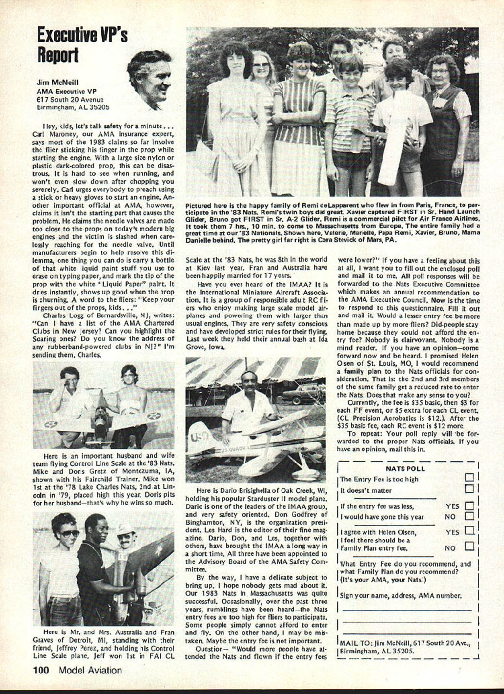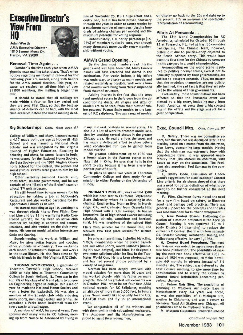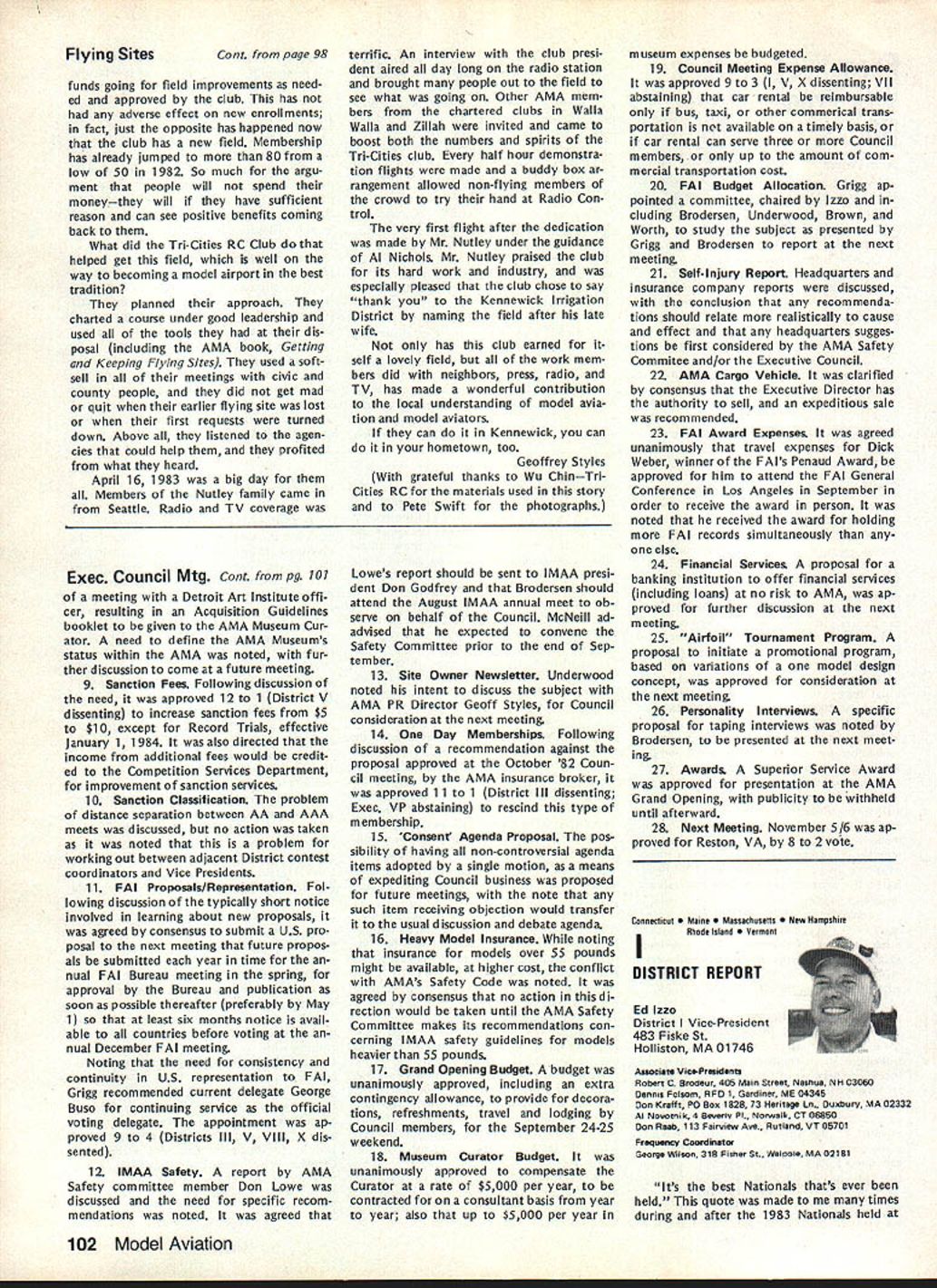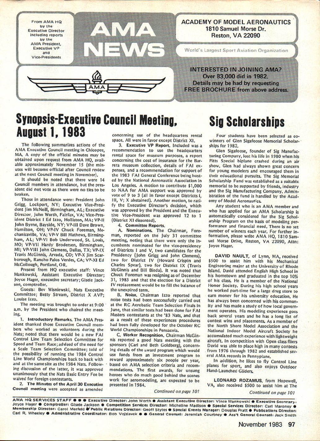 August 1 1983 following summarizes actions AMA Executive Council meeting Chicopee MA copy official minutes may obtained upon request AMA l-IQ avail able approximately November 15 min utes will become official after Council review next Council meeting November should noted 14 Council members attendance pres ident did vote no ties broken attendance President John Grigg Lockport NY Executive Vice-Presi dent Jim McNeill Birmingham AL Executive Director John Worth Fairfax VA Vice-Pres ident District Ed Izzo Holliston MA VP-Il John Byrne Bayside NY VP-Ill Dave Brown Hamilton OH VP-IV Chuck Foreman chanicsville VA VP-V Bill Mathews Birming ham AL VP-VI Bob Underwood St Louis MO VP-VII Hardy Brodersen Birmingham MI VP-VIII John Clemens Dallas TX VP-IX Travis McGinnis Arvada CO VP-X Jim Scar borough Rancho Palos Verdes CA VP-XI Ed McCollough Portland OR Present HQ executive staff Vince Man kowski Assistant Executive Director Joyce Hager executive secretary Gisele Jack son comptroller Guests Bev Wisniewski Nats Executive Committee Betty Stream District X AVP Louise Izzo meeting brought order 900 am President chaired meet ing 1 Introductory Remarks AMA Pres ident thanked Executive Council mem bers worked volunteers during Nats noted would new FAI Control Line Team Selection Committee Speed Team Race advised need Scale Team Selection Committee told possibility running 1984 Control Line World Championships back back same site 1 984 Nats Follow ing discussion latter approved unanimously Nats Basic Entry Fee waived foreign contestants 2 Minutes April 30 Executive Council meeting accepted amended concerning use headquarters rental space favor except District XI 3 Executive VP Report Included recommendation use headquarters rental space museum purposes report concerning cost insurance Bar rera museum collection details FAI ex penses recommendation support 1983 FAI General Conference being host ed National Aeronautic Association Los Angeles motion contribute $1000 NAA AMA support approved vote 9 3 favor except Districts III V X abstained Another motion rati fy Executive Directors decision approved President Execu tive Vice-President approved 12 1 District XI dissented 4 Committee Reports Nominations Chairman Fore man reported July 31 committee meeting noting cumbents nominated vice-presidency Districts V two candidates Presidency John Grigg John Clemens two District IV Howard Crispin Charles Spear two District IX Travis McGinnis Bill Bieda noted Chuck Foreman resigning December 31 1983 election District IV replacement would fill balance unexpired term B Noise Chairman Izzo reported noise tests successfully carried out RC Aerobatic Team Selection Finals June similar tests done FAI Masters contestants 83 Nats result experiences procedures fully developed October RC World Chain pionships Pensacola C Worker Recognition Chairman McGin nis reported good Nats meeting sponsors Carl Beth Goldberg concern ing details 0ward program would use funds investment program reward approximately six people per year based AMA selection criteria recom mendations first awards unsung heroes much good behind scenes work aeromodeling expected presented 1984 Continued page 101 Four students have selected co winners Glen Sigafoose Memorial Scholar ships 1982 Glen Sigafoose founder Sig Manufac turing Company lost life 1980 Pitts Special biplane crashed during air show Glen always shown great concern young modelers encouraged educational pursuits Sig Memorial Scholarship Fund established suitable memorial supported friends industry Sig Manufacturing Company Admin istration fund handled Acad emy Model Aeronautics Any student AMA member has applied AMA Scholarship automatically considered Sig Schol arship Program basis modeling per formance financial need no set number winners year further formation please write AMA HO 1810 Sam uel Morse Drive Reston VA 22090 Attn Joyce Hager DAVID NAULT Lynn MA received $500 assist him Mechanical Engineering major University Rhode Island David attended English High School hometown graduated top 10% class member National Honor Society During high school years worked part-time large drug store earn money university education has always concerned commun ity has made study local govern ment operates modeling experience goes back several years has long list contest wins placements As member North Shore Model Association National Indoor Model Aircraft Society accumulated much experience lightweight aircraft competition Open class fliers David able place high contests 1976 through 1982 established sev eral AMA records Pennyplane addition likes fly Control Line planes sport also enjoys Outdoor Hand-Launched Gliders LEONARD ROZAMUS Hopewell VA also received $500 assist him Continued page 101 November 1983 97 AMA HQ Executive Director including reports bY AMA President Executive VP Vice-Presidents ACADEMY OF MODEL AERONAUTICS 1810 Samuel Morse Dr Reston VA 22090 Synopsis-Executive Council Meeting Sig Scholarships AMA HQ SERVICES STAFF 0O S Executive Director John Worth S Assistant Executive Director Vince Mankowski S Executive Secretary Joyce Hager S Comptroller Gisele Jackson S Competition Services Director Micheline Madison 0 Special Services Director Carl Maroney S Membership Director Carol Merfeld bPublic Relations Director Geoff Styles 0 Special Events Manager Douglas Pratt S Publications Director Carl R Wheeley S Administrative Coordinator Bob Voislavek S S General Counsel JeremIah Courtney S Asst General Counsel Jack Smith IN WASHINGTON STATE Flying Sits Success get flying site answers question Story Tn-Cities RC Club Richland Pasco/Kennewick area State Wash ington will provide clubs working flying site project solid information shows what right approach can ac complish Rosadell Nutley Field official ly opened April 16 1983 dedica tion ceremony honored late Mrs Rosadell Nutley leading proponent Kennewick Irrigation District Mr Nutley hand accept memorial plaque thanked club honor naming new model airport 