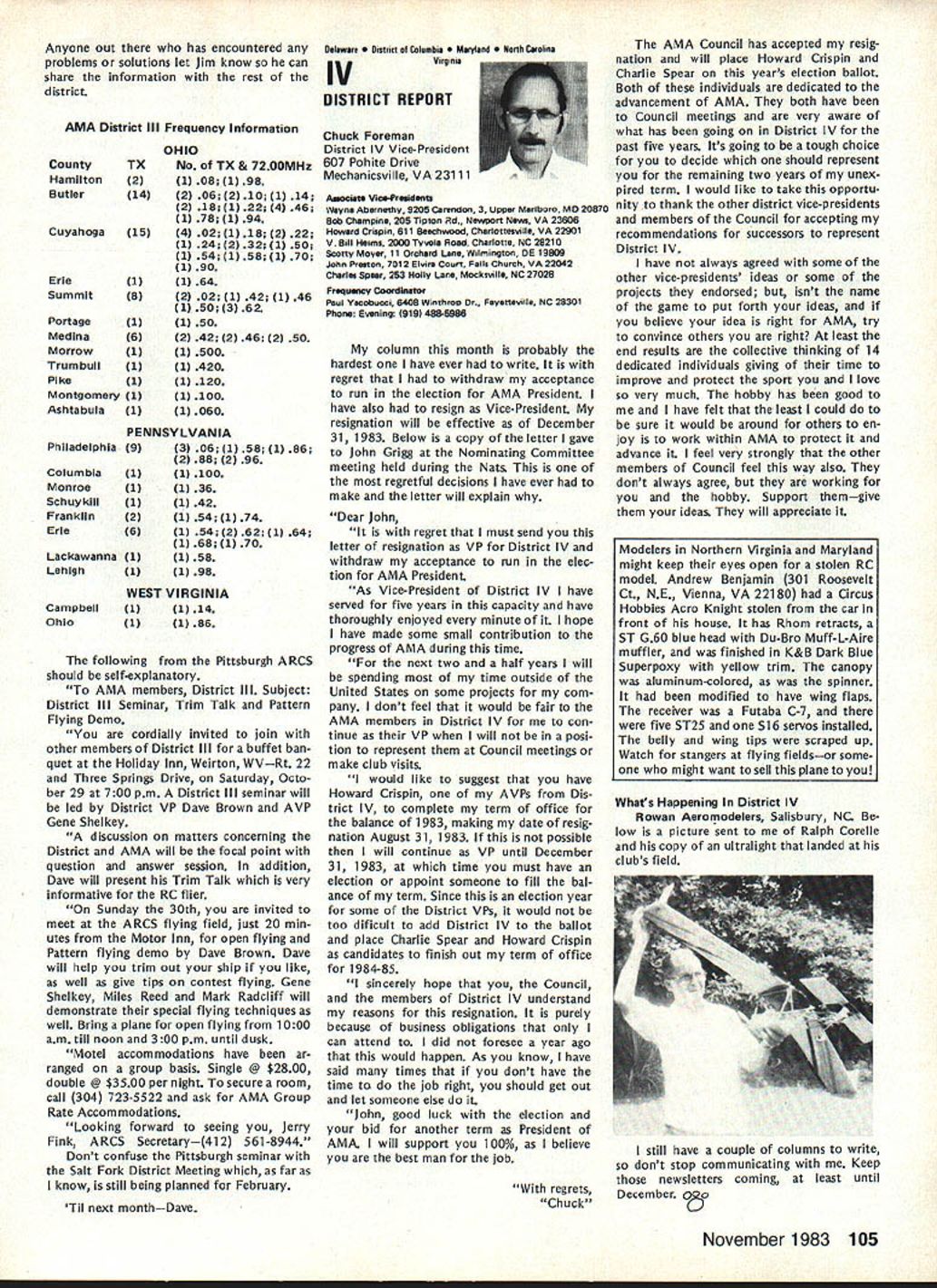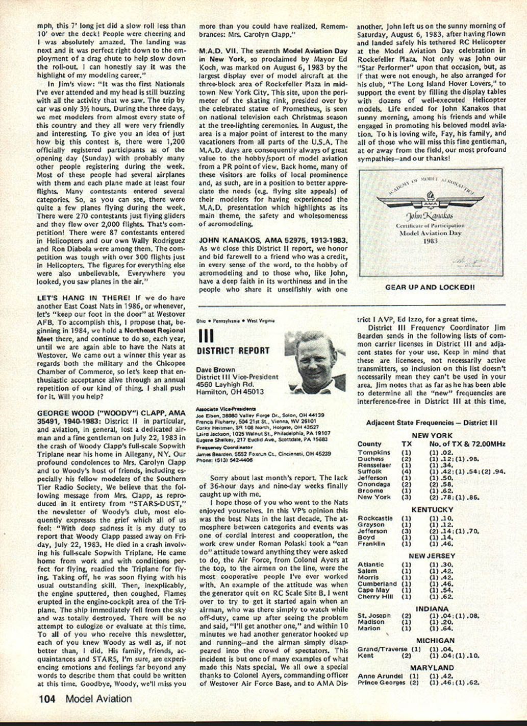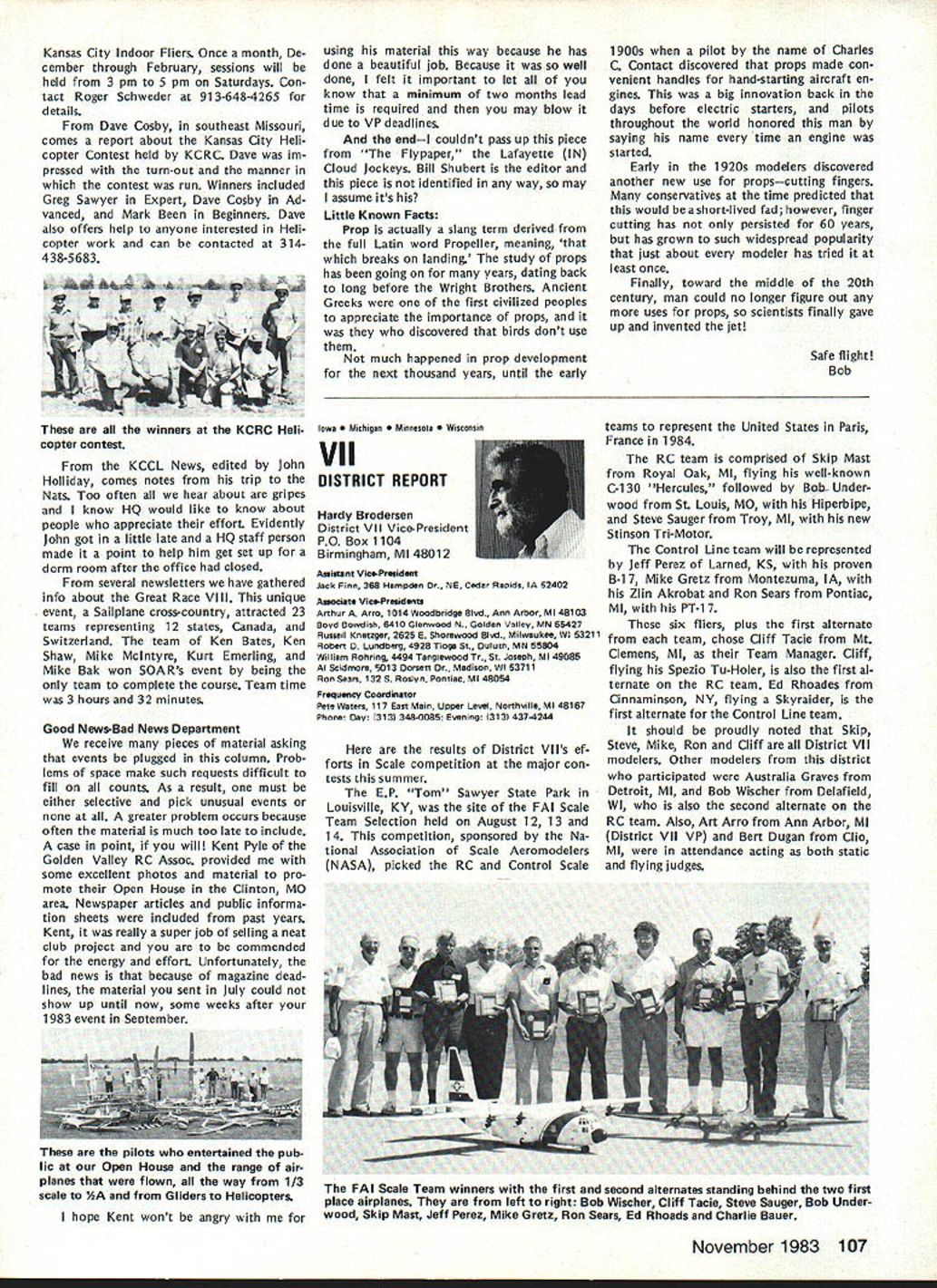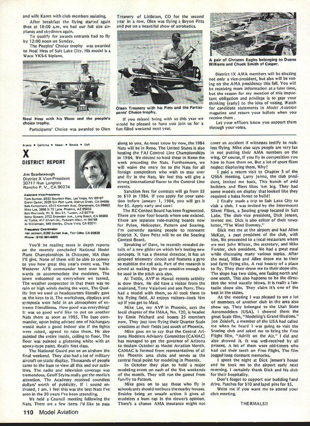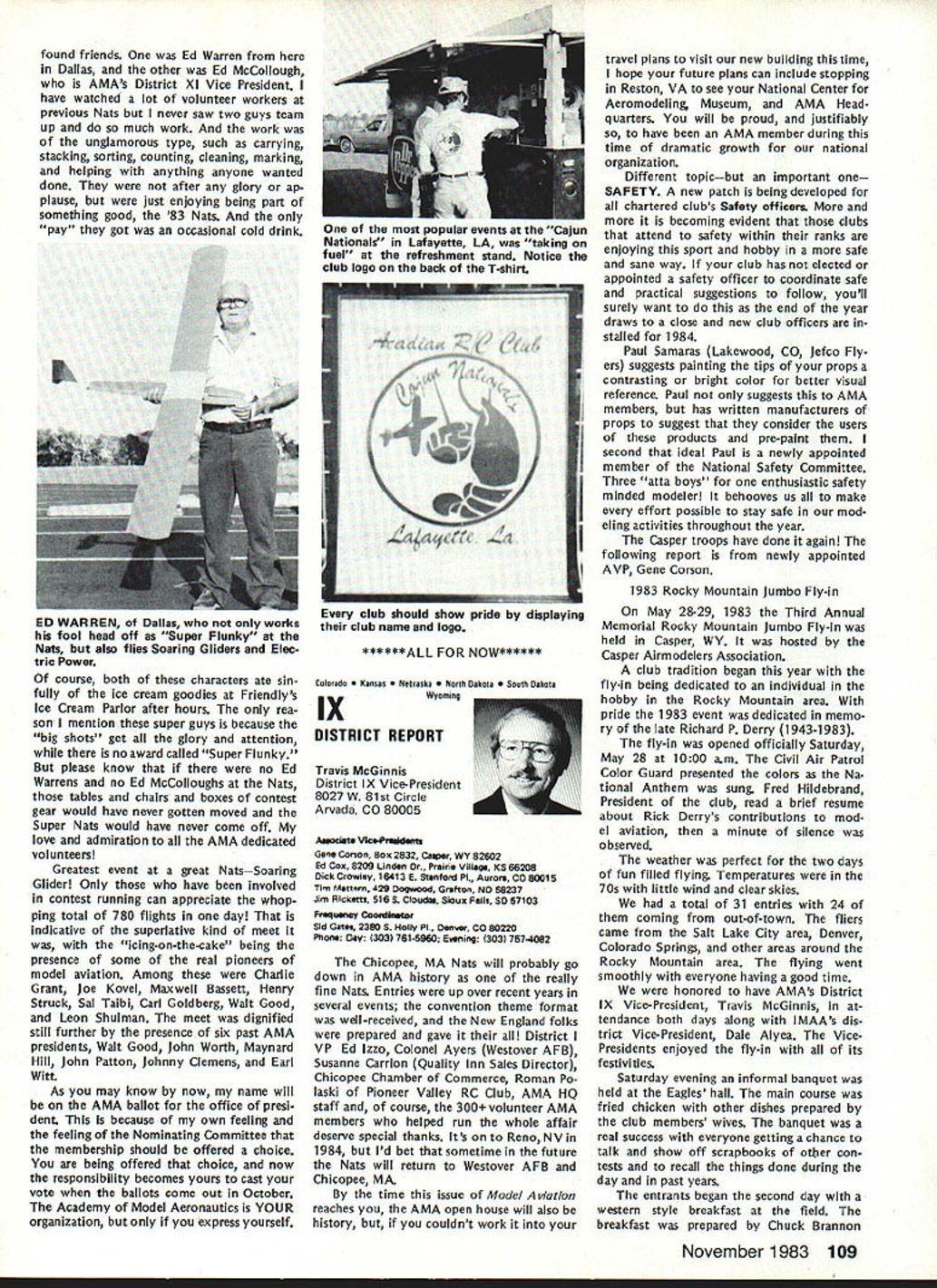 August 1 1983 following summarizes actions AMA Executive Council meeting Chicopee MA copy official minutes may obtained upon request AMA l-IQ avail able approximately November 15 min utes will become official after Council review next Council meeting November should noted 14 Council members attendance pres ident did vote no ties broken attendance President John Grigg Lockport NY Executive Vice-Presi dent Jim McNeill Birmingham AL Executive Director John Worth Fairfax VA Vice-Pres ident District Ed Izzo Holliston MA VP-Il John Byrne Bayside NY VP-Ill Dave Brown Hamilton OH VP-IV Chuck Foreman chanicsville VA VP-V Bill Mathews Birming ham AL VP-VI Bob Underwood St Louis MO VP-VII Hardy Brodersen Birmingham MI VP-VIII John Clemens Dallas TX VP-IX Travis McGinnis Arvada CO VP-X Jim Scar borough Rancho Palos Verdes CA VP-XI Ed McCollough Portland OR Present HQ executive staff Vince Man kowski Assistant Executive Director Joyce Hager executive secretary Gisele Jack son comptroller Guests Bev Wisniewski Nats Executive Committee Betty Stream District X AVP Louise Izzo meeting brought order 900 am President chaired meet ing 1 Introductory Remarks AMA Pres ident thanked Executive Council mem bers worked volunteers during Nats noted would new FAI Control Line Team Selection Committee Speed Team Race advised need Scale Team Selection Committee told possibility running 1984 Control Line World Championships back back same site 1 984 Nats Follow ing discussion latter approved unanimously Nats Basic Entry Fee waived foreign contestants 2 Minutes April 30 Executive Council meeting accepted amended concerning use headquarters rental space favor except District XI 3 Executive VP Report Included recommendation use headquarters rental space museum purposes report concerning cost insurance Bar rera museum collection details FAI ex penses recommendation support 1983 FAI General Conference being host ed National Aeronautic Association Los Angeles motion contribute $1000 NAA AMA support approved vote 9 3 favor except Districts III V X abstained Another motion rati fy Executive Directors decision approved President Execu tive Vice-President approved 12 1 District XI dissented 4 Committee Reports Nominations Chairman Fore man reported July 31 committee meeting noting cumbents nominated vice-presidency Districts V two candidates Presidency John Grigg John Clemens two District IV Howard Crispin Charles Spear two District IX Travis McGinnis Bill Bieda noted Chuck Foreman resigning December 31 1983 election District IV replacement would fill balance unexpired term B Noise Chairman Izzo reported noise tests successfully carried out RC Aerobatic Team Selection Finals June similar tests done FAI Masters contestants 83 Nats result experiences procedures fully developed October RC World Chain pionships Pensacola C Worker Recognition Chairman McGin nis reported good Nats meeting sponsors Carl Beth Goldberg concern ing details 0ward program would use funds investment program reward approximately six people per year based AMA selection criteria recom mendations first awards unsung heroes much good behind scenes work aeromodeling expected presented 1984 Continued page 101 Four students have selected co winners Glen Sigafoose Memorial Scholar ships 1982 Glen Sigafoose founder Sig Manufac turing Company lost life 1980 Pitts Special biplane crashed during air show Glen always shown great concern young modelers encouraged educational pursuits Sig Memorial Scholarship Fund established suitable memorial supported friends industry Sig Manufacturing Company Admin istration fund handled Acad emy Model Aeronautics Any student AMA member has applied AMA Scholarship automatically considered Sig Schol arship Program basis modeling per formance financial need no set number winners year further formation please write AMA HO 1810 Sam uel Morse Drive Reston VA 22090 Attn Joyce Hager DAVID NAULT Lynn MA received $500 assist him Mechanical Engineering major University Rhode Island David attended English High School hometown graduated top 10% class member National Honor Society During high school years worked part-time large drug store earn money university education has always concerned commun ity has made study local govern ment operates modeling experience goes back several years has long list contest wins placements As member North Shore Model Association National Indoor Model Aircraft Society accumulated much experience lightweight aircraft competition Open class fliers David able place high contests 1976 through 1982 established sev eral AMA records Pennyplane addition likes fly Control Line planes sport also enjoys Outdoor Hand-Launched Gliders LEONARD ROZAMUS Hopewell VA also received $500 assist him Continued page 101 November 1983 97 AMA HQ Executive Director including reports bY AMA President Executive VP Vice-Presidents ACADEMY OF MODEL AERONAUTICS 1810 Samuel Morse Dr Reston VA 22090 Synopsis-Executive Council Meeting Sig Scholarships AMA HQ SERVICES STAFF 0O S Executive Director John Worth S Assistant Executive Director Vince Mankowski S Executive Secretary Joyce Hager S Comptroller Gisele Jackson S Competition Services Director Micheline Madison 0 Special Services Director Carl Maroney S Membership Director Carol Merfeld bPublic Relations Director Geoff Styles 0 Special Events Manager Douglas Pratt S Publications Director Carl R Wheeley S Administrative Coordinator Bob Voislavek S S General Counsel JeremIah Courtney S Asst General Counsel Jack Smith IN WASHINGTON STATE Flying Sits Success get flying site answers question Story Tn-Cities RC Club Richland Pasco/Kennewick area State Wash ington will provide clubs working flying site project solid information shows what right approach can ac complish Rosadell Nutley Field official ly opened April 16 1983 dedica tion ceremony honored late Mrs Rosadell Nutley leading proponent Kennewick Irrigation District Mr Nutley hand accept memorial plaque thanked club honor naming new model airport 