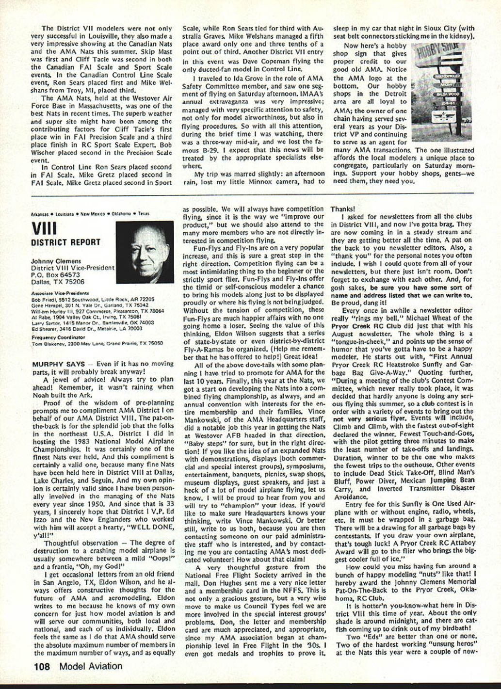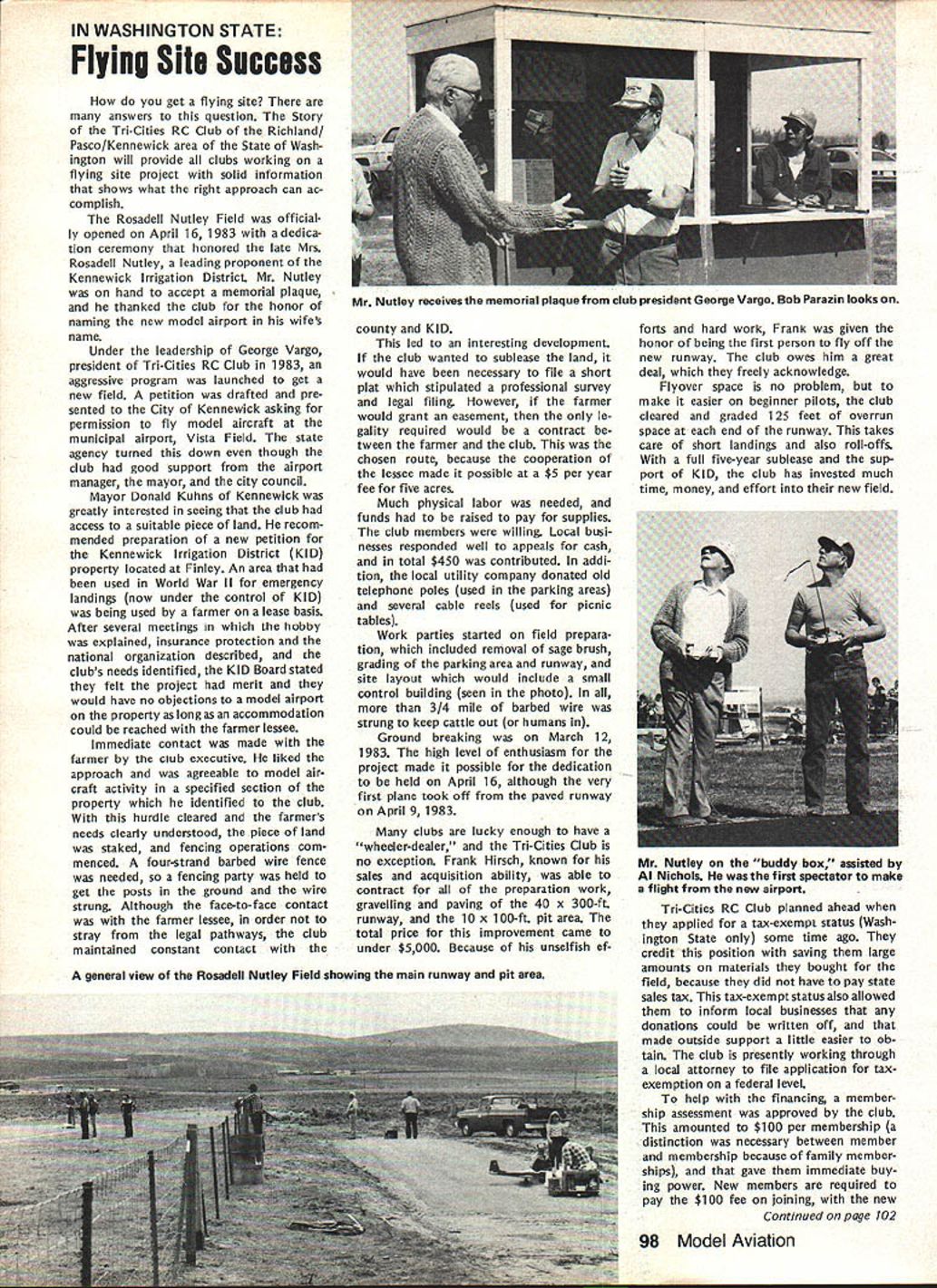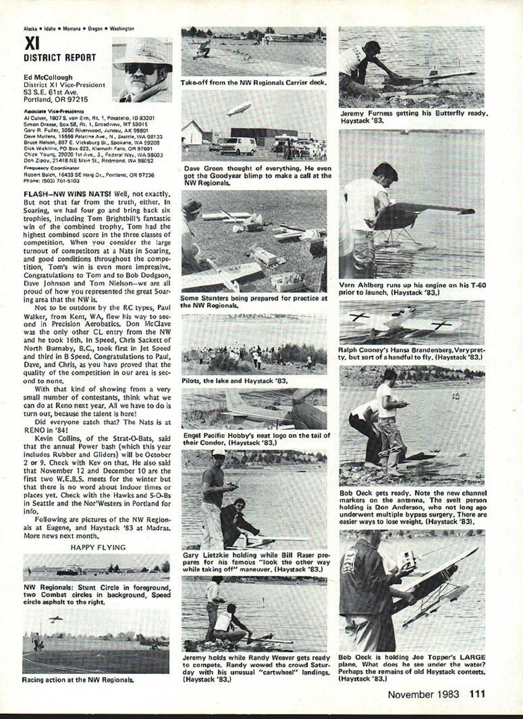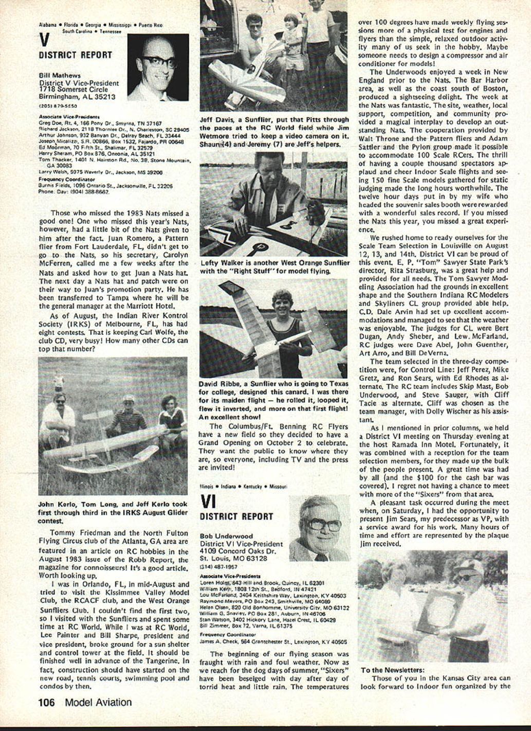 August 1 1983 following summarizes actions AMA Executive Council meeting Chicopee MA copy official minutes may obtained upon request AMA l-IQ avail able approximately November 15 min utes will become official after Council review next Council meeting November should noted 14 Council members attendance pres ident did vote no ties broken attendance President John Grigg Lockport NY Executive Vice-Presi dent Jim McNeill Birmingham AL Executive Director John Worth Fairfax VA Vice-Pres ident District Ed Izzo Holliston MA VP-Il John Byrne Bayside NY VP-Ill Dave Brown Hamilton OH VP-IV Chuck Foreman chanicsville VA VP-V Bill Mathews Birming ham AL VP-VI Bob Underwood St Louis MO VP-VII Hardy Brodersen Birmingham MI VP-VIII John Clemens Dallas TX VP-IX Travis McGinnis Arvada CO VP-X Jim Scar borough Rancho Palos Verdes CA VP-XI Ed McCollough Portland OR Present HQ executive staff Vince Man kowski Assistant Executive Director Joyce Hager executive secretary Gisele Jack son comptroller Guests Bev Wisniewski Nats Executive Committee Betty Stream District X AVP Louise Izzo meeting brought order 900 am President chaired meet ing 1 Introductory Remarks AMA Pres ident thanked Executive Council mem bers worked volunteers during Nats noted would new FAI Control Line Team Selection Committee Speed Team Race advised need Scale Team Selection Committee told possibility running 1984 Control Line World Championships back back same site 1 984 Nats Follow ing discussion latter approved unanimously Nats Basic Entry Fee waived foreign contestants 2 Minutes April 30 Executive Council meeting accepted amended concerning use headquarters rental space favor except District XI 3 Executive VP Report Included recommendation use headquarters rental space museum purposes report concerning cost insurance Bar rera museum collection details FAI ex penses recommendation support 1983 FAI General Conference being host ed National Aeronautic Association Los Angeles motion contribute $1000 NAA AMA support approved vote 9 3 favor except Districts III V X abstained Another motion rati fy Executive Directors decision approved President Execu tive Vice-President approved 12 1 District XI dissented 4 Committee Reports Nominations Chairman Fore man reported July 31 committee meeting noting cumbents nominated vice-presidency Districts V two candidates Presidency John Grigg John Clemens two District IV Howard Crispin Charles Spear two District IX Travis McGinnis Bill Bieda noted Chuck Foreman resigning December 31 1983 election District IV replacement would fill balance unexpired term B Noise Chairman Izzo reported noise tests successfully carried out RC Aerobatic Team Selection Finals June similar tests done FAI Masters contestants 83 Nats result experiences procedures fully developed October RC World Chain pionships Pensacola C Worker Recognition Chairman McGin nis reported good Nats meeting sponsors Carl Beth Goldberg concern ing details 0ward program would use funds investment program reward approximately six people per year based AMA selection criteria recom mendations first awards unsung heroes much good behind scenes work aeromodeling expected presented 1984 Continued page 101 Four students have selected co winners Glen Sigafoose Memorial Scholar ships 1982 Glen Sigafoose founder Sig Manufac turing Company lost life 1980 Pitts Special biplane crashed during air show Glen always shown great concern young modelers encouraged educational pursuits Sig Memorial Scholarship Fund established suitable memorial supported friends industry Sig Manufacturing Company Admin istration fund handled Acad emy Model Aeronautics Any student AMA member has applied AMA Scholarship automatically considered Sig Schol arship Program basis modeling per formance financial need no set number winners year further formation please write AMA HO 1810 Sam uel Morse Drive Reston VA 22090 Attn Joyce Hager DAVID NAULT Lynn MA received $500 assist him Mechanical Engineering major University Rhode Island David attended English High School hometown graduated top 10% class member National Honor Society During high school years worked part-time large drug store earn money university education has always concerned commun ity has made study local govern ment operates modeling experience goes back several years has long list contest wins placements As member North Shore Model Association National Indoor Model Aircraft Society accumulated much experience lightweight aircraft competition Open class fliers David able place high contests 1976 through 1982 established sev eral AMA records Pennyplane addition likes fly Control Line planes sport also enjoys Outdoor Hand-Launched Gliders LEONARD ROZAMUS Hopewell VA also received $500 assist him Continued page 101 November 1983 97 AMA HQ Executive Director including reports bY AMA President Executive VP Vice-Presidents ACADEMY OF MODEL AERONAUTICS 1810 Samuel Morse Dr Reston VA 22090 Synopsis-Executive Council Meeting Sig Scholarships AMA HQ SERVICES STAFF 0O S Executive Director John Worth S Assistant Executive Director Vince Mankowski S Executive Secretary Joyce Hager S Comptroller Gisele Jackson S Competition Services Director Micheline Madison 0 Special Services Director Carl Maroney S Membership Director Carol Merfeld bPublic Relations Director Geoff Styles 0 Special Events Manager Douglas Pratt S Publications Director Carl R Wheeley S Administrative Coordinator Bob Voislavek S S General Counsel JeremIah Courtney S Asst General Counsel Jack Smith IN WASHINGTON STATE Flying Sits Success get flying site answers question Story Tn-Cities RC Club Richland Pasco/Kennewick area State Wash ington will provide clubs working flying site project solid information shows what right approach can ac complish Rosadell Nutley Field official ly opened April 16 1983 dedica tion ceremony honored late Mrs Rosadell Nutley leading proponent Kennewick Irrigation District Mr Nutley hand accept memorial plaque thanked club honor naming new model airport 