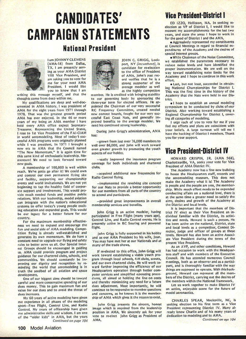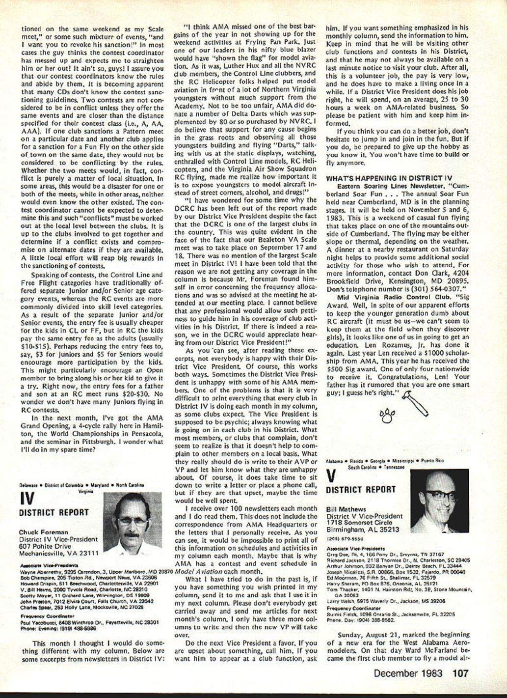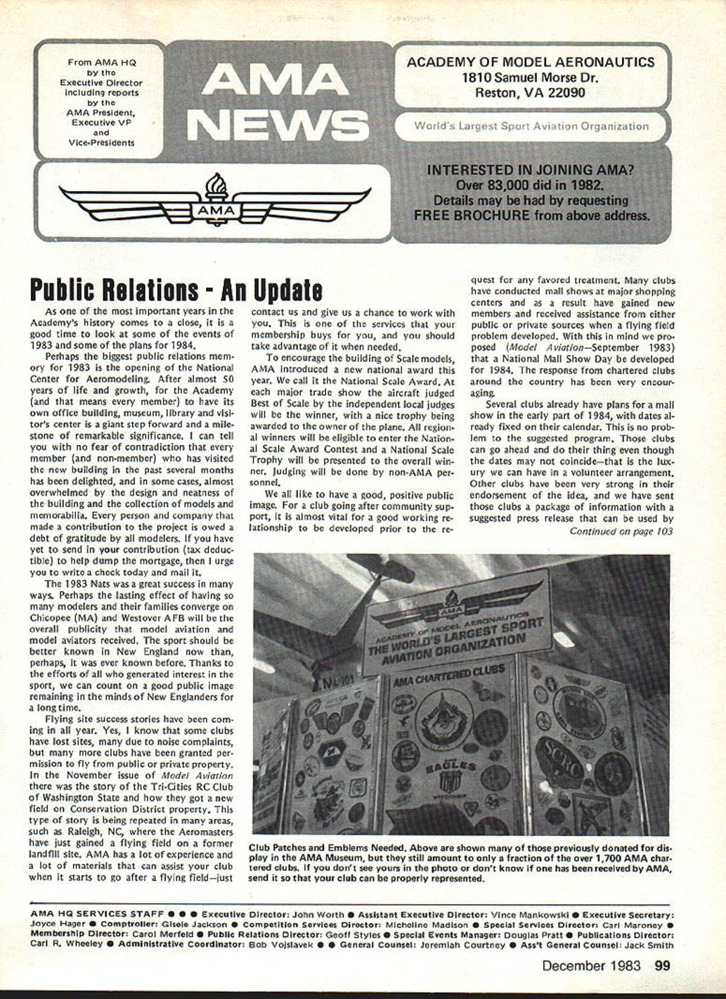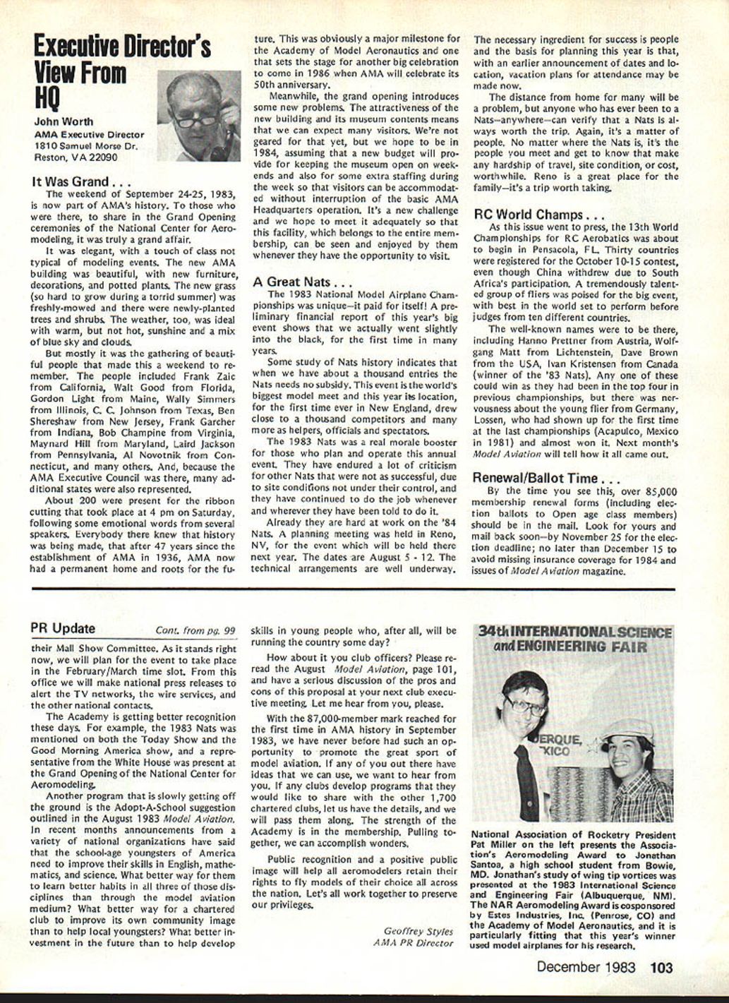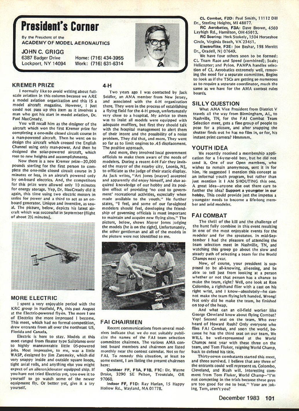 L Public Relations An As important years Academys history comes close good time look some events 1983 some plans 1984 Perhaps biggest public relations mem ory 1983 opening National Center Aeromodeling After almost 50 years life growth Academy means member have its own office building museum library visi tors center giant step forward mile stone remarkable significance can tell no fear contradiction member non-member has visited new building past several months has delighted some cases almost overwhelmed design neatness building collection models memorabilia person company made contribution project owed debt gratitude modelers have yet send contribution tax deduc tible help dump mortgage urge write check today mail 1983 Nats great success ways Perhaps lasting effect having modelers families converge Chicopee MA Westover AFB will overall publicity model aviation model aviators received sport should better known New England now perhaps ever known before Thanks efforts generated interest sport can count good public image remaining minds New Englanders long time Flying site success stories have com ing year Yes know some clubs have lost sites due noise complaints clubs have granted per mission fly public private property November issue Model Aviation story Tn-Cities RC Club Washington State got new field Conservation District property type story being repeated areas such Raleigh NC Aeromasters have just gained flying field former landfill site AMA has lot experience lot materials can assist club starts go after flying fieldjust Update contact us give us chance work services membership buys you should take advantage needed encourage building Scale models AMA introduced new national award year call National Scale Award major trade show aircraft judged Best Scale independent local judges will winner nice trophy being awarded owner plane region al winners will eligible enter Nation al Scale Award Contest National Scale Trophy will presented overall win ner Judging will done non-AMA per sonnel like have good positive public image club going after community sup port almost vital good working re lationship developed prior re quest favored treatment clubs have conducted mall shows major shopping centers result have gained new members received assistance either public private sources flying field problem developed mind pro posed Model Av/at/onSeptember 1983 National Mall Show Day developed 1984 response chartered clubs around country has very encour aging Several clubs already have plans mall show early part 1984 dates al ready fixed calendar no prob lem suggested program clubs can go ahead thing though dates may coincidethat lux ury can have volunteer arrangement Other clubs have very strong endorsement idea have sent clubs package information suggested press release can used Continued page 703 December 1983 99 AMA HQ Executive Director including reports AMA President Executive VP Vice-Presidents ACADEMY OF MODEL AERONAUTICS 1810 Samuel Morse Dr Reston VA 22090 Club Patches Emblems Needed Above shown previously donated dis play AMA Museum still amount fraction over 1700 AMA char tered clubs dont see yours photo dont know has received AMA send club can properly represented AMA HQ SERVICES STAFF S S 0 Executive Director John Worth S Assistant Executive Director Vince Mankowski S Executive Secretary Joyce Hager S Comptroller Gisele Jackson 0 Competition Services Director Micheline Madison 0 Special Services Director Carl Maroney S Membership Director Carol Merfeld 0 Public Relations Director Geoff Styles 0 Special Events Manager Douglas Pratt 0 Publications Director Carl R Wheeley 0 Administrative Coordinator Bob Voislavek 5O General Counsel Jeremiah Courtney S Asst General Counsel Jack Smith lam JOHNNYCLEMENS AMA-18 Dallas TX am presently serv ing AMA District VIII Vice President am asking vote next AMA President would like know am writing message myself thoughts come deep within qualifications deep well-doc umented AMA history president AMA eight years 1971 through 1978 greatest growth period AMA has ever enjoyed 46 years being AMA member have held AMA office expect SecretaryTreasurer Representing United States rose 1st Vice President FAI-CIAM world aeromodeling Most today cessful AMA programs originally planned president 1971 brought new era AMA Council named New Momentum again time same kind enthusiastic leadership Mo mentum need look forward toward new goals membership 100000 well within reach Weve gotta go after could own control own permanent flying site facility supporting championship events world invitationals yet beginning tap healthy field corpor ate support involvement would pro vide much needed funds positive public relations leadership model aviation can integrate nations educational systems offer todays young people excit ing education expanded goals would legacy better future country maximum membership effective ness need expand encourage fun social side AMA modeling Compe tition flying already well-established generates its own momentum have constant need upgrade flying safety rules better serve us Special Inter est Groups should encouraged guiding us AMA could provide program project guidance chartered clubs schools communities should constantly im proving dignity recognition re minding world aeromodeling truth seedbed aviation space development biggest aims should toward careful conservative spending dues money gain maximum fun value dues avoid threat dues increases 60 years active modeling have given experience phases modeling sportFree Flight Control Line Radio Control years officership have given administrative skills wisdom am older kids AMA years Continued page 104 JOHN C GRIGG Lockport NY incumbent candidate re-election office President AMA Johns past rec ord verifies strong supporter average modeler well highly competitve member credited bringing stability governing body sponsoring three-year term elected officers ap pointed Chairman very successful RC Frequency Committee crea